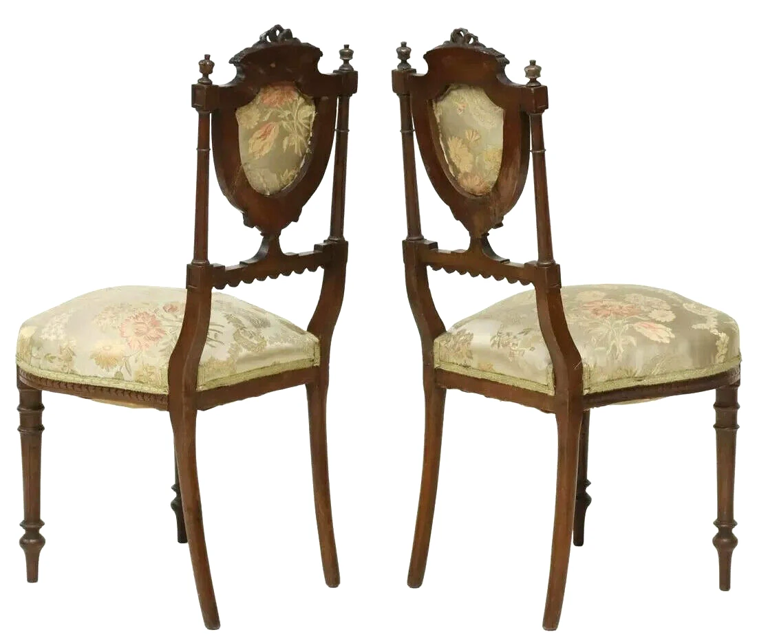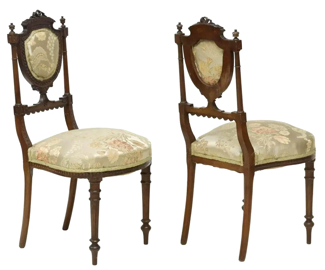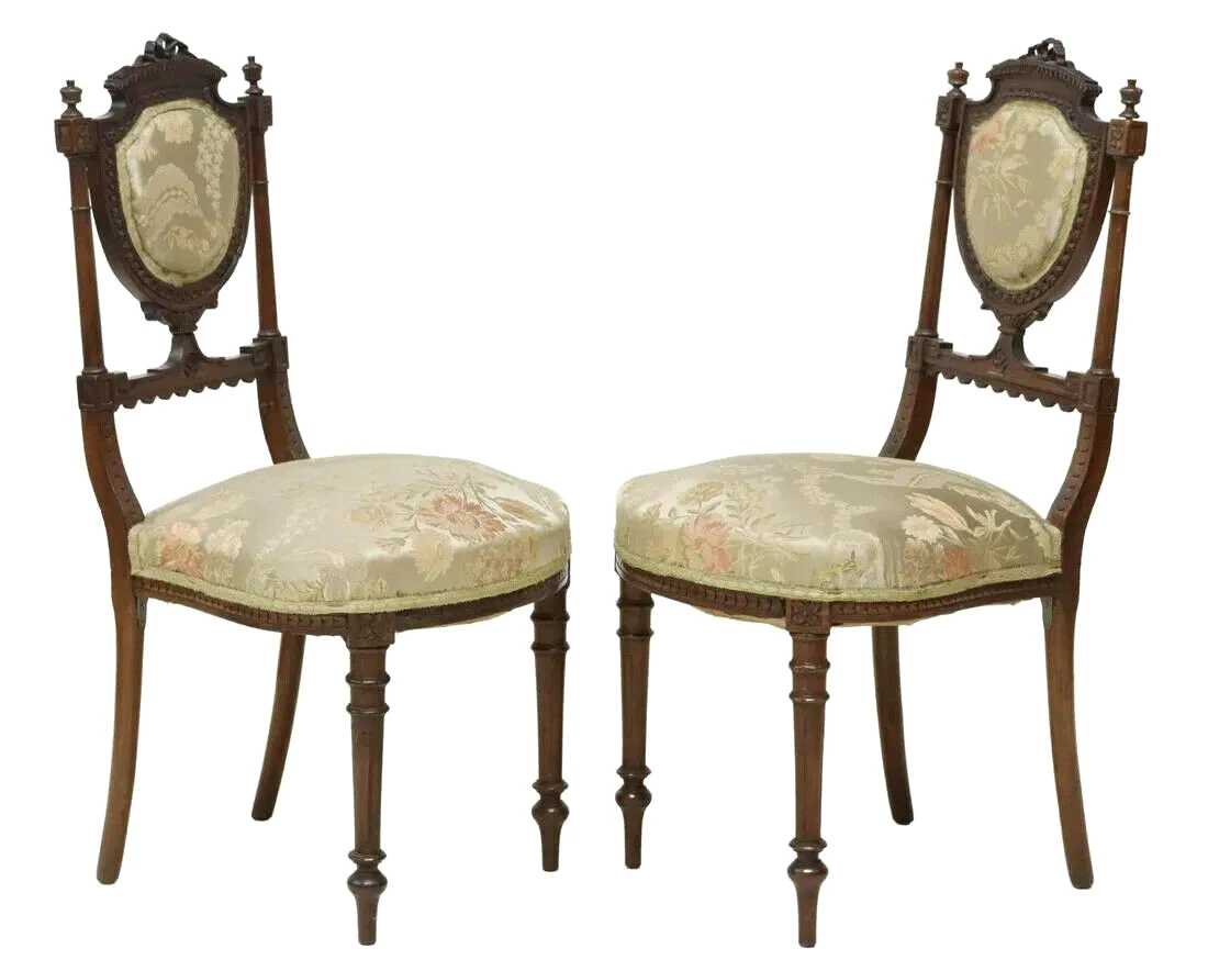 (lot of 6) French Louis XVI style side chairs, 19th c., carved ribbon crest, flanked by finials, over shield-form back, floral upholstery to back and seat, rising on tapered turned legs, approx 34.75″h, 16″w, 17.5″d, seat height: 17″h