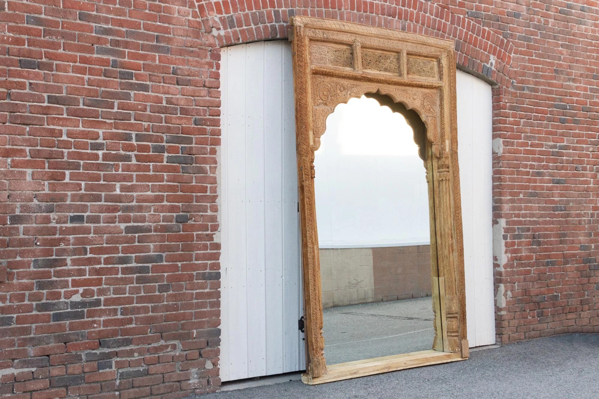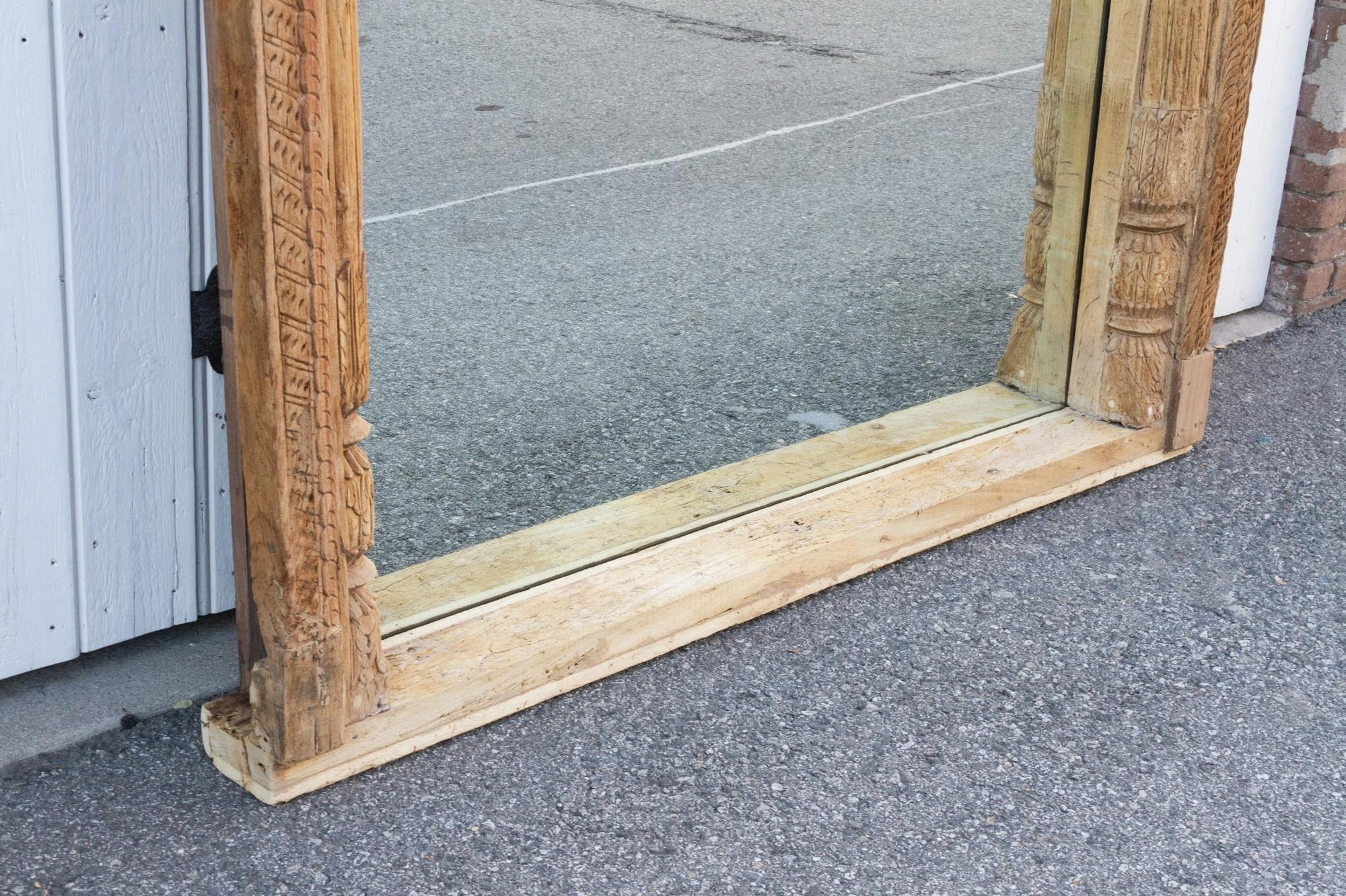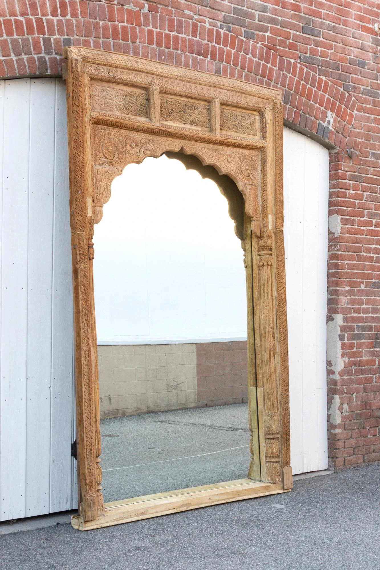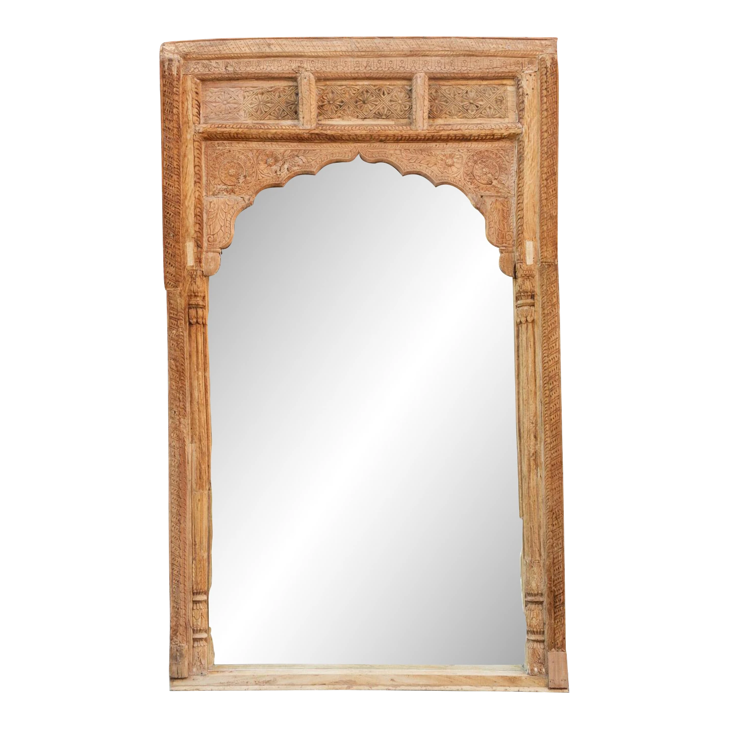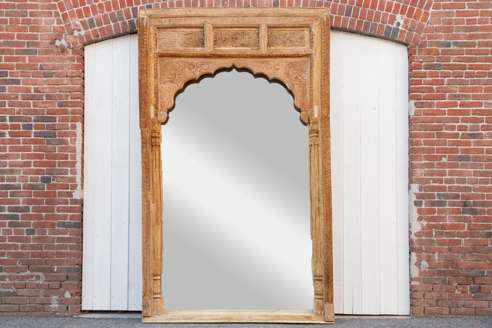 Spectacular Antique Indian floor mirror from the 1800’s. Originally this monumental mirror was an Indian haveli courtyard door entrance, the frame features slim columns with carved details on the sides. This beautiful Moorish style floor mirrors features a defined arch top with carved lotus floral motifs. This enormous carved floor mirror is made from teak with an oxidized bleach patina. Please not this is a very heavy piece, it will require the help of at least two people at delivery.