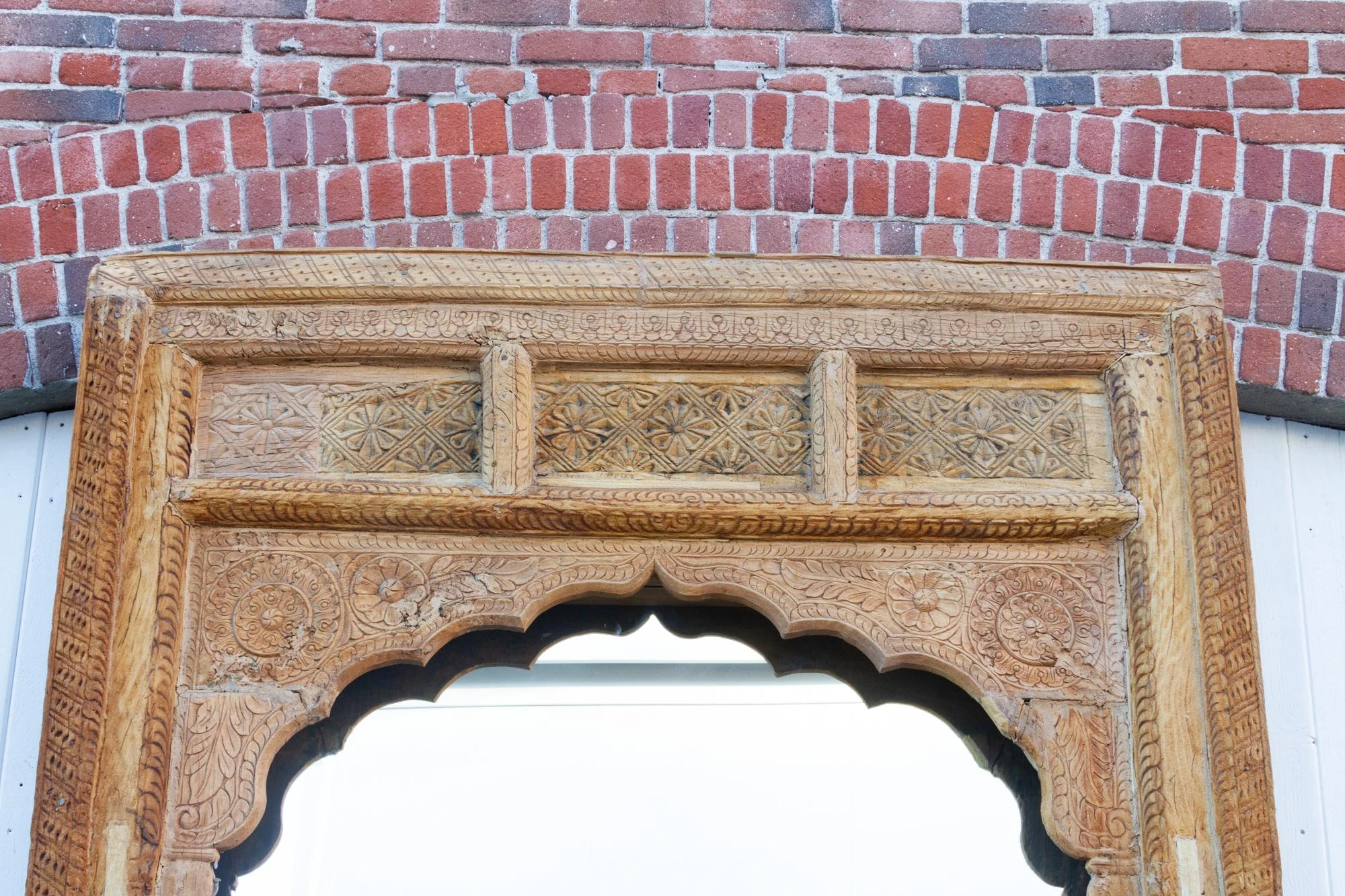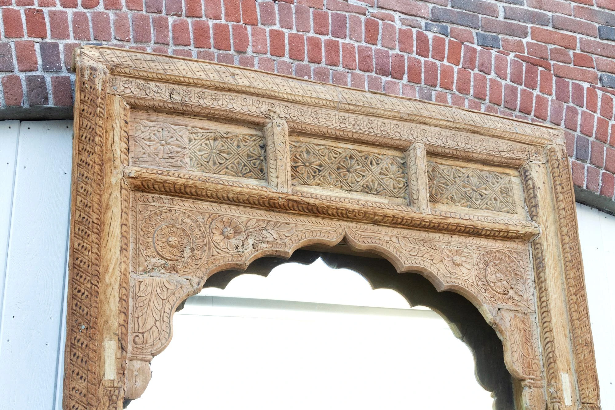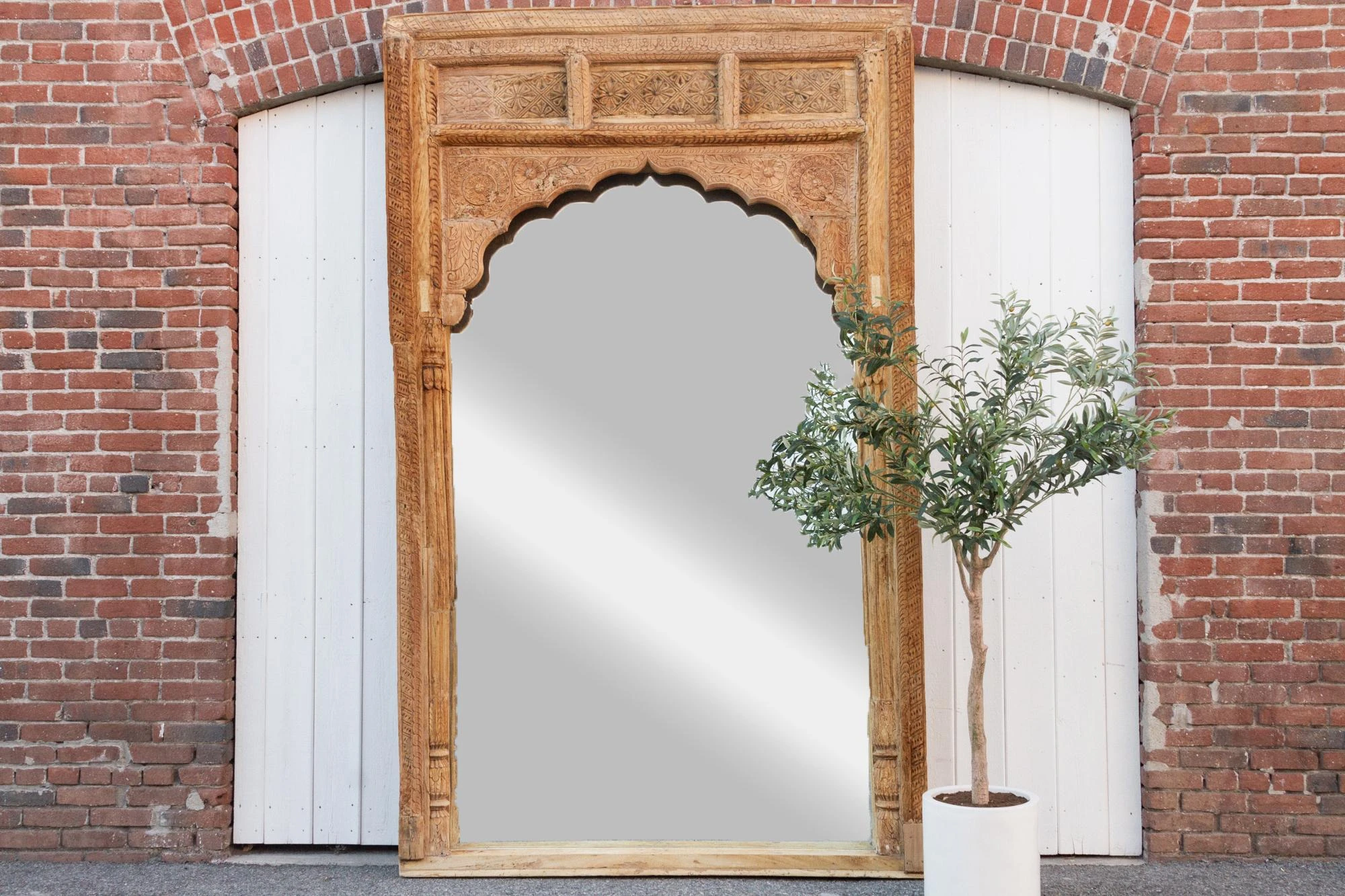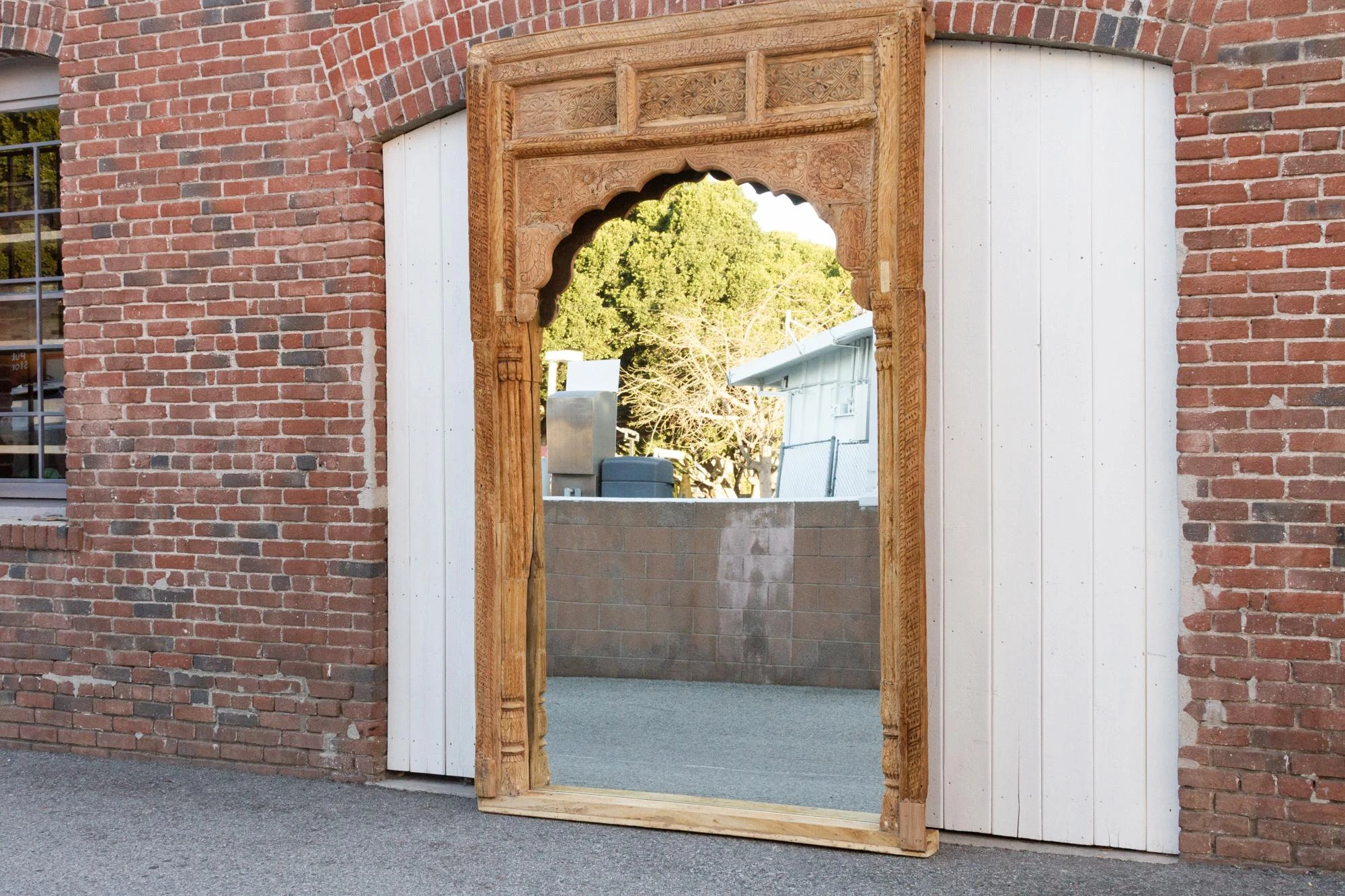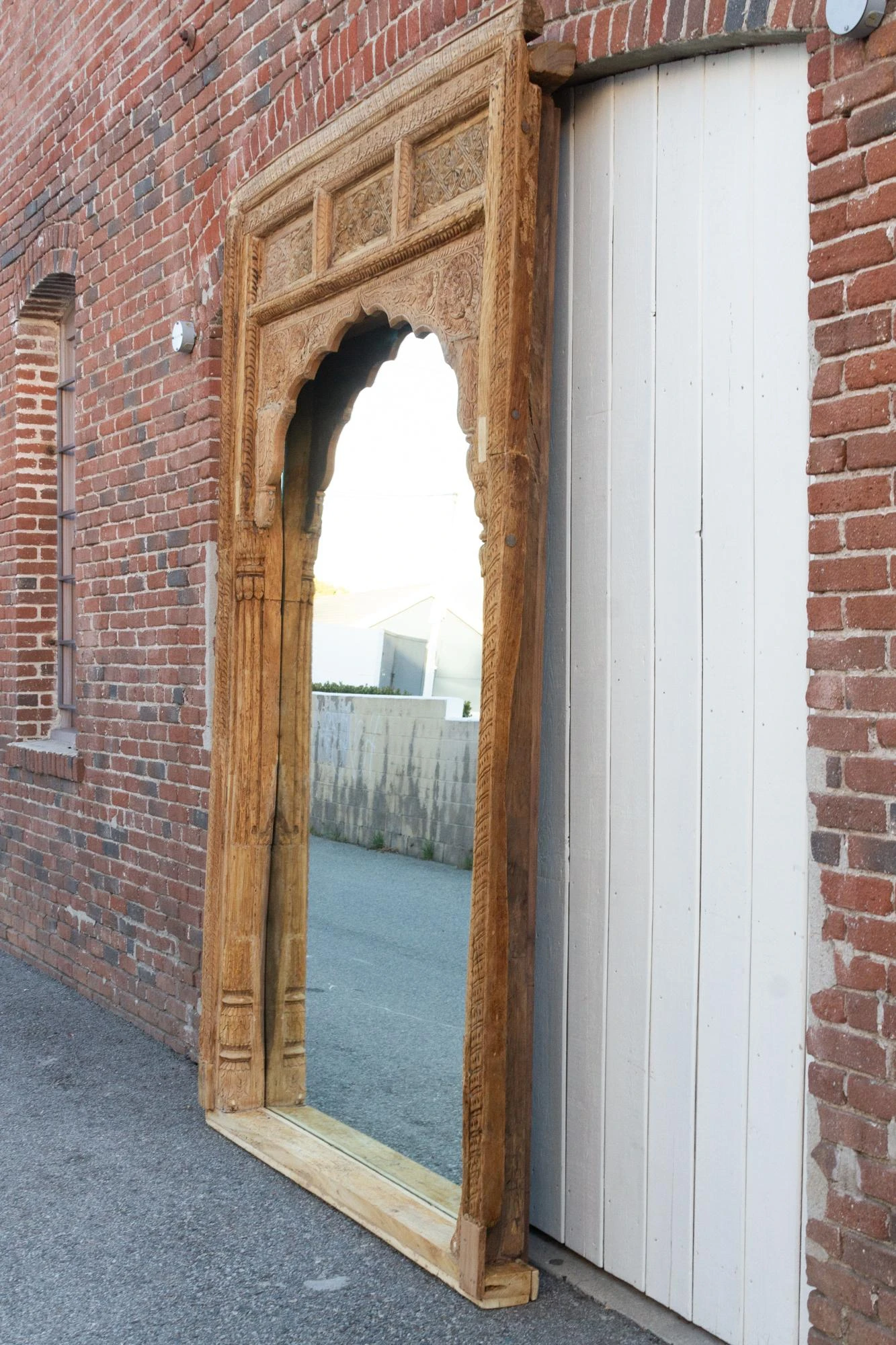 Spectacular Antique Indian floor mirror from the 1800’s. Originally this monumental mirror was an Indian haveli courtyard door entrance, the frame features slim columns with carved details on the sides. This beautiful Moorish style floor mirrors features a defined arch top with carved lotus floral motifs. This enormous carved floor mirror is made from teak with an oxidized bleach patina. Please not this is a very heavy piece, it will require the help of at least two people at delivery.