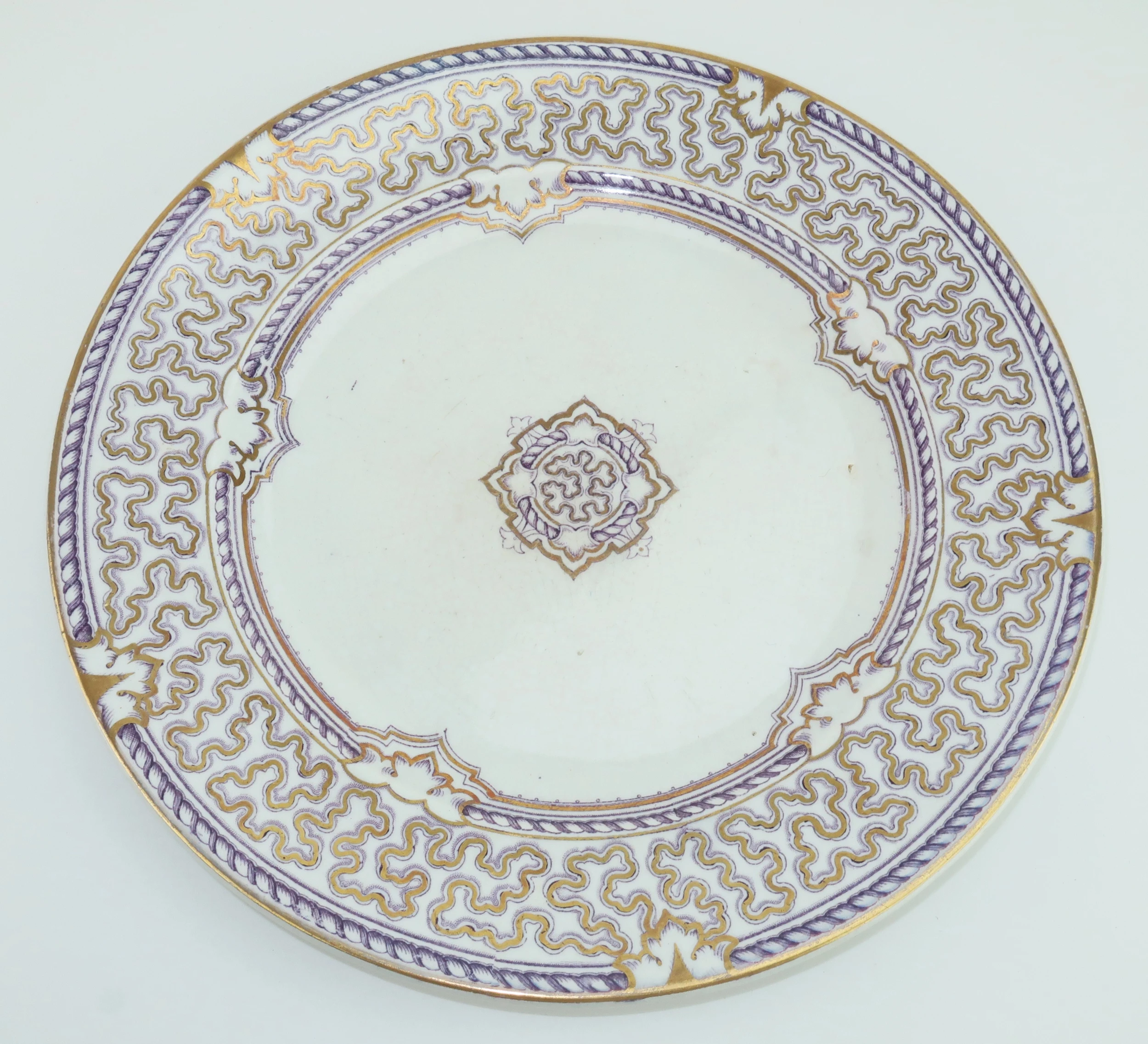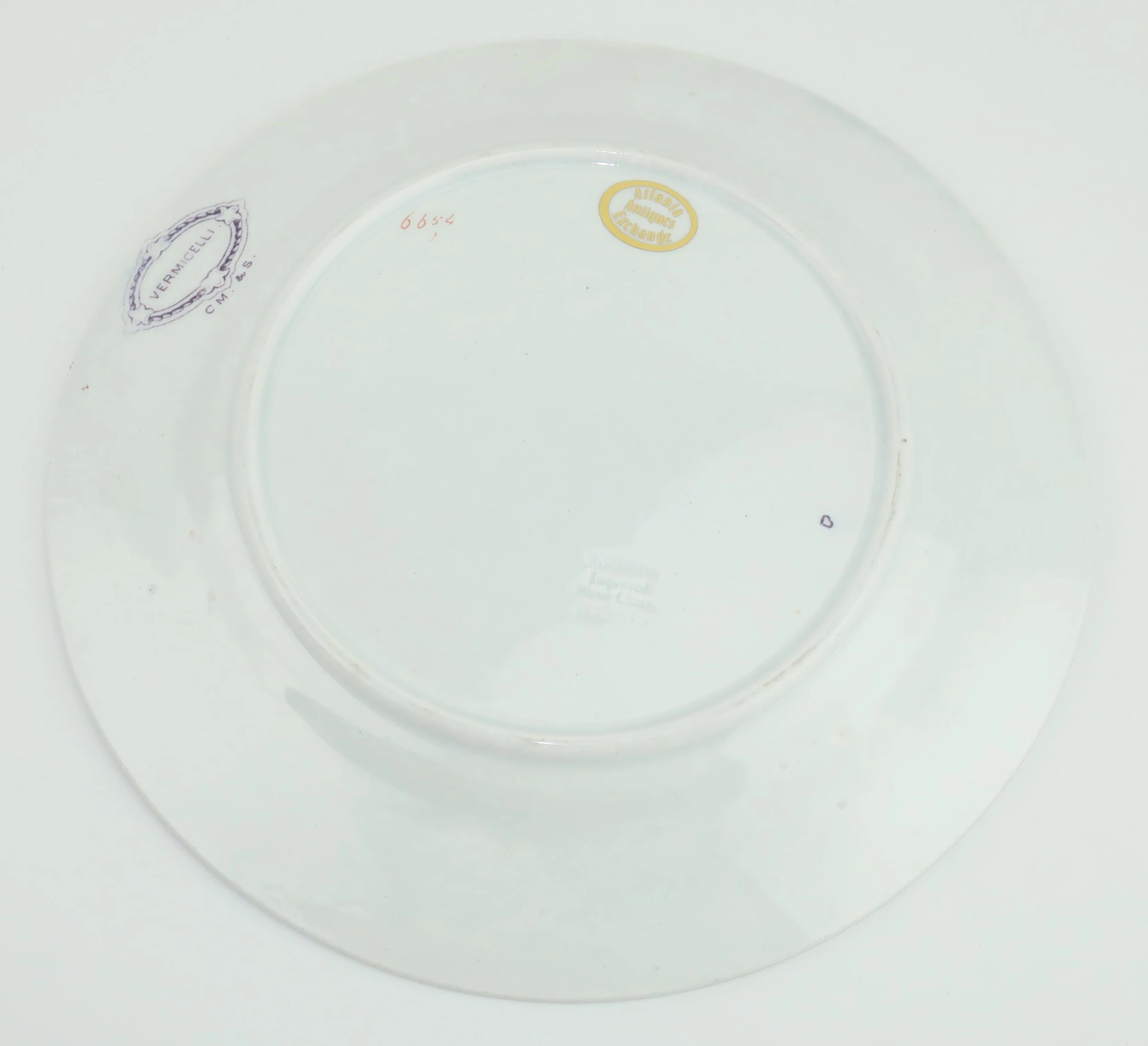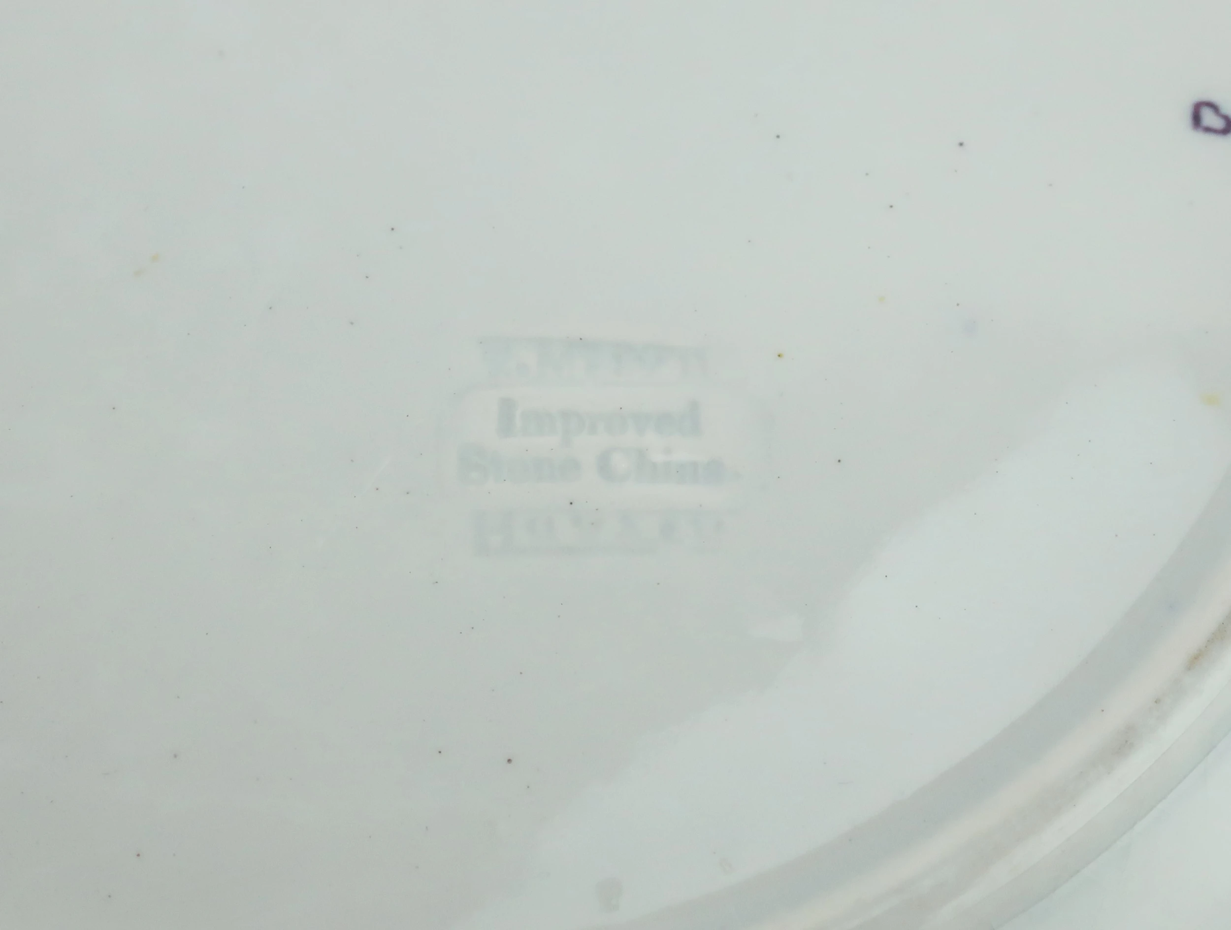 1850’s era pottery dinner plates produced in Staffordshire, England by Charles Meigh & Sons. The pattern is entitled ‘Vermicelli’ which speaks to the squiggle design but also incorporates an elegant rope and leaf motif in shades of deep purple and gold. Each plate is marked on the back with the pattern name and ‘C M & S’ as well as an impression of ‘Improved Stone China’. There are also adhesive labels from an Atlanta Antique Store where the plates were purchased in the 1990’s.