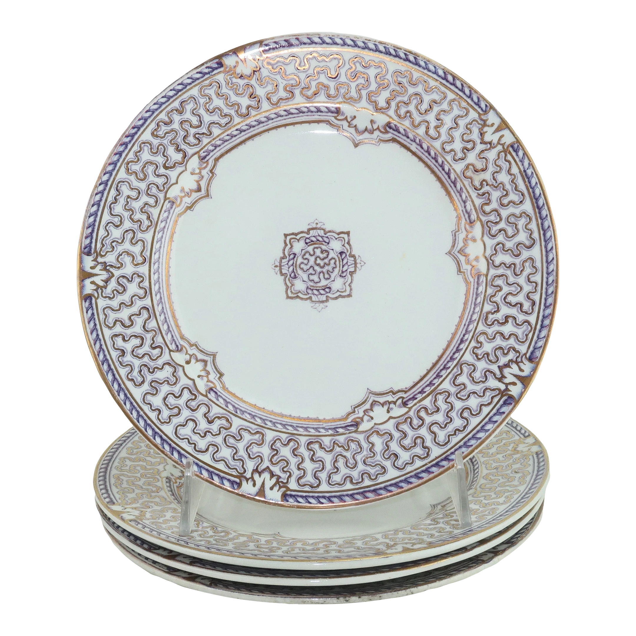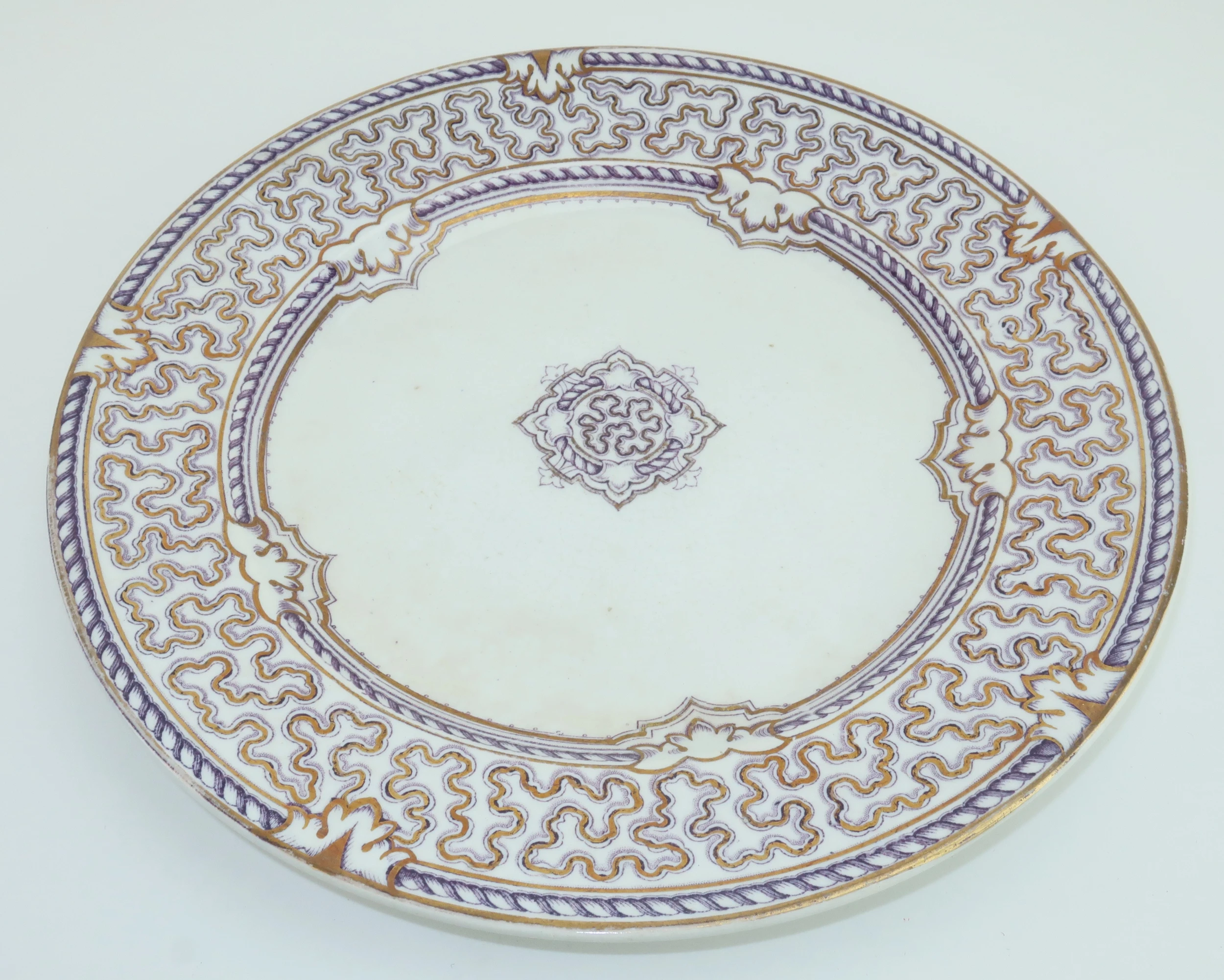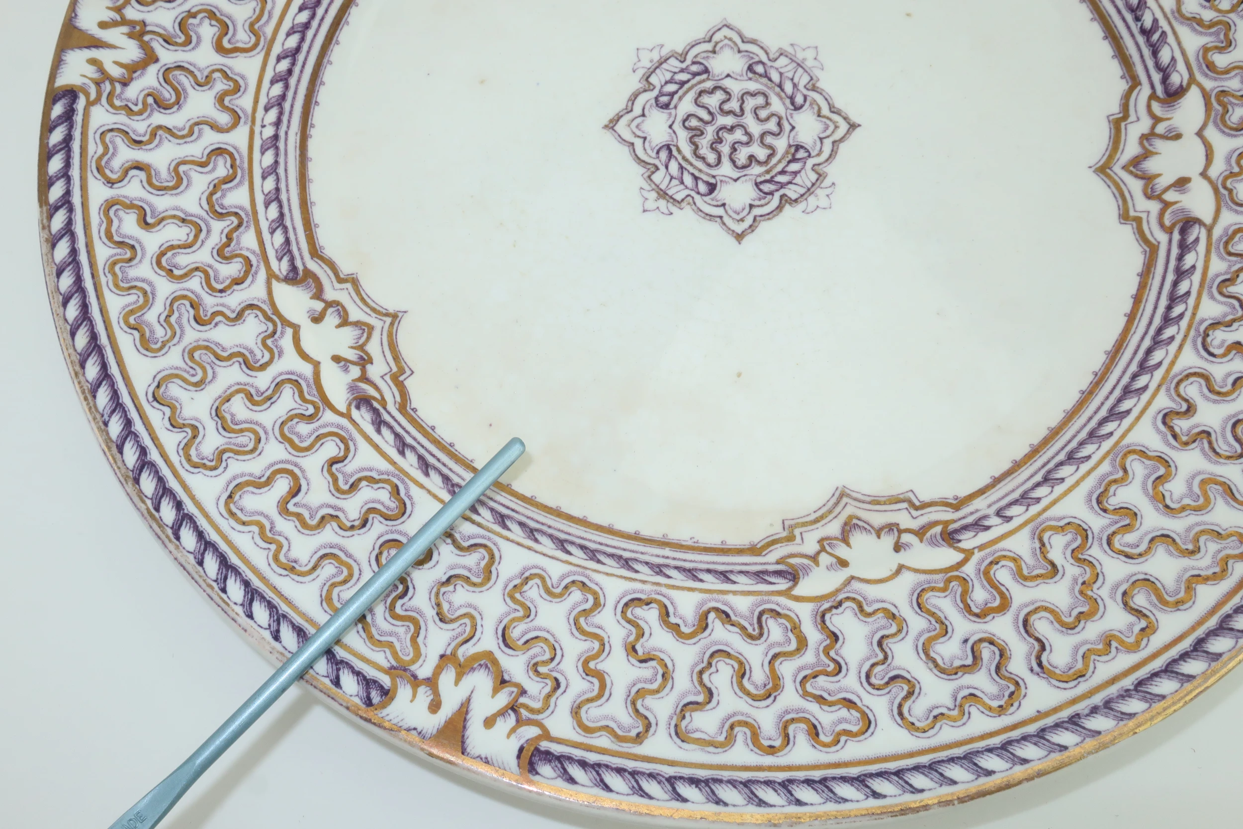 1850’s era pottery dinner plates produced in Staffordshire, England by Charles Meigh & Sons. The pattern is entitled ‘Vermicelli’ which speaks to the squiggle design but also incorporates an elegant rope and leaf motif in shades of deep purple and gold. Each plate is marked on the back with the pattern name and ‘C M & S’ as well as an impression of ‘Improved Stone China’. There are also adhesive labels from an Atlanta Antique Store where the plates were purchased in the 1990’s.