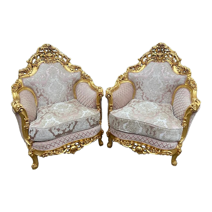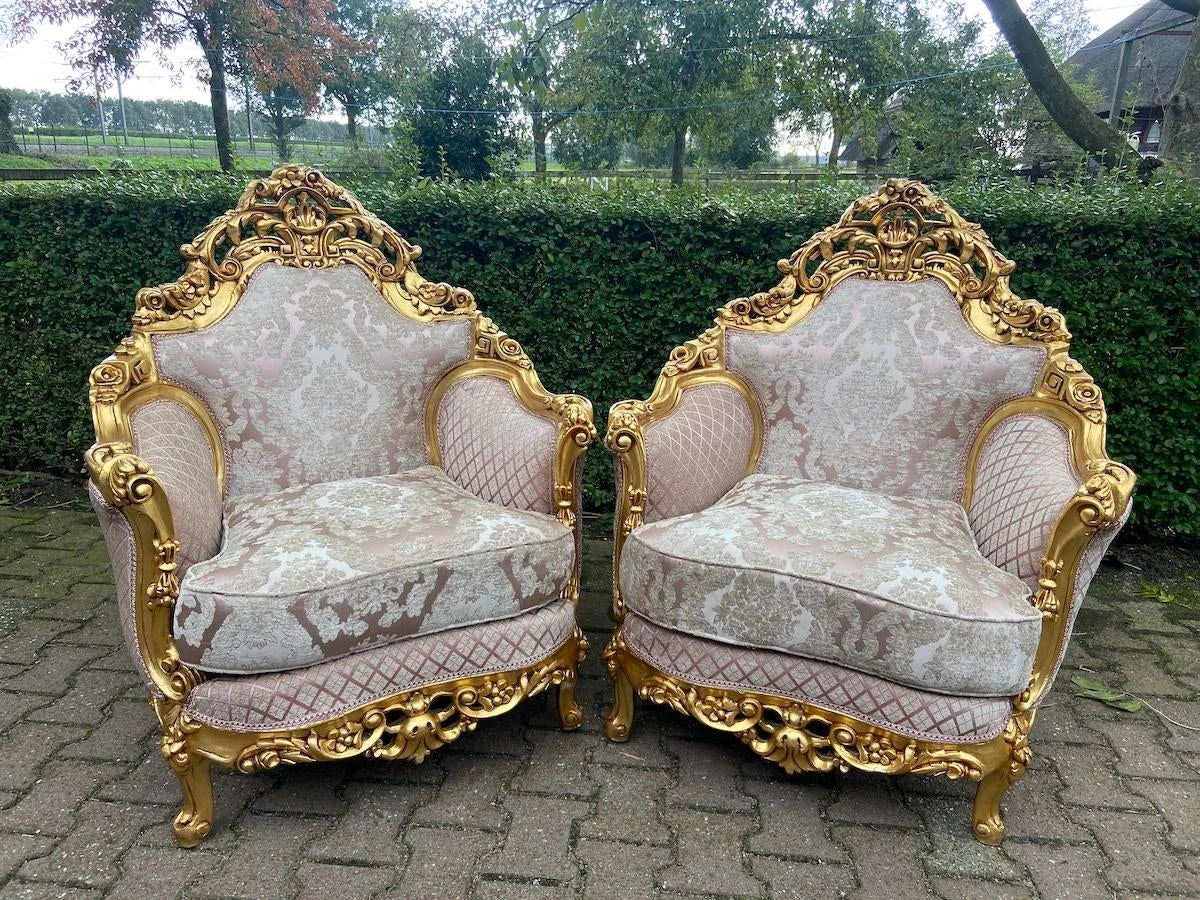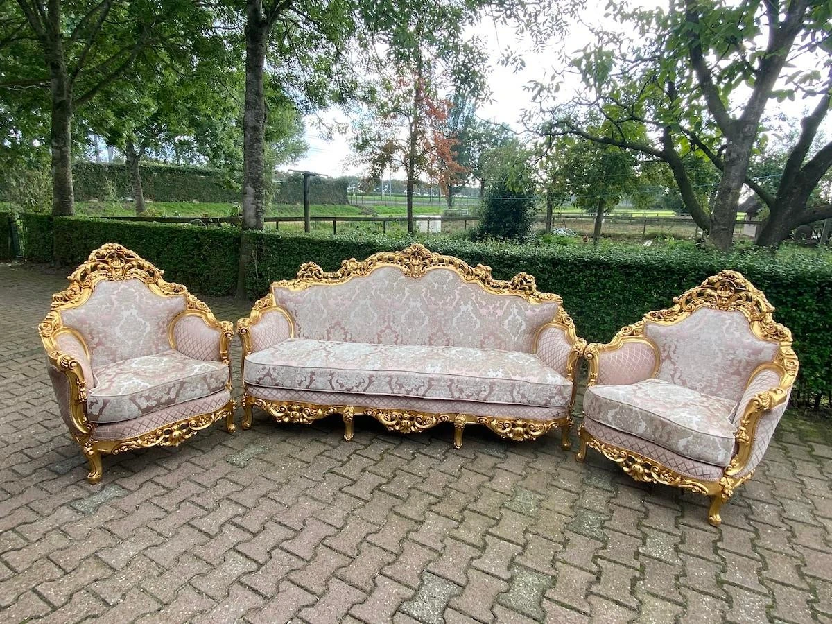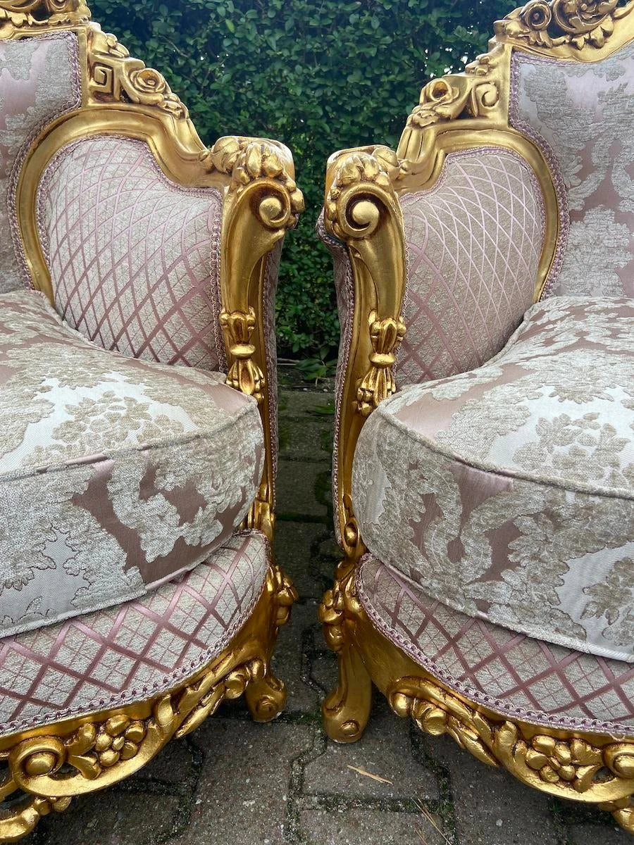 And when we bought it in the South of France our team stripped the upholstering completely , gave the set new filling and padding in high quality. They have also re-upholstered the chairs in a breathtaking beautiful damask fabric (a blend of silk with cotton with floral pattern) in a beautiful pale pink colour. The gold leaf finish is the finish from a couple of years ago, so our team did not re-finish the frame. So it has minor wear consistent with the age and use.
