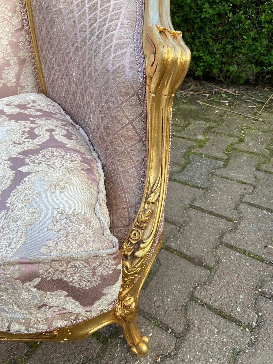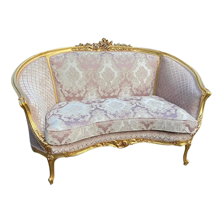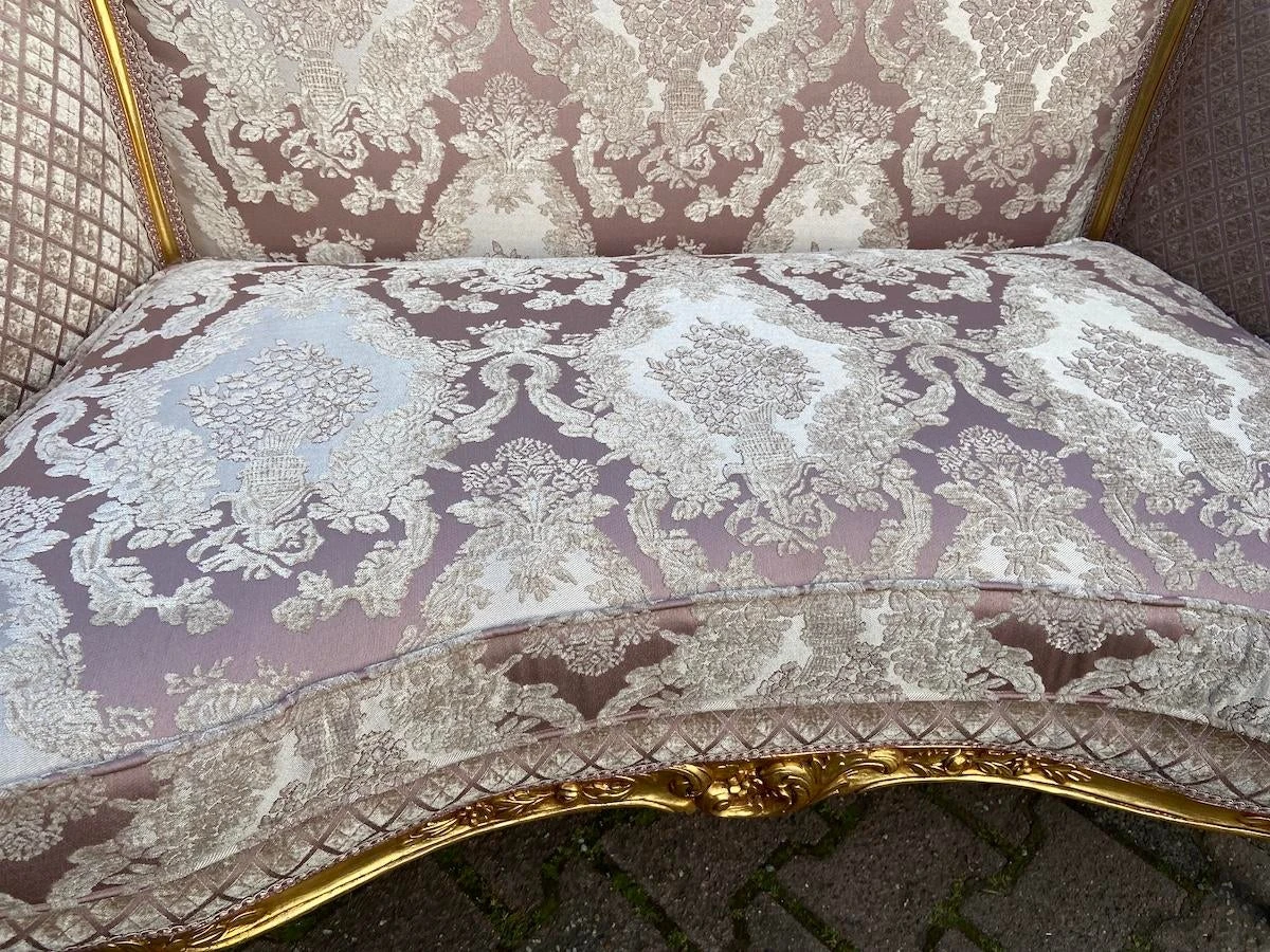 The sofa has new durable filling and padding of high quality. Re-upholstered about 6 months ago with beautiful chique damask fabric in baroque/floral pattern. Damask is a blend of cotton and silk. in floral motif. Very durable material.