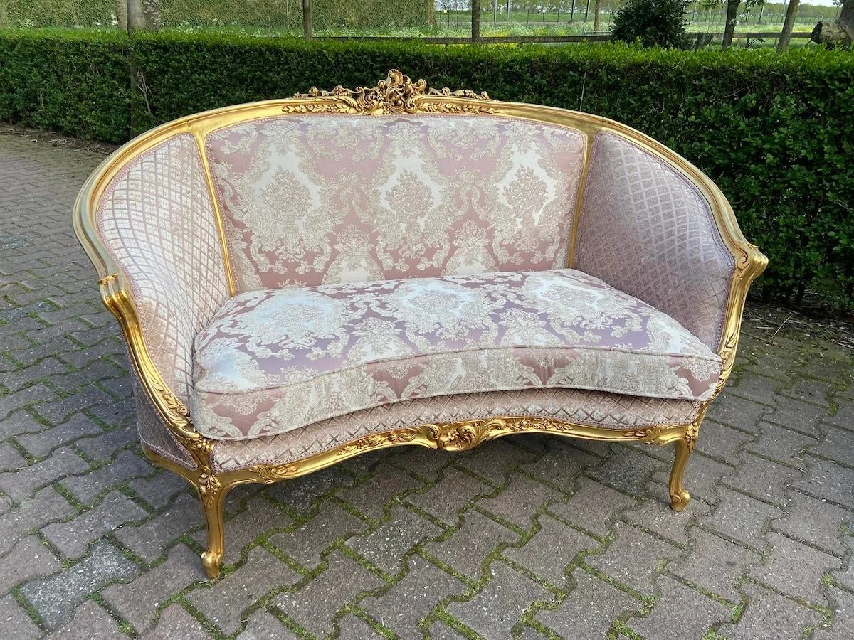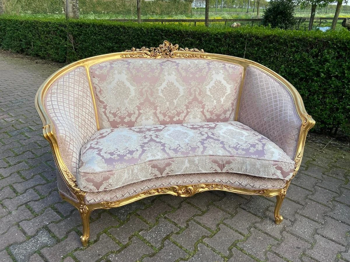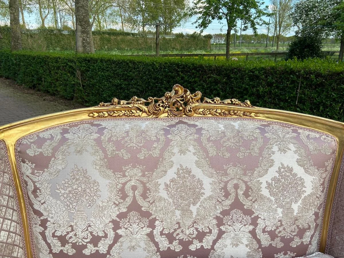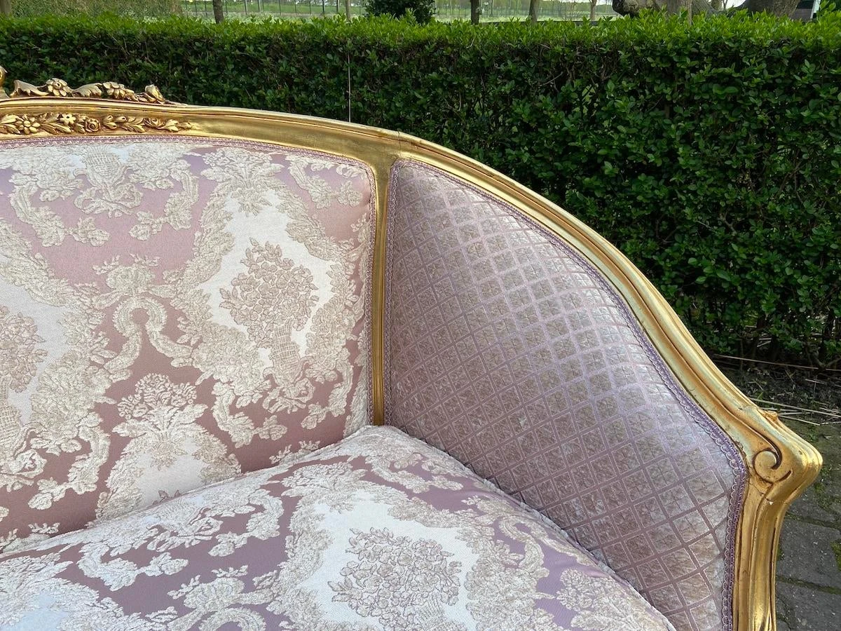 A beautiful corbeille settee made in French Louis XVI Style. Handmade beech frame that is refinished and restored about a year ago by our team of professionals.. Therefore it has some minor wear on the gold leaf. Made around 1900.