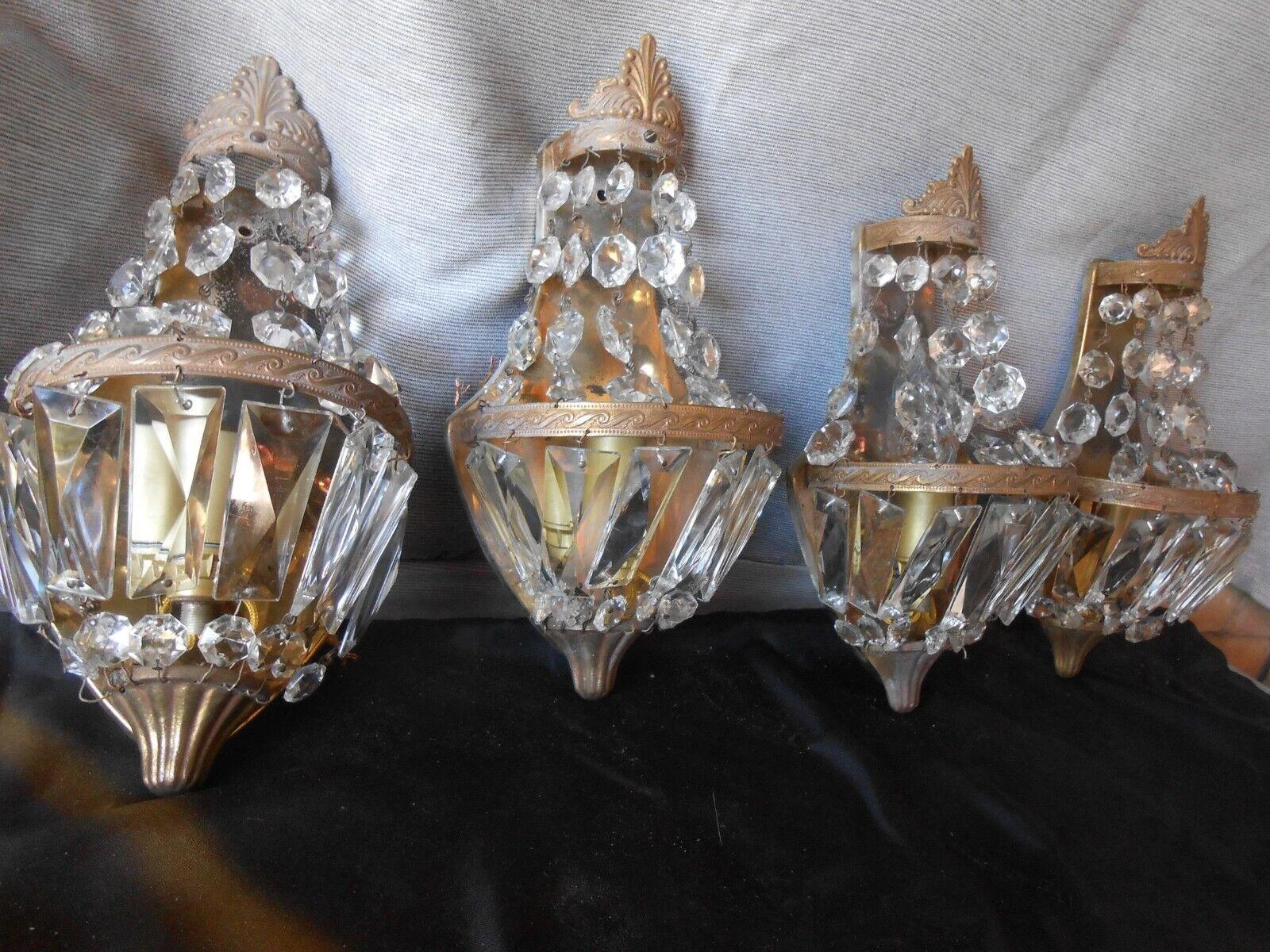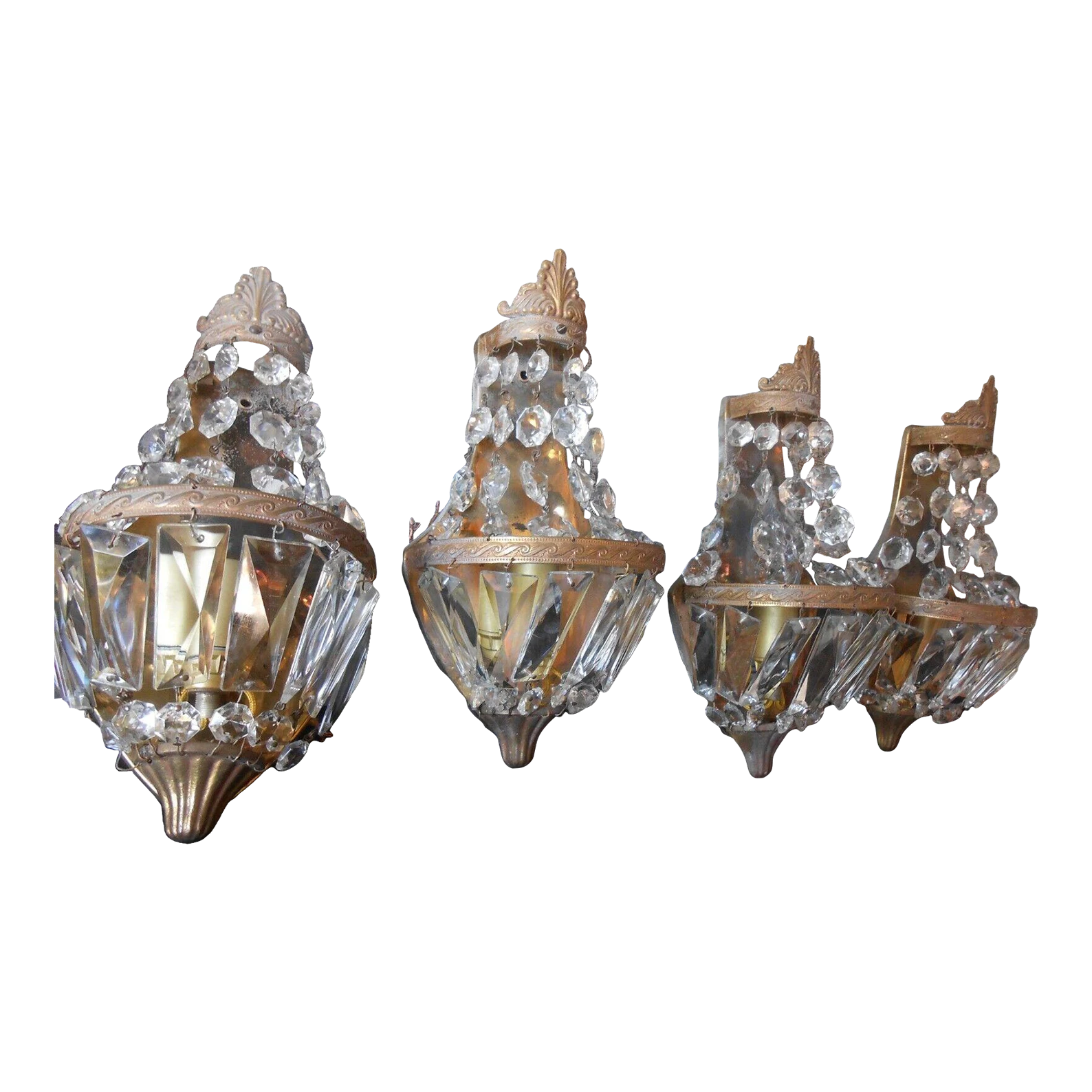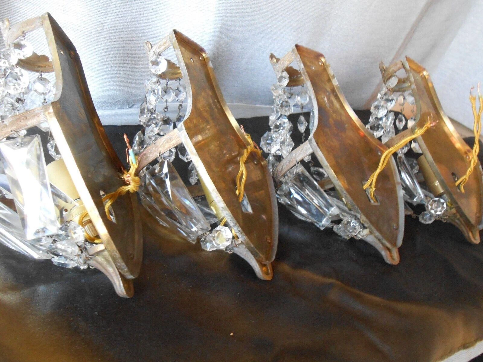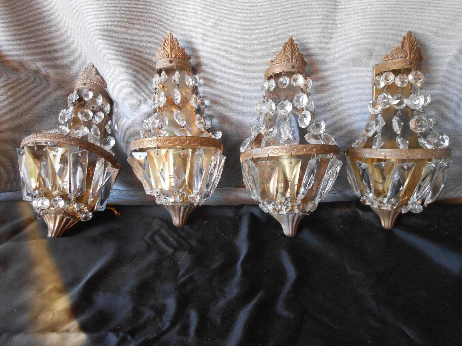 Set of 4 Matched French Louis XVI style Bronze/ Crystal Bag & Tent Wall Sconces. Cascading crystal form. c1920’s.