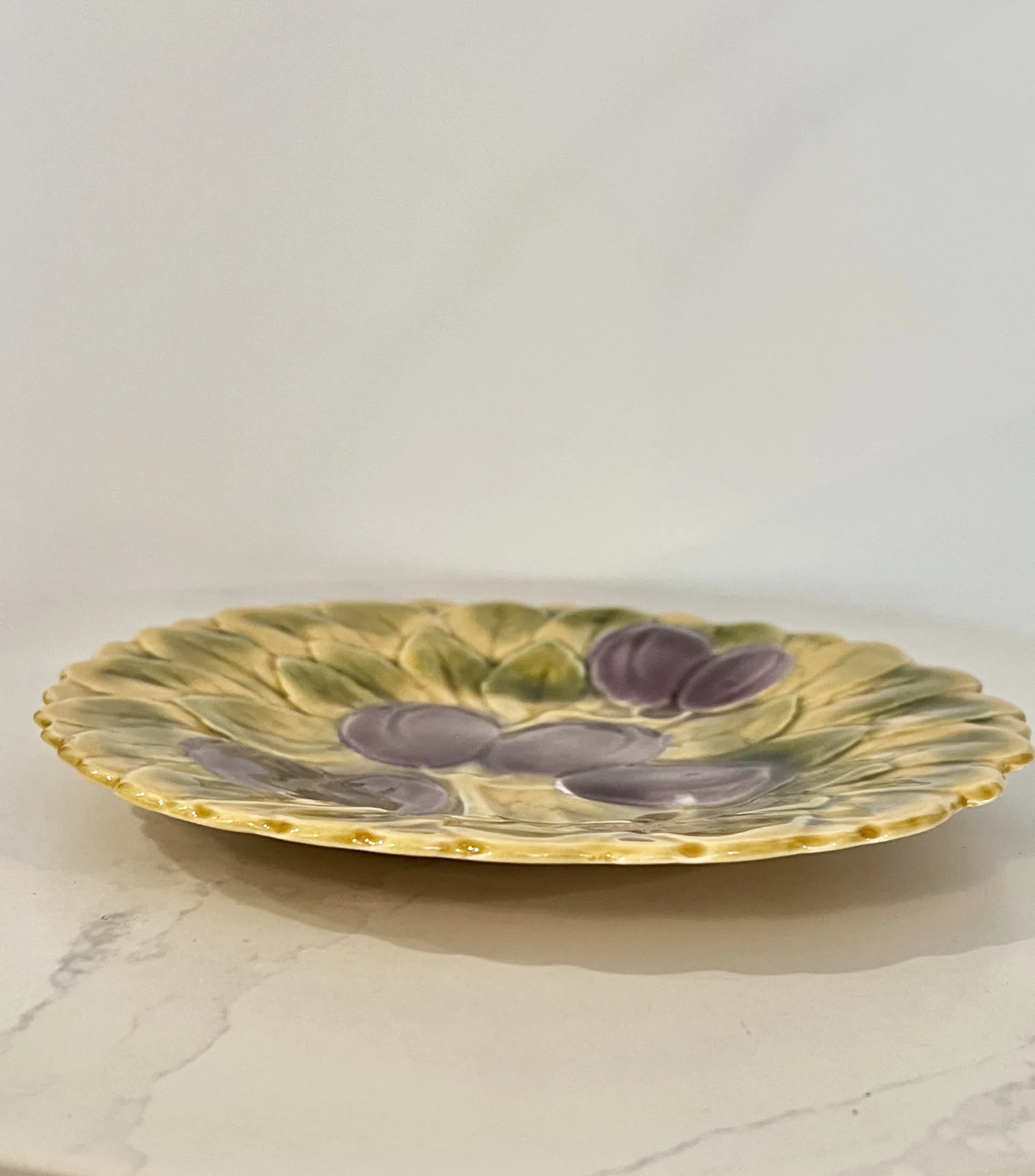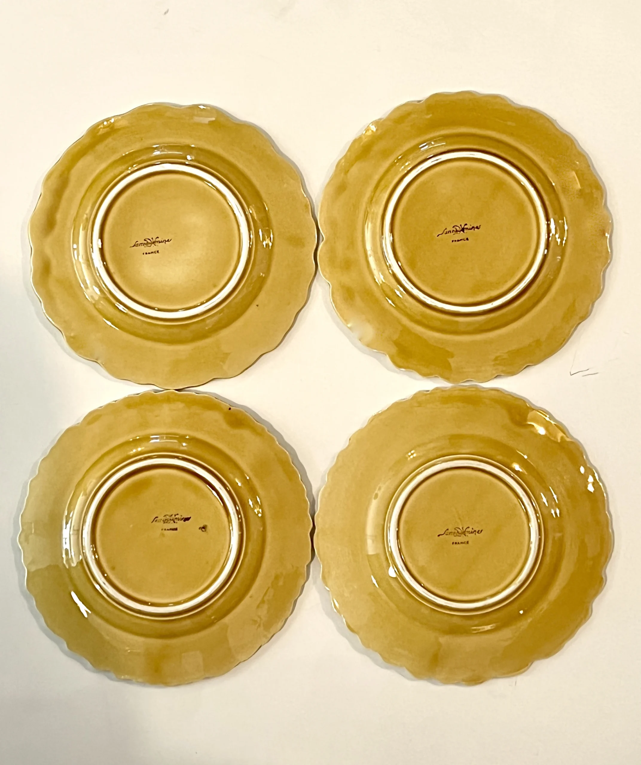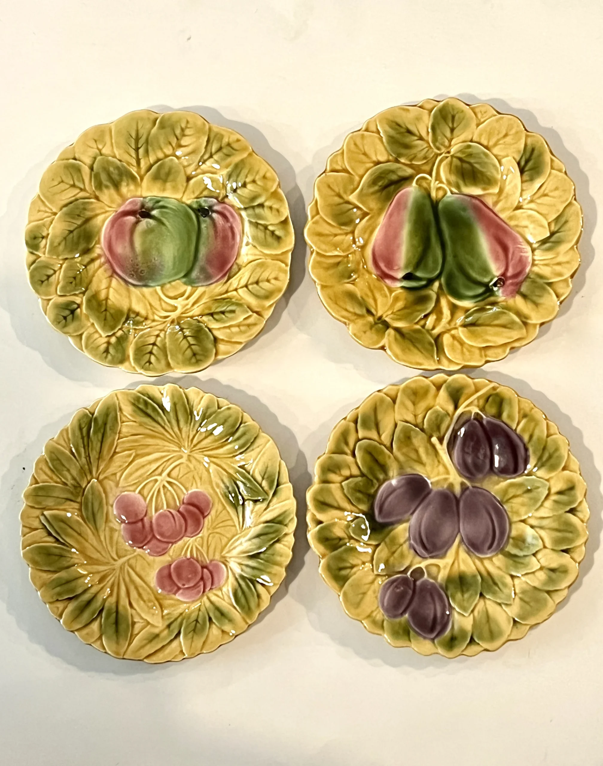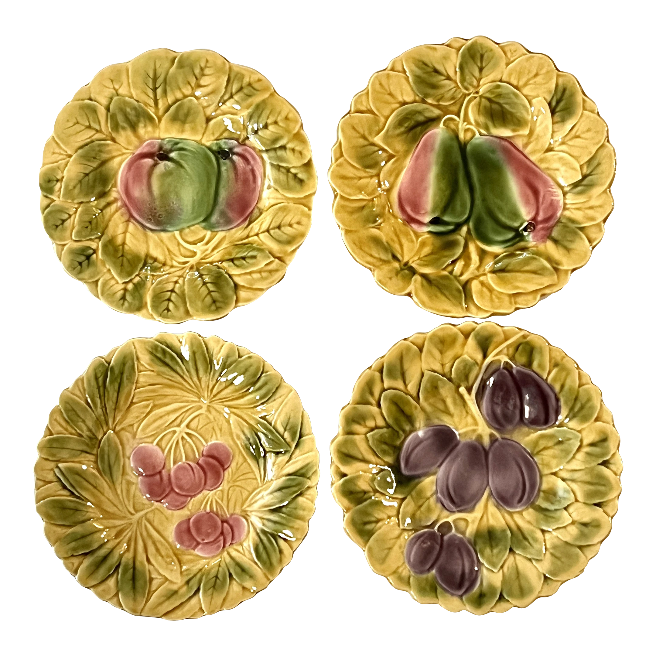 A set of four French Majolica plates with fruit motifs (apples, cherries, plums and pears) by Sarreguemines France. Each ceramic plate is round and colorfully decorated with a fruit motif in purple, green, and pink. Each plate is on a yellow background and glazed on both the top and bottom. Lush green leaves are the background of each plate. The sides are scalloped. Each plate measures 7.5”.Each marked Sarreguemines France.