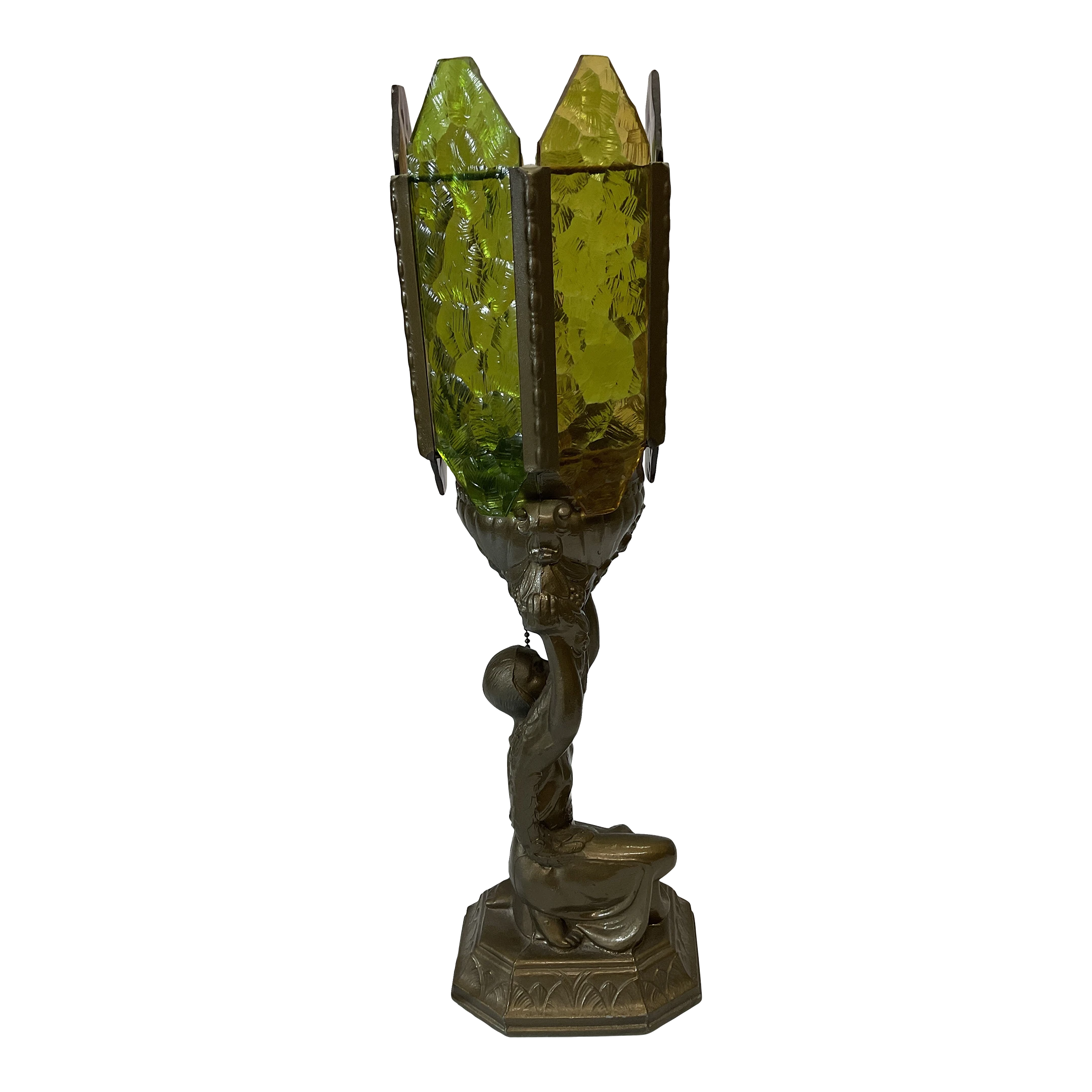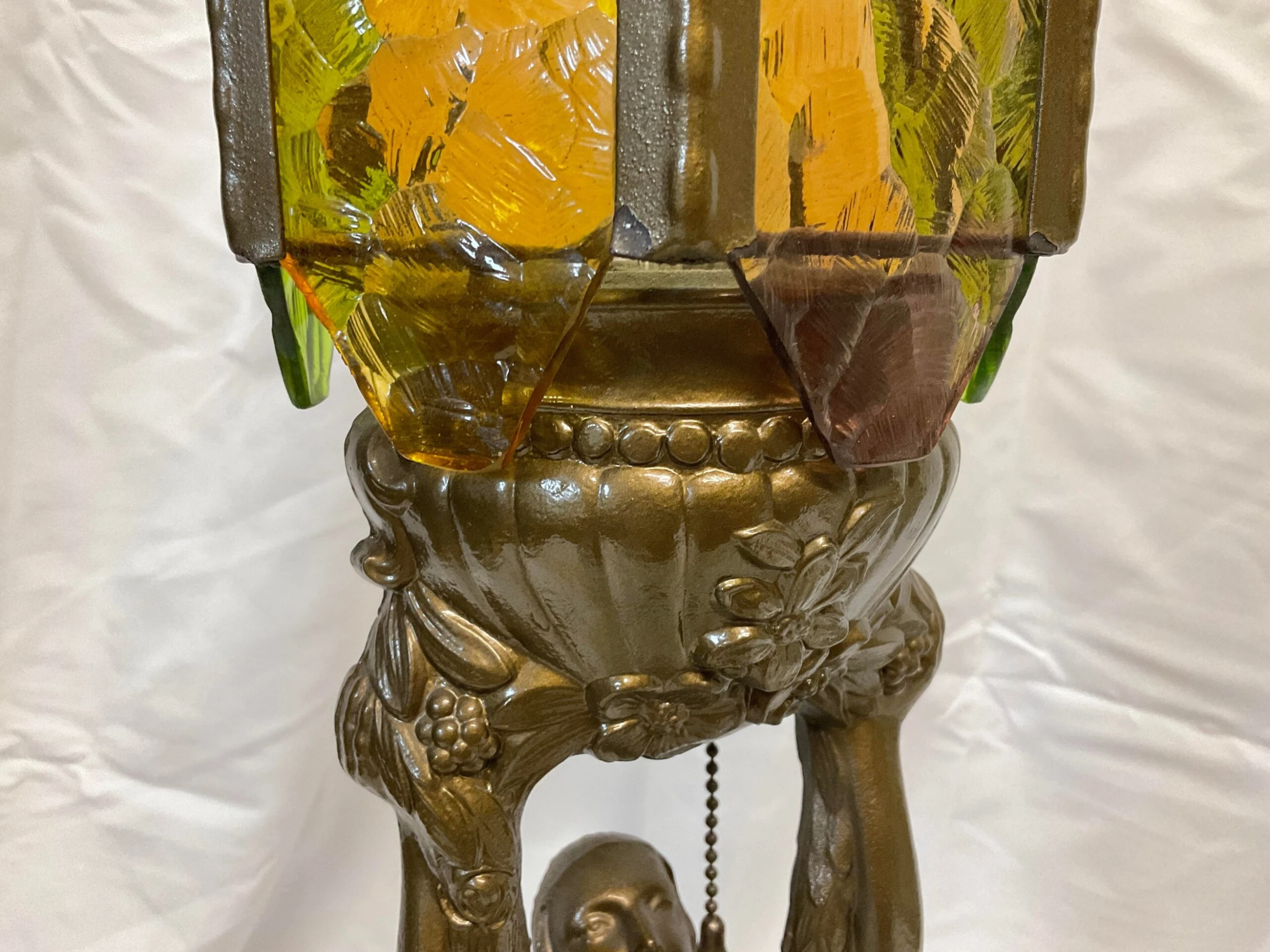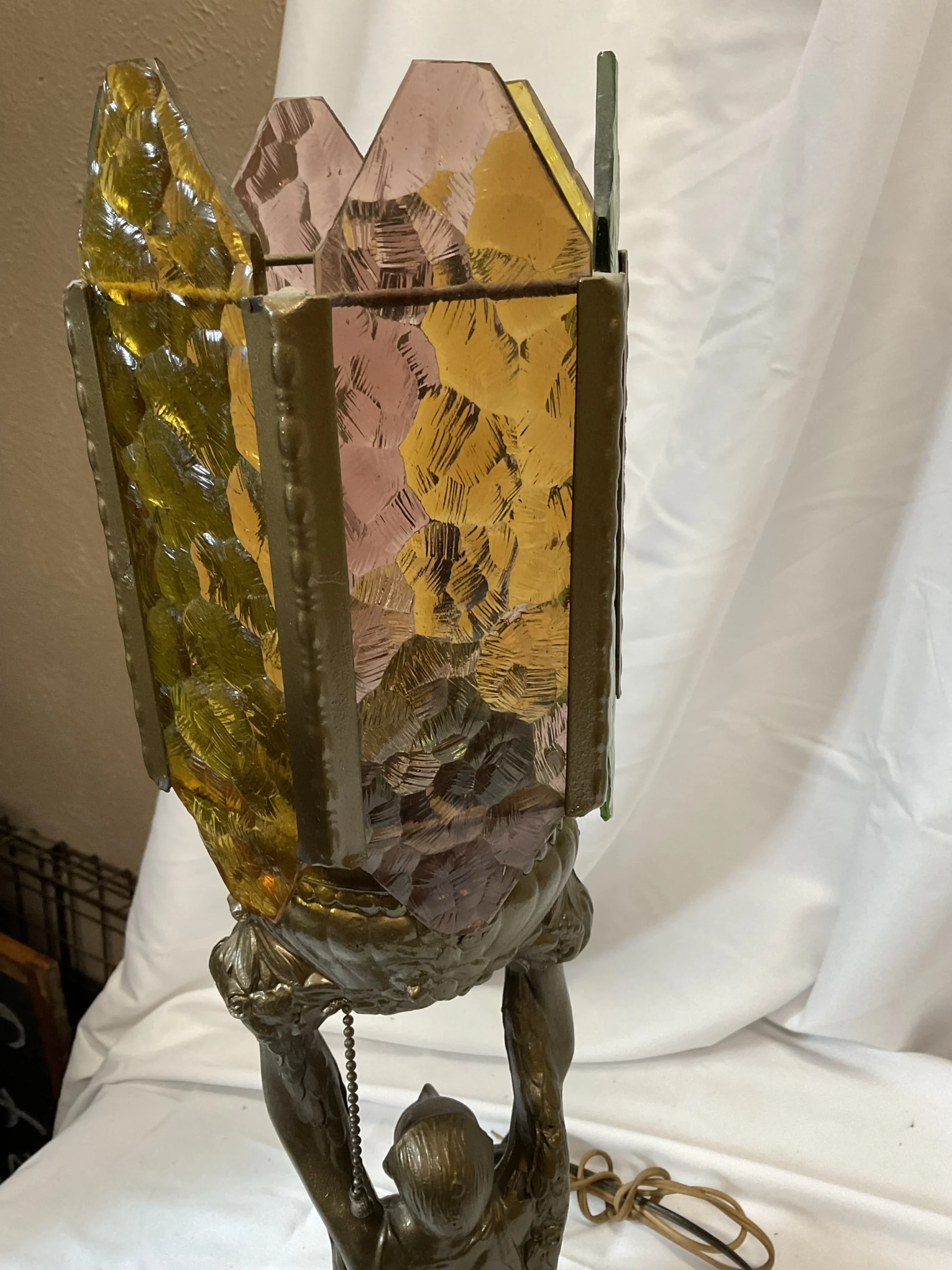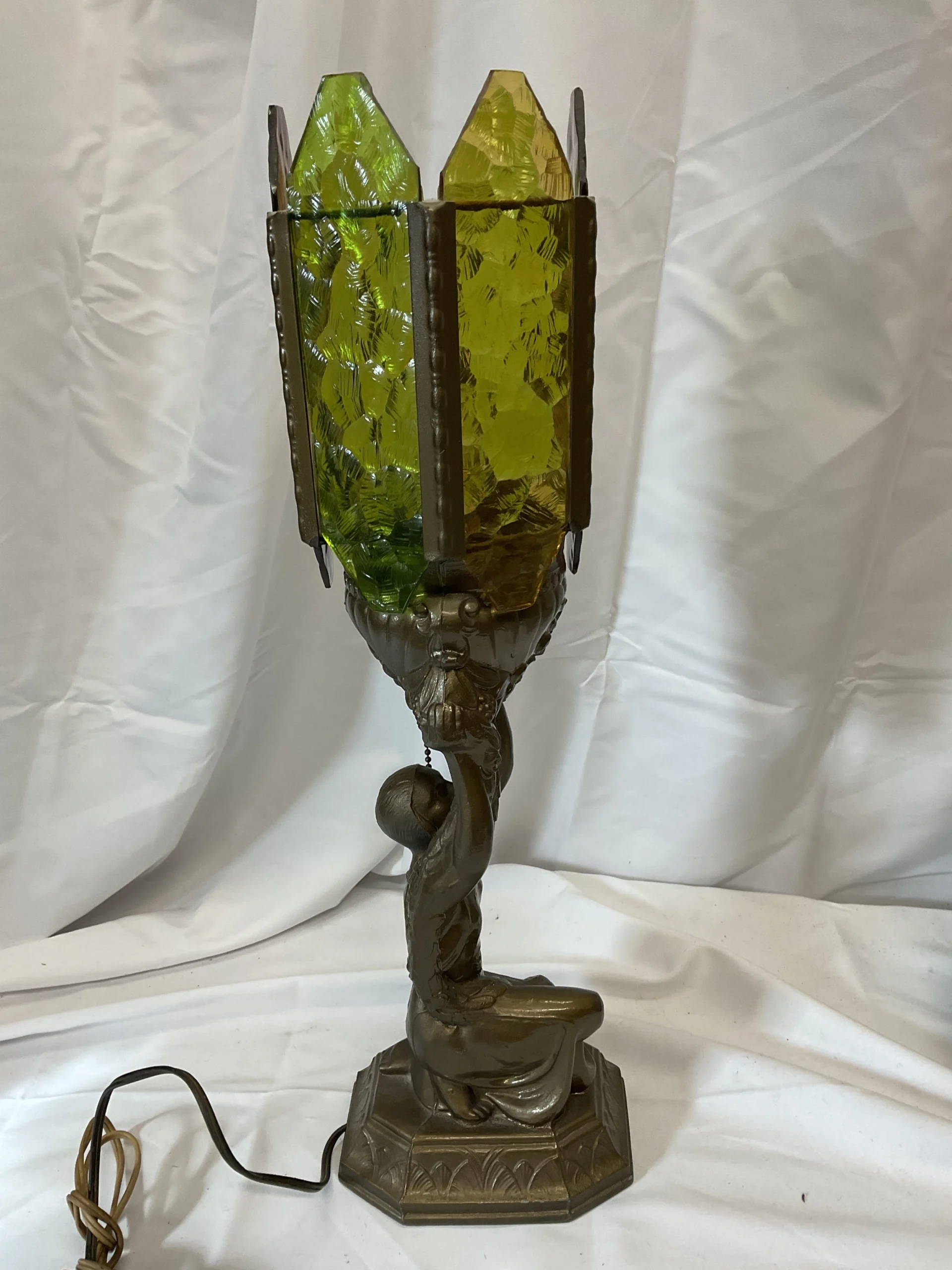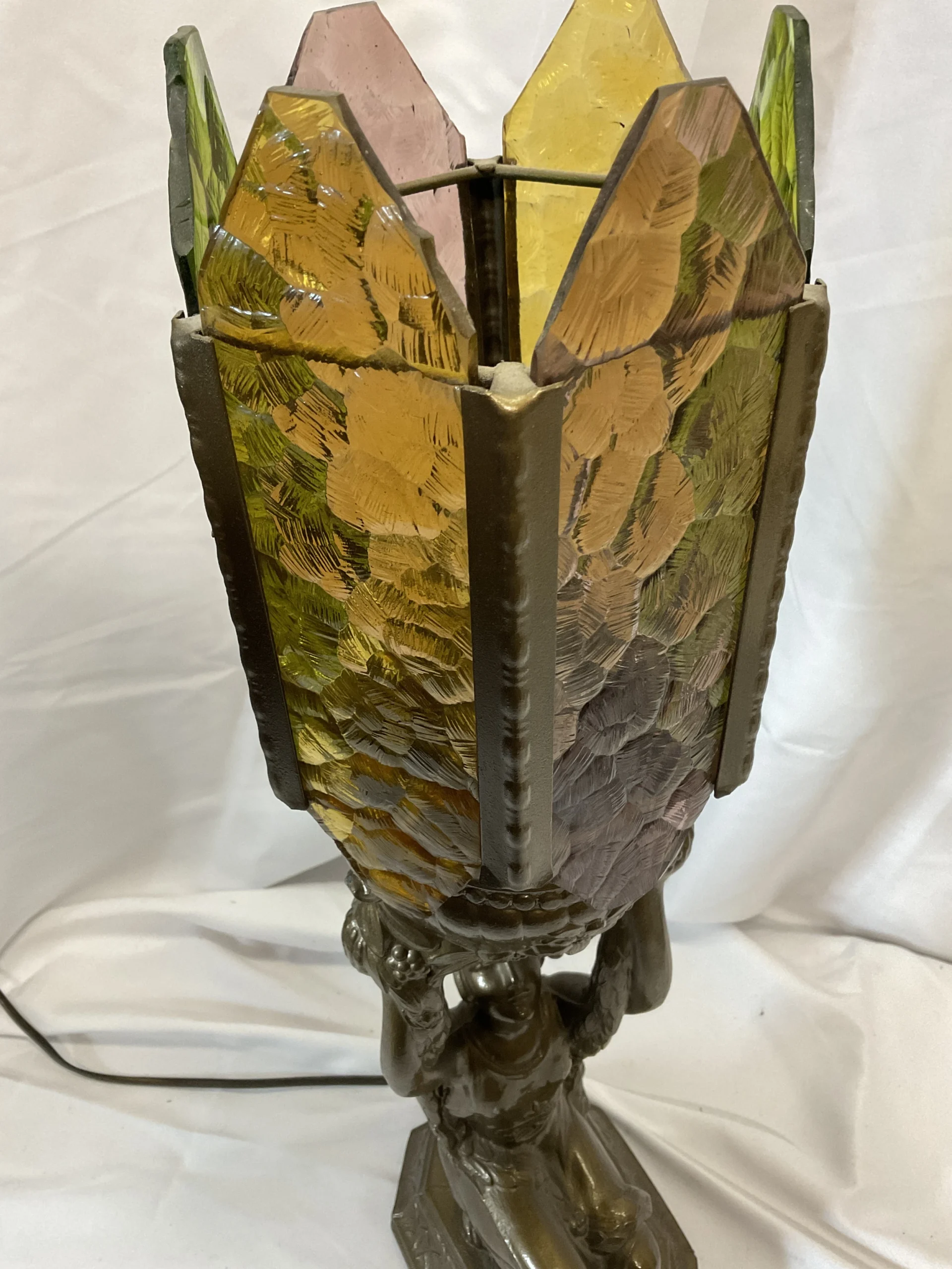 Beautiful Deco period Joan of Arc gold tone spelter table lamp from the 1920’s. The lamp is designed by LaBelle and has 6 colored glass inserts all original to the lamp..The colors are gold, green and amethyst, it is in beautiful condition. Original cord but has been checked out and is in good condition. Great statement piece for any room.
