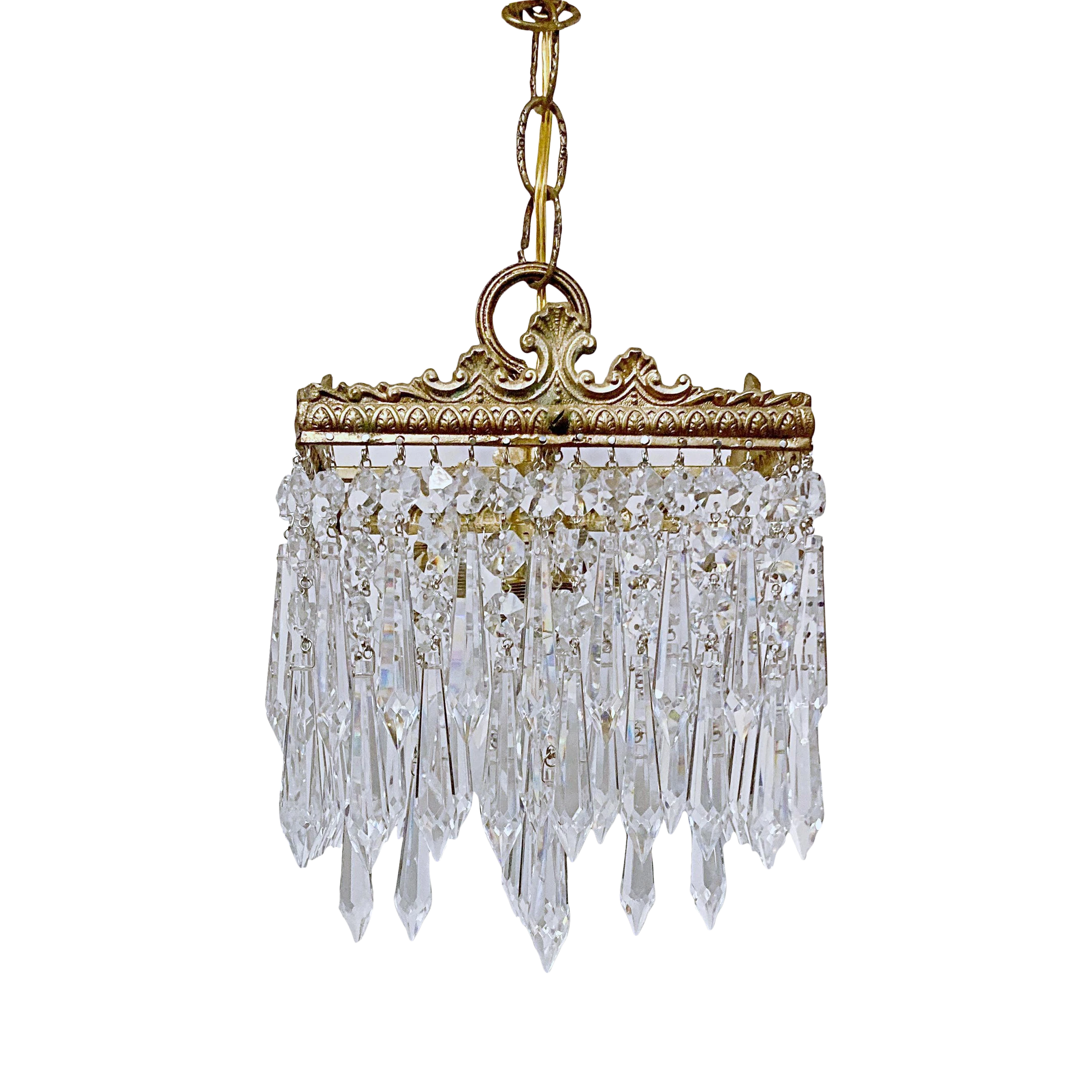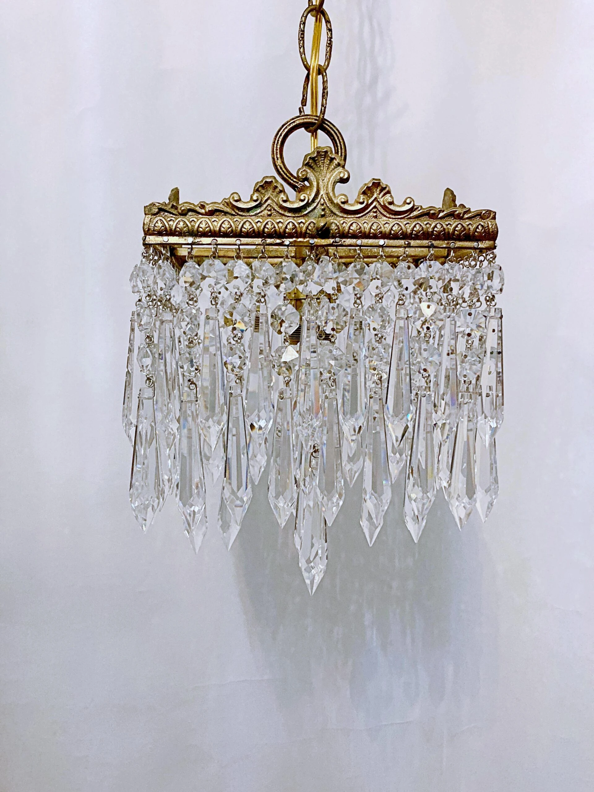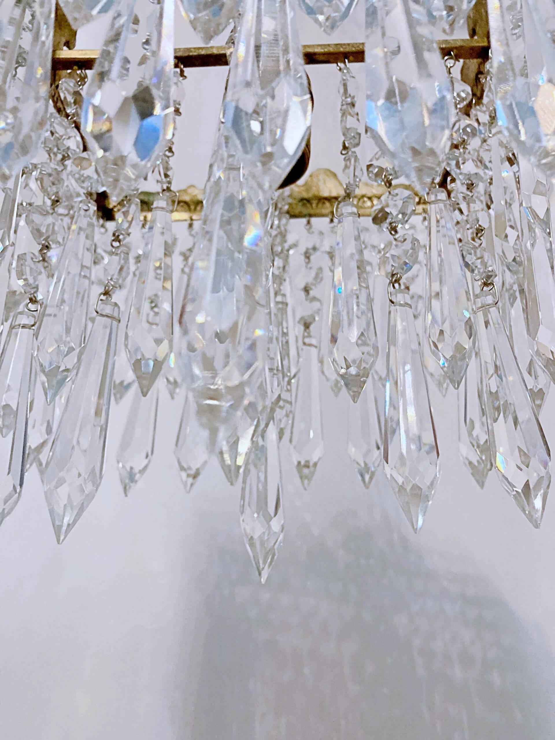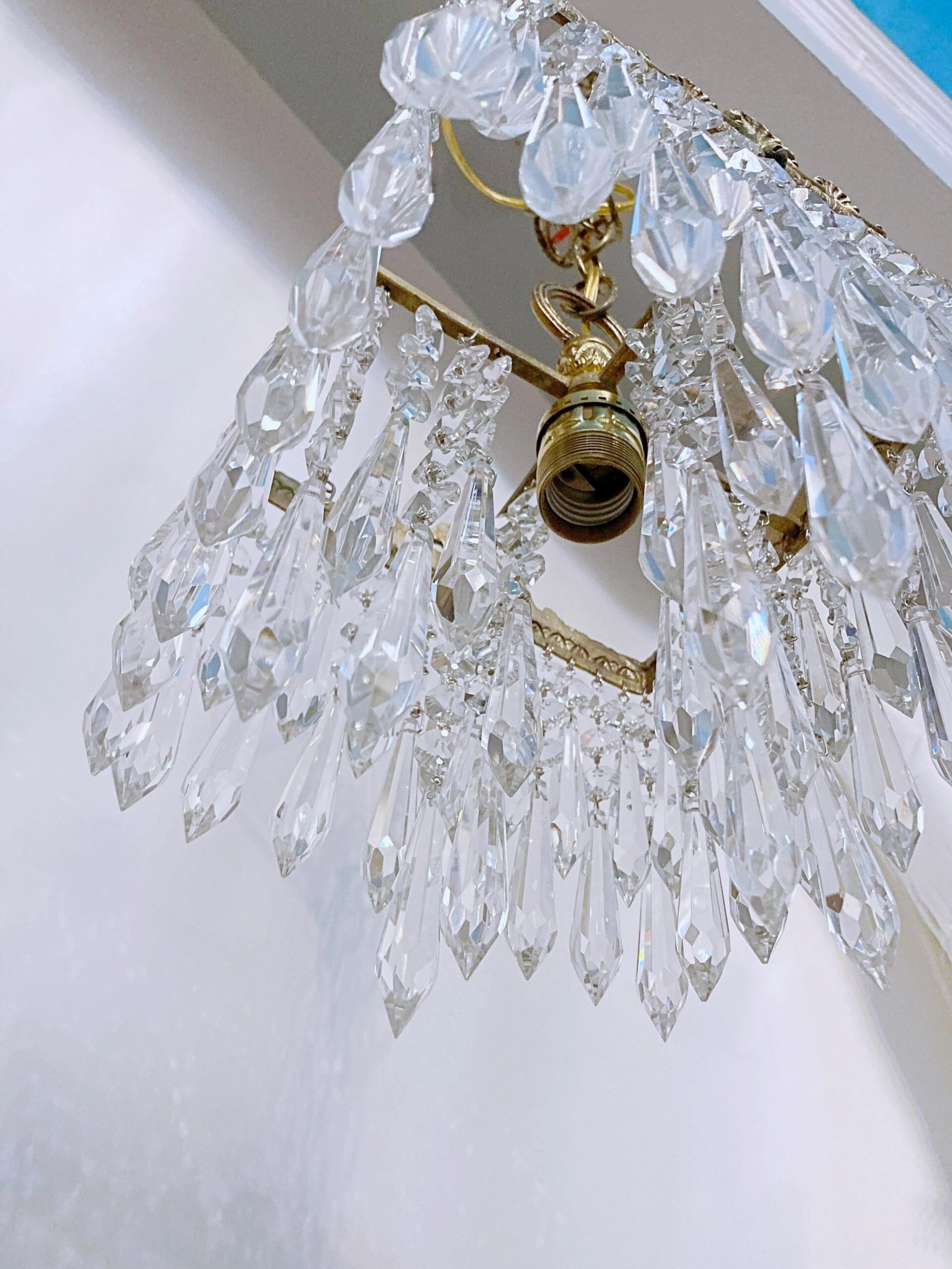 This is an Italian brass rim chandelier dressed with octagon bead and Plug cut crystals.