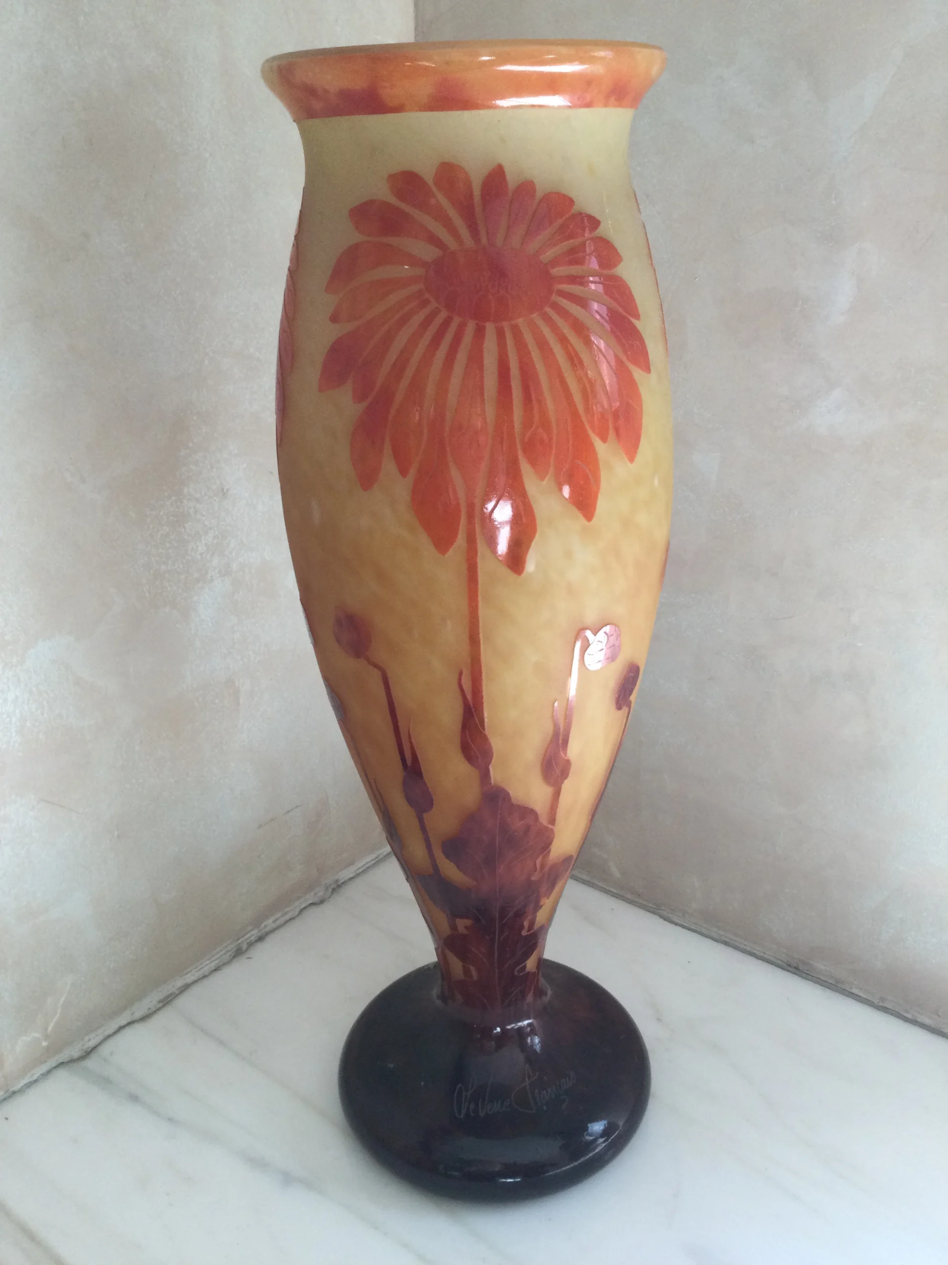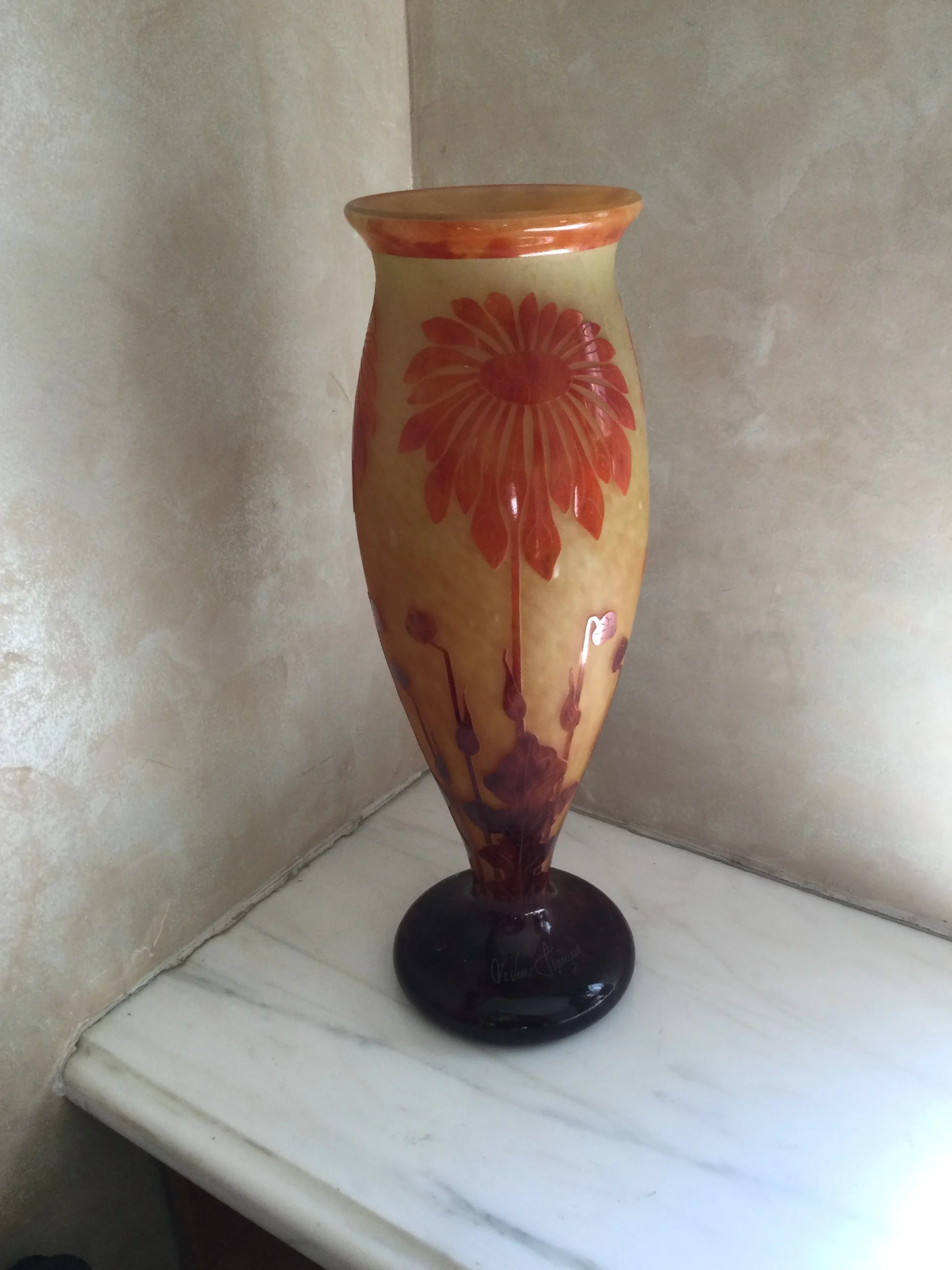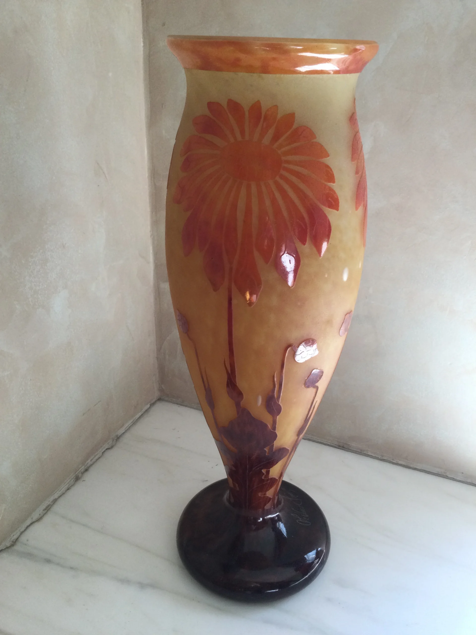 Exquisite earth colors. Signed at the stem of the vase