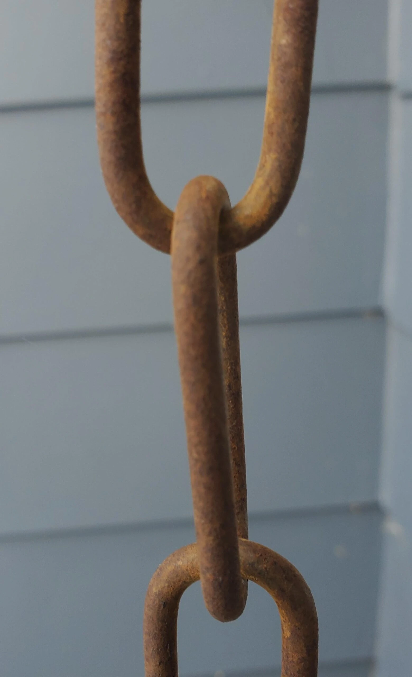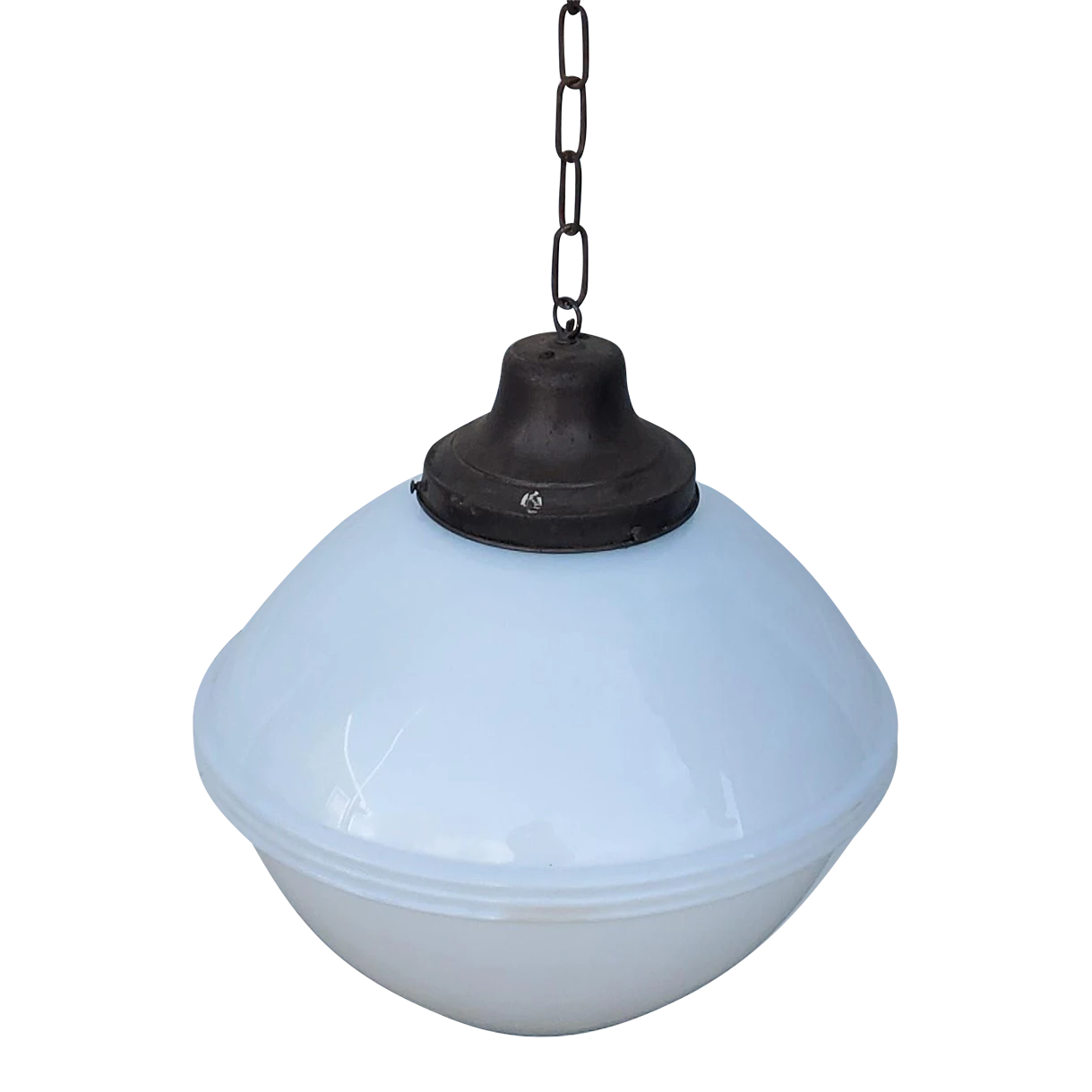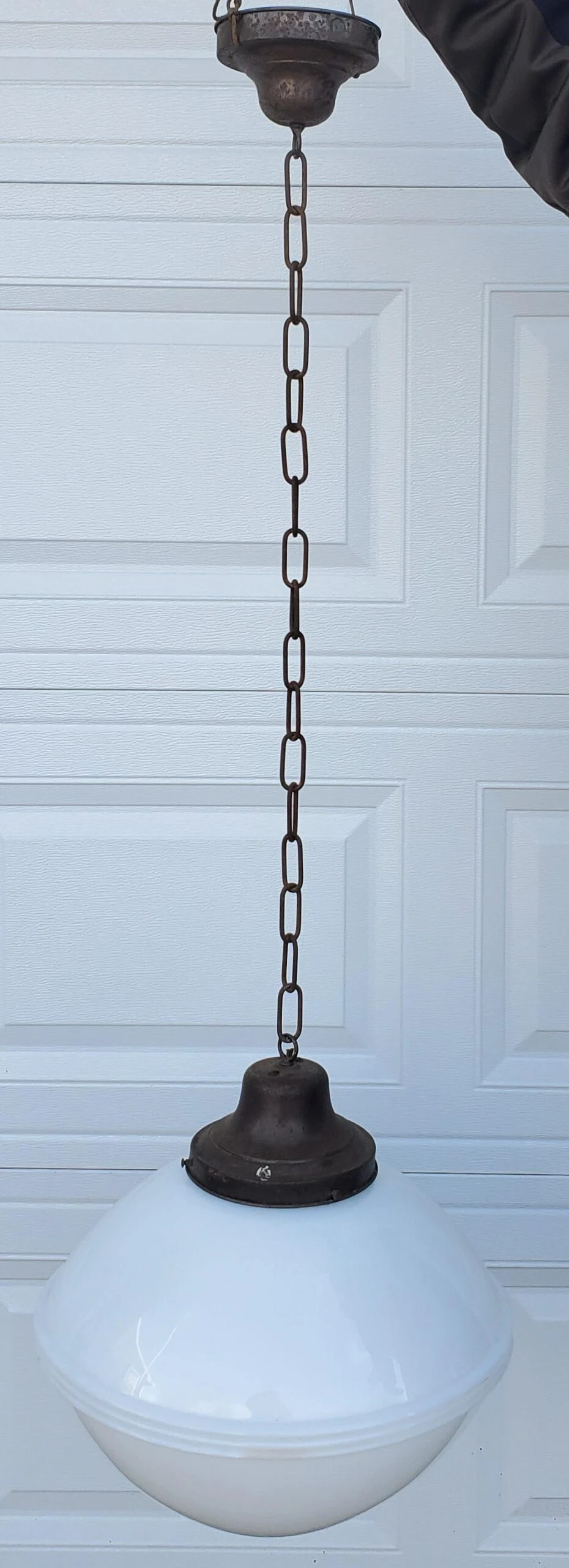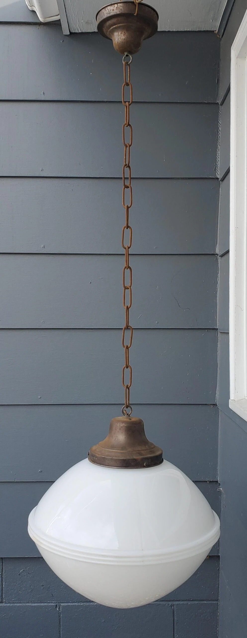 This is in good vintage condition with no chips or cracks to the heavy glass globe and the pendant has a great rusty patina