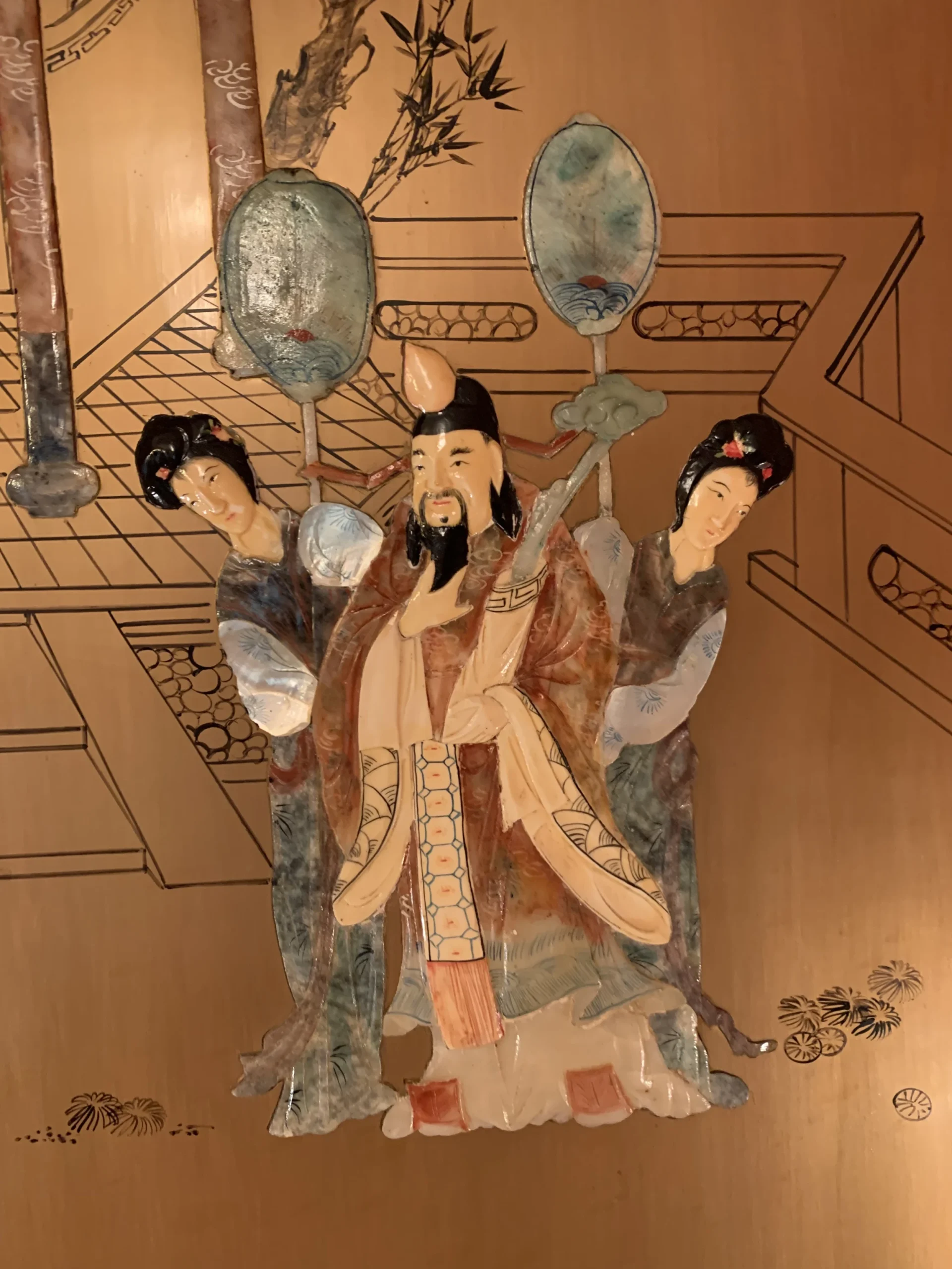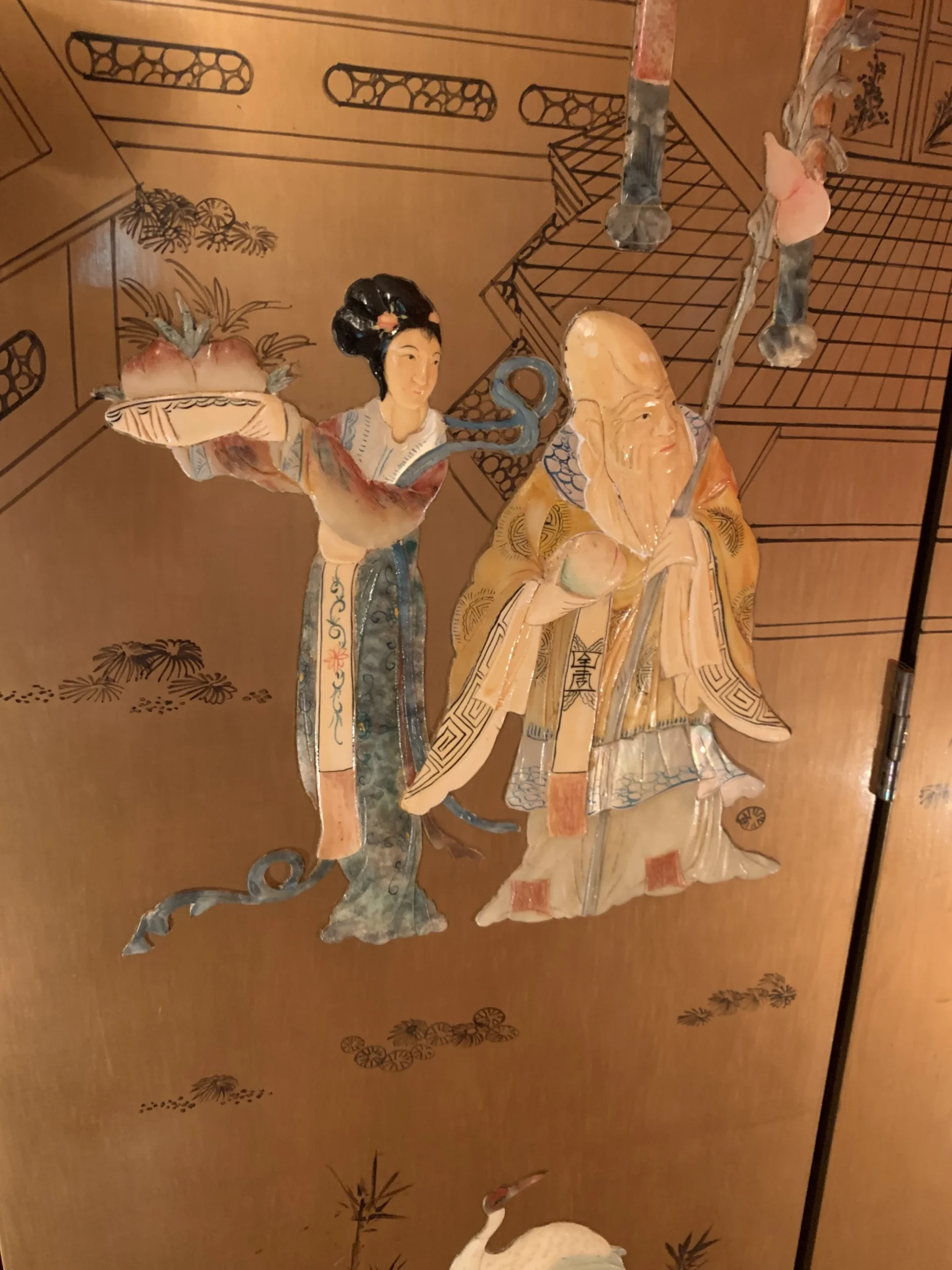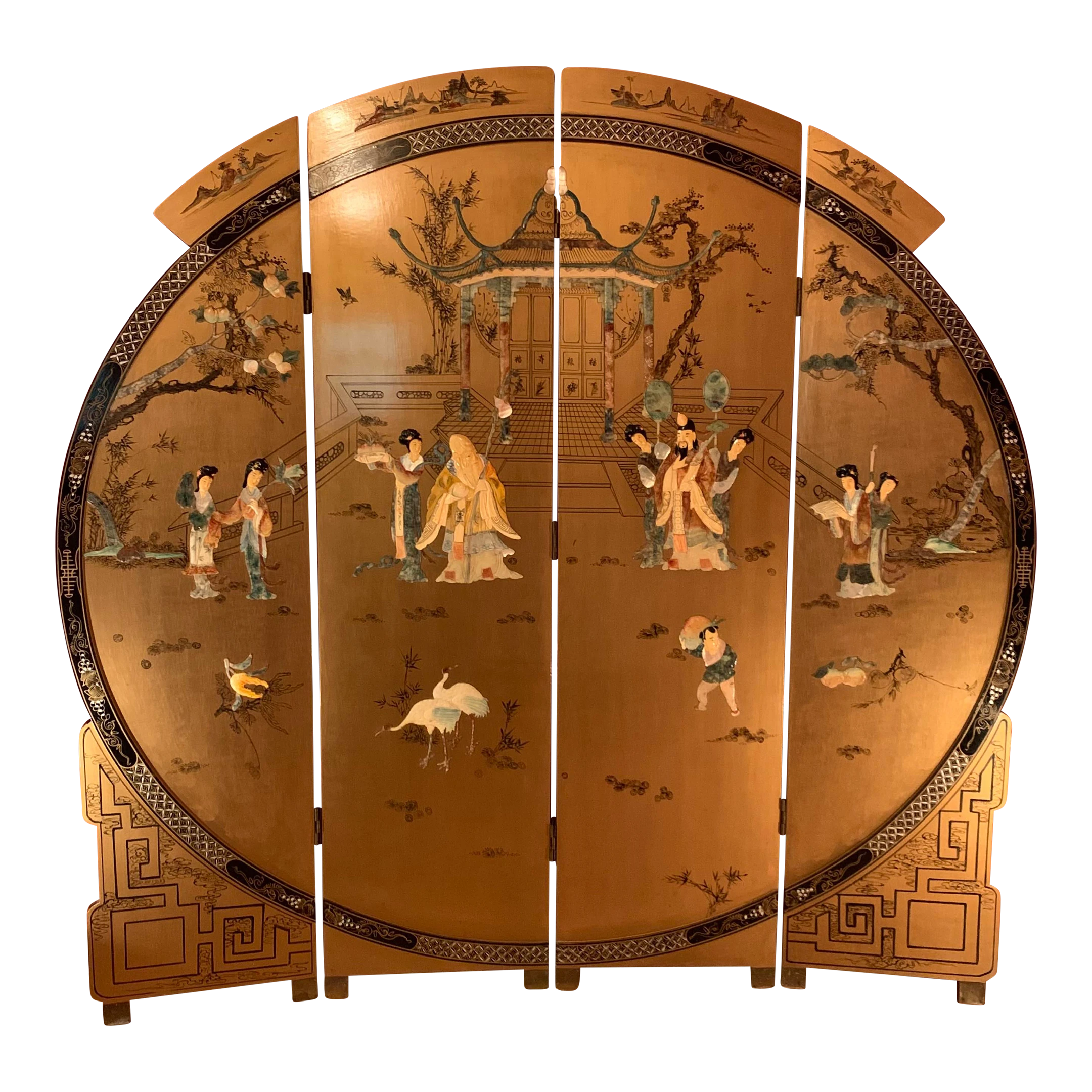 1930s Art Deco Antique Chinese screen with rounded top and semi precious stone carvings of emerald, jade, mother of pearl …