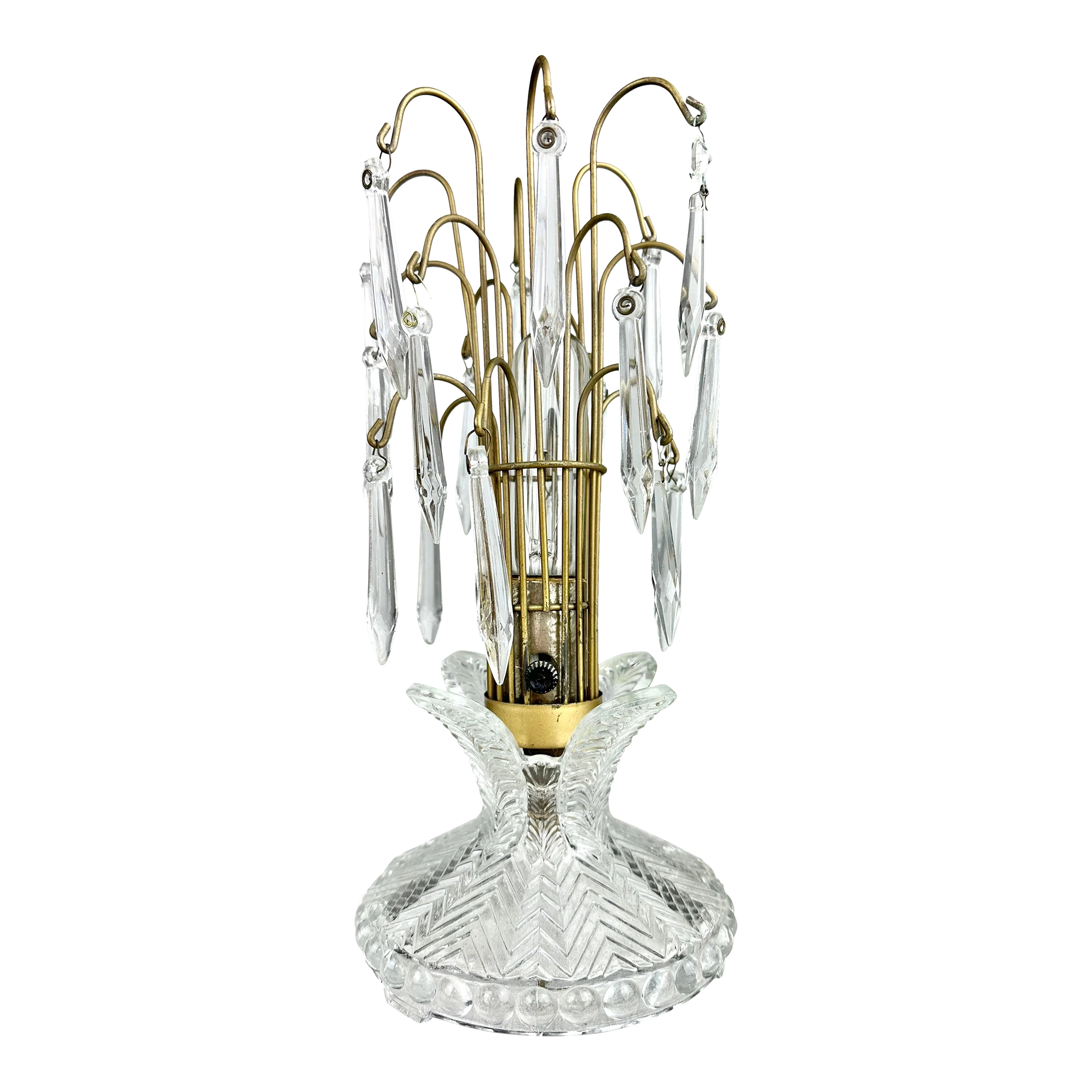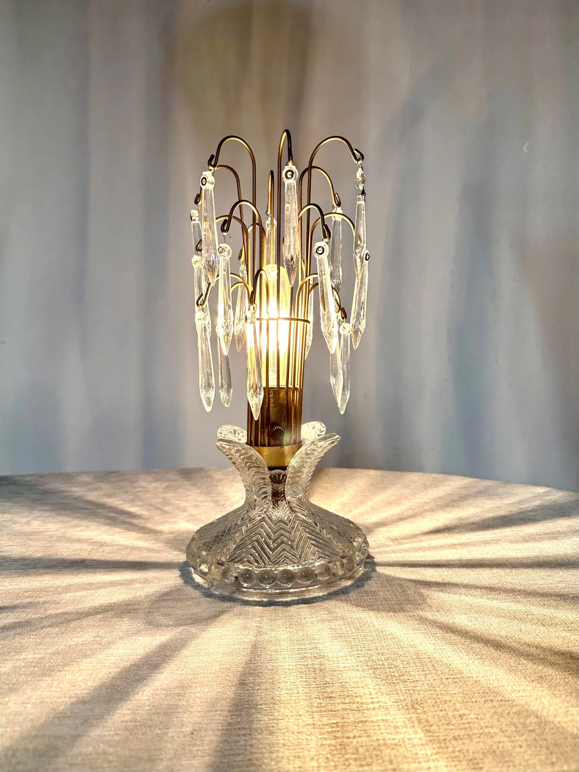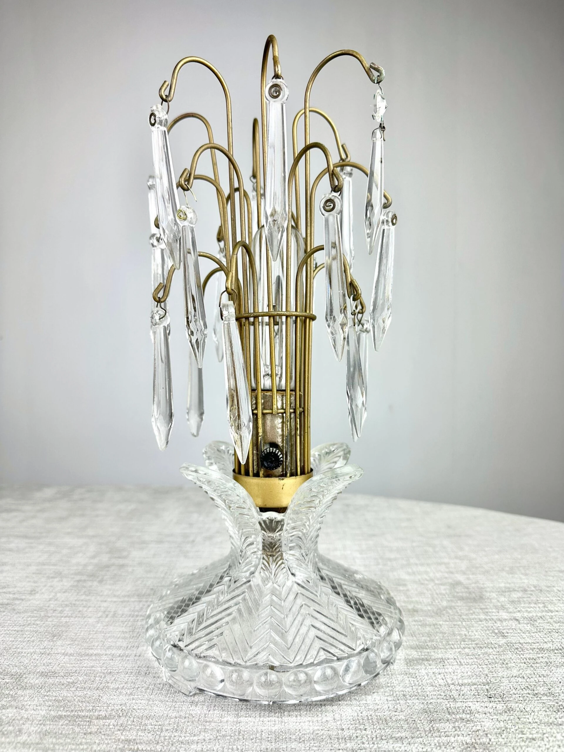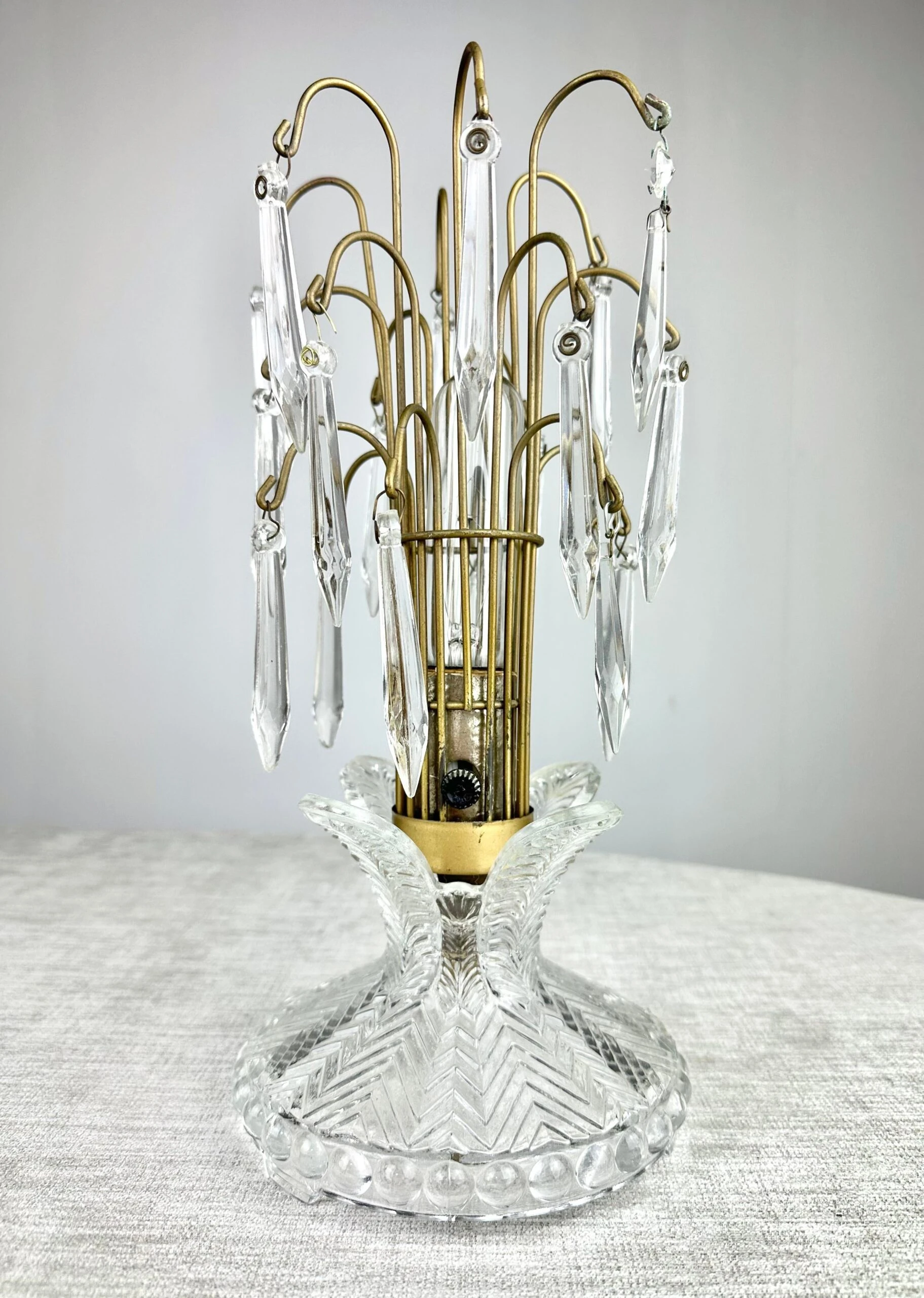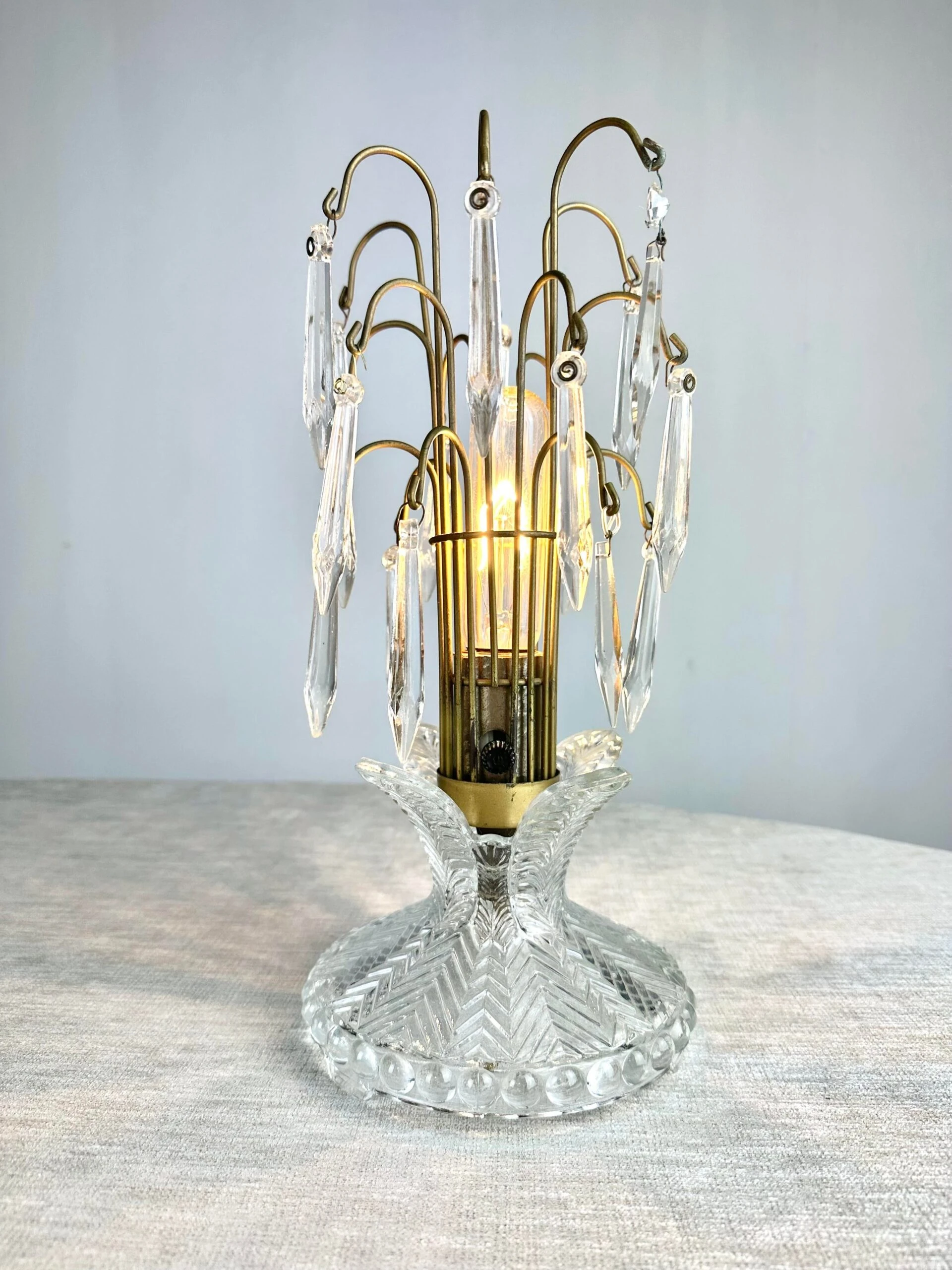 A charming 1940’s boudoir accent lamp of pressed glass and prism crystals. A great look whether lit or not.