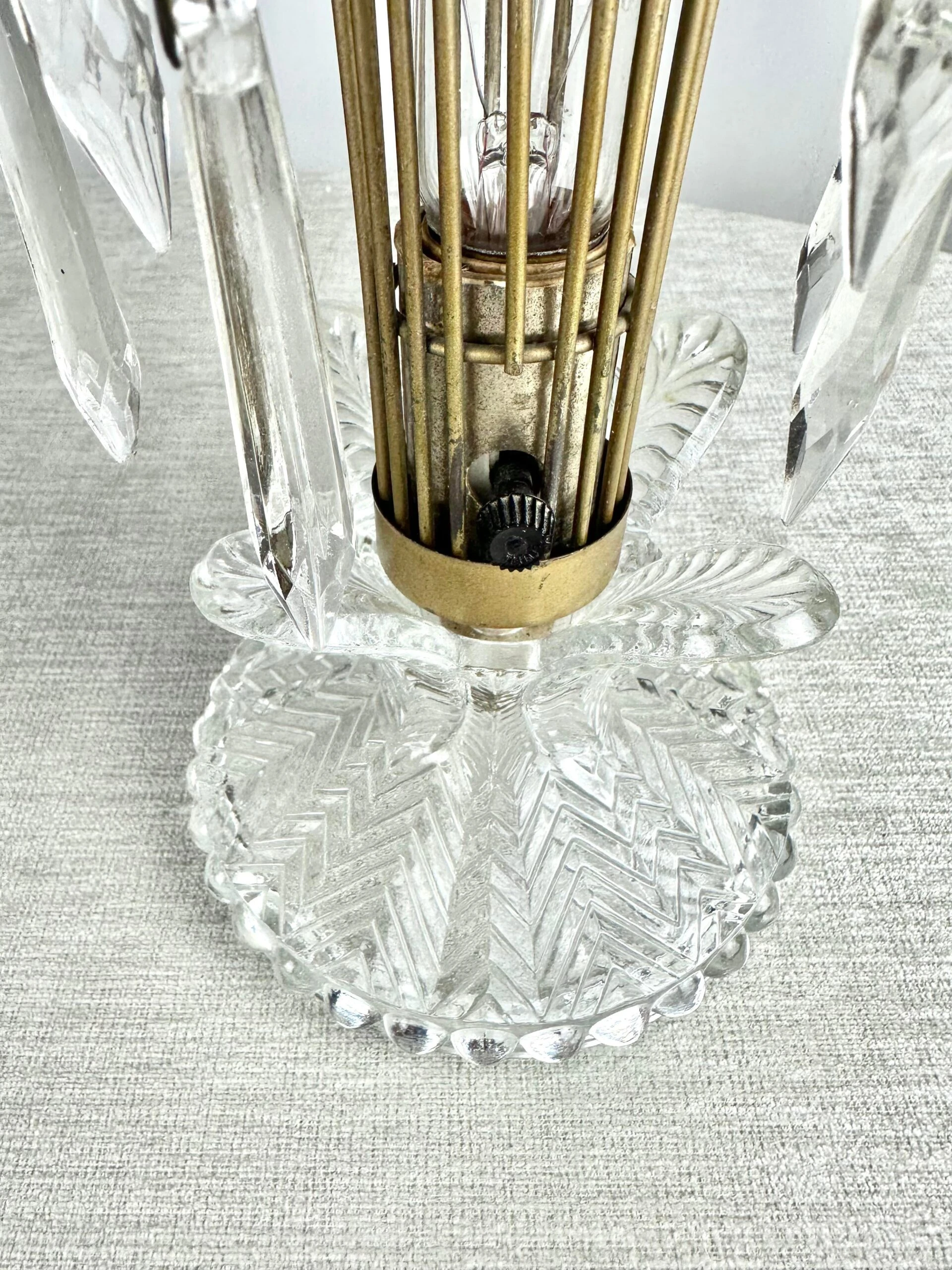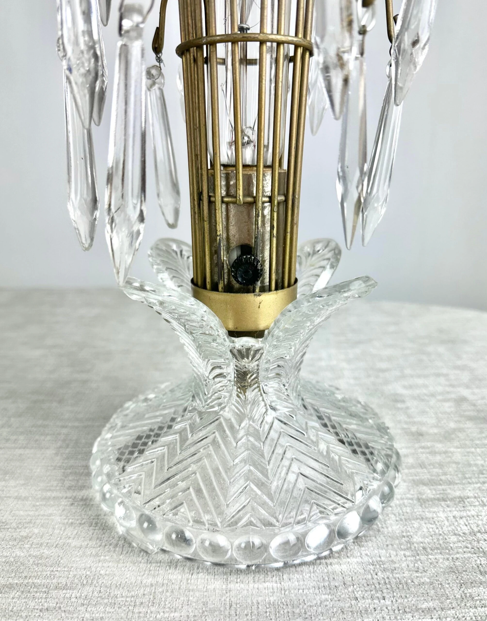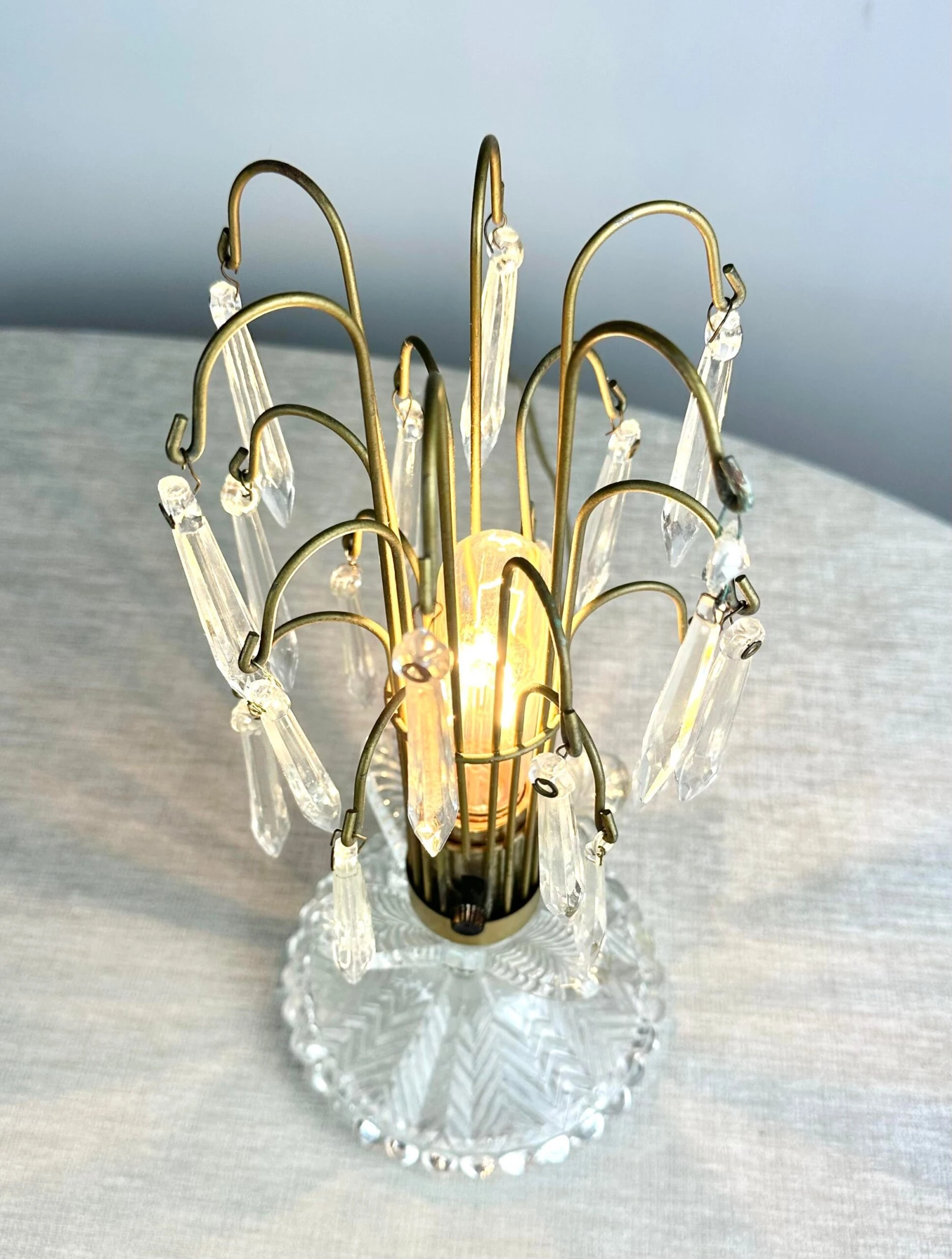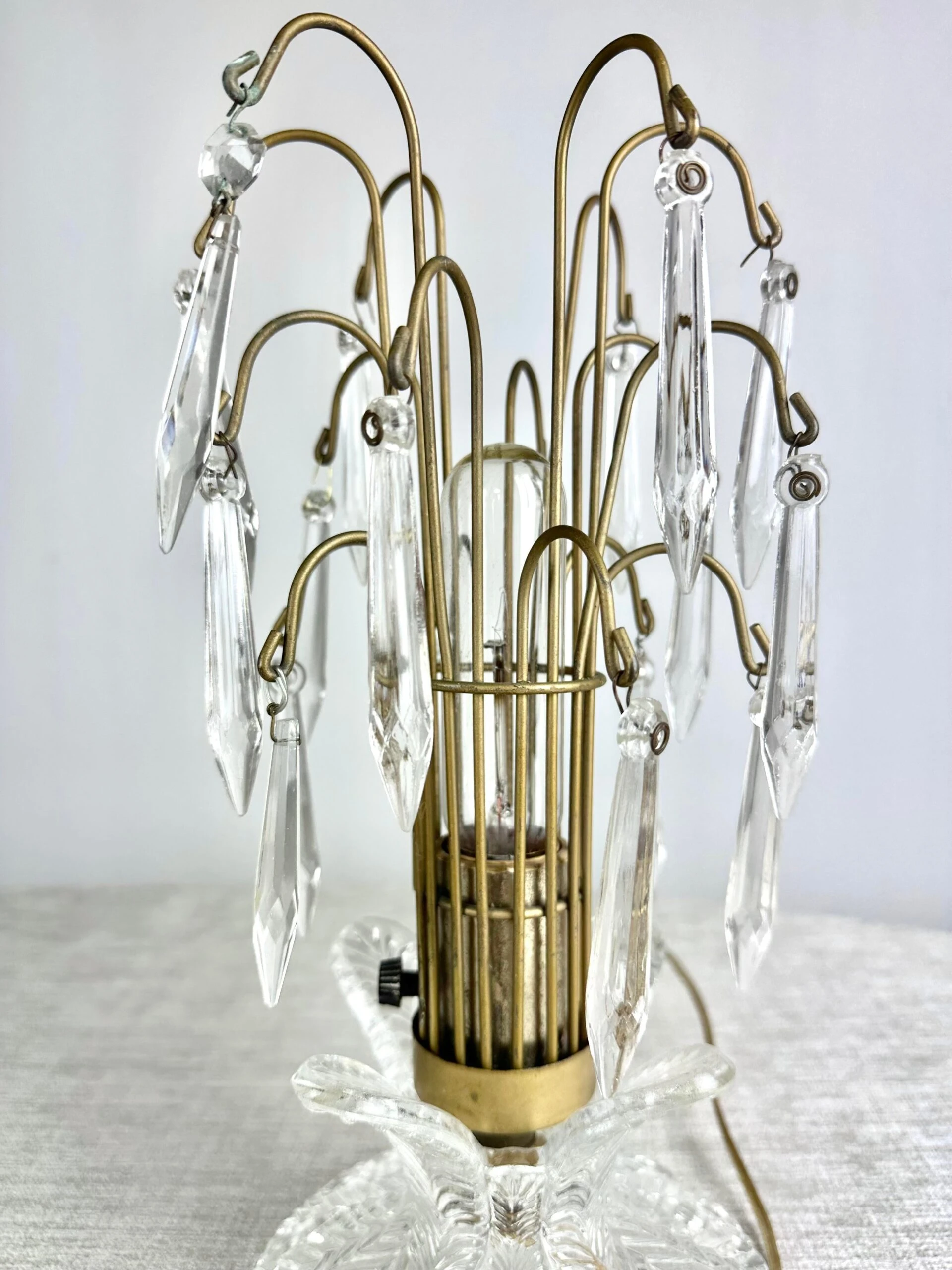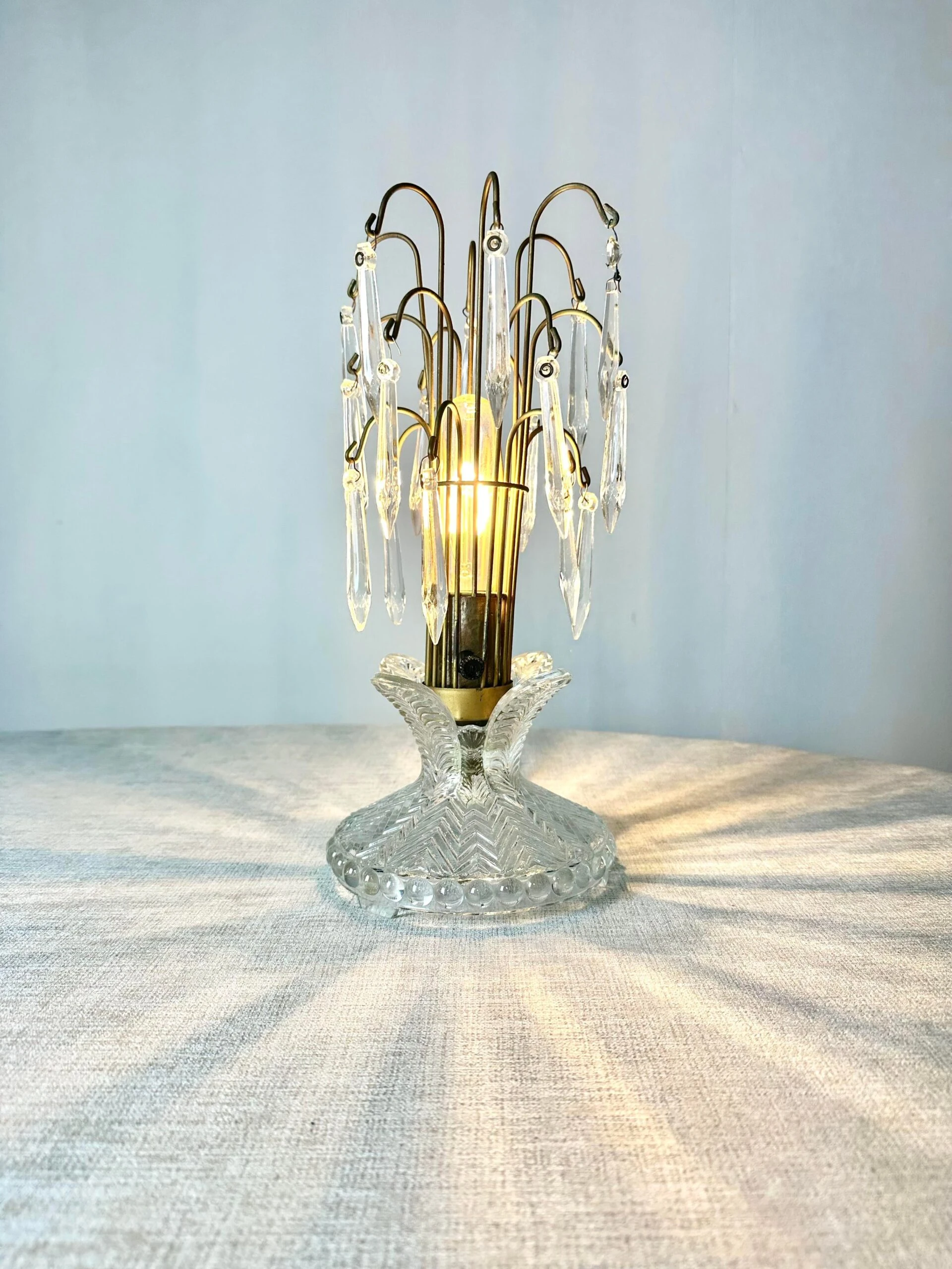 A charming 1940’s boudoir accent lamp of pressed glass and prism crystals. A great look whether lit or not.