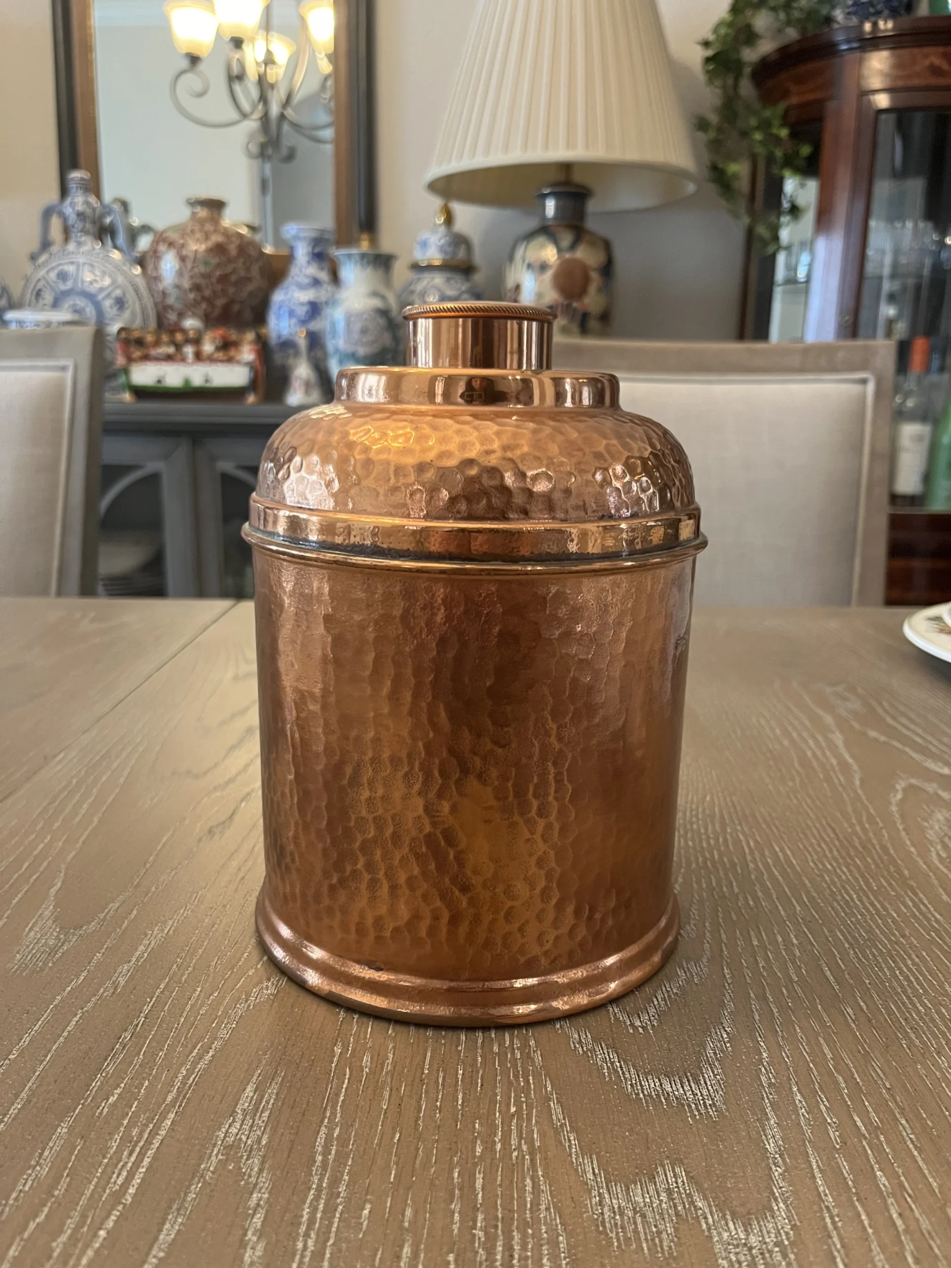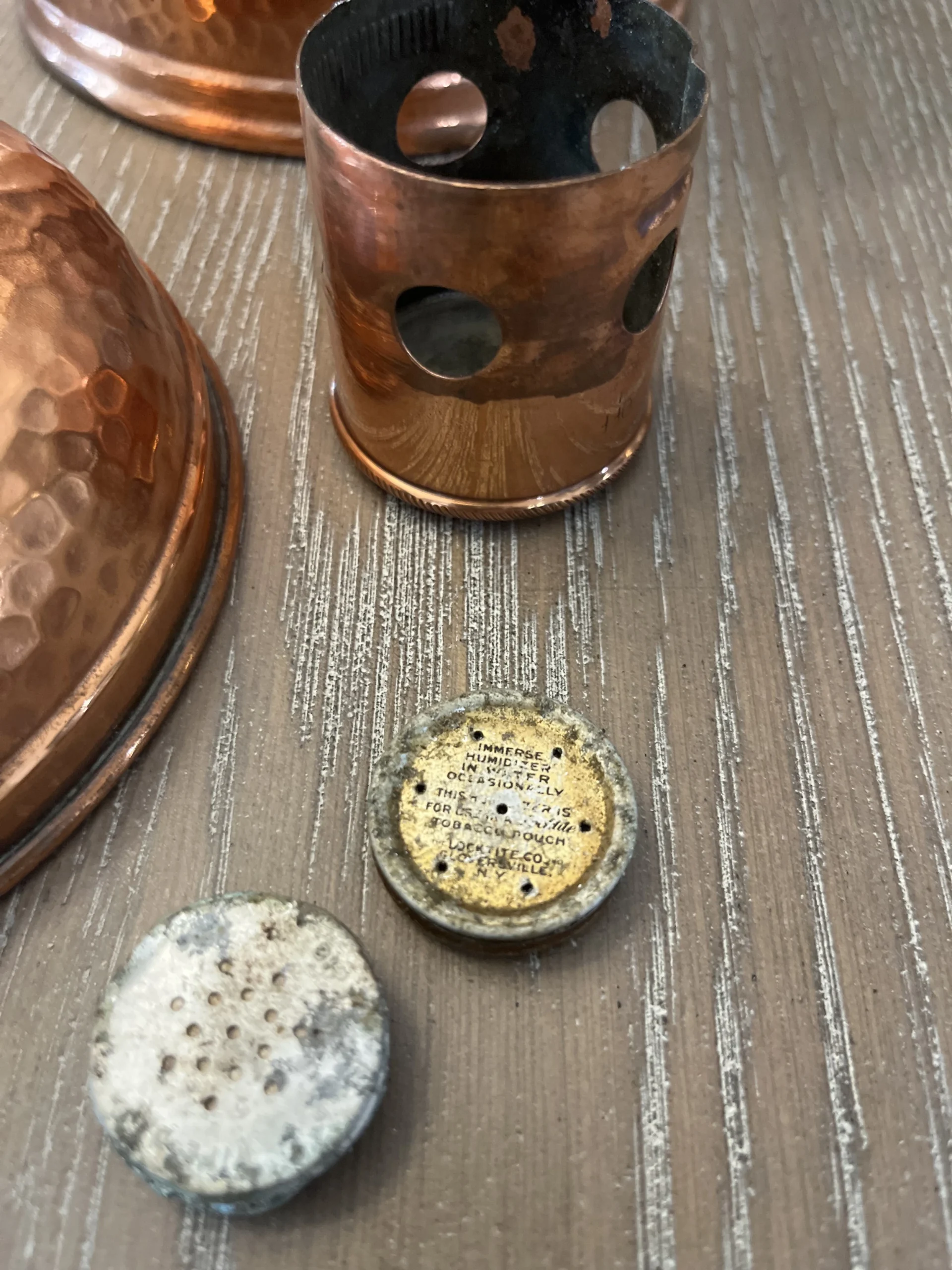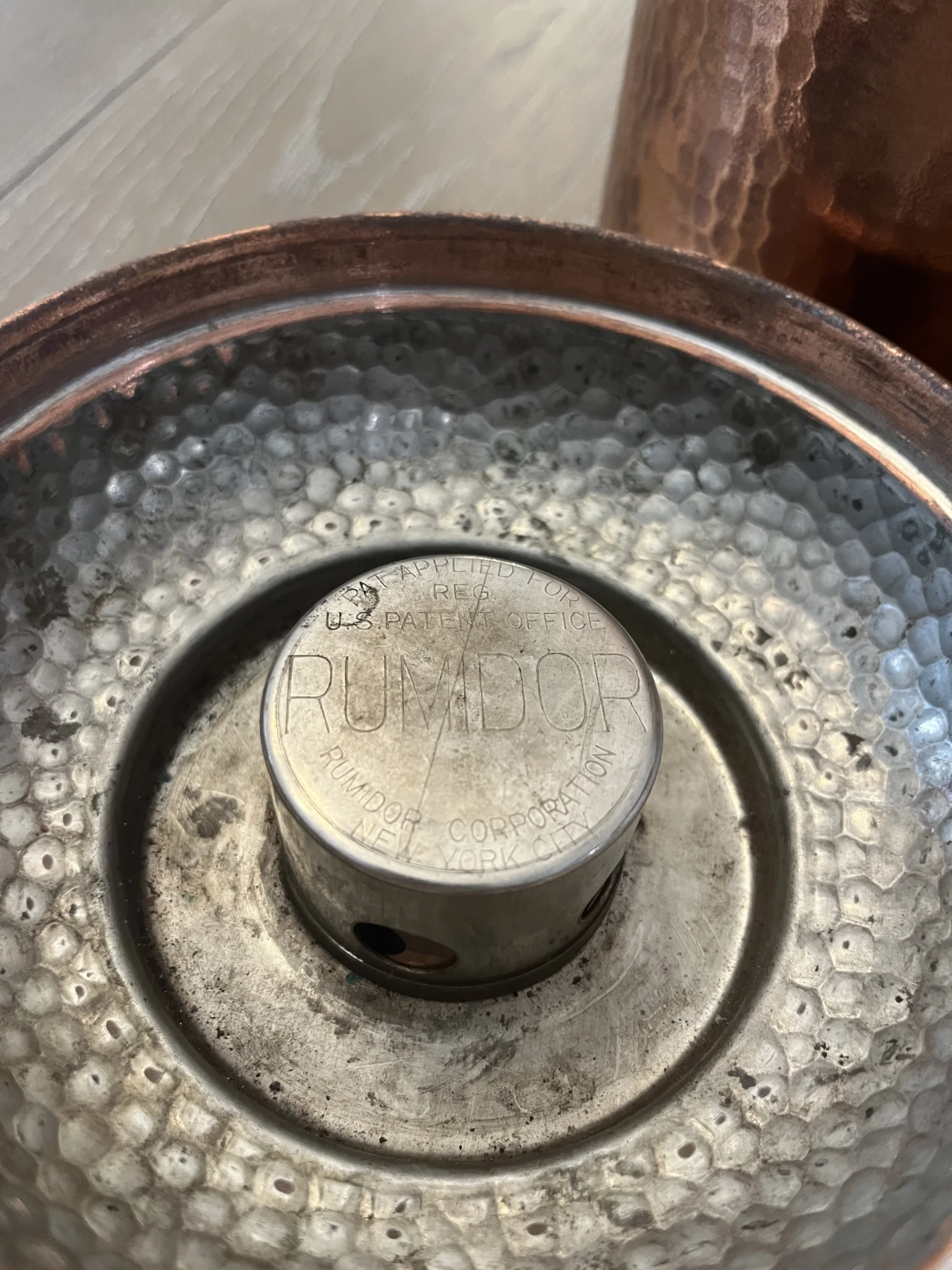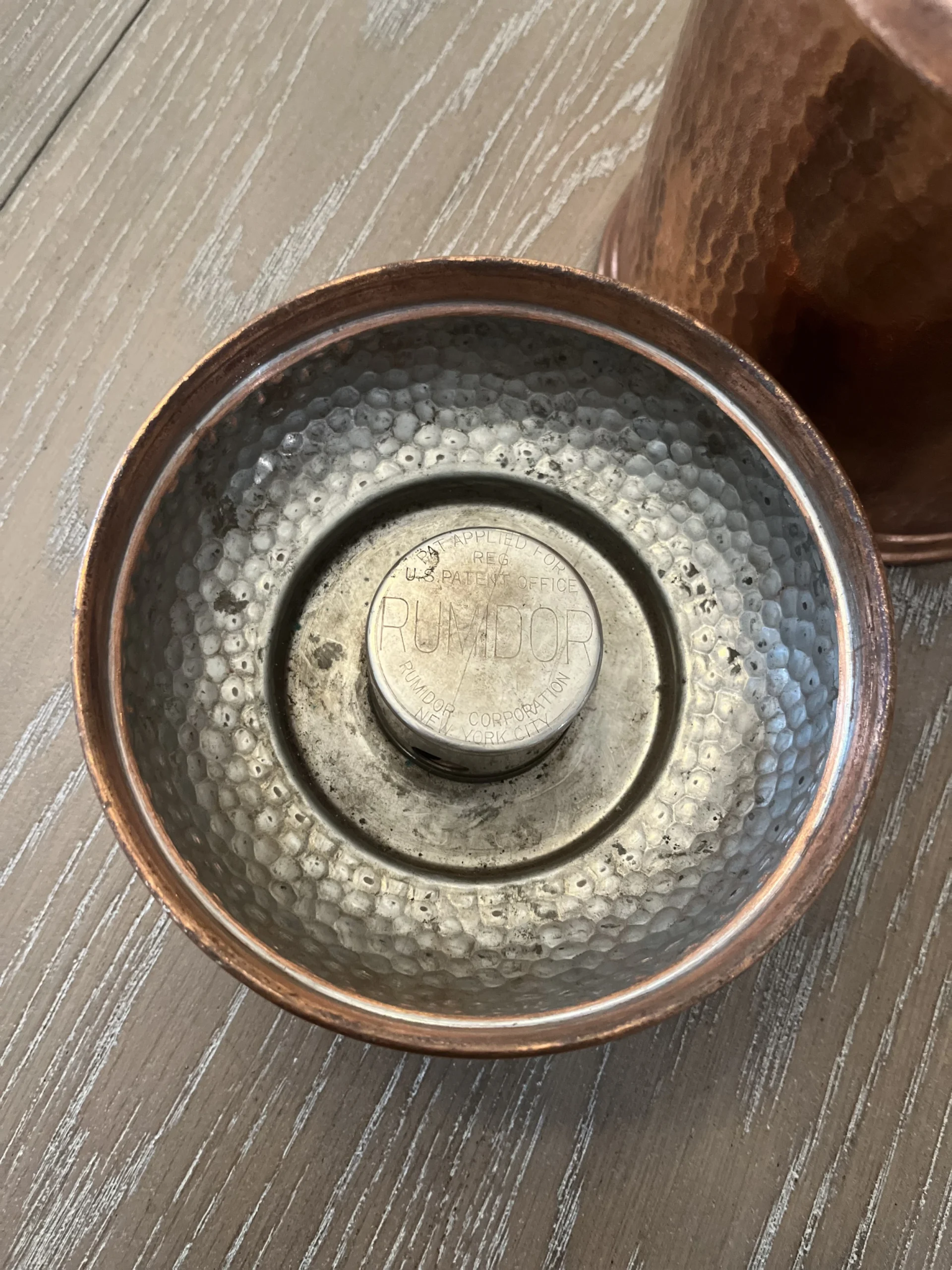 1930’s Tobacco Rumidor from New York. Hammered copper. No dents seen. Tarnishing all over, consistent with age.