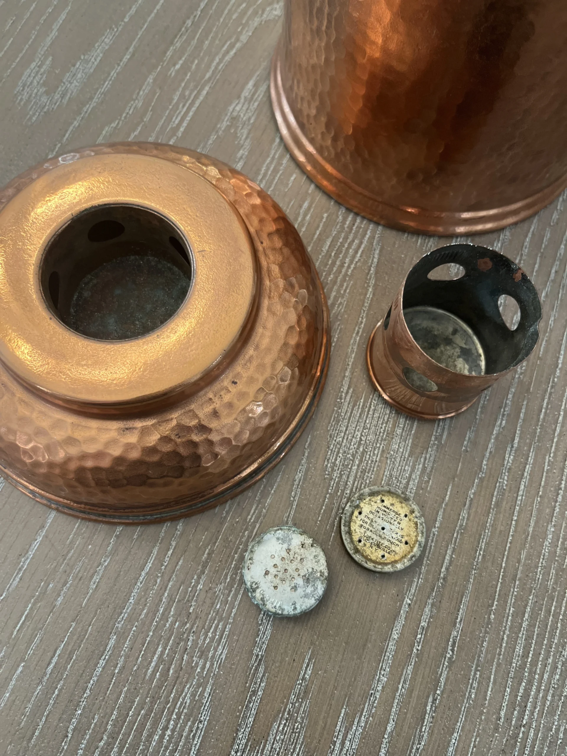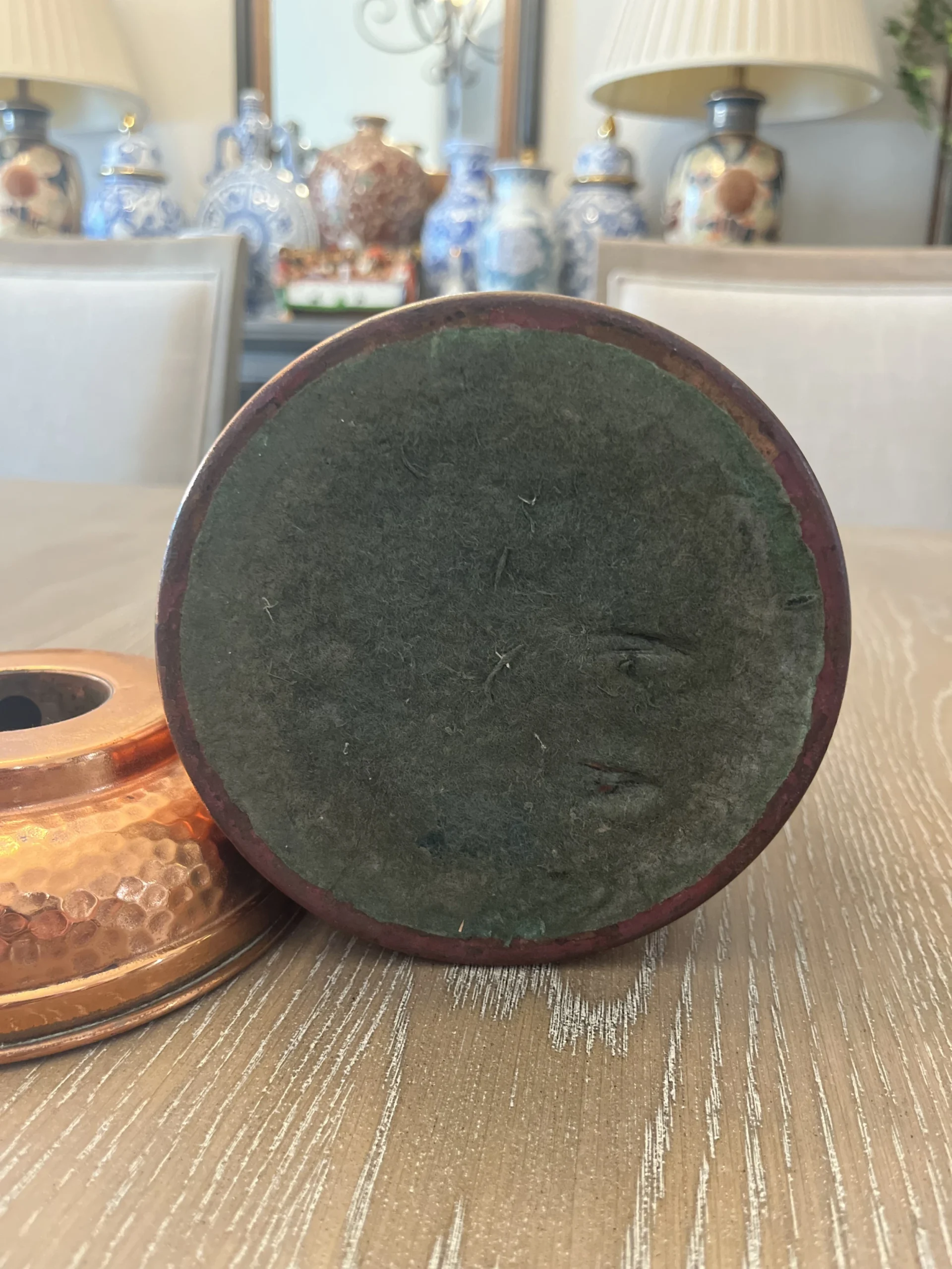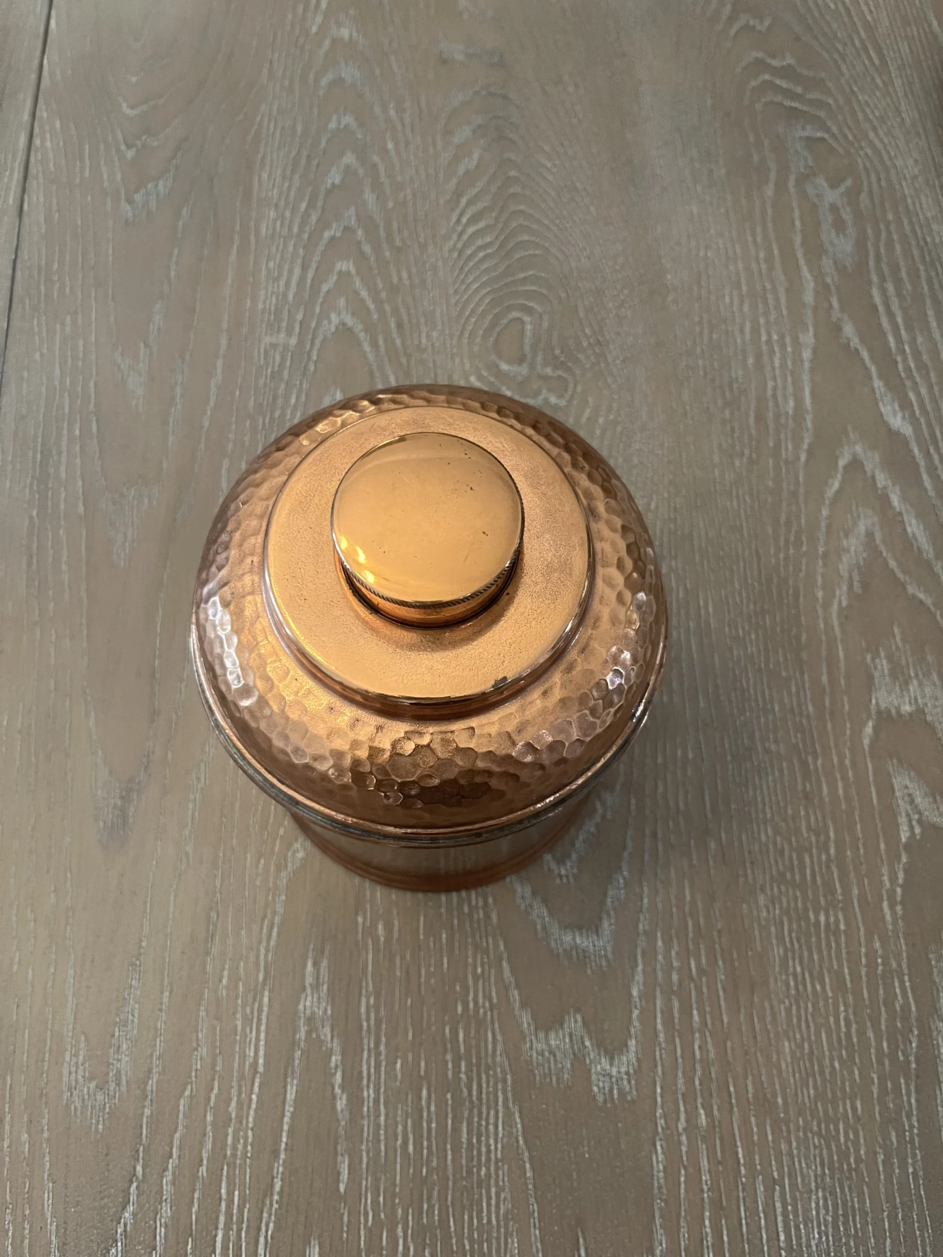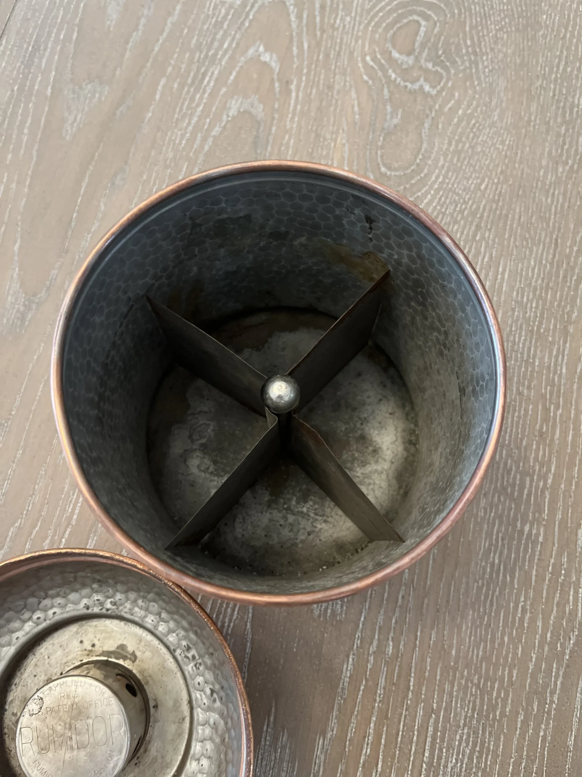 1930’s Tobacco Rumidor from New York. Hammered copper. No dents seen. Tarnishing all over, consistent with age.