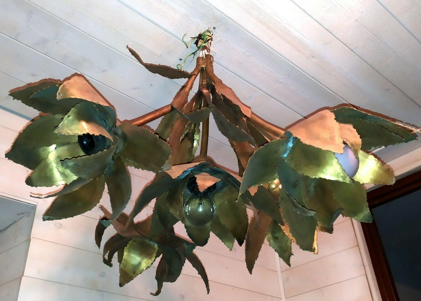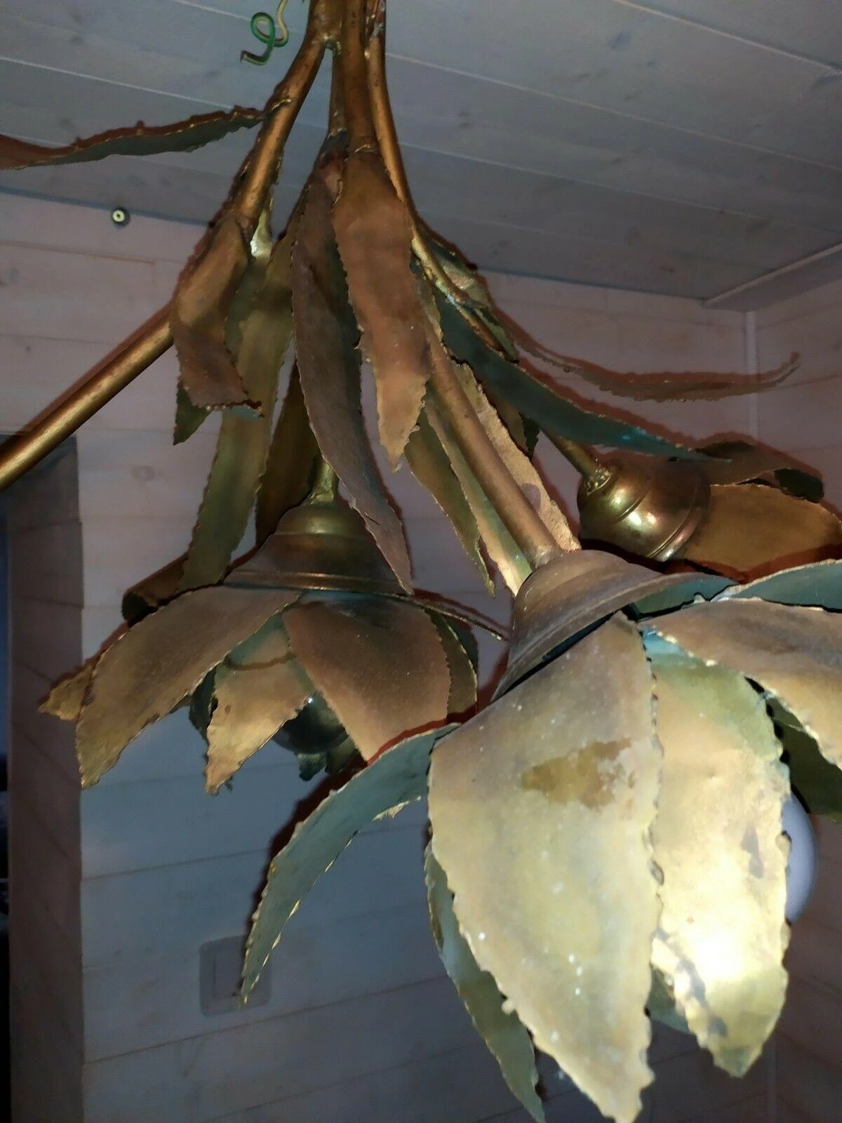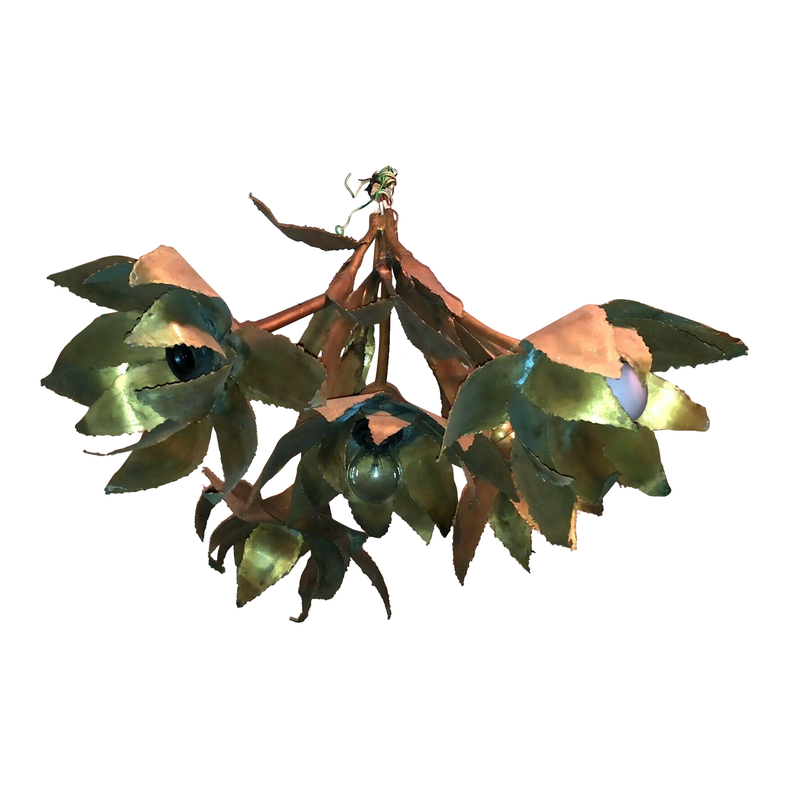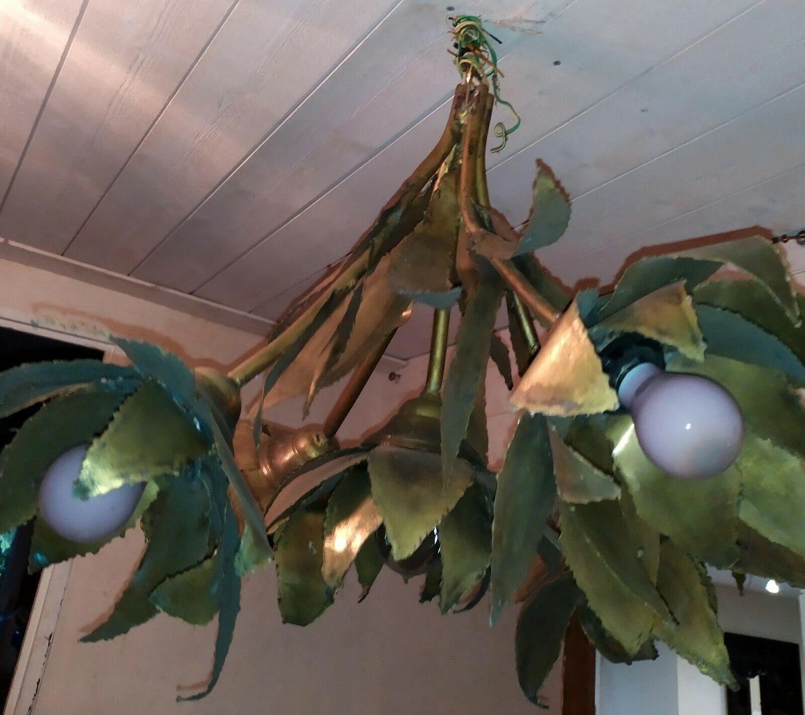 1930’s French Art Deco Bronze Brutalist Ceiling Fixture/ Chandelier. 5 Large lit flowers. Attribution to Maison Jansen. We will drop …