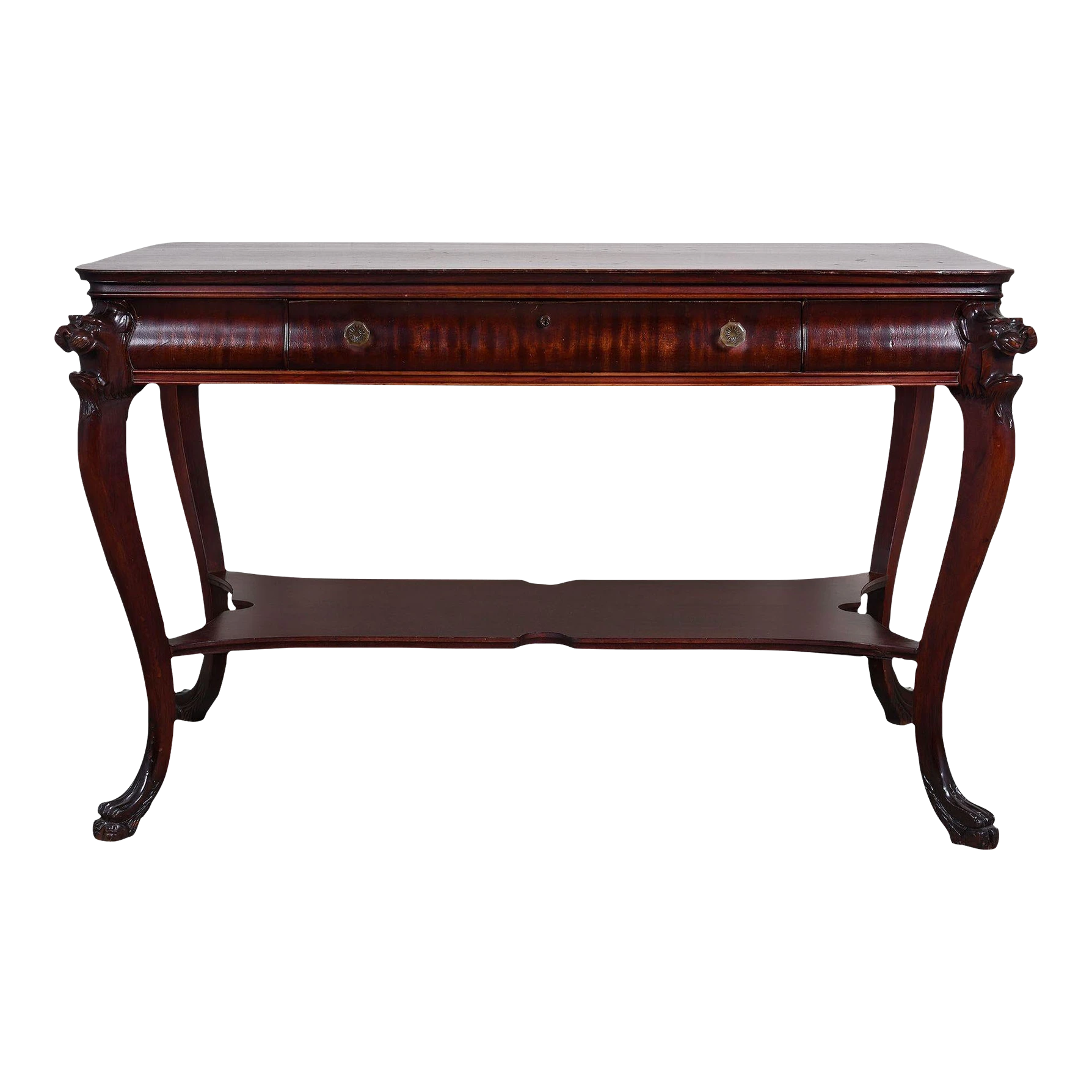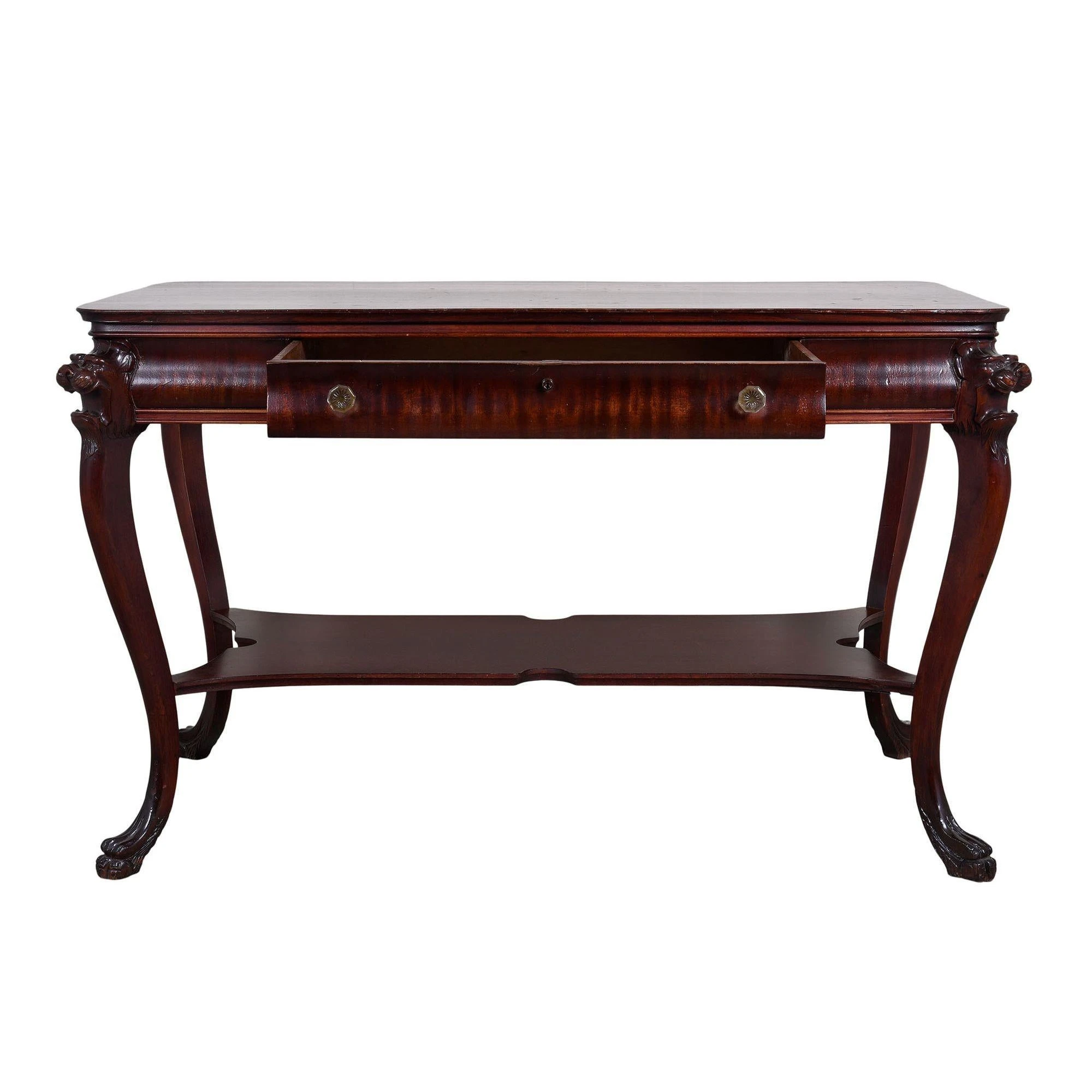 Vintage American mahogany lion head library table, circa 1930. This rectangular library table is crafted in mahogany featuring carved lion heads on the corners and claw feet. The vintage American library table has a single drawer with original pulls.