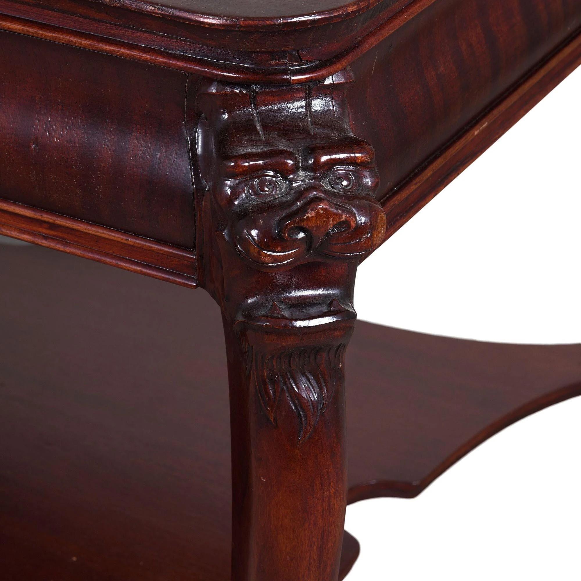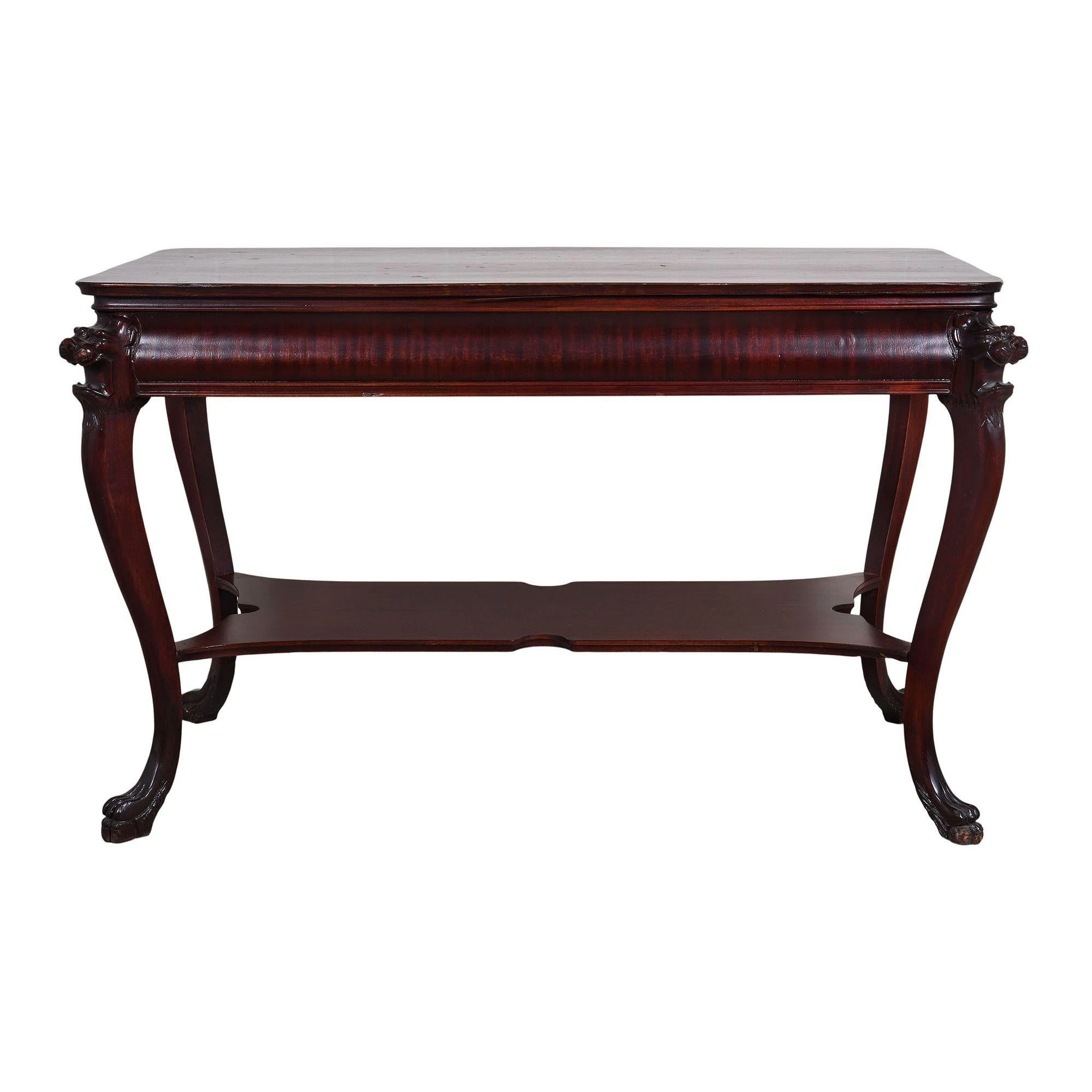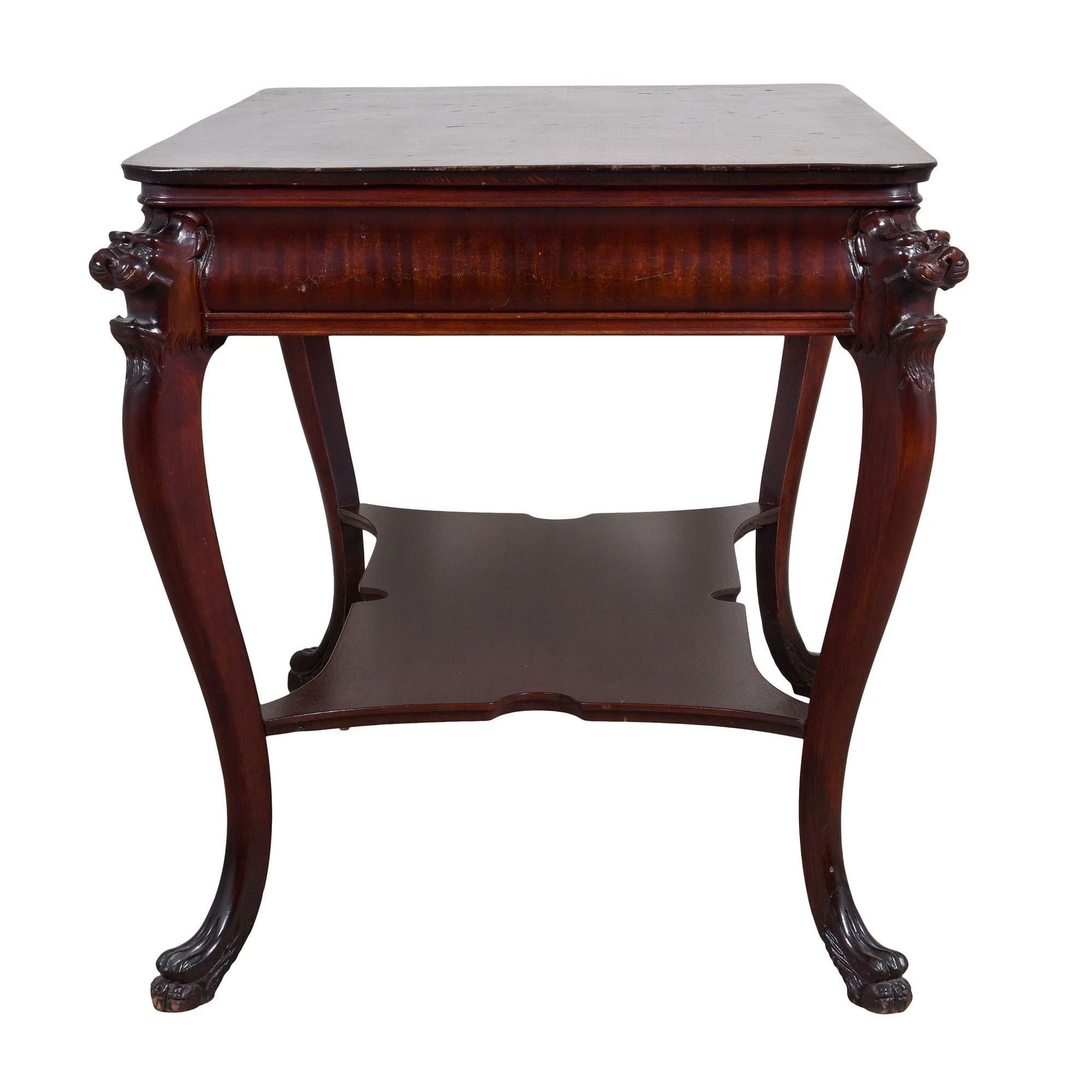 Vintage American mahogany lion head library table, circa 1930. This rectangular library table is crafted in mahogany featuring carved lion …