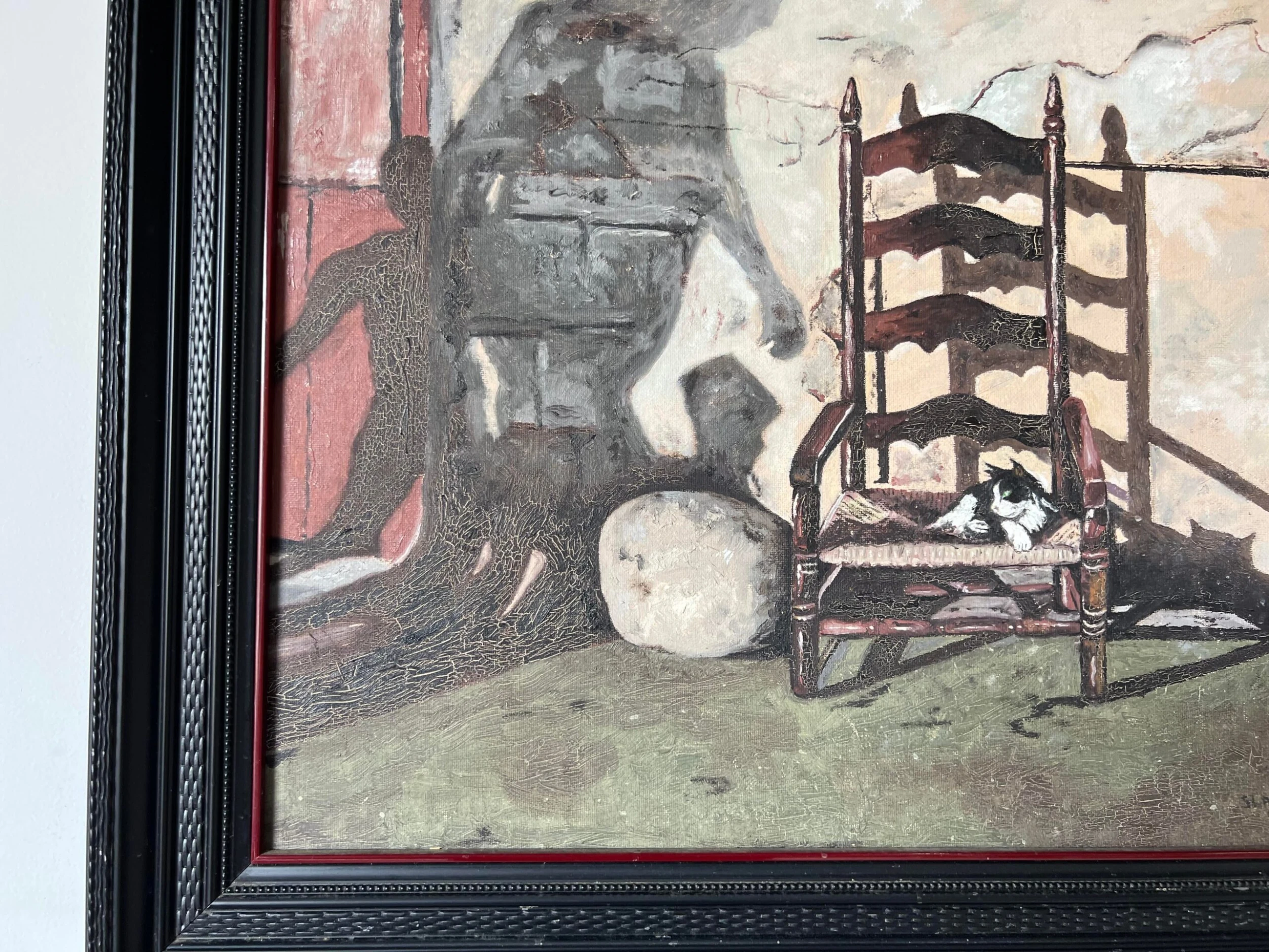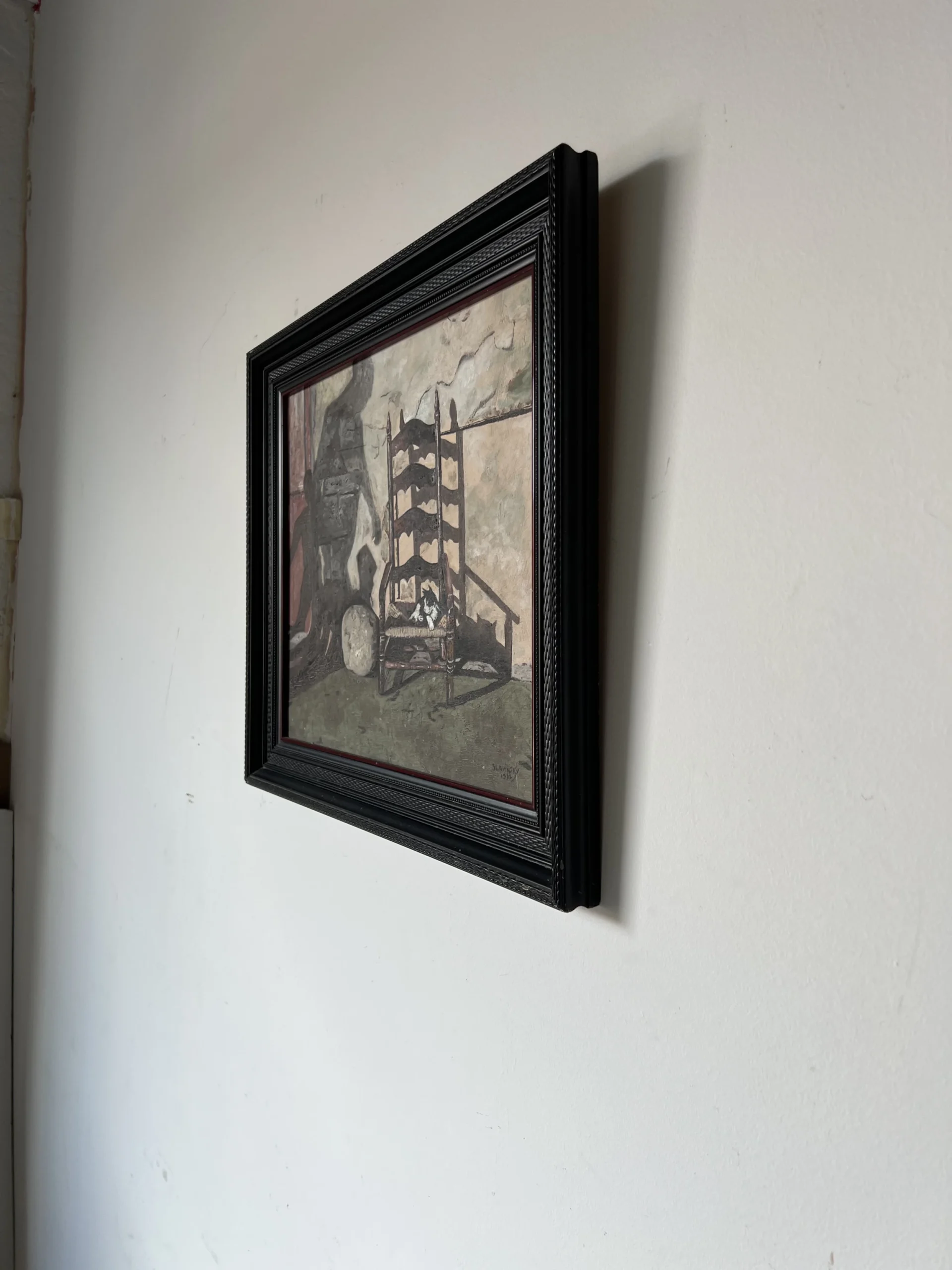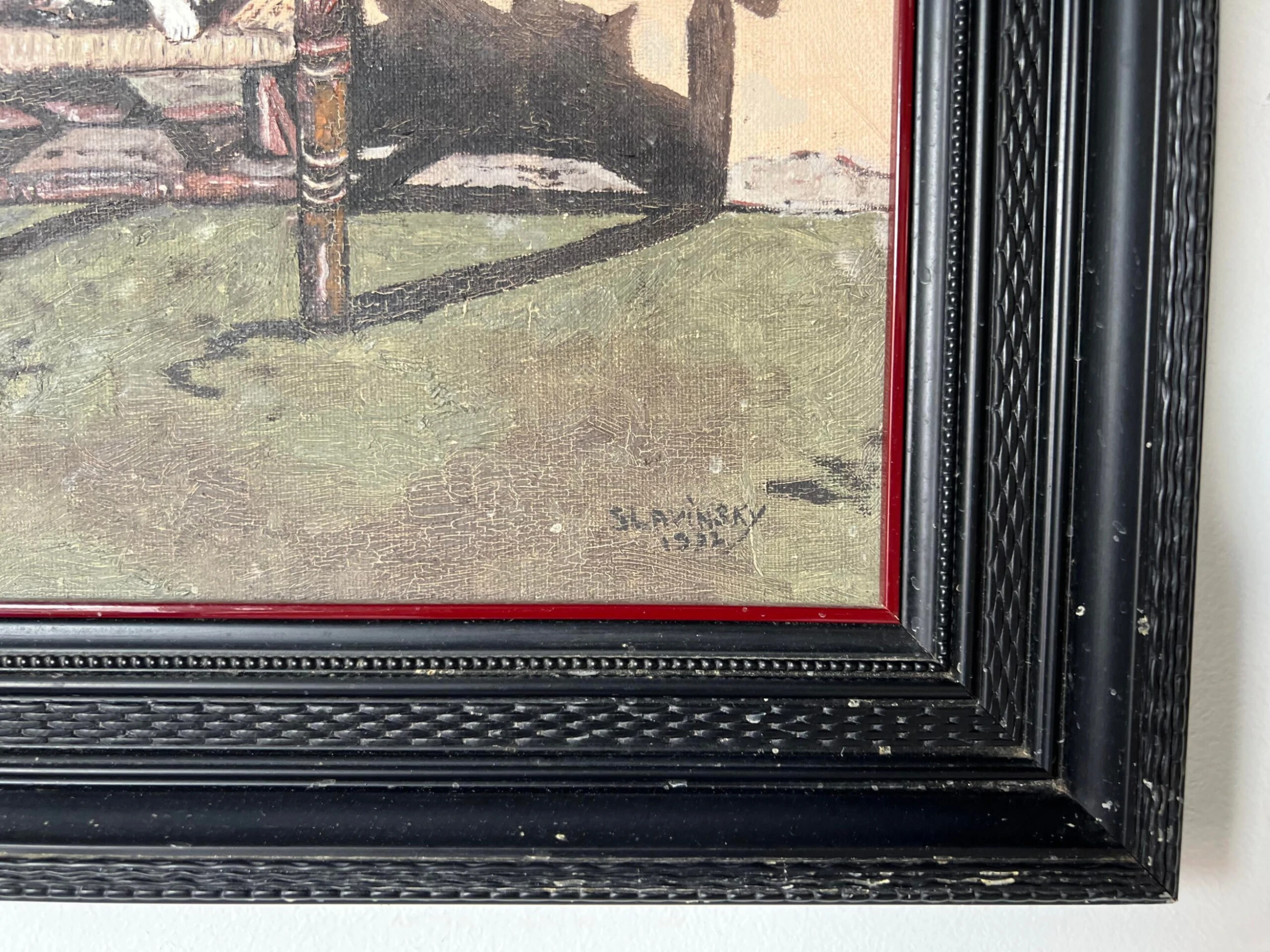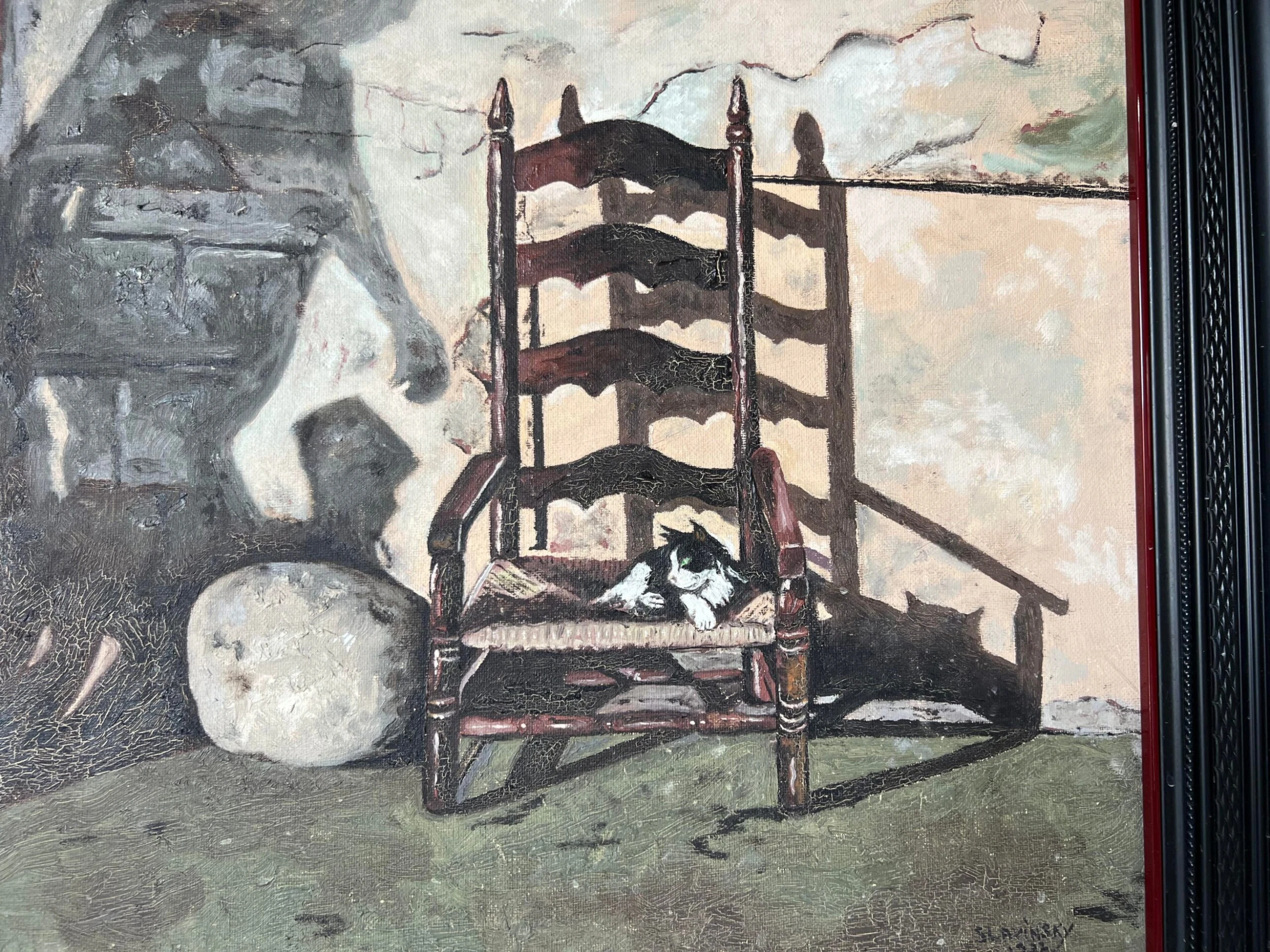 artistic canvas panel. Portraying the sunset of very rural village scene of a French ladder back chair with a cat a stone to the side and the shadow of two people. Artist signed lower right side by Slavinsky and date of 1932. Displayed on a black wood frame with a hanging wire attached to the reverse side. the frame is new, I consider 10/15 years old.