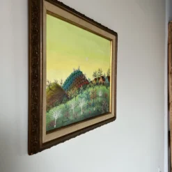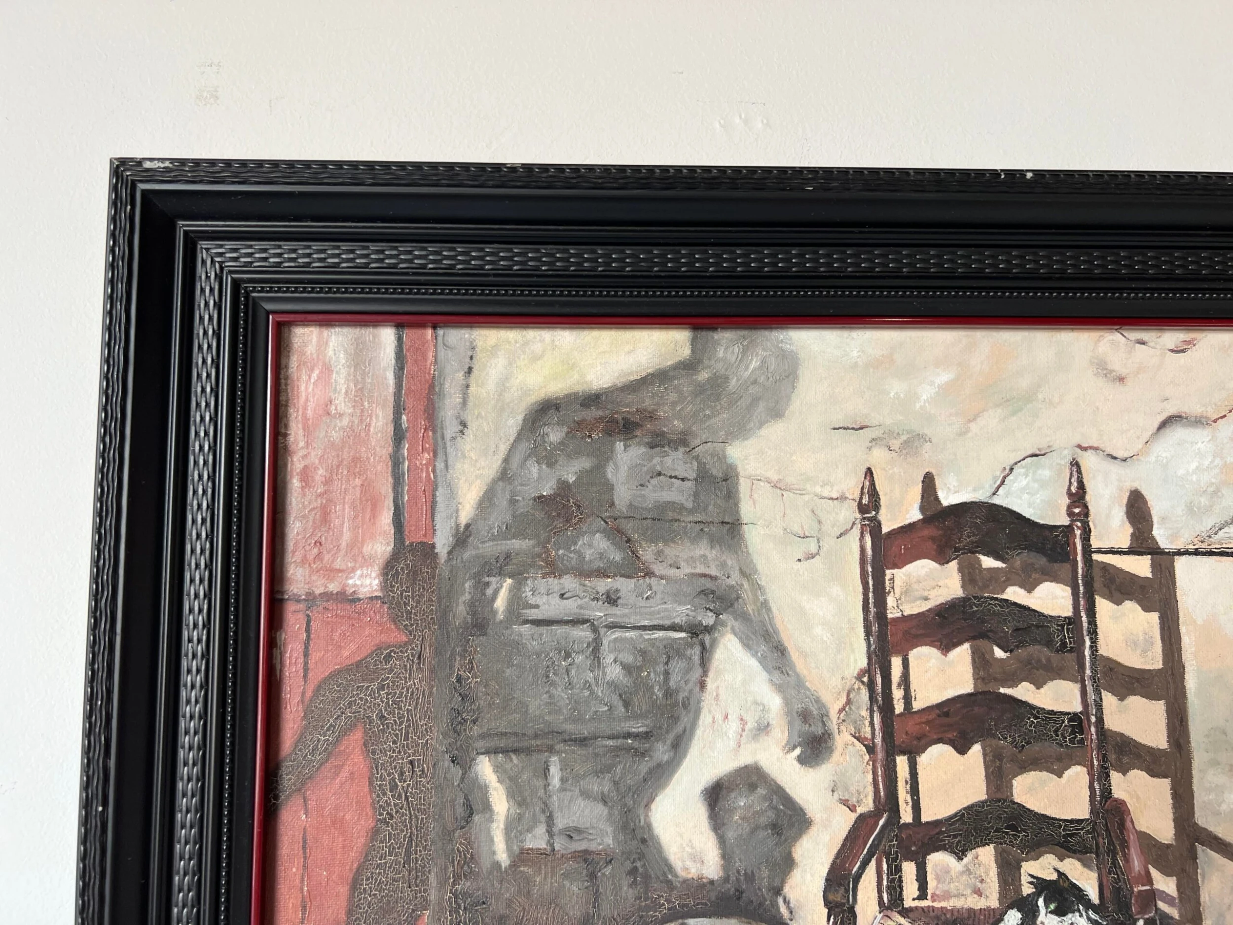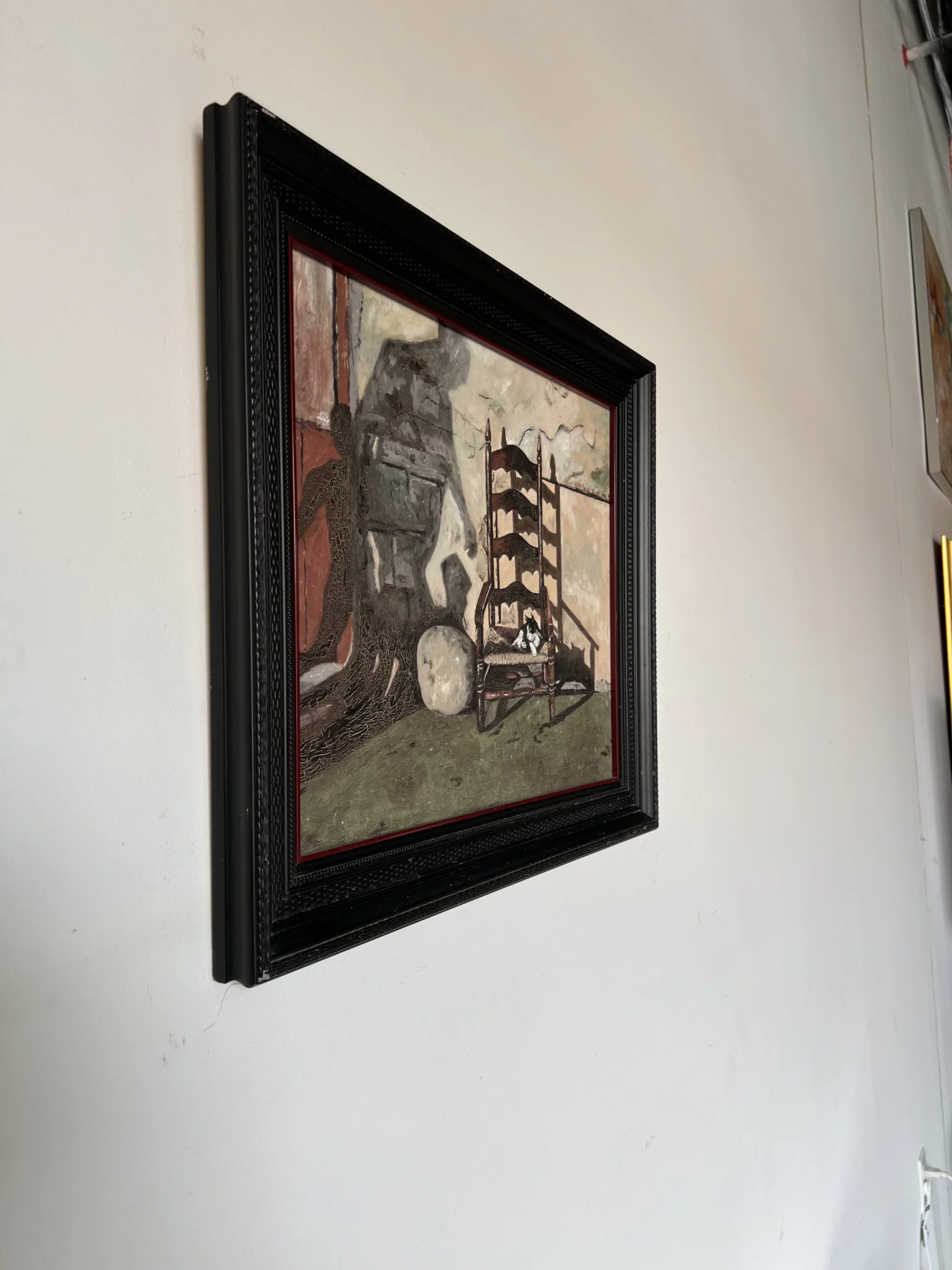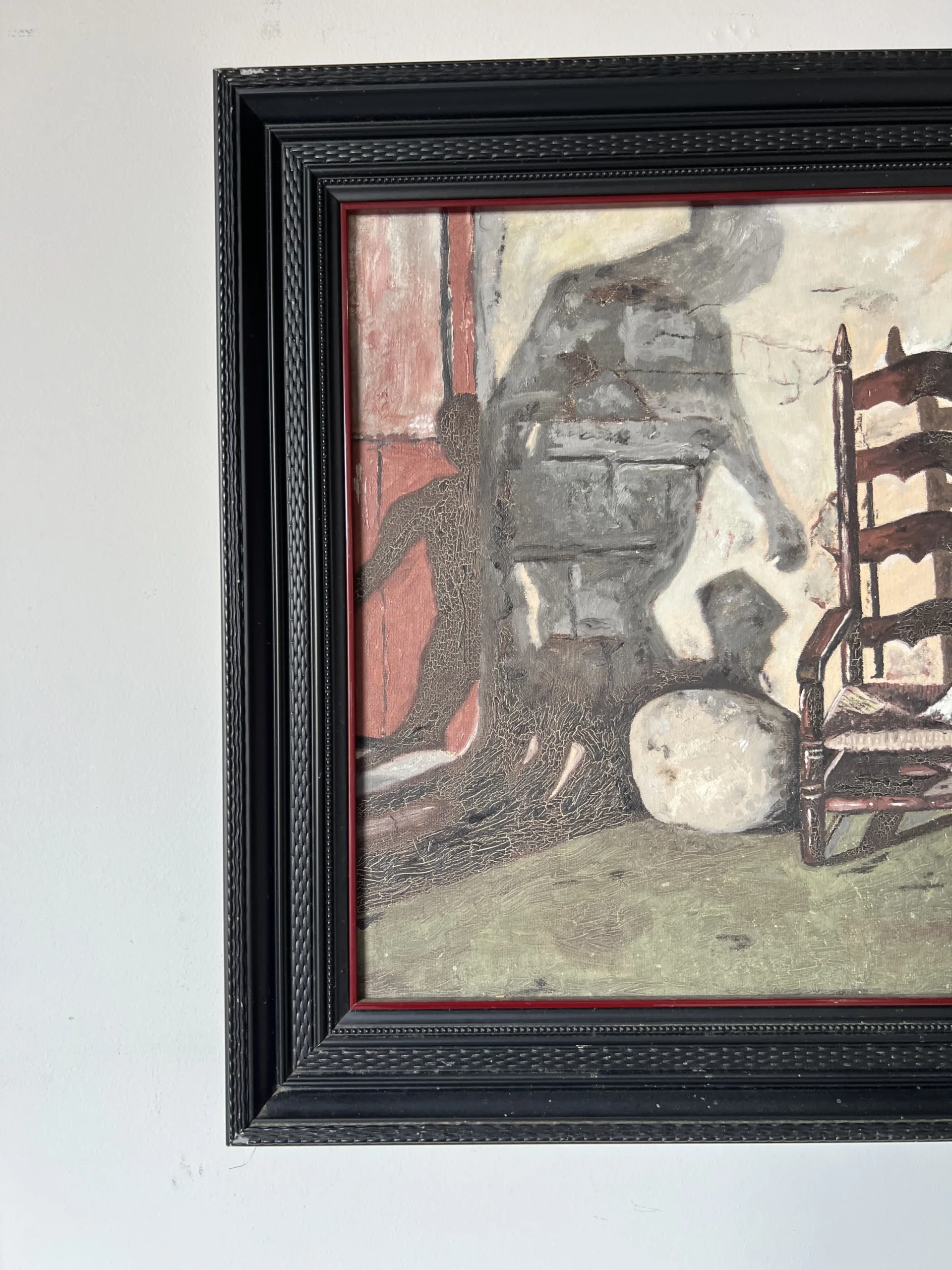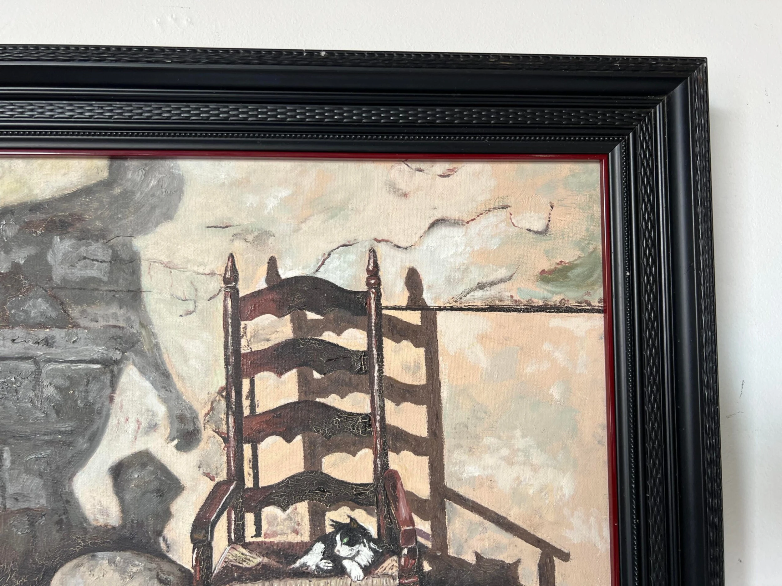 artistic canvas panel. Portraying the sunset of very rural village scene of a French ladder back chair with a cat a stone to the side and the shadow of two people. Artist signed lower right side by Slavinsky and date of 1932. Displayed on a black wood frame with a hanging wire attached to the reverse side. the frame is new, I consider 10/15 years old.
