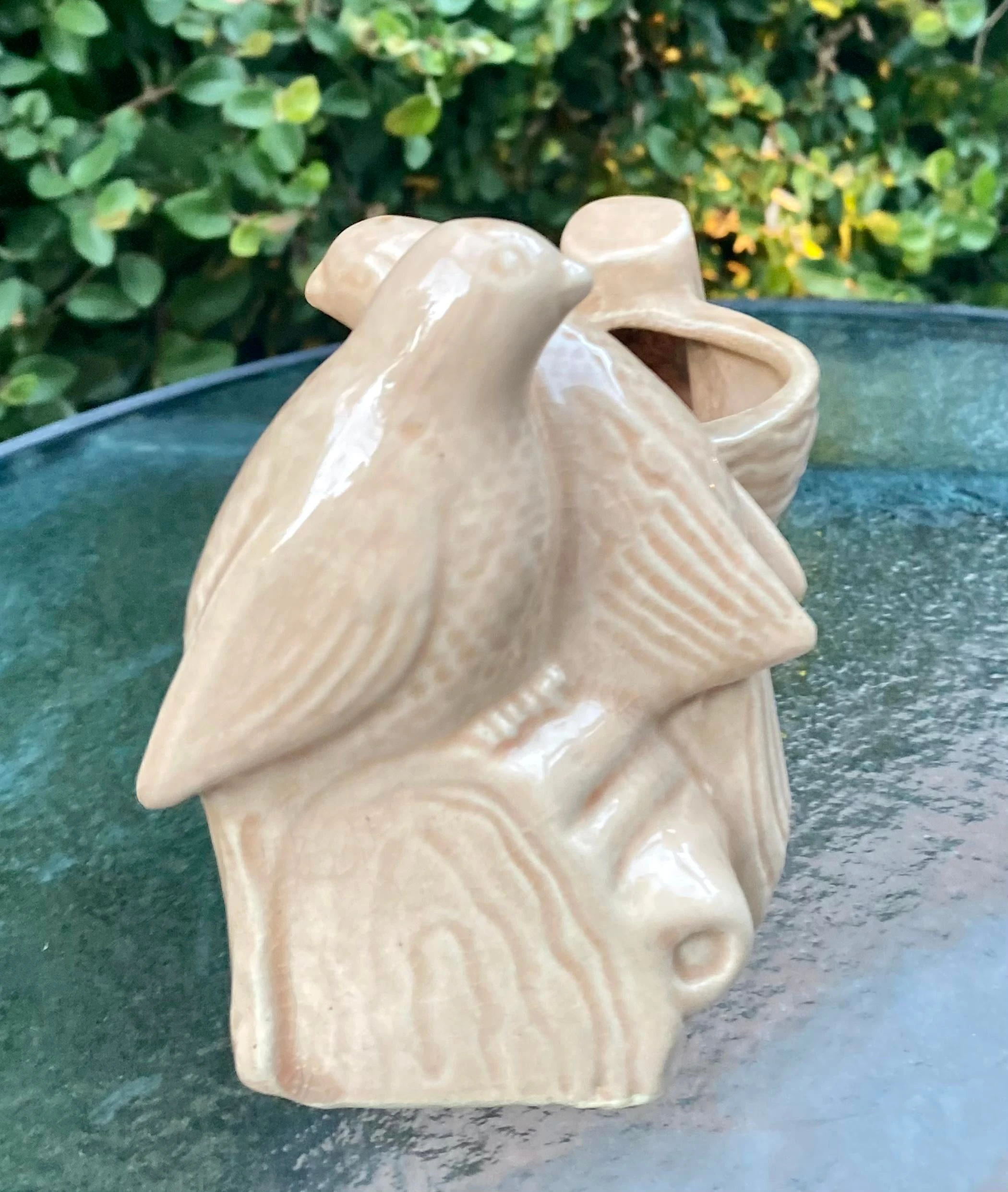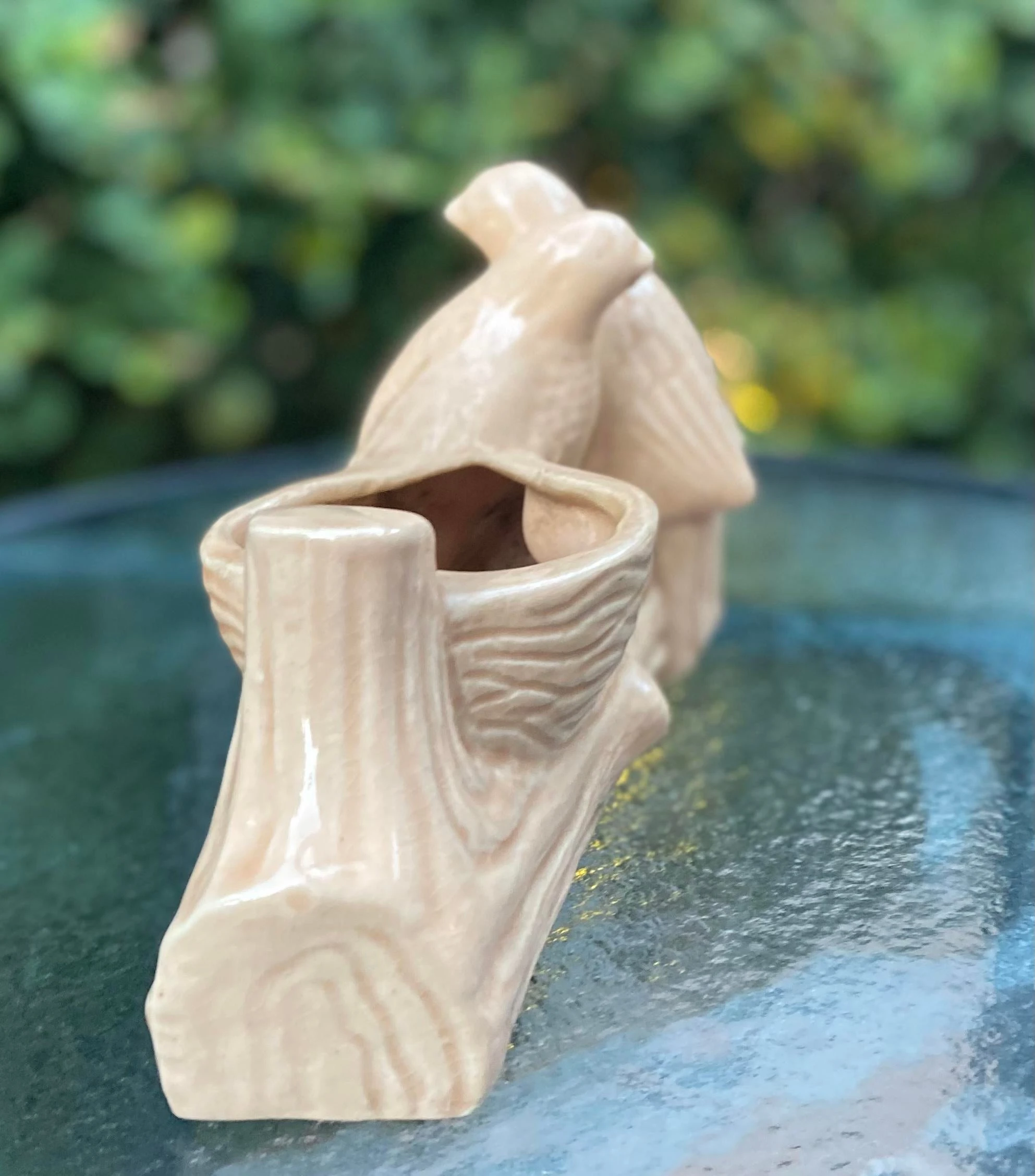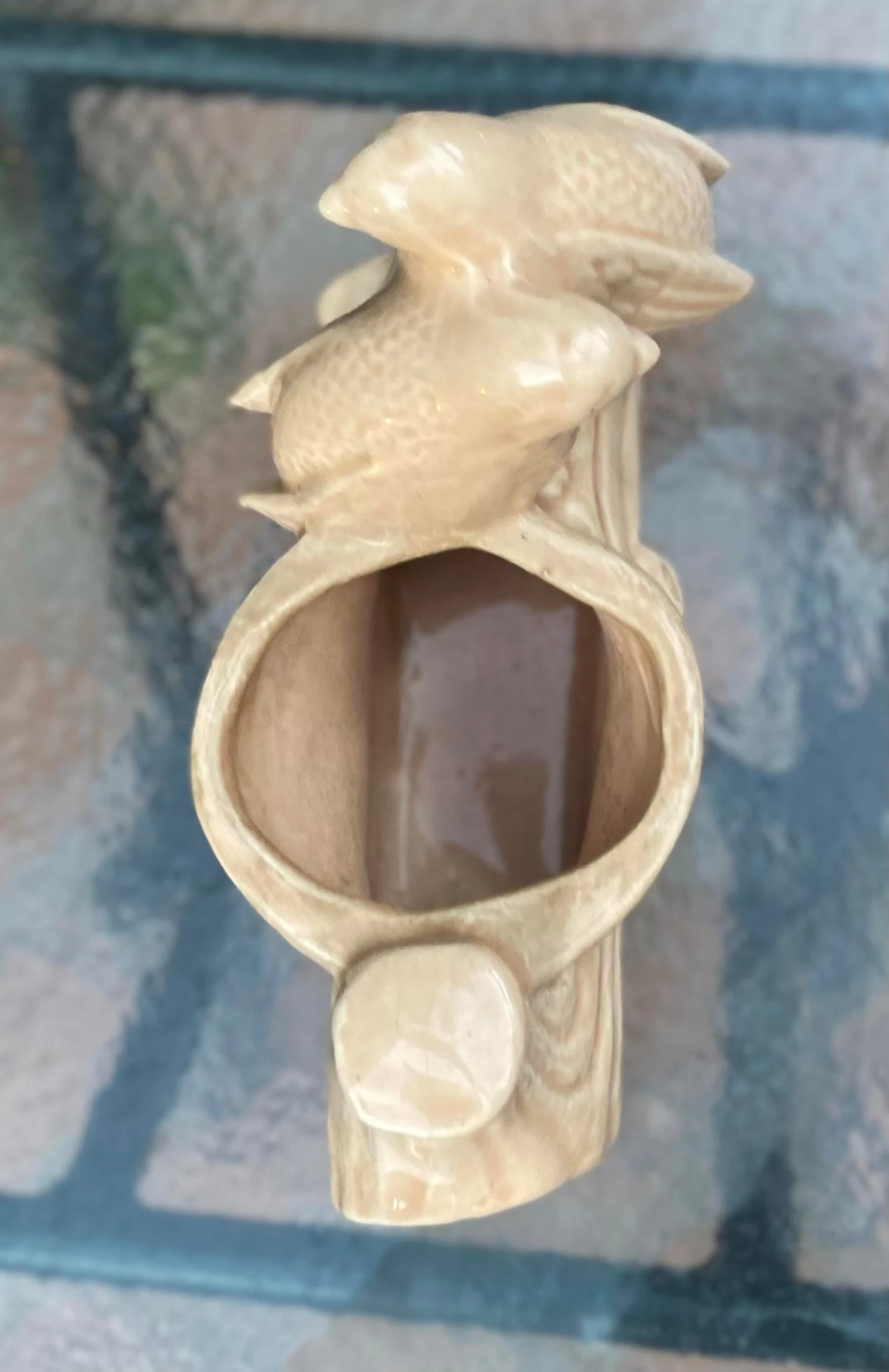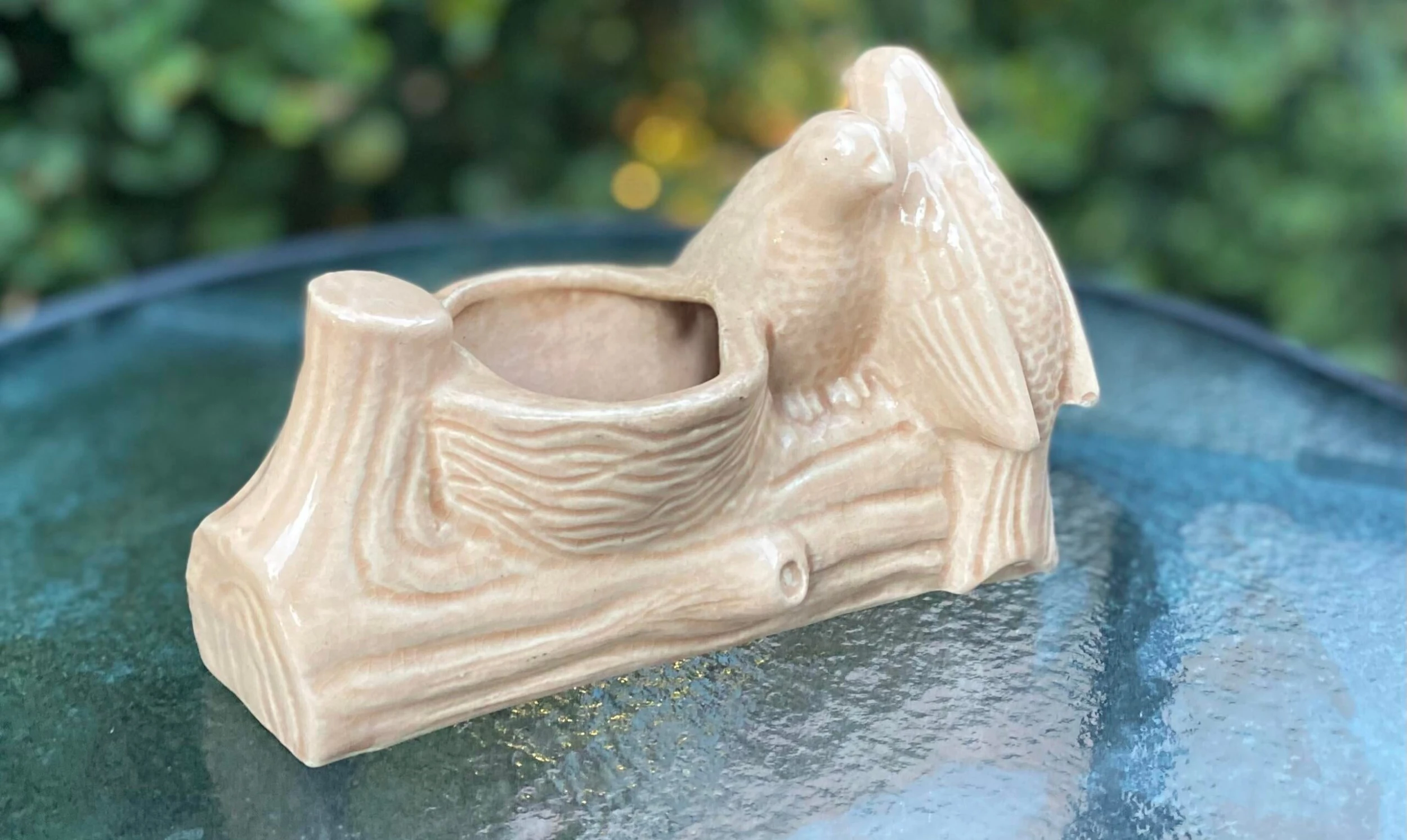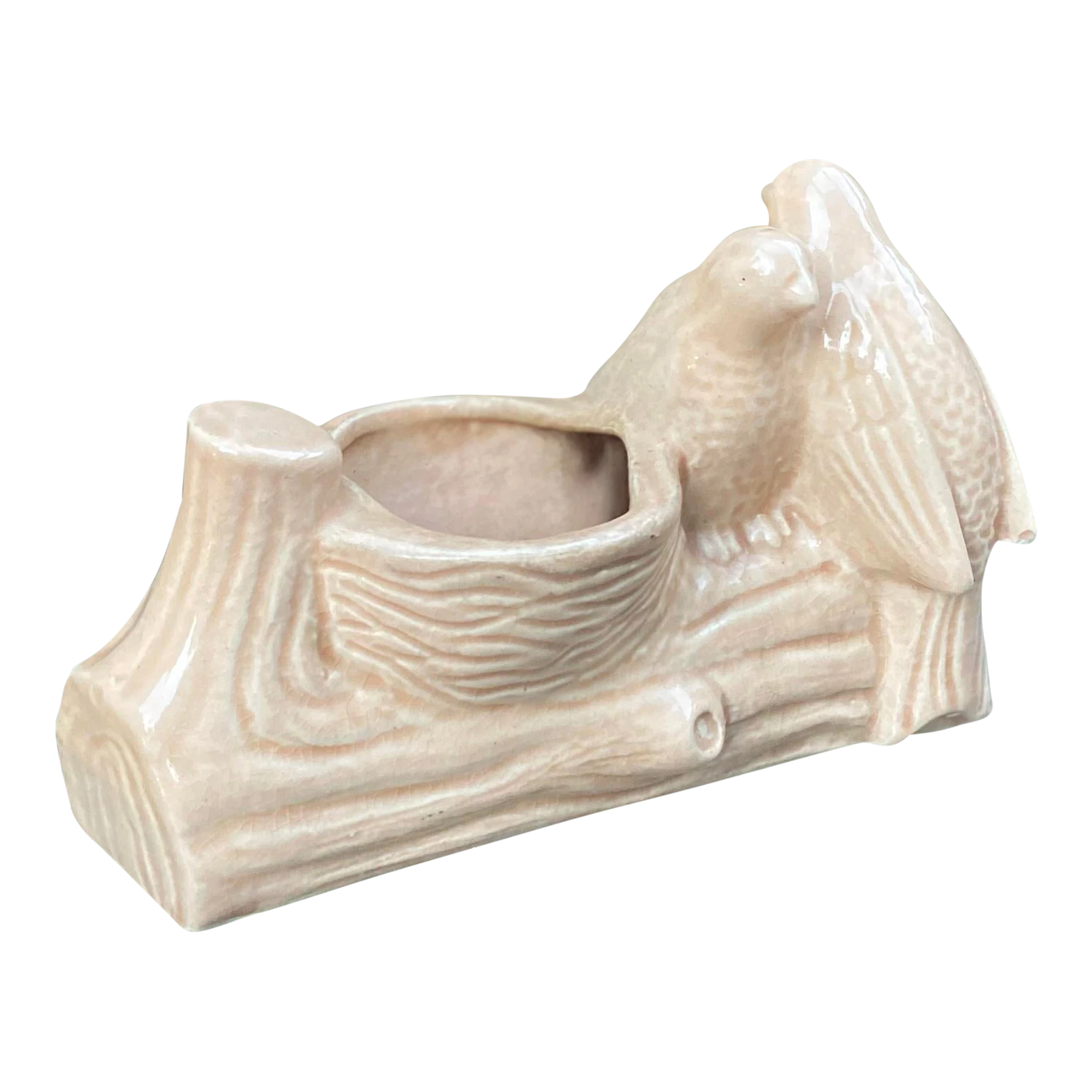 This charming planter from Brush McCoy circa 1940’s featured two love birds canoodling on a log and is a perfect …