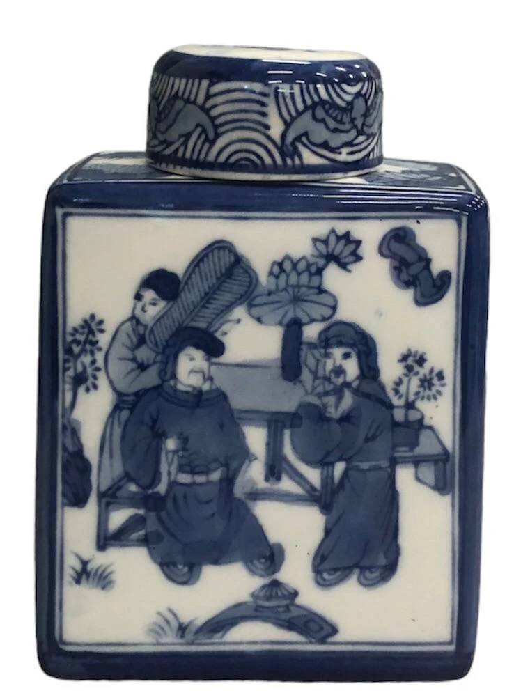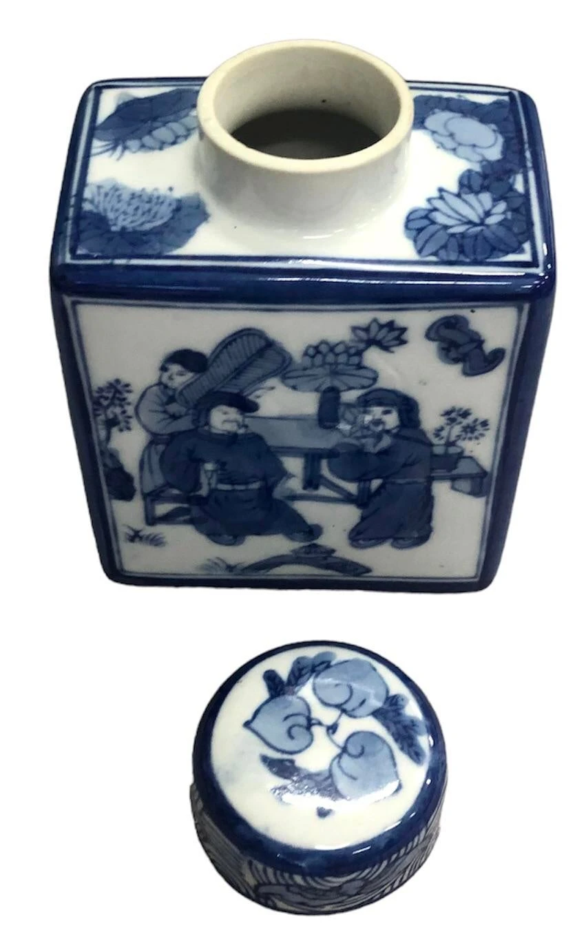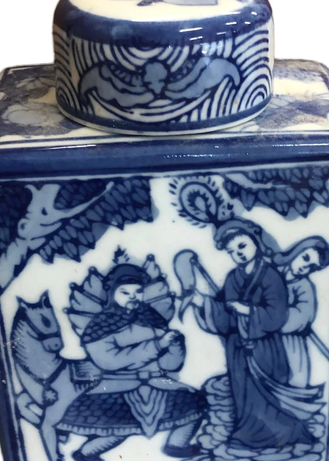 Chinoiserie character design porcelain ginger jar tea caddy in blue and white with lovely luminous patina.