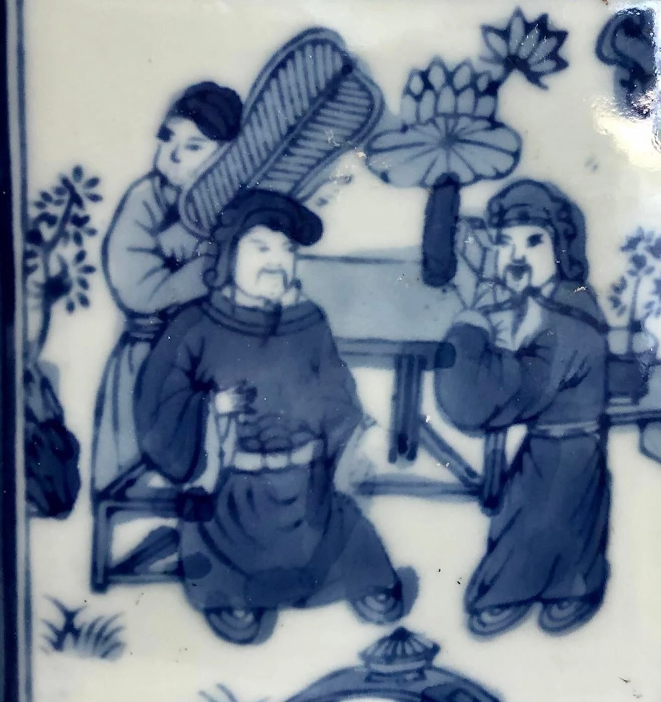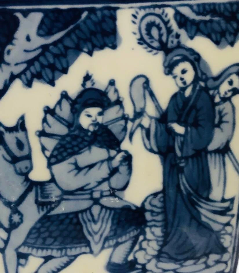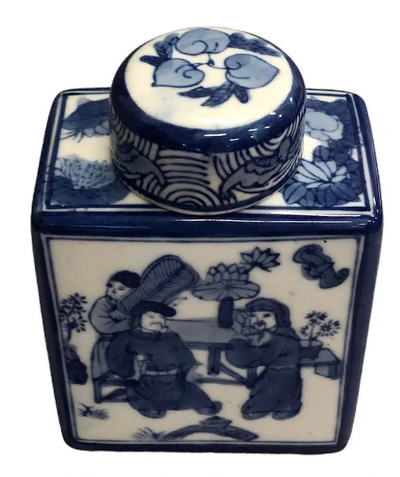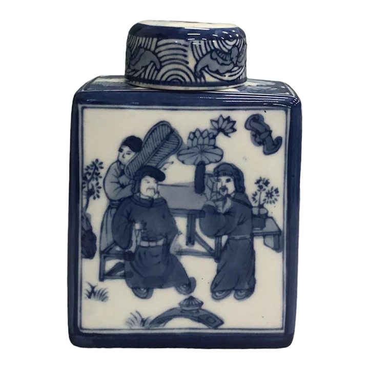 Chinoiserie character design porcelain ginger jar tea caddy in blue and white with lovely luminous patina.