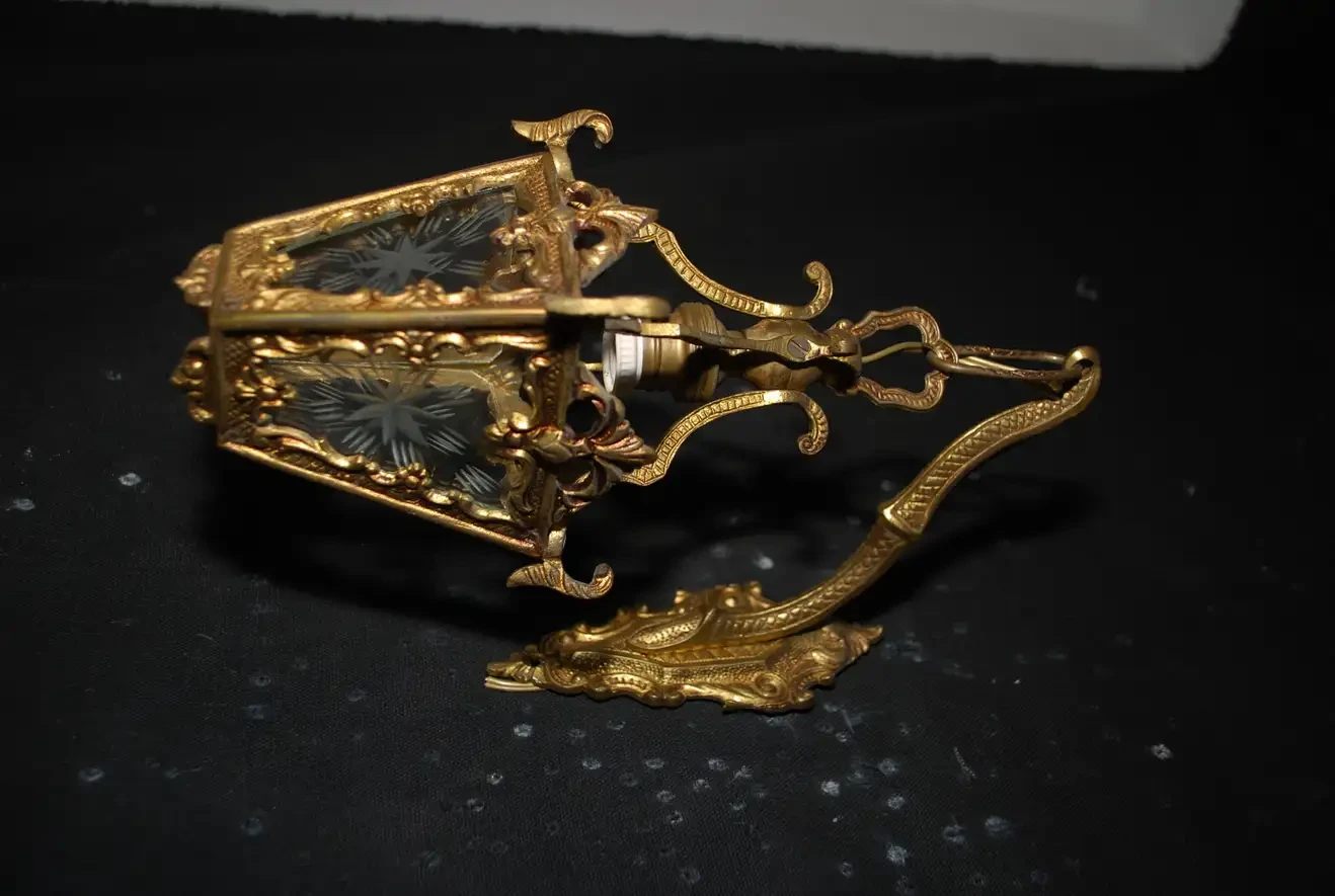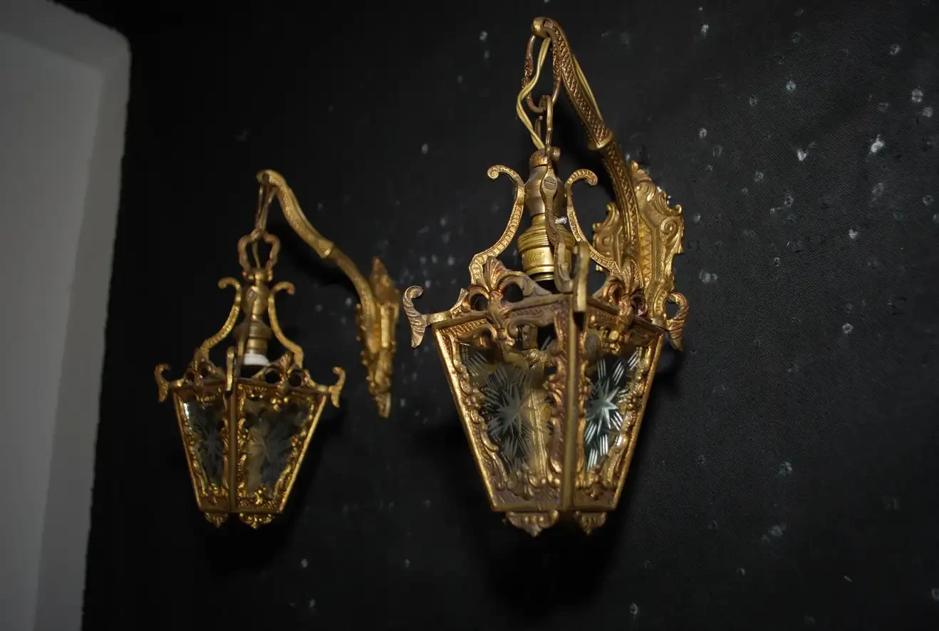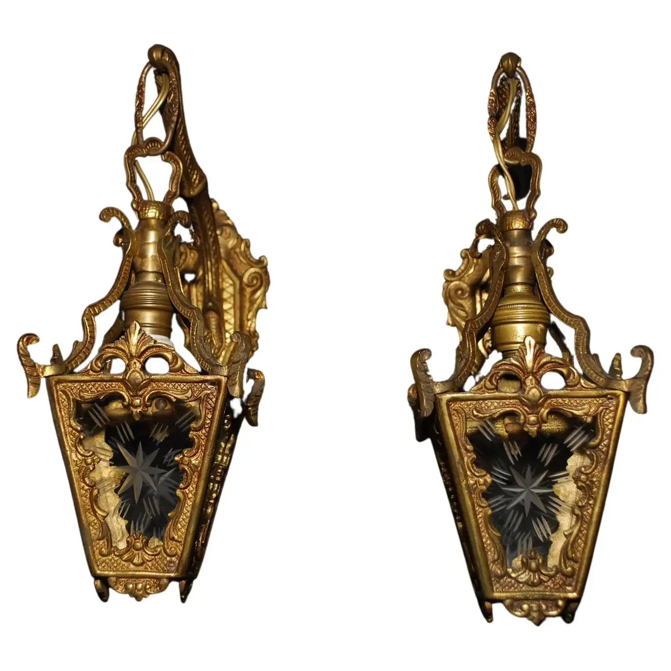 A beautiful and rare pair of French Brass sconces, the patina is so much nicer in person, the glass has a beautiful etching.