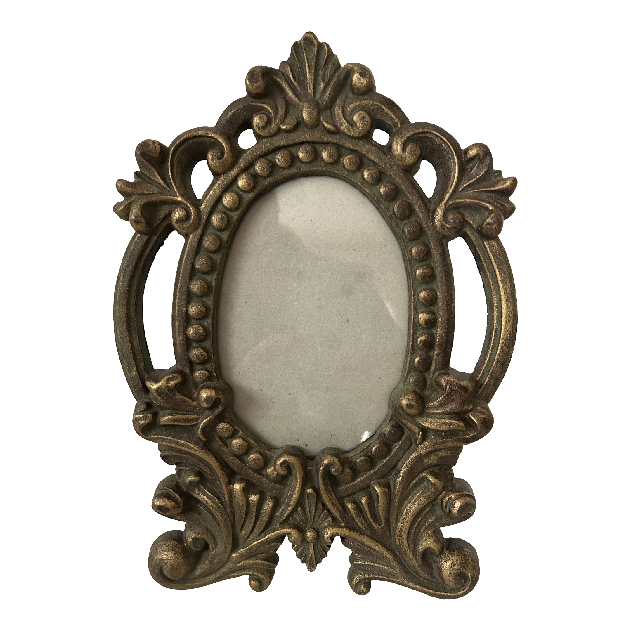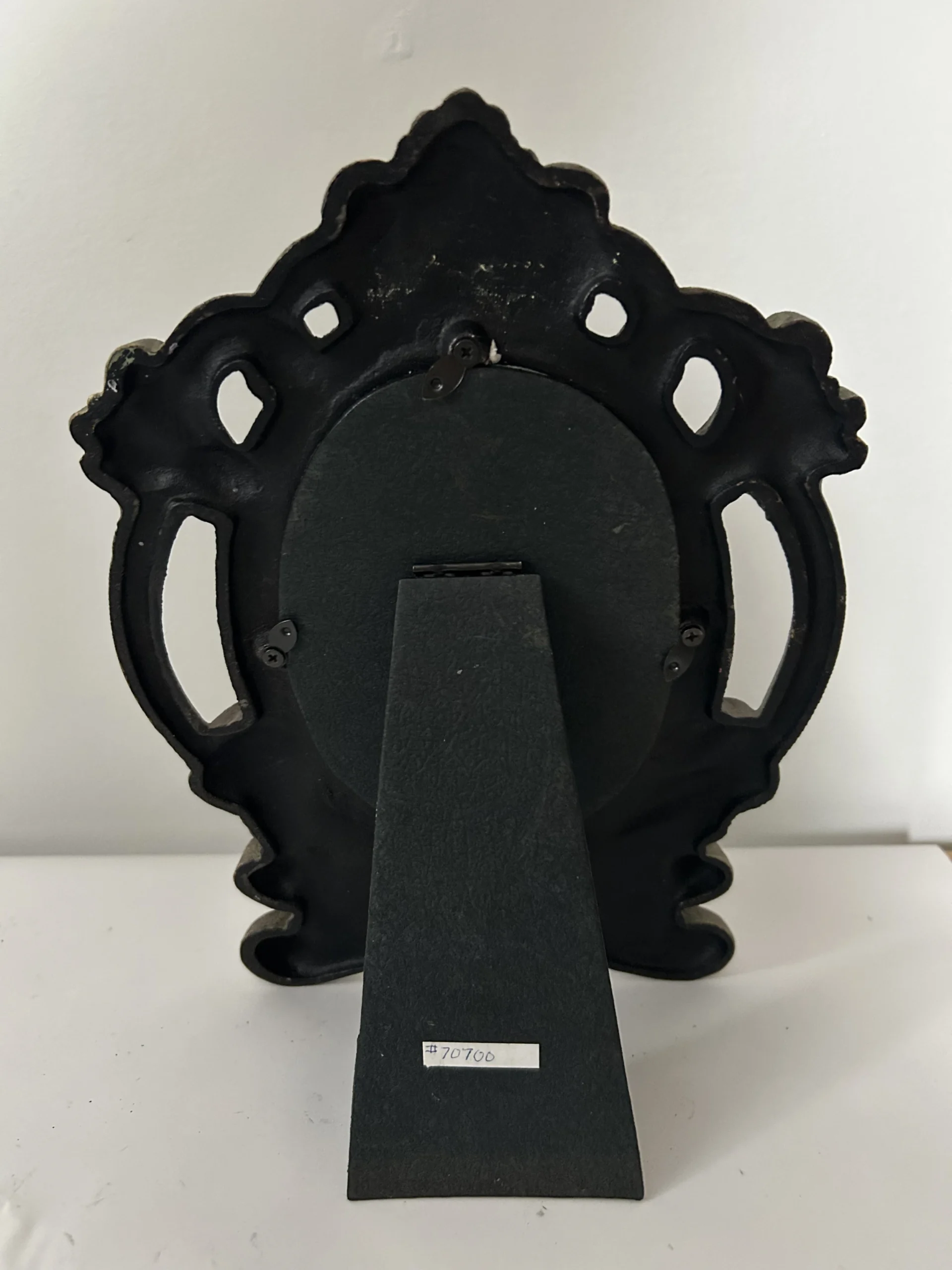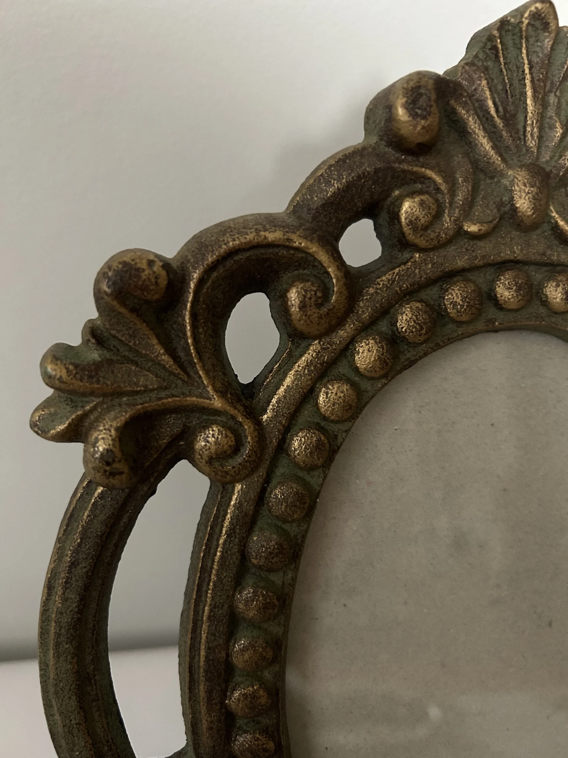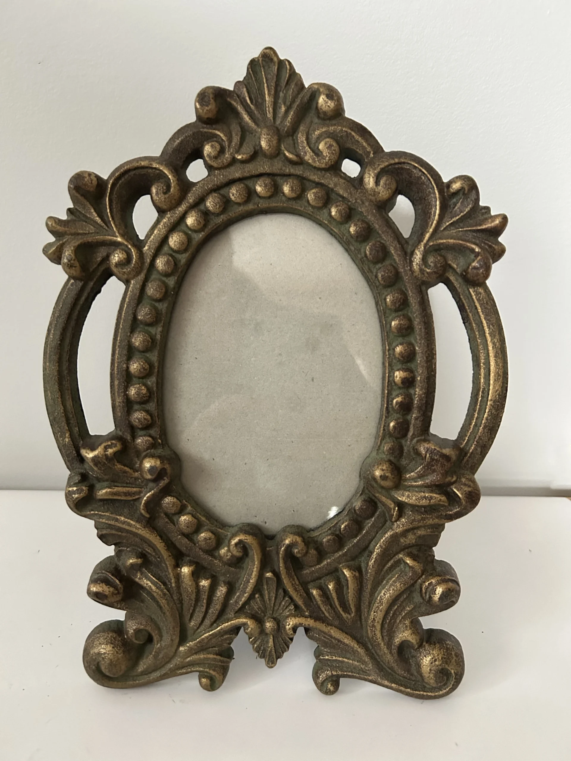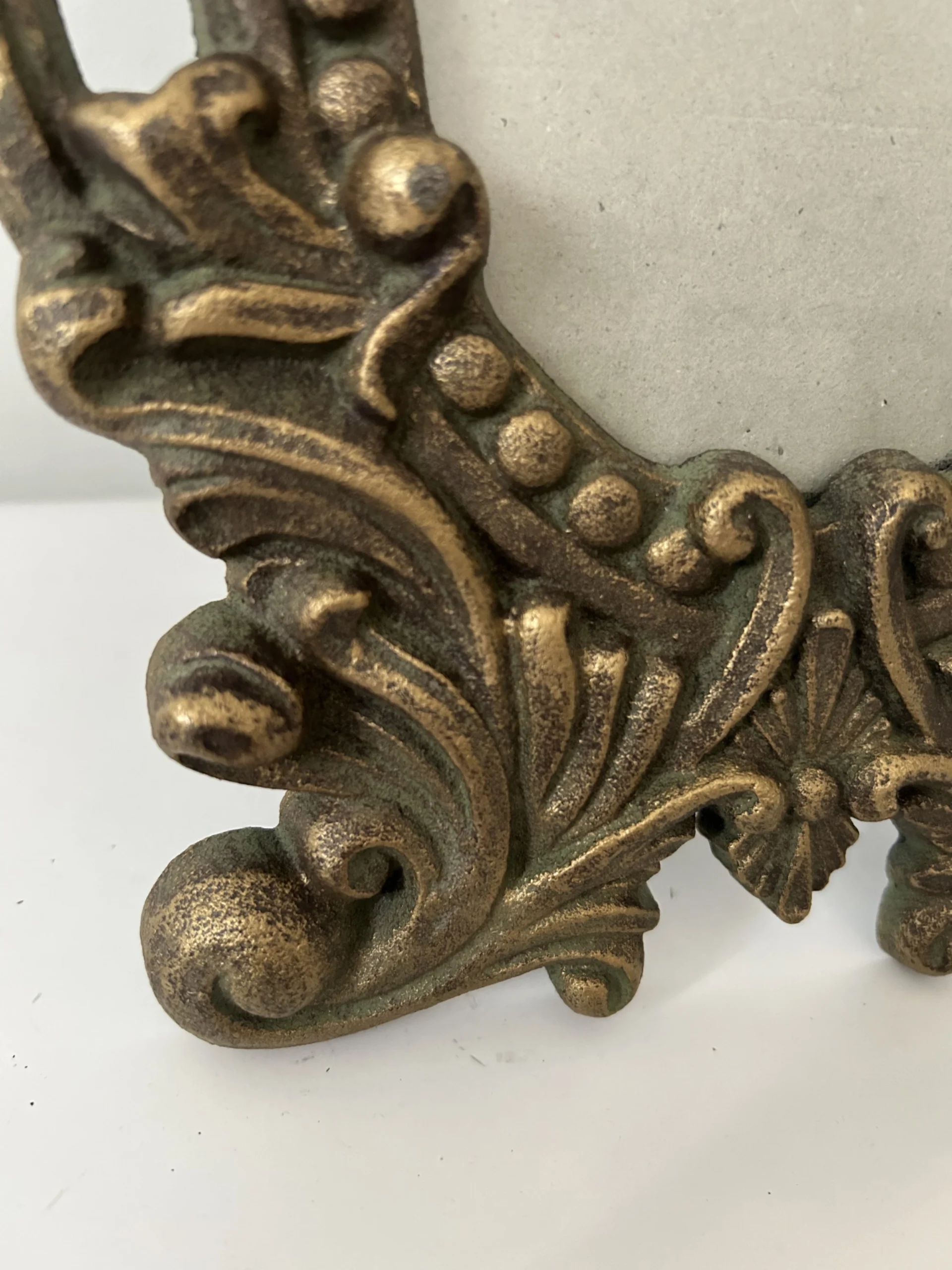 1940’s Gold Cast Iron Picture Frame. Has a stand in the back.