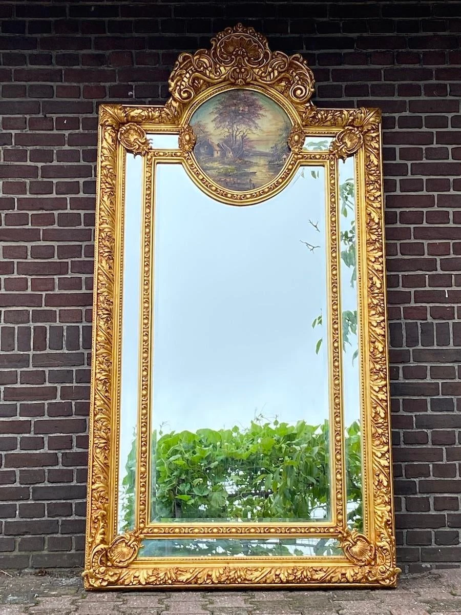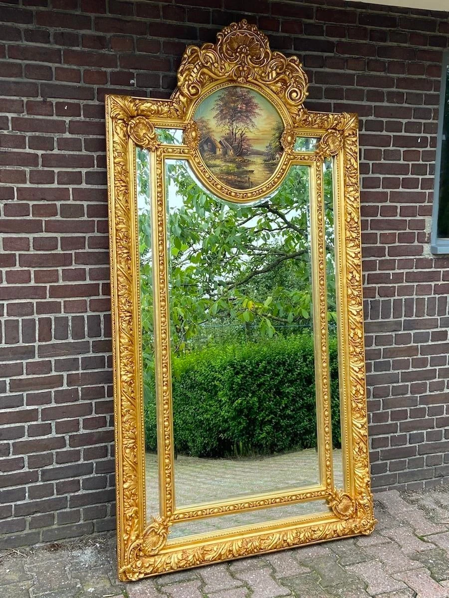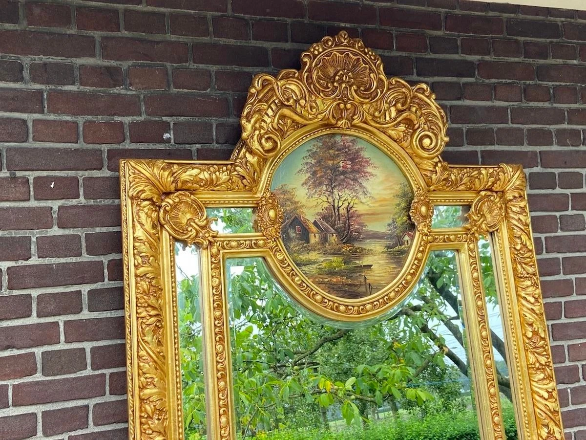 This is an elegant designed mirror that can be used to hang on the wall or to stand on the floor. Unique because the frame is richly decorated with typical Baroque/Rococo style decorations. On top of the mirror there is an handpainted landscape that is painted with oil paint. It gives a rustique atmosphere to the mirror. A beautiful frame that is finished with a finish of gold leaf.