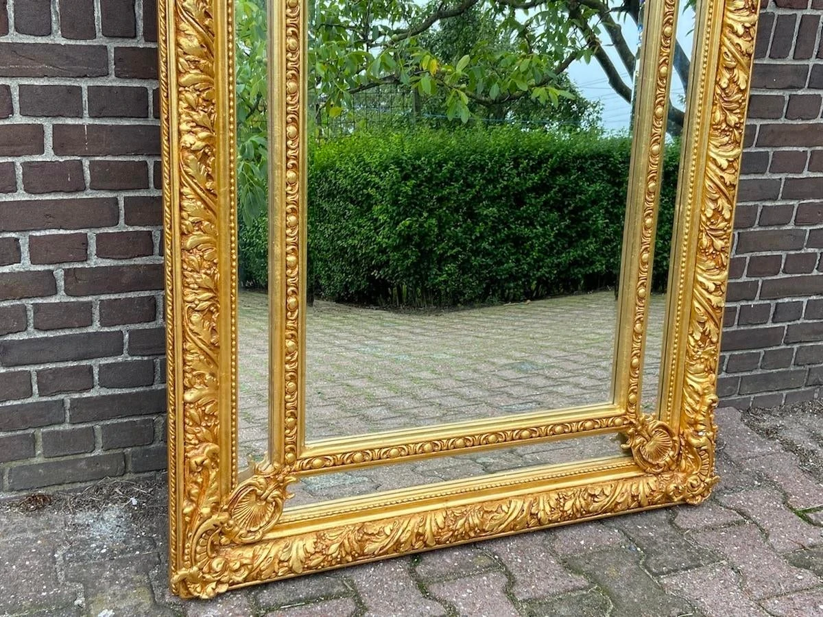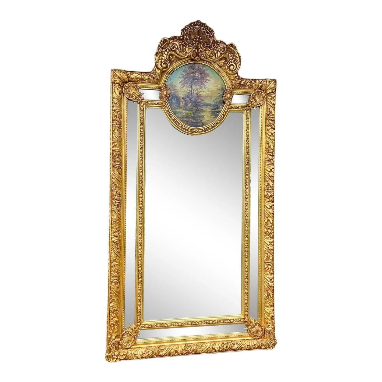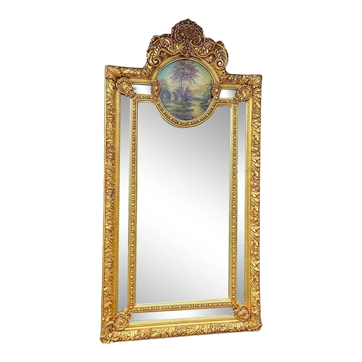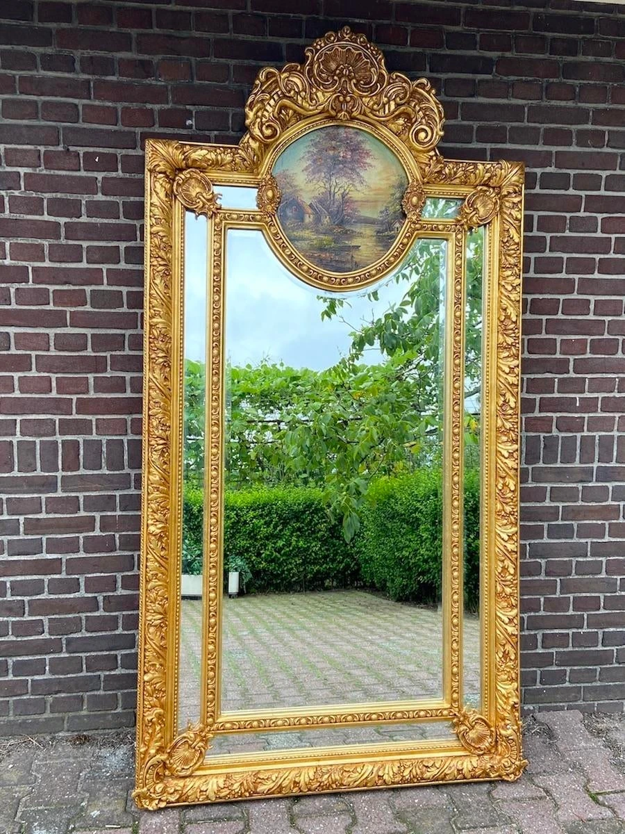 This is an elegant designed mirror that can be used to hang on the wall or to stand on the floor. Unique because the frame is richly decorated with typical Baroque/Rococo style decorations. On top of the mirror there is an handpainted landscape that is painted with oil paint. It gives a rustique atmosphere to the mirror. A beautiful frame that is finished with a finish of gold leaf.