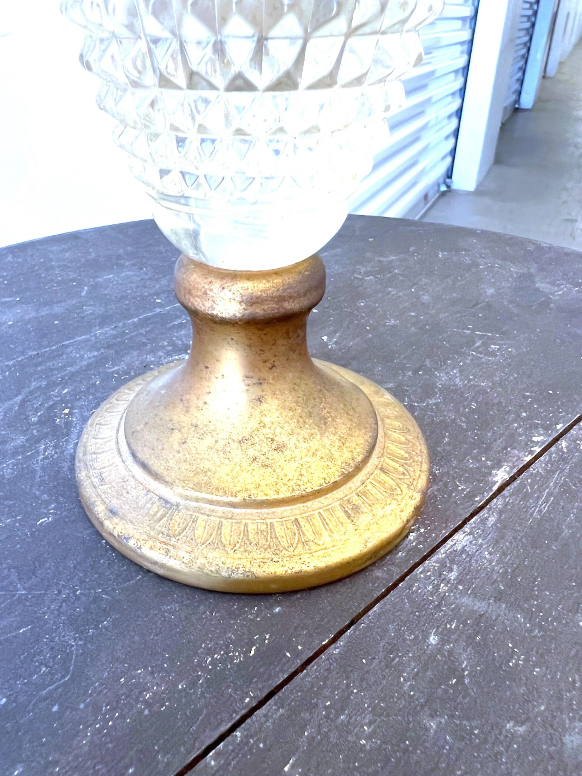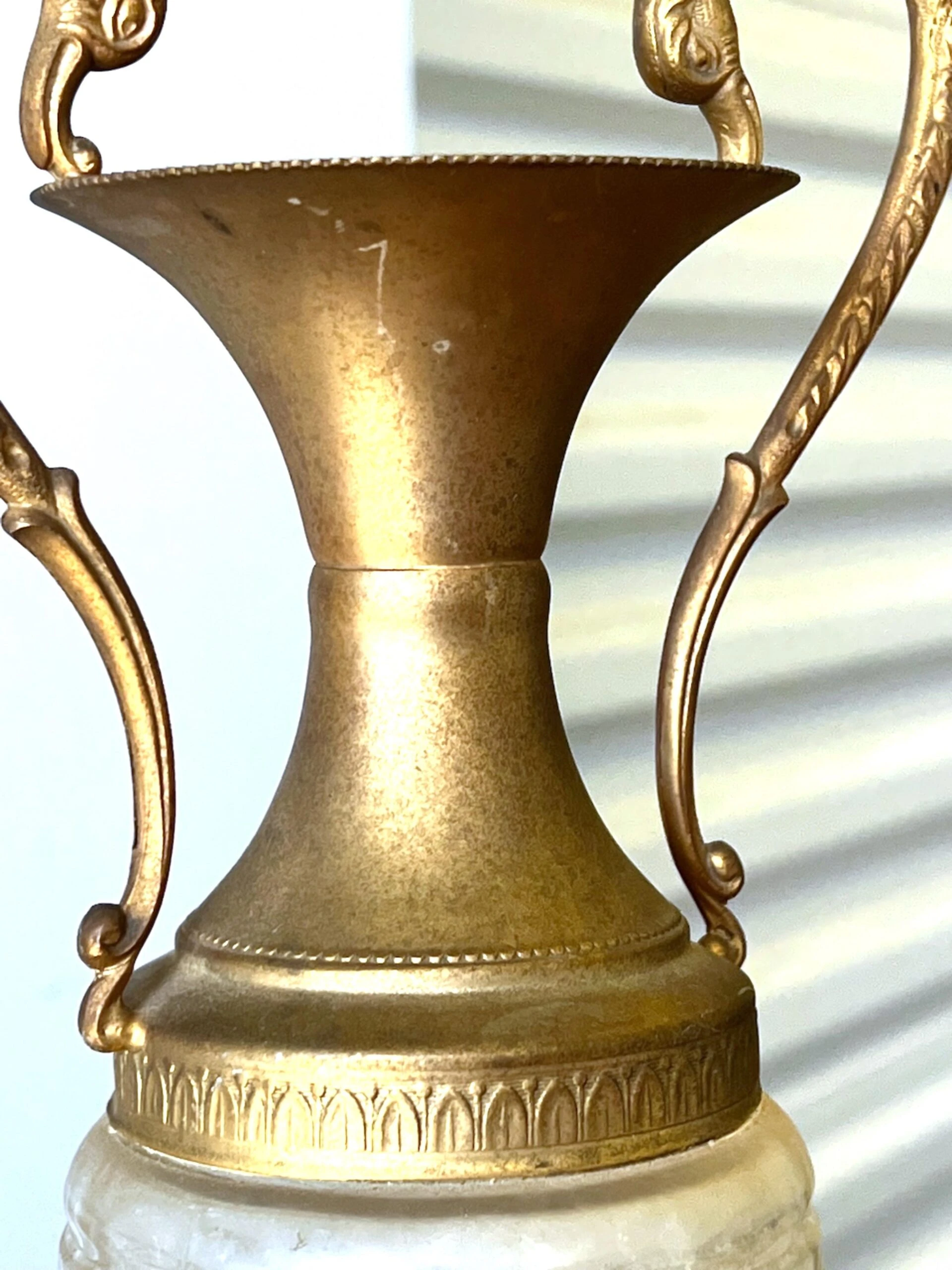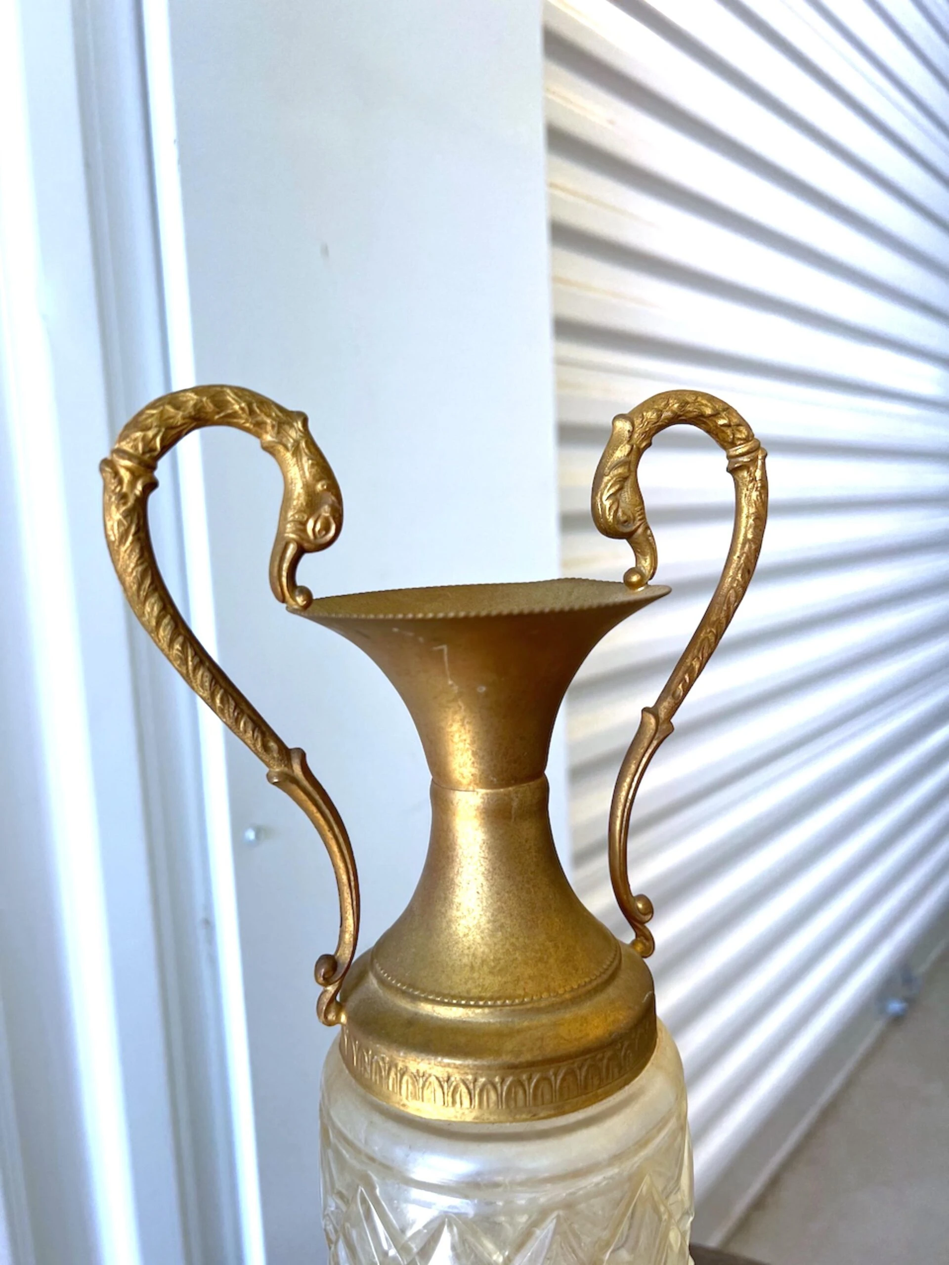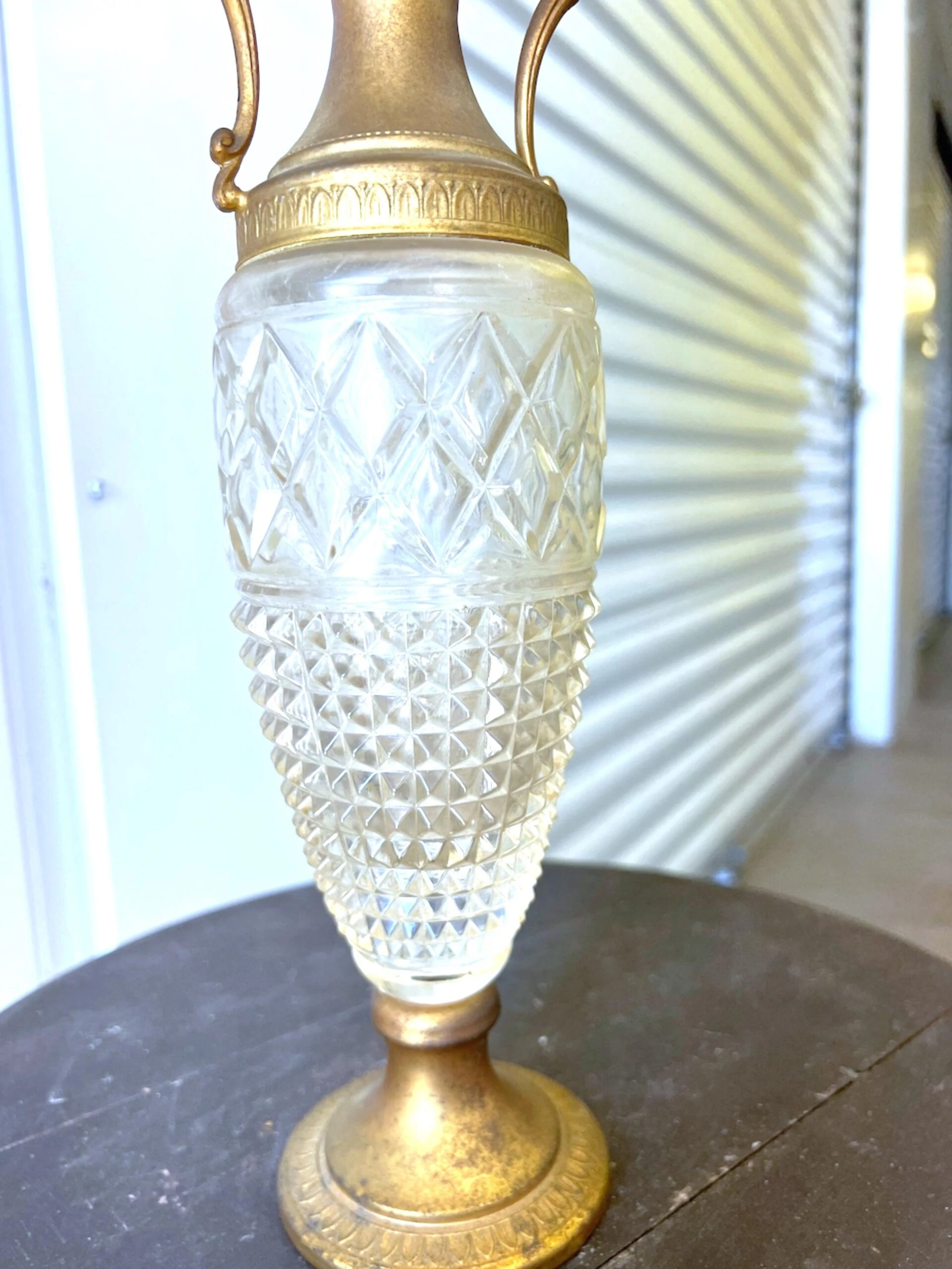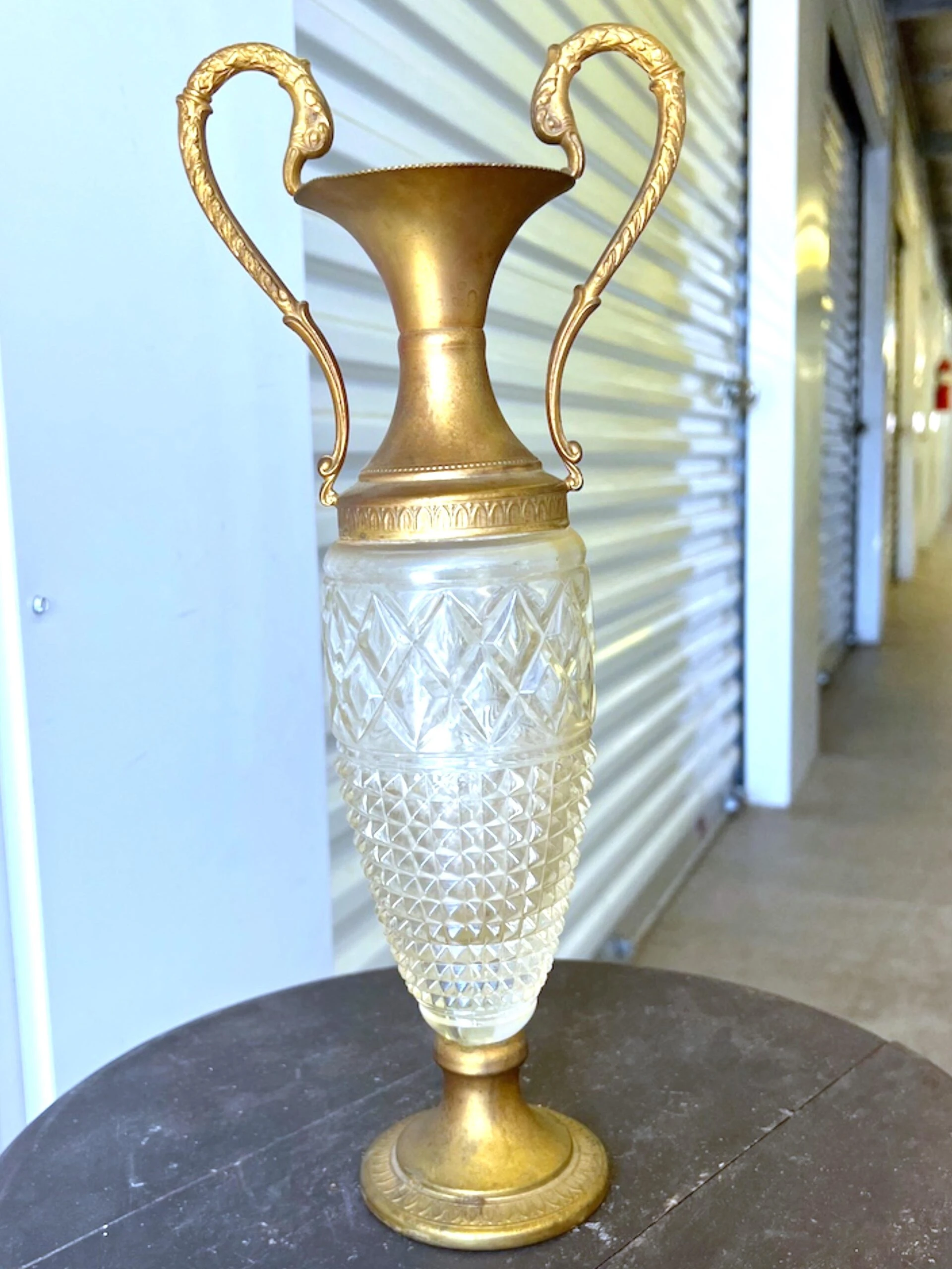 For sale I have this elegant double handle urn vase. This vase, made in Italy, features ornate brass sculpted double swan handles, brass neck and ornate base with a pressed diamond glass body. This beautiful piece measures 14.5 inches in height x 6 inches in width including handles and 3.5 inches in width glass body of urn. Brass has an antiqued look consistent with age. Some minor tarnished areas. Stamped Italy on the bottom. In great vintage condition.