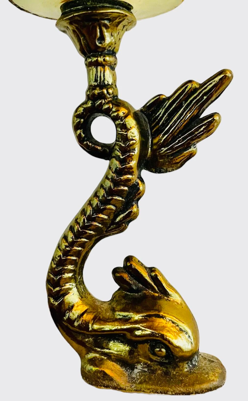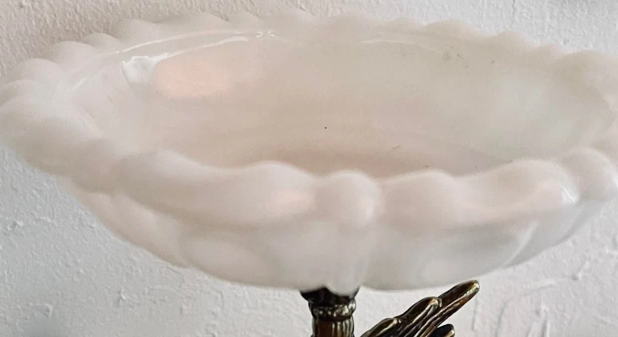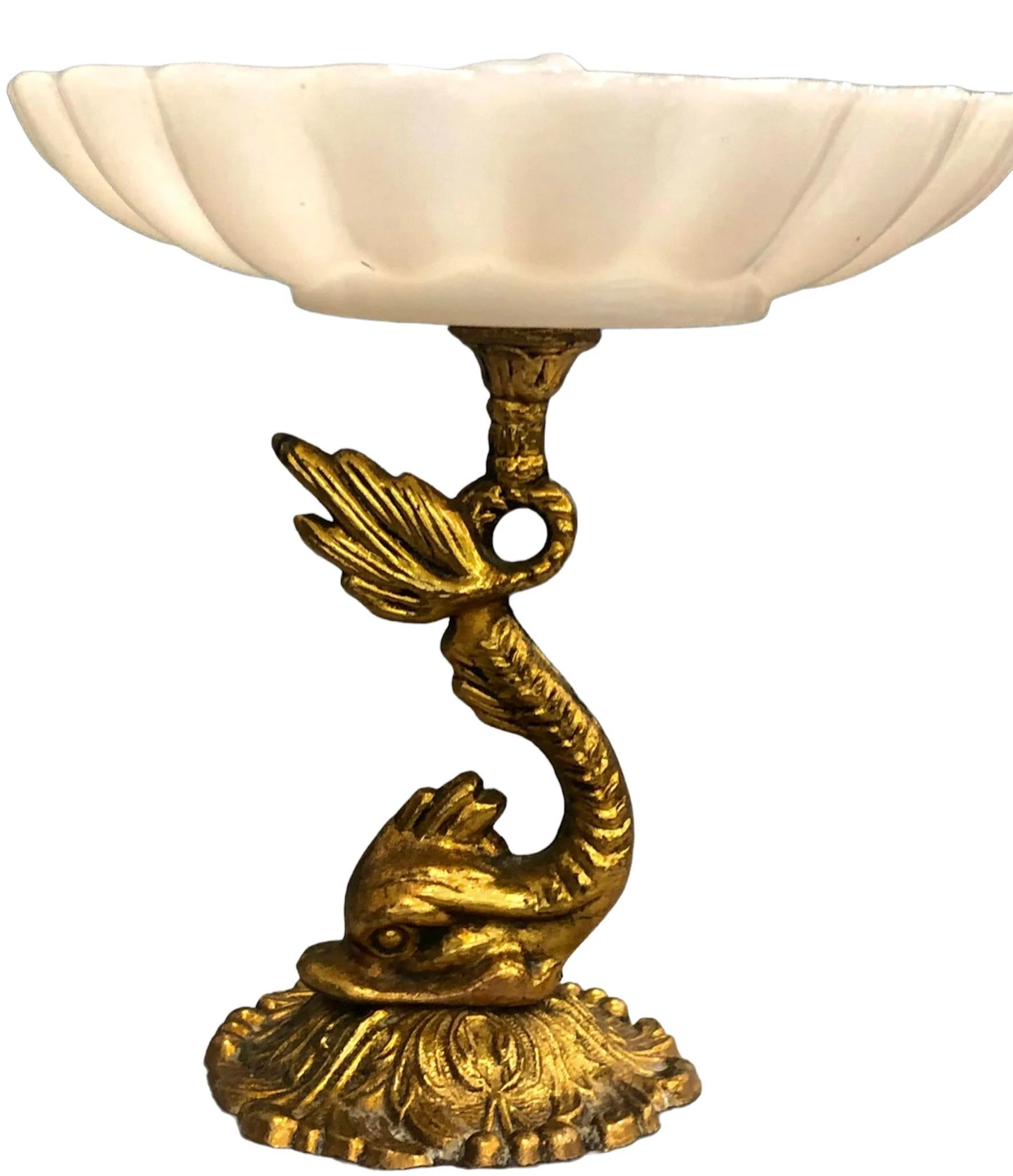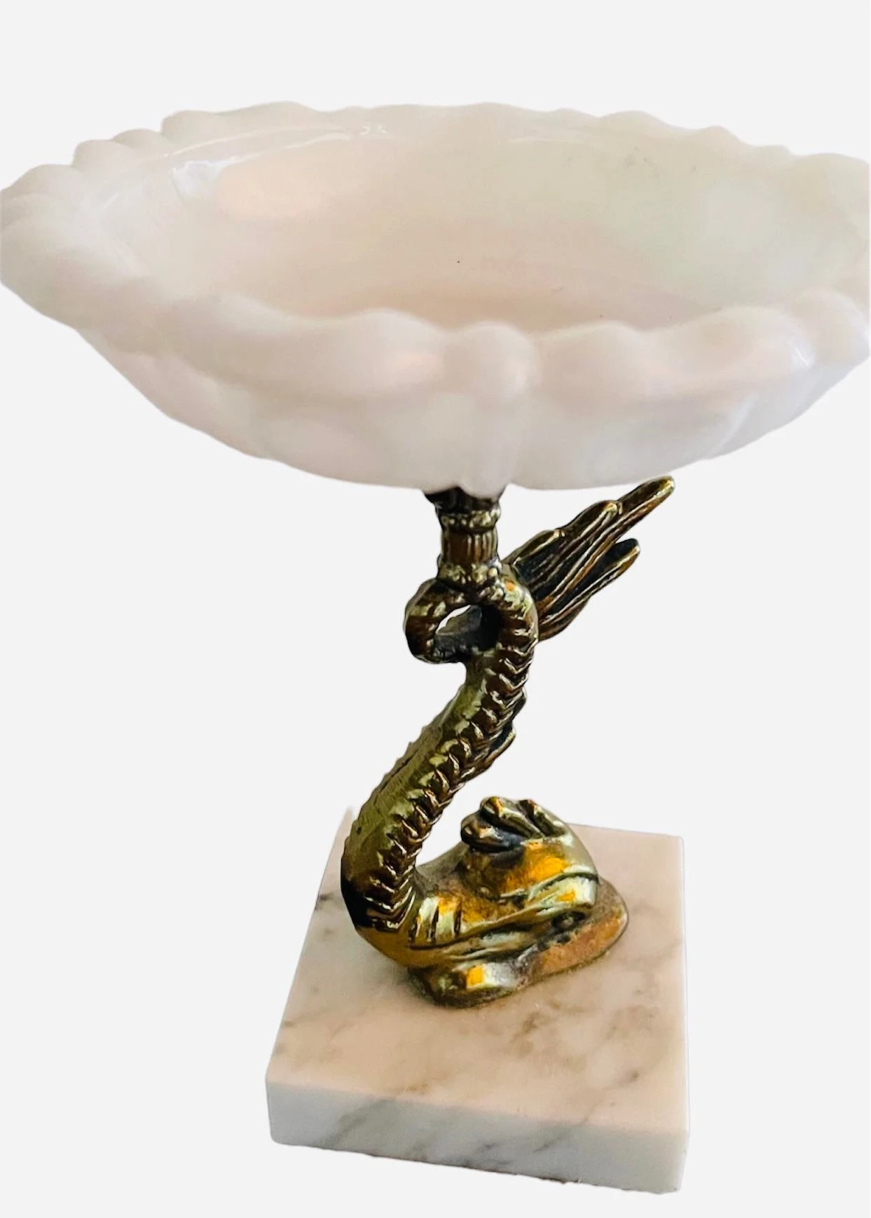 1950’s Art Deco Brass Koi Fish Marble Milk Glass Pedestal Tray. Heavy marble base and milk glass dish on top. Can be used as fancy ashtray, candy dish, or to hold trinkets.