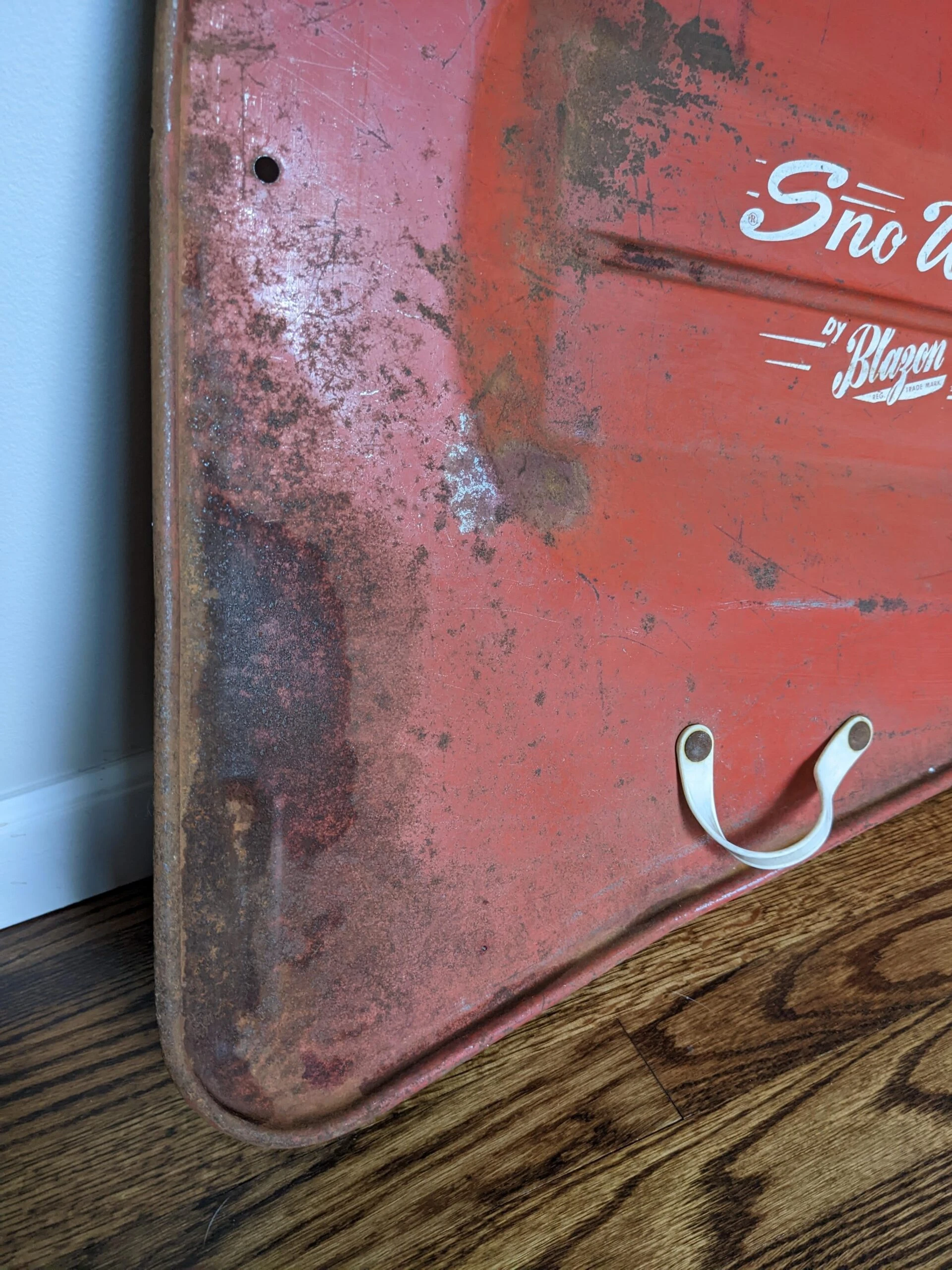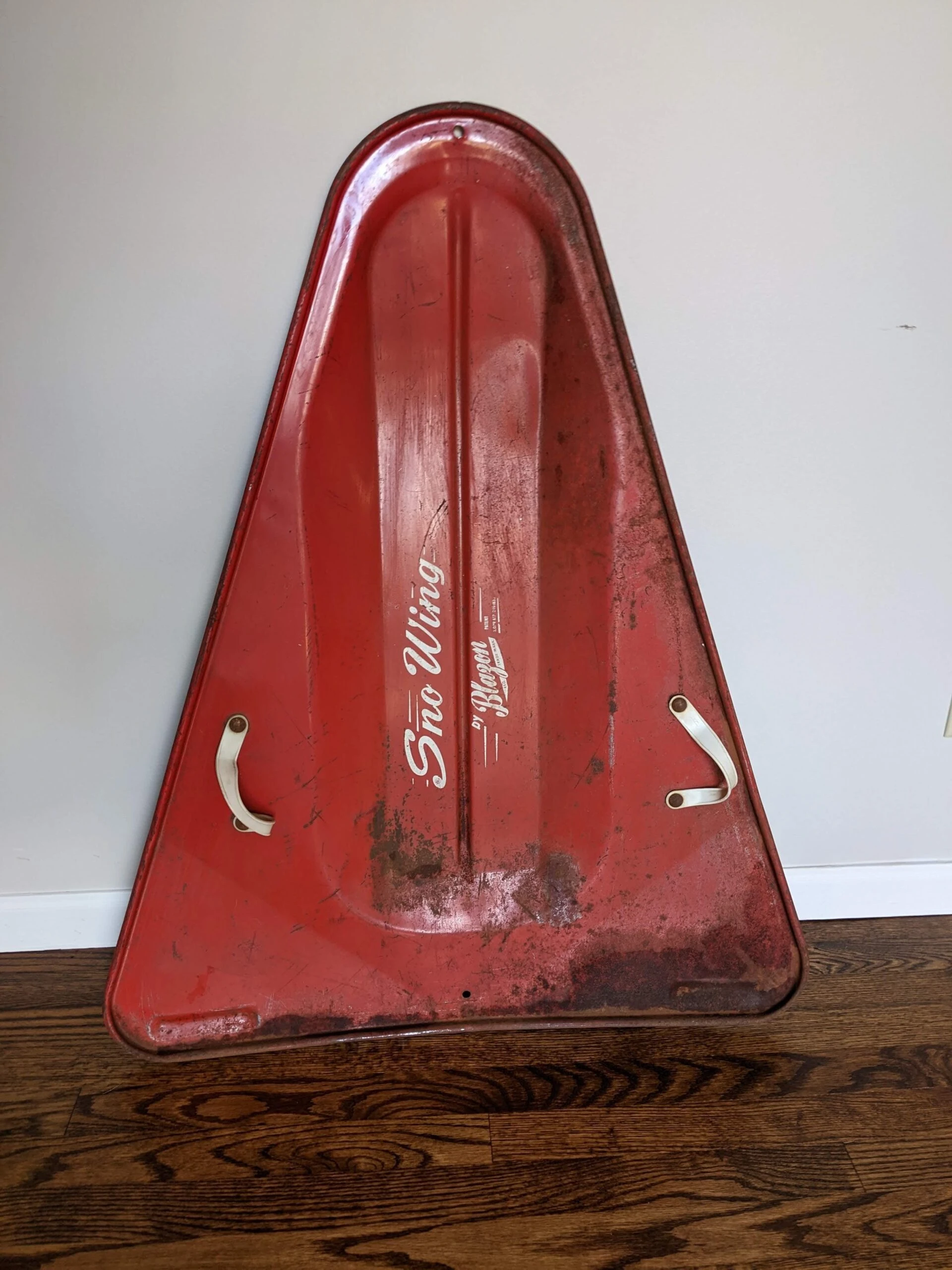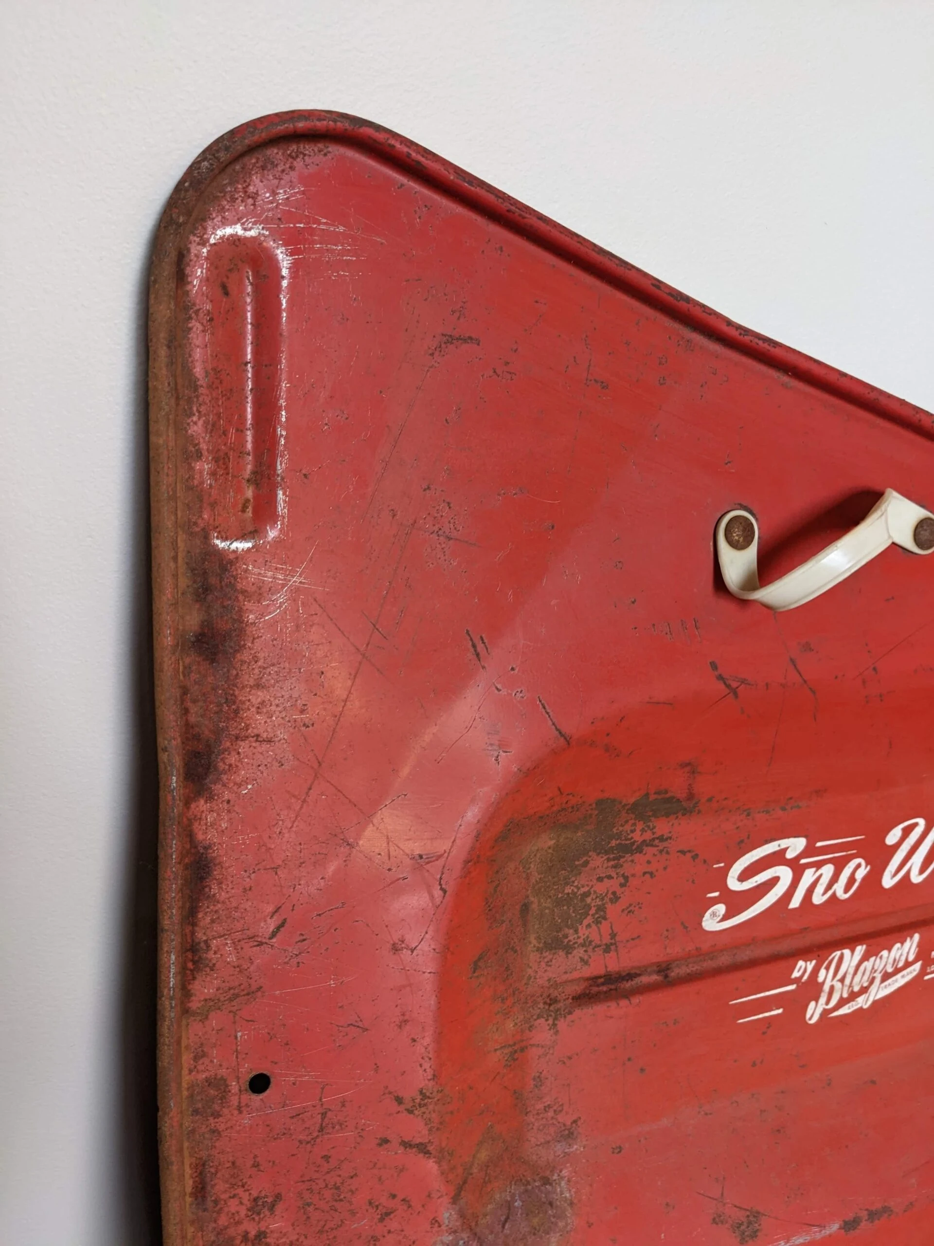 Blazon Sno-Wing metal sled in Atomic Red. Popular in the 1950’s and 60’s, this vintage sled would look great hanging …