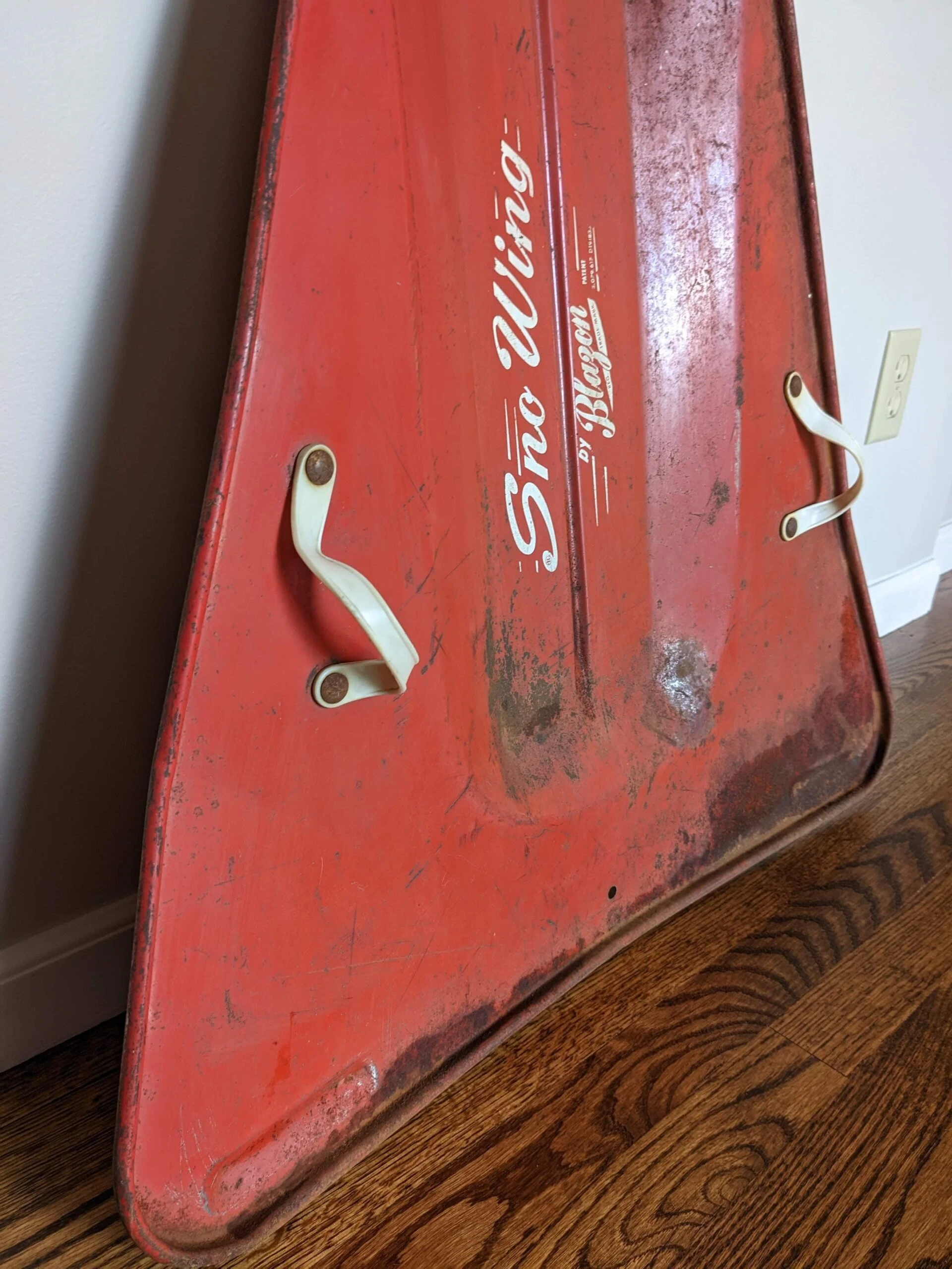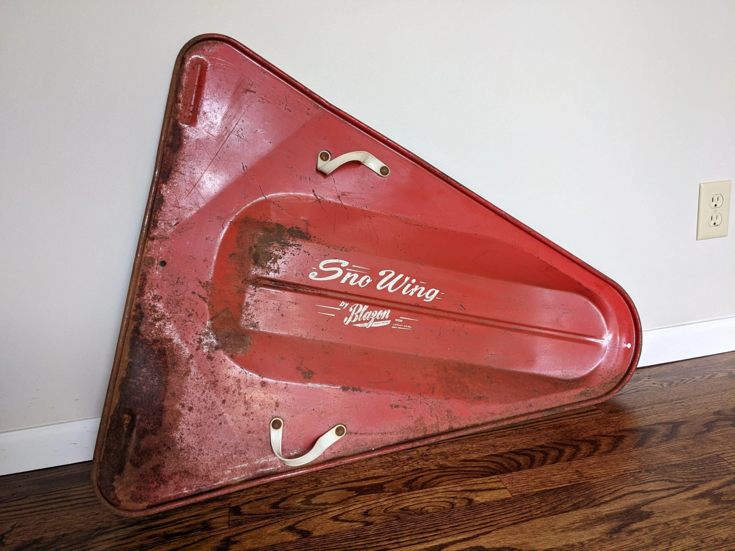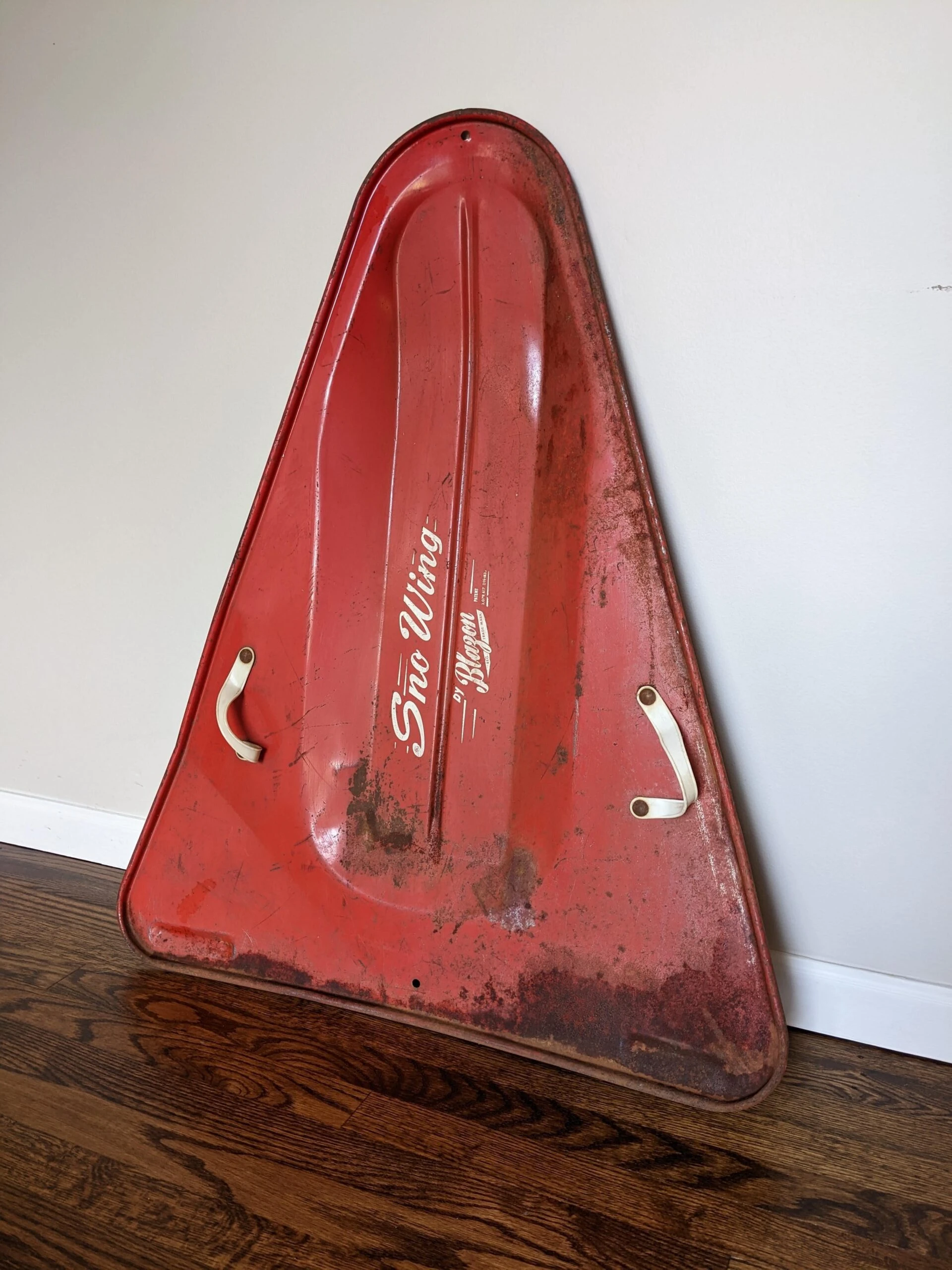 Blazon Sno-Wing metal sled in Atomic Red. Popular in the 1950’s and 60’s, this vintage sled would look great hanging …