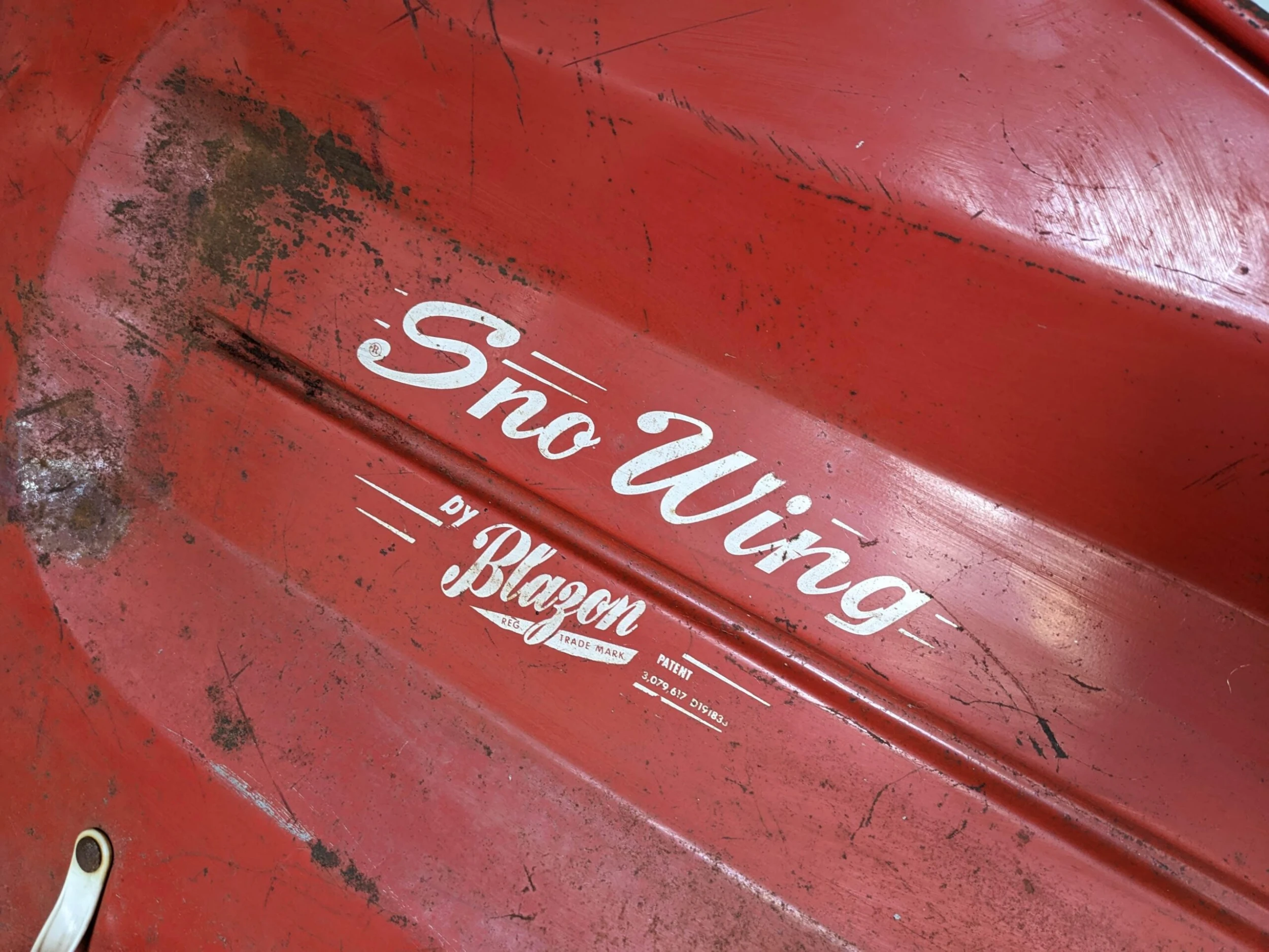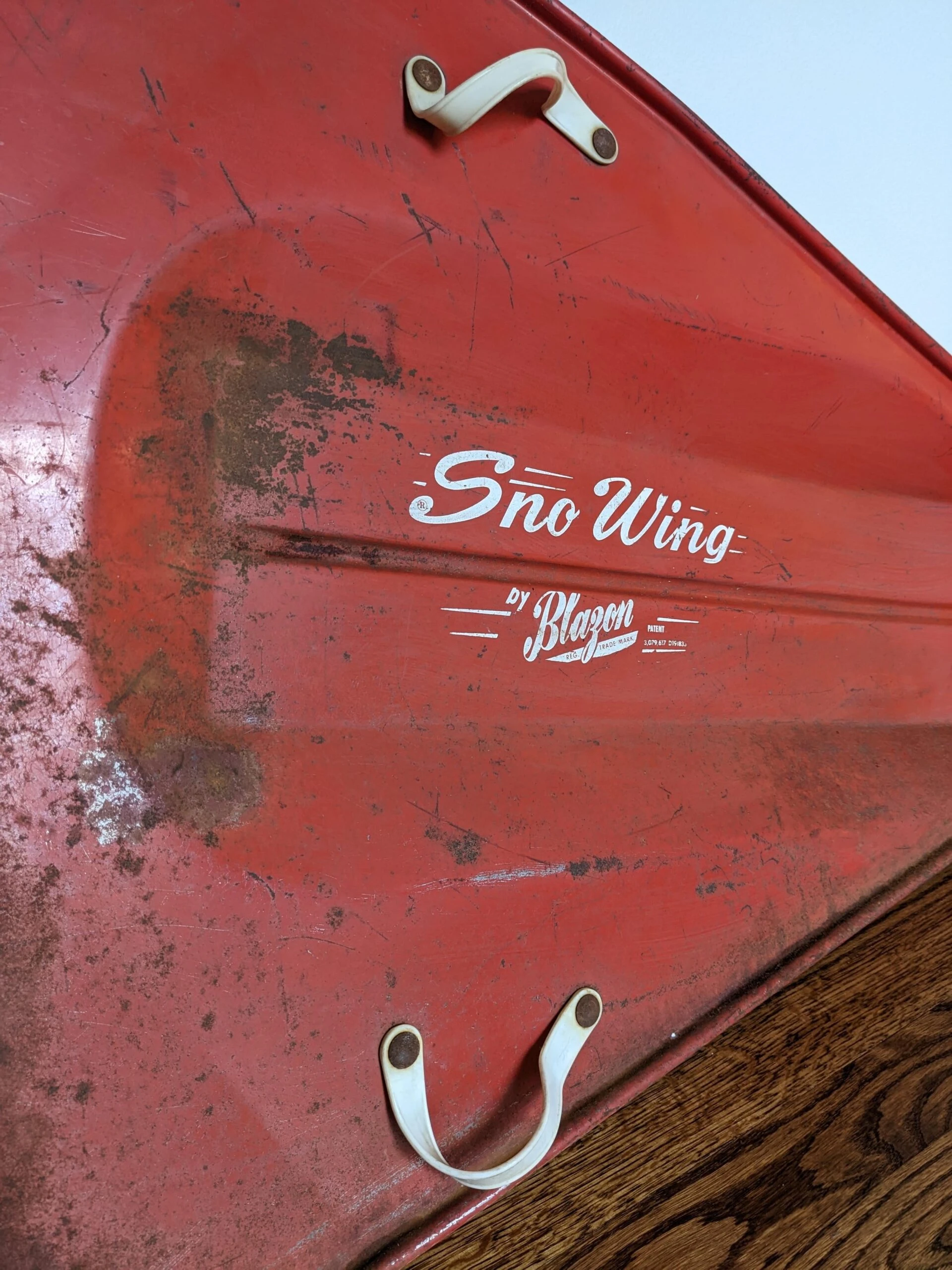 Blazon Sno-Wing metal sled in Atomic Red. Popular in the 1950’s and 60’s, this vintage sled would look great hanging on the wall of a ski cabin or lodge, or as an outdoor holiday decoration for a front stoop.