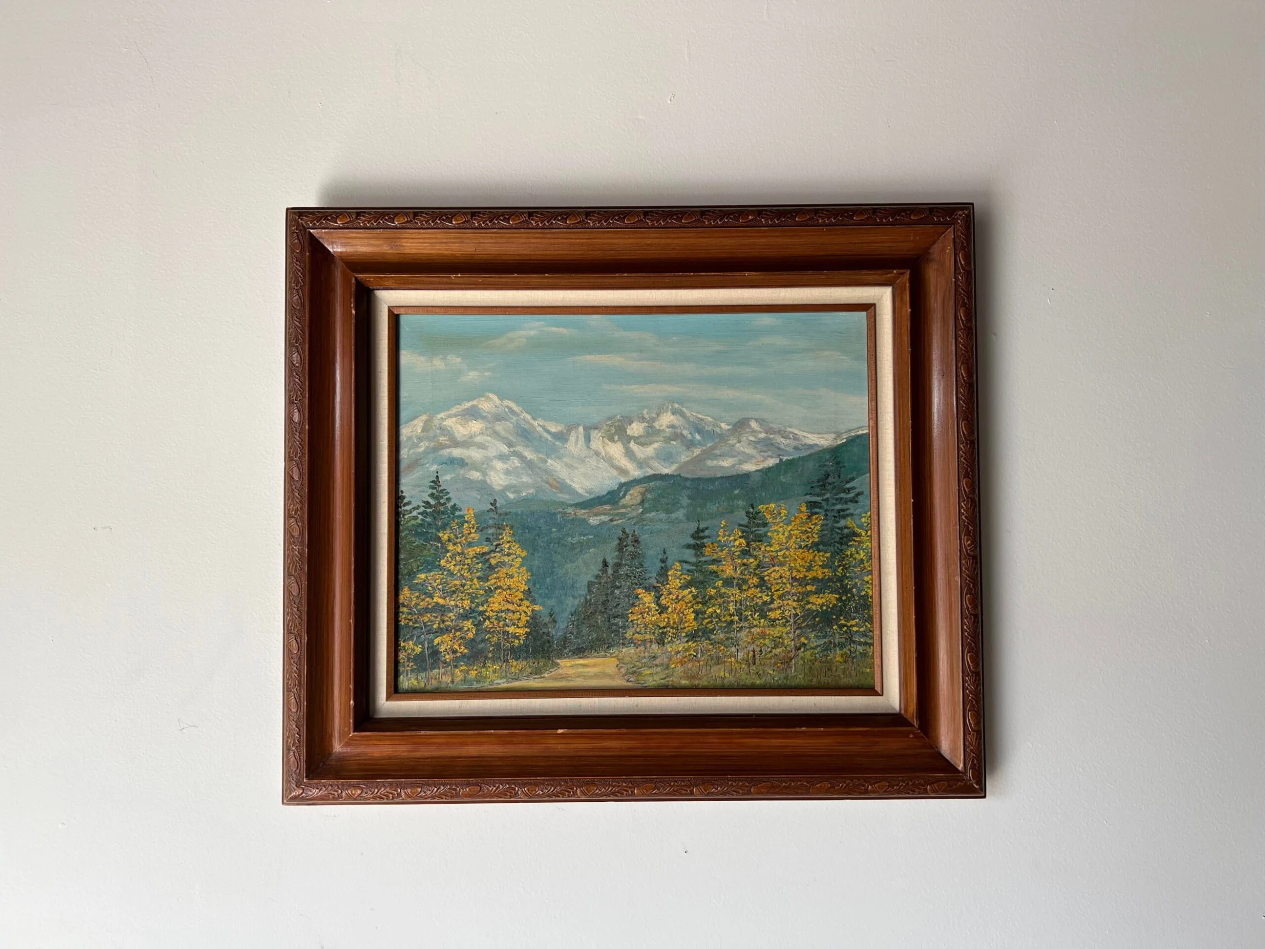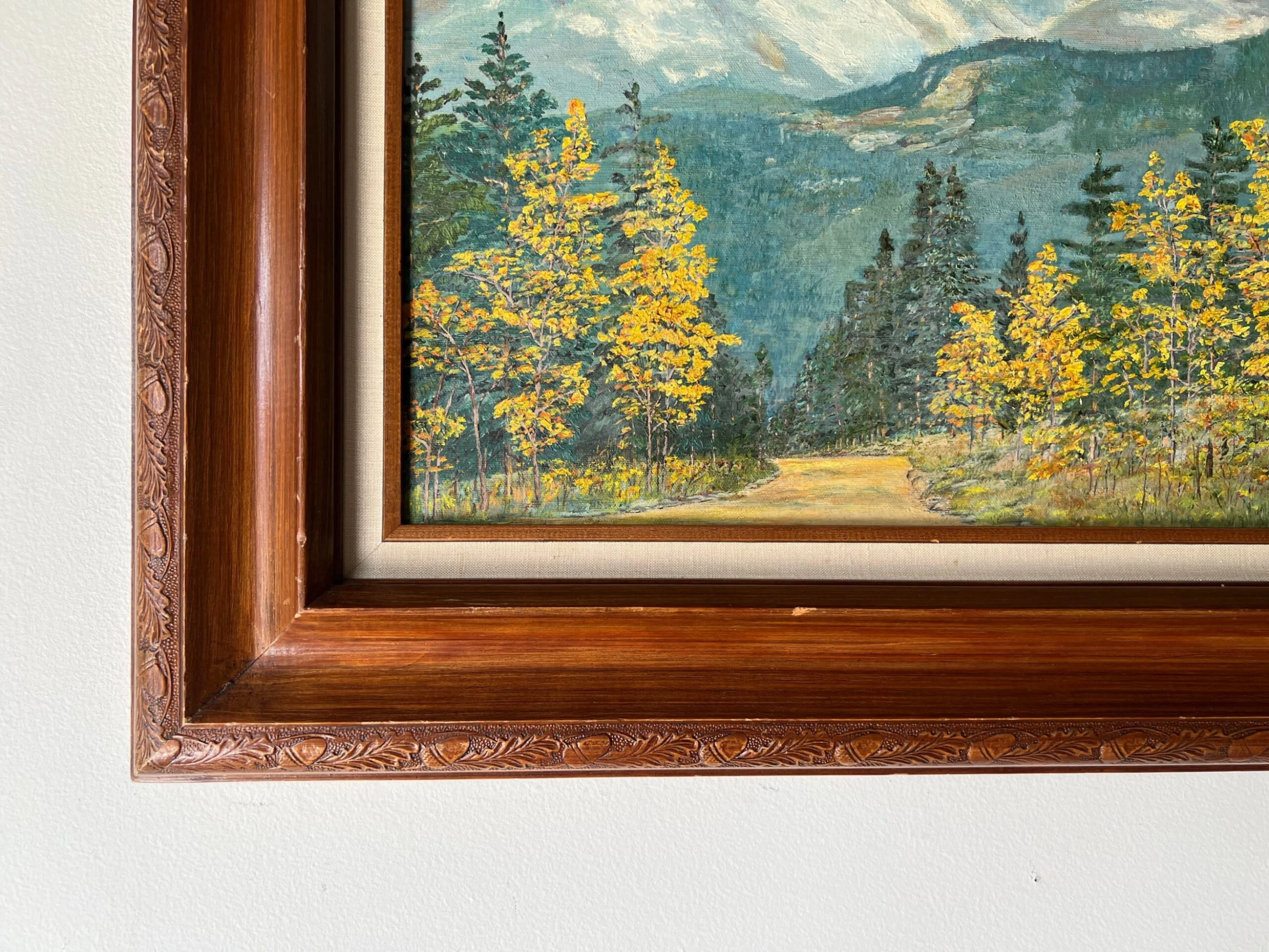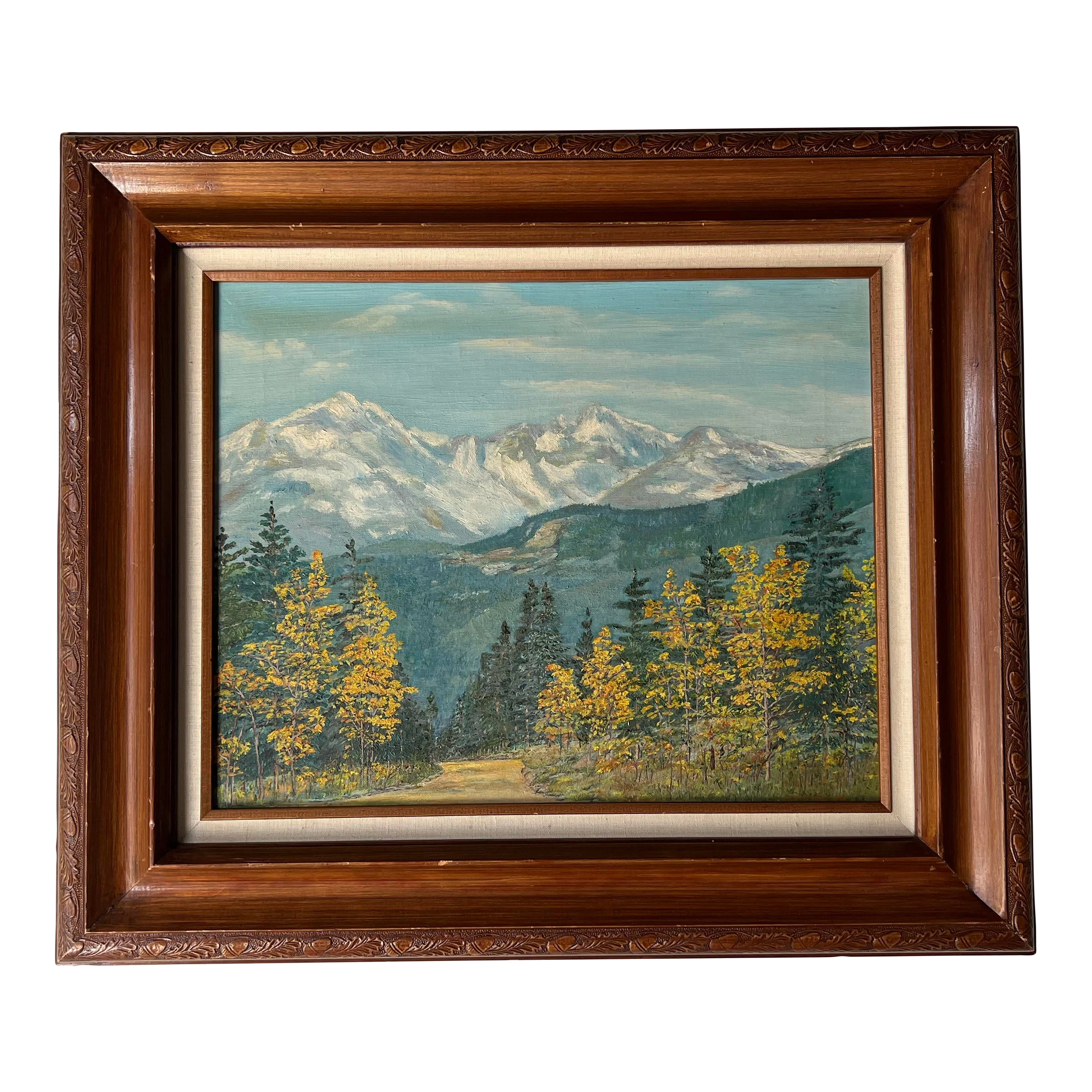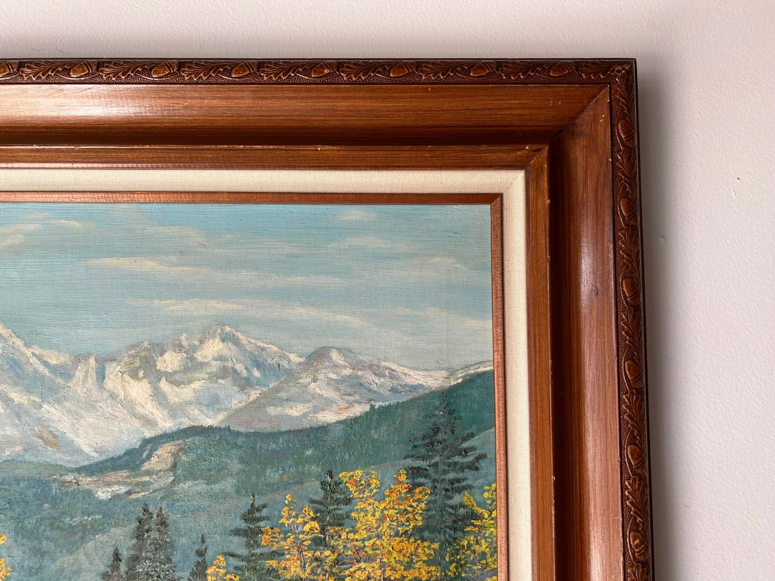 Available for sale this fantastic Vintage impressionist abstract landscape oil painting on canvas. Signed lower right side by the artist C. C. MOTCAVEG. C,1951. Titled ” Autumn In The Rockies -Longs Peak Colorado” Created with oil on canvas, It has been mounted in a wooden frame with a hanging wire attached to the reverse side.