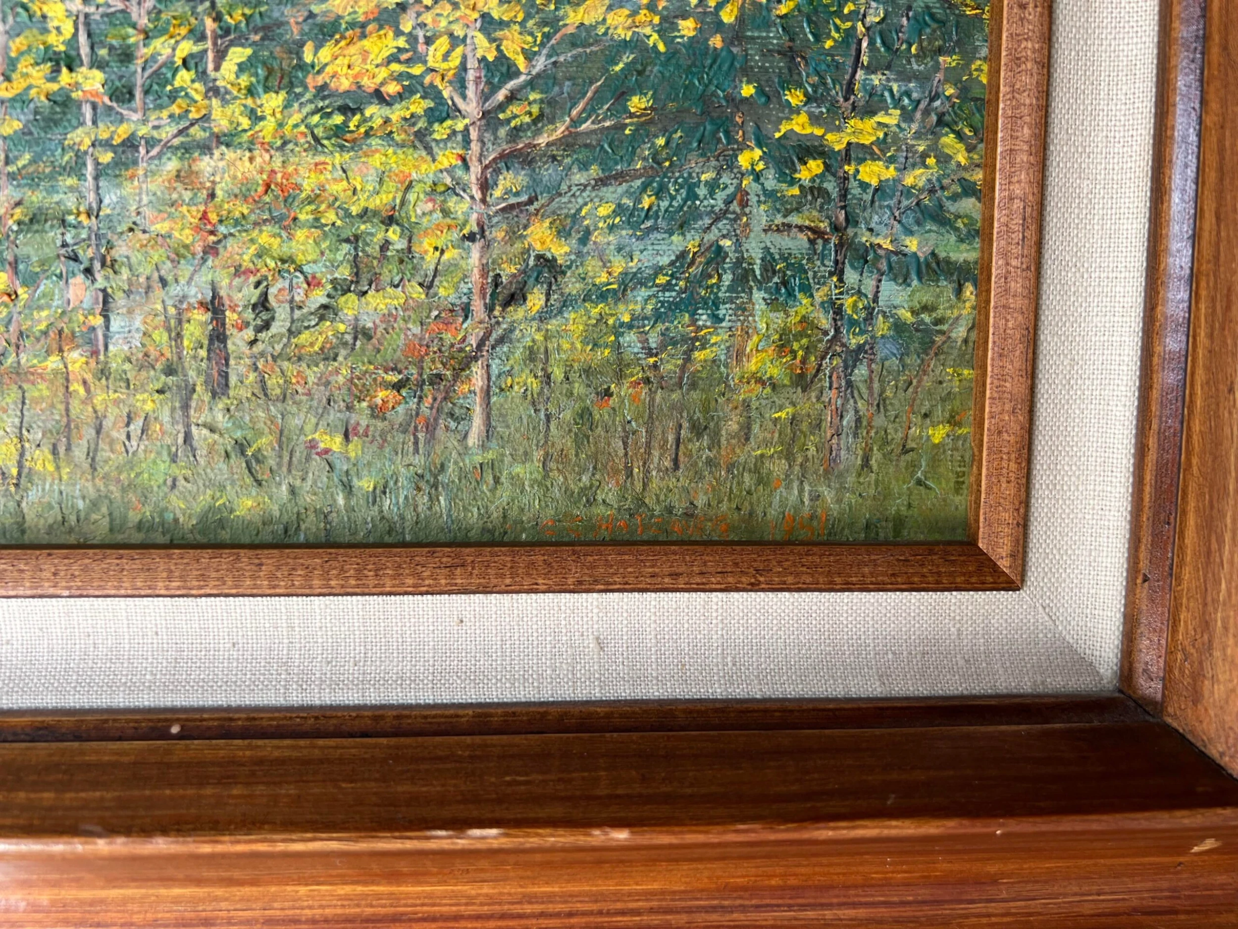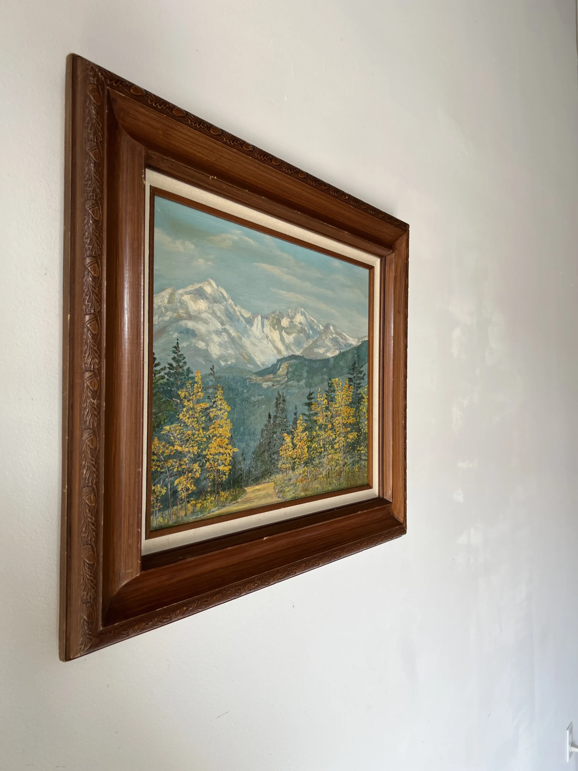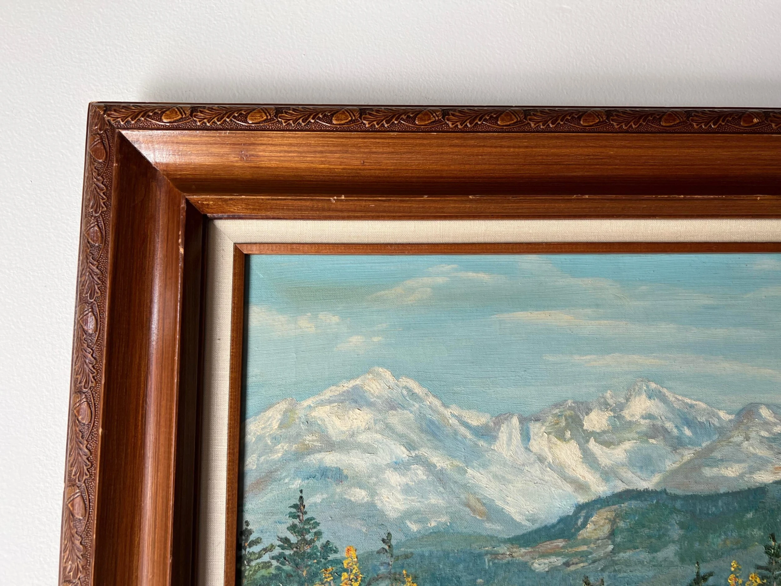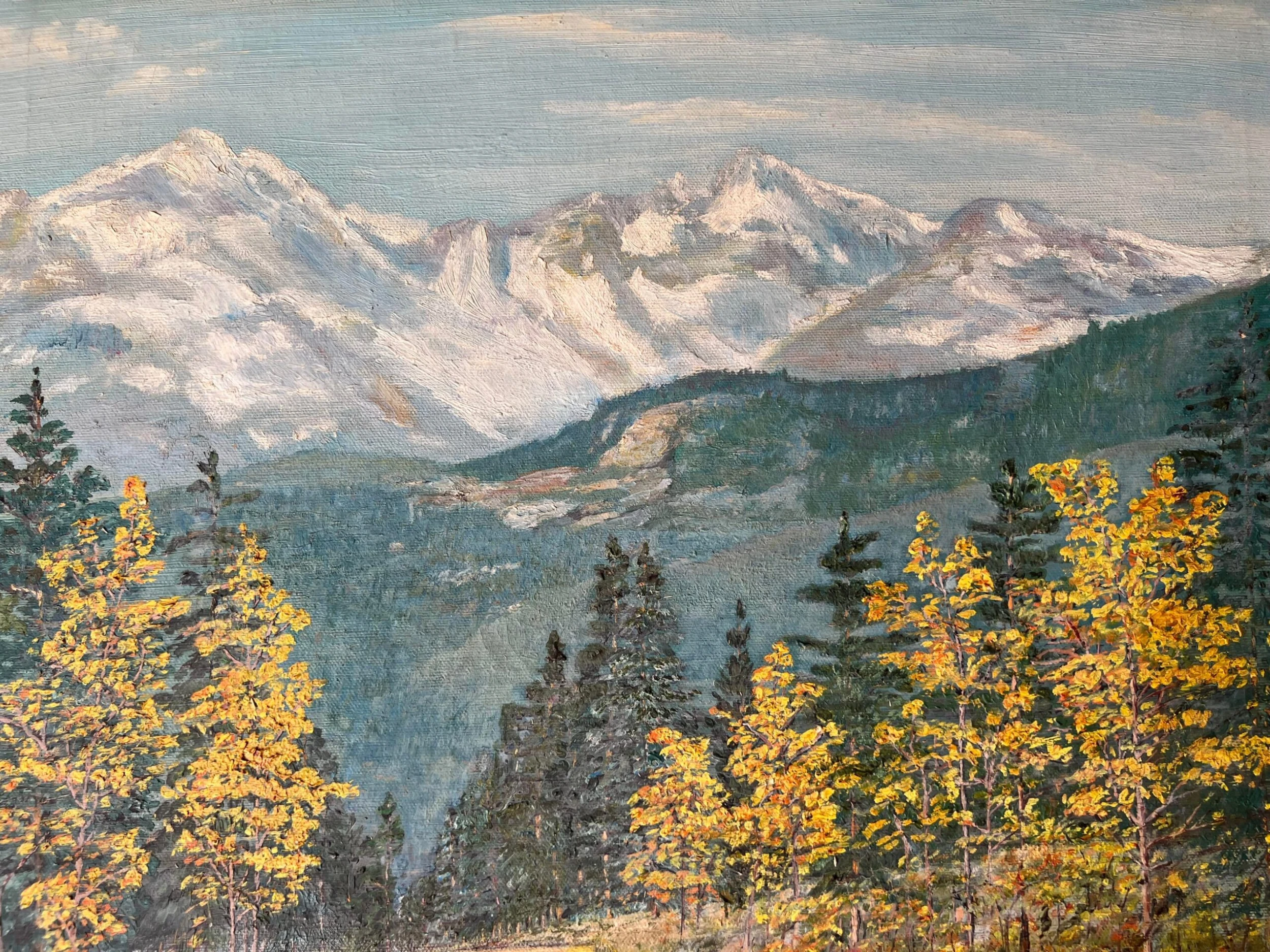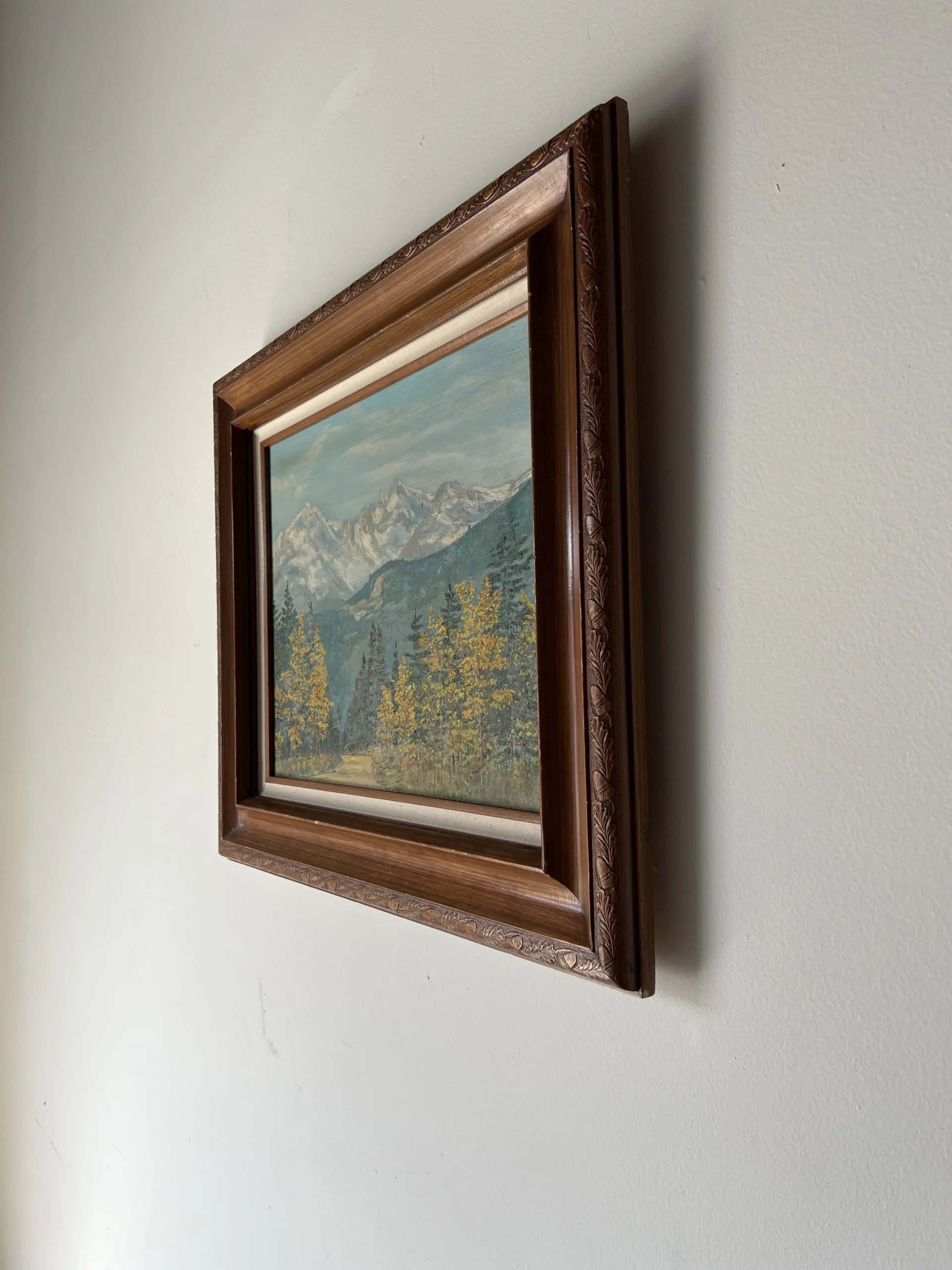 Available for sale this fantastic Vintage impressionist abstract landscape oil painting on canvas. Signed lower right side by the artist C. C. MOTCAVEG. C,1951. Titled ” Autumn In The Rockies -Longs Peak Colorado” Created with oil on canvas, It has been mounted in a wooden frame with a hanging wire attached to the reverse side.