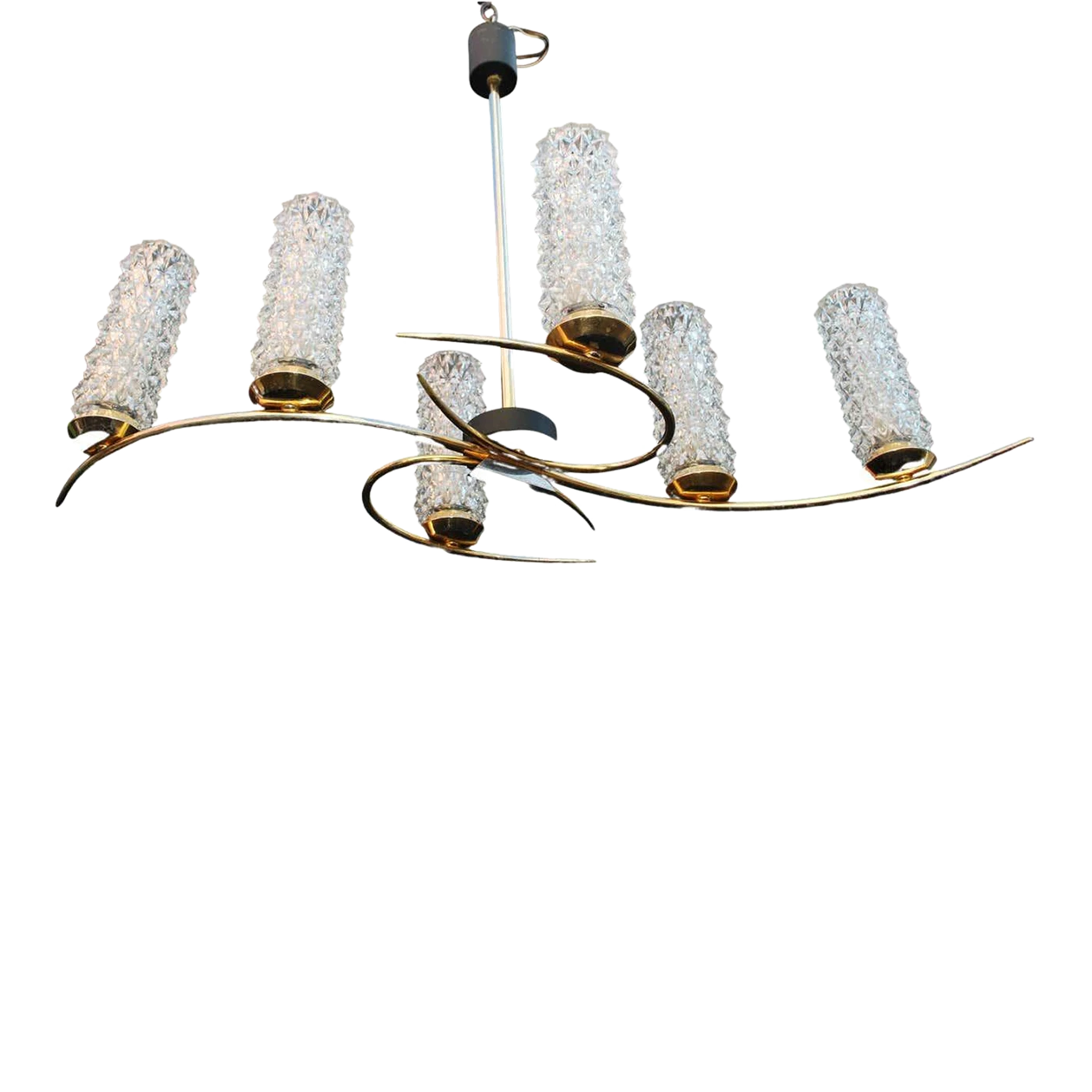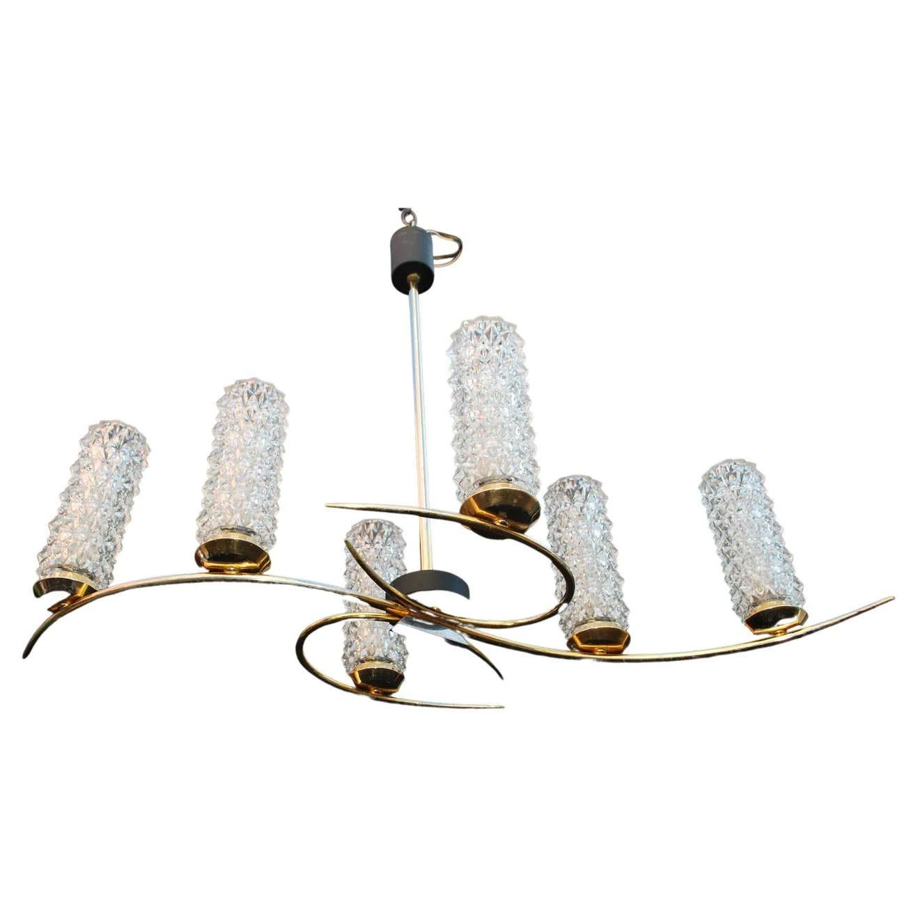 A beautiful and sexy mid-century chandelier, the lines are very sexy and flowing, the brass has some lost, (see pictures) …