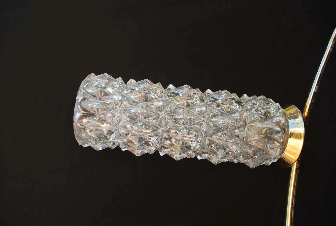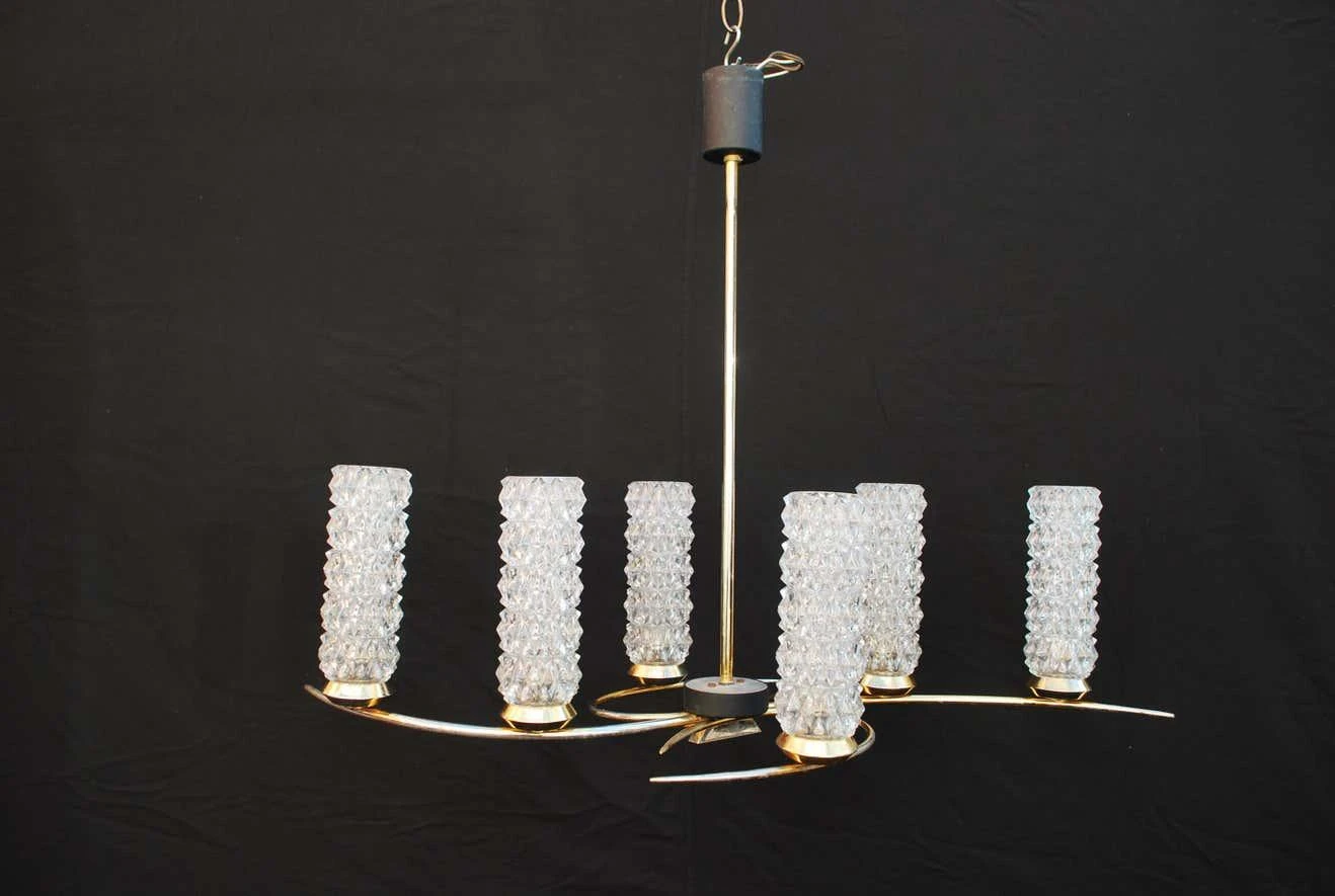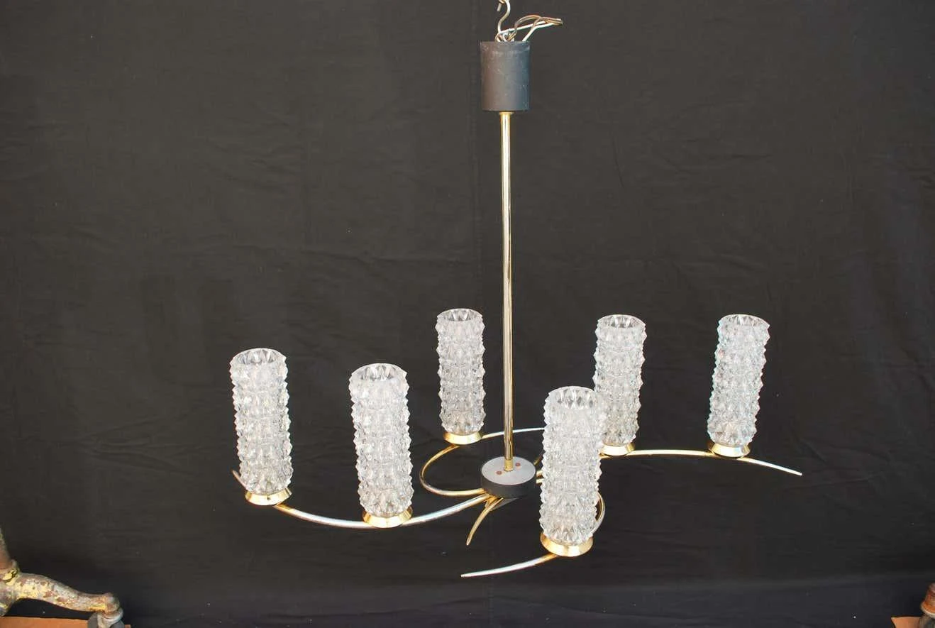 A beautiful and sexy mid-century chandelier, the lines are very sexy and flowing, the brass has some lost, (see pictures) totally normal with age.