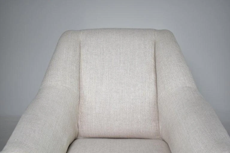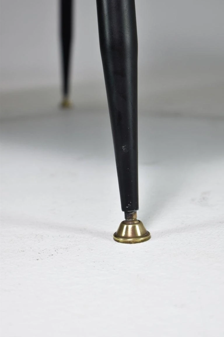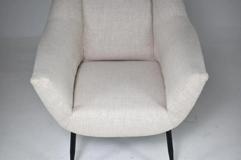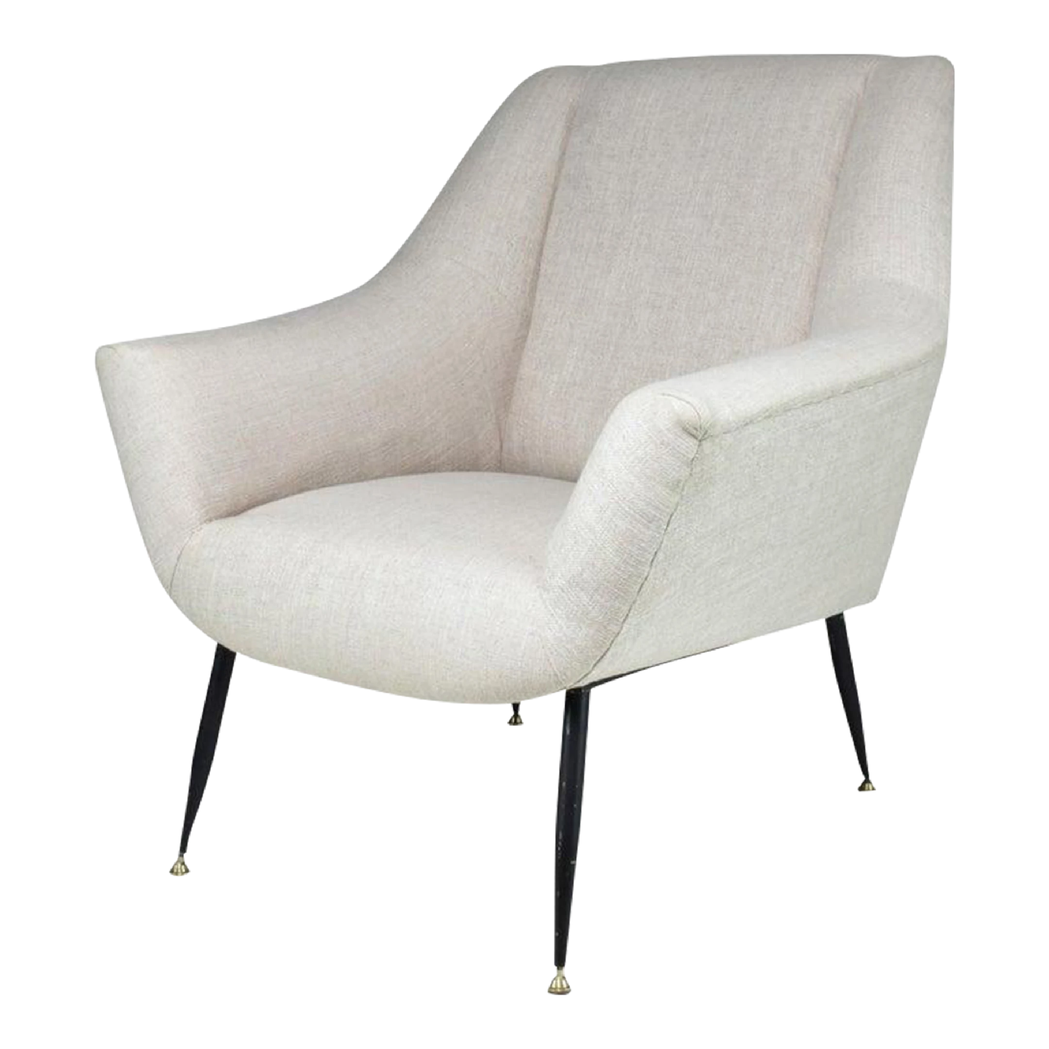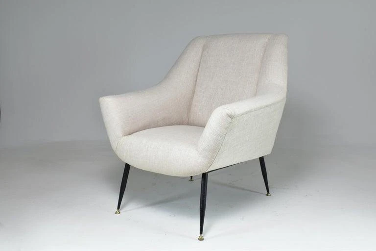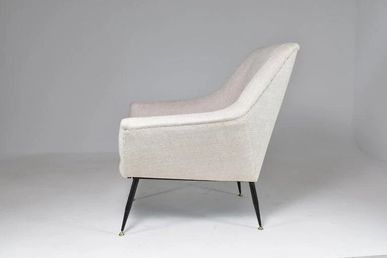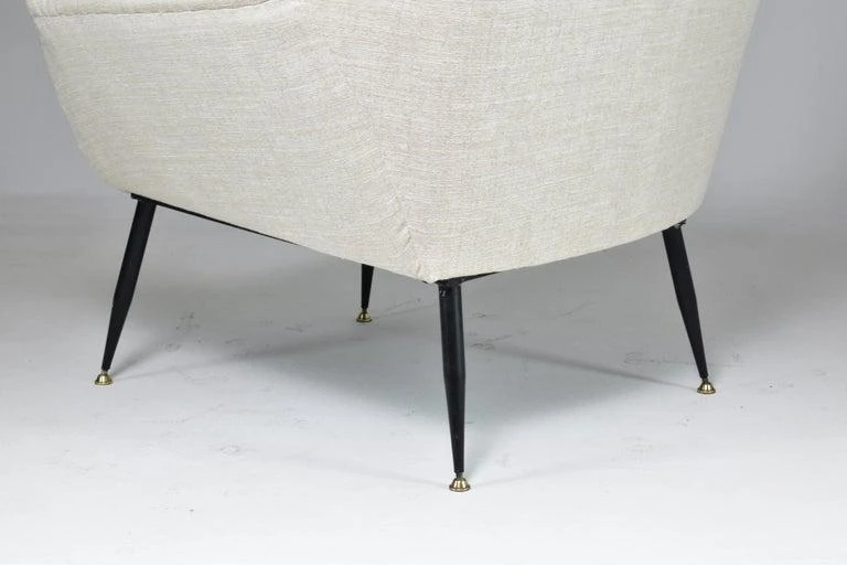 An expertly restored 20th-century vintage armchair or lounge chair in typical Italian mid-century design. The elegantly splayed and re-polished brass legs have been re-lacquered in black like the original design. The depth and curves of the light wingback design offer excellent comfort.