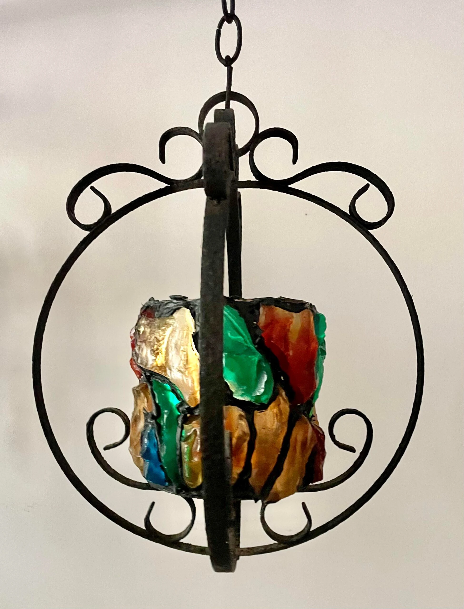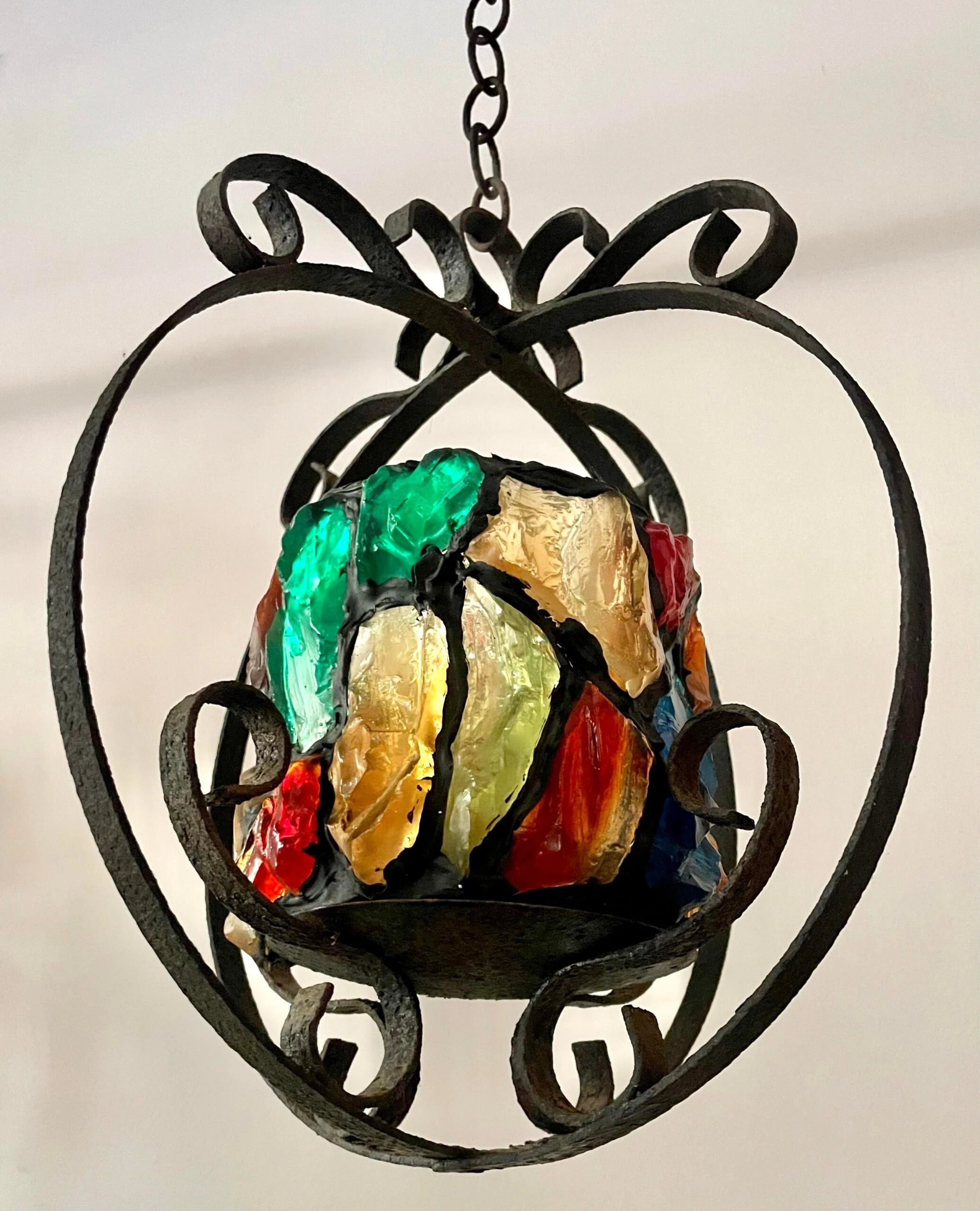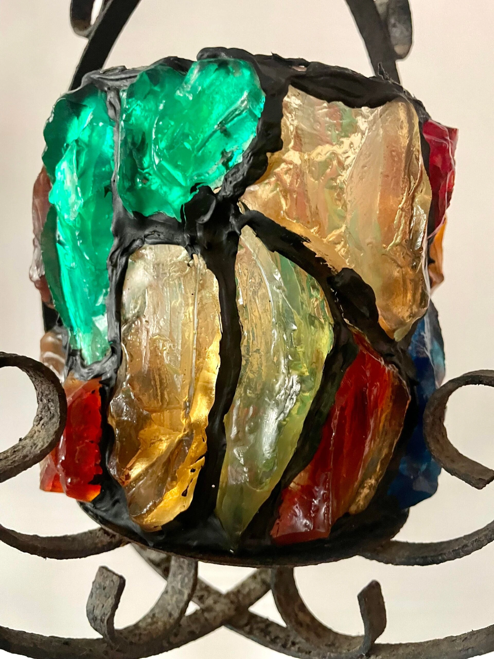 Here is a great space age, retro hanging candle holder attributed to Peter Marsh. It features an iron orb base with scroll details and a removable multicolored resin cylinder. The pieces look like precious stones that have just been mined – rough but special! This would look so great on a patio!