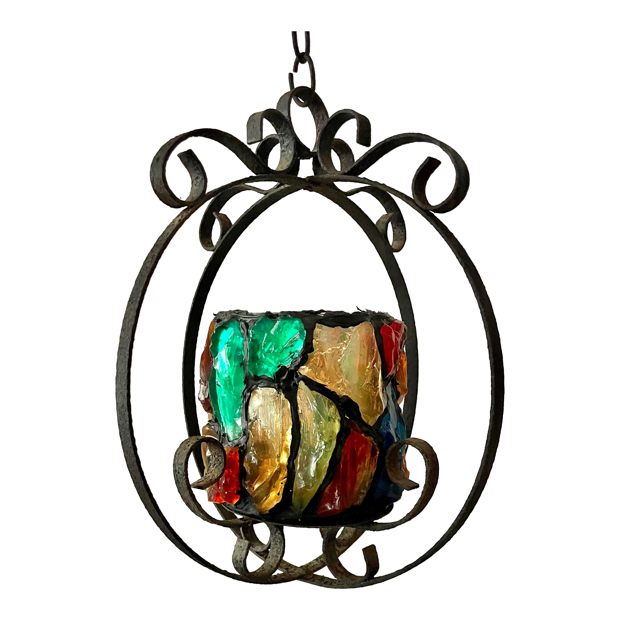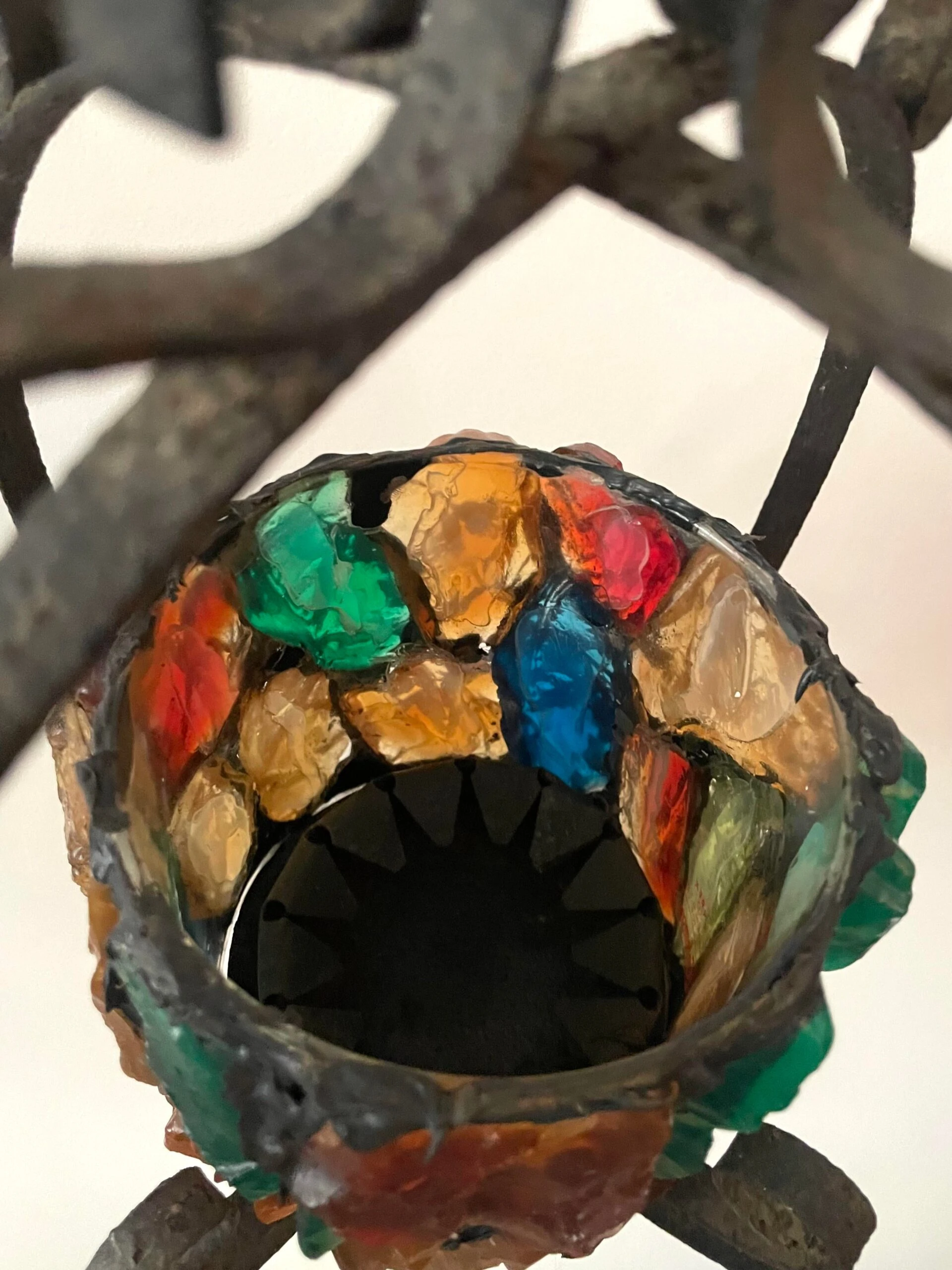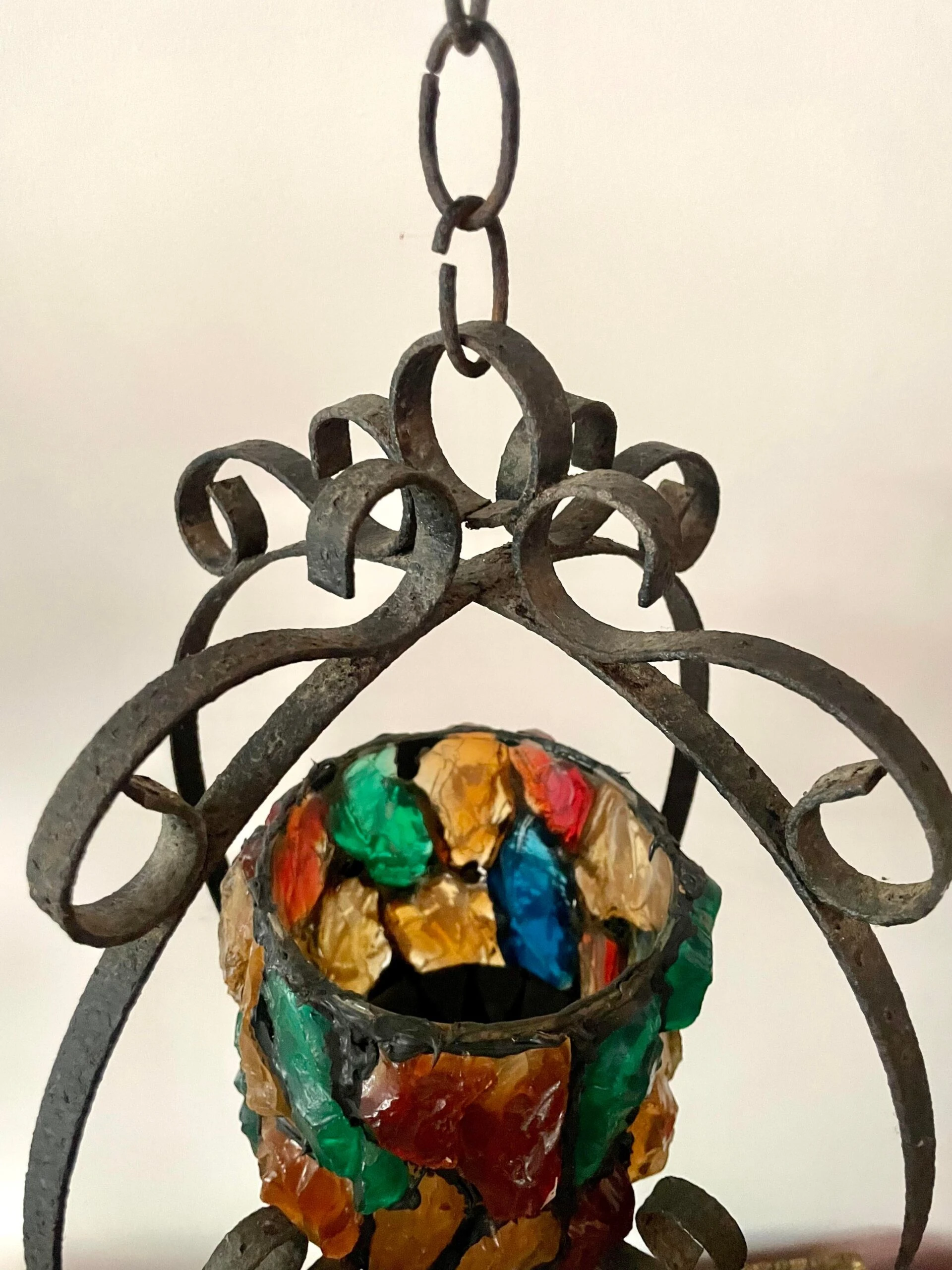 Here is a great space age, retro hanging candle holder attributed to Peter Marsh. It features an iron orb base with scroll details and a removable multicolored resin cylinder. The pieces look like precious stones that have just been mined – rough but special! This would look so great on a patio!