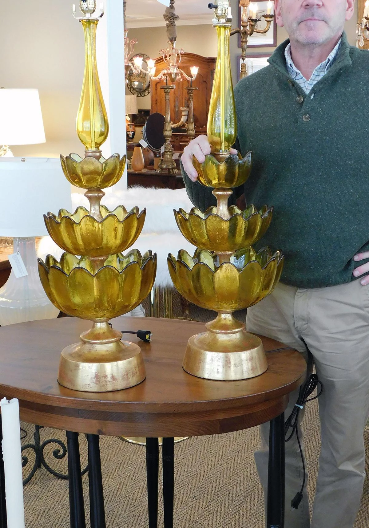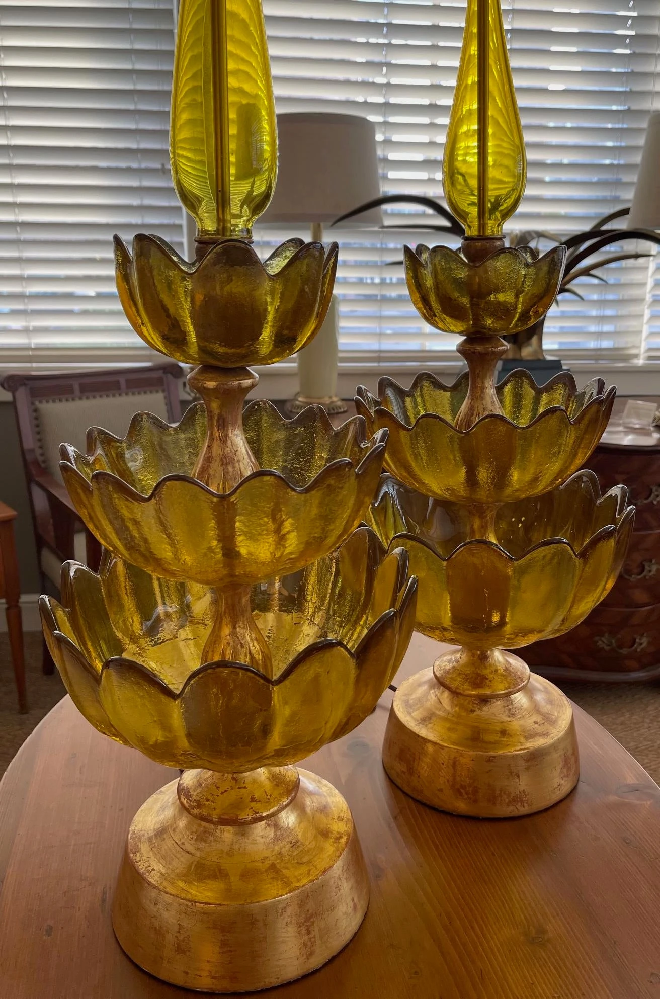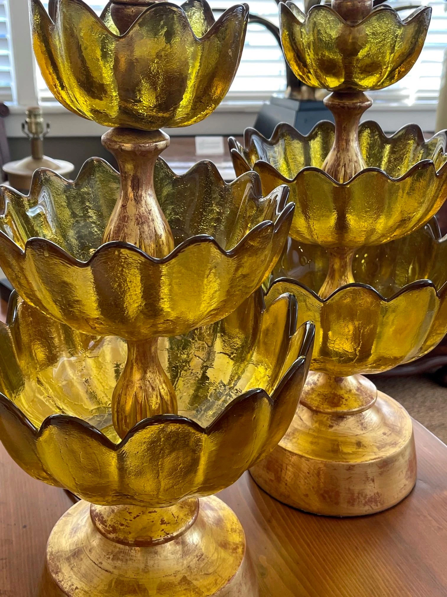 Each tall lamp composed of a baluster stem above three graduated lotus leaf cups interspersed with giltwood dividers; all raised …