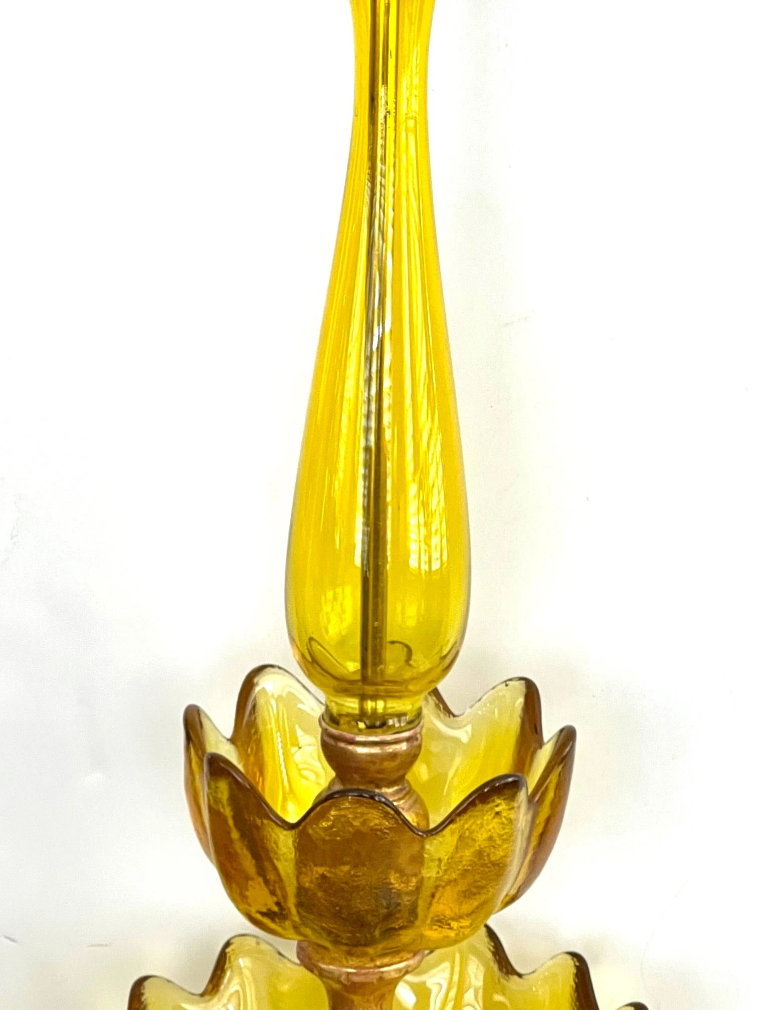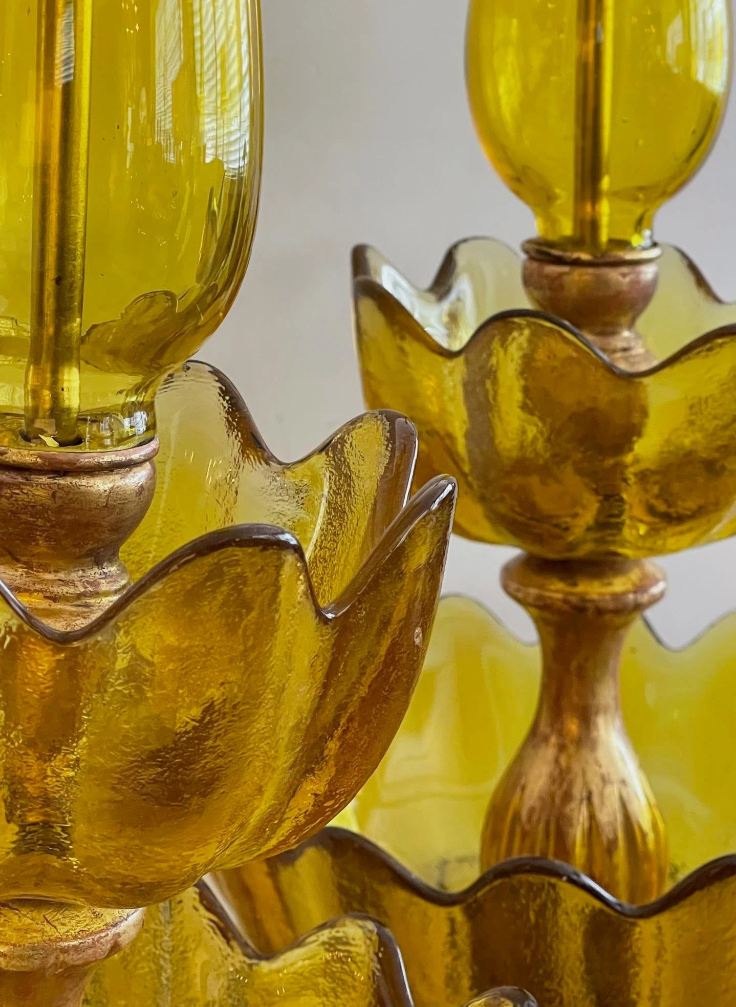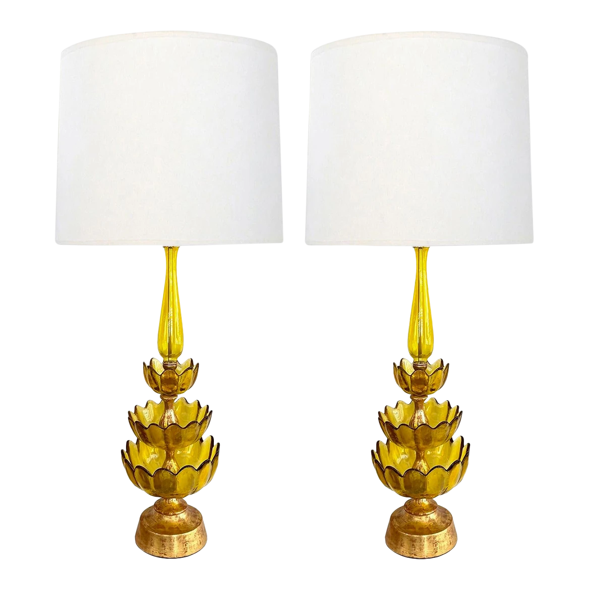 Each tall lamp composed of a baluster stem above three graduated lotus leaf cups interspersed with giltwood dividers; all raised …