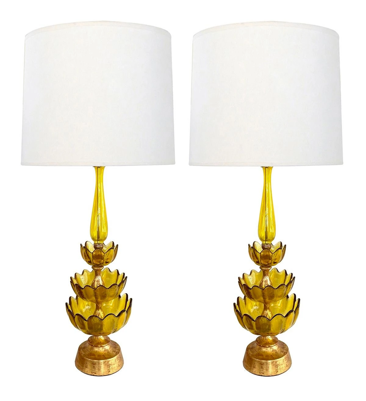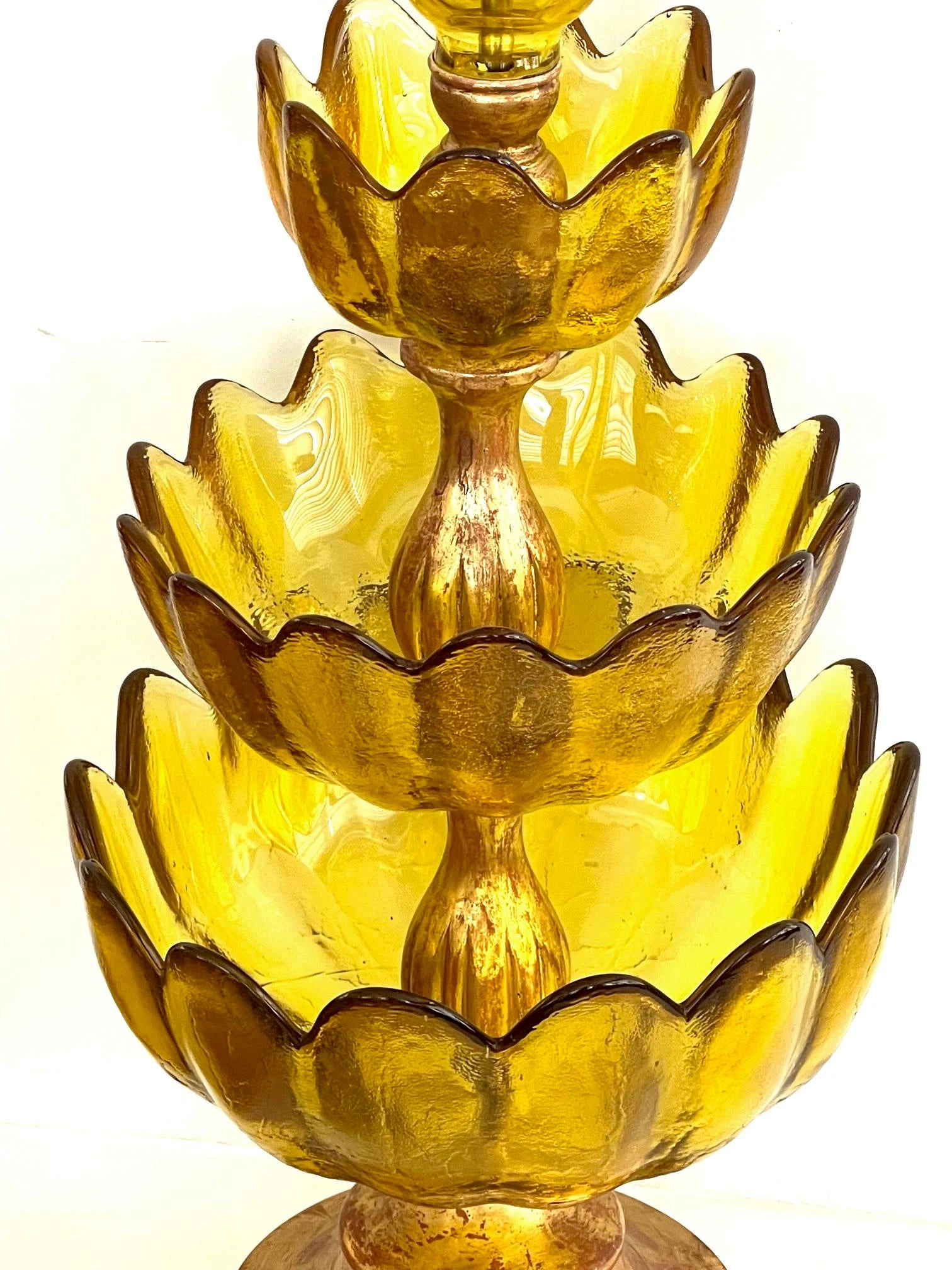 Each tall lamp composed of a baluster stem above three graduated lotus leaf cups interspersed with giltwood dividers; all raised on a giltwood base