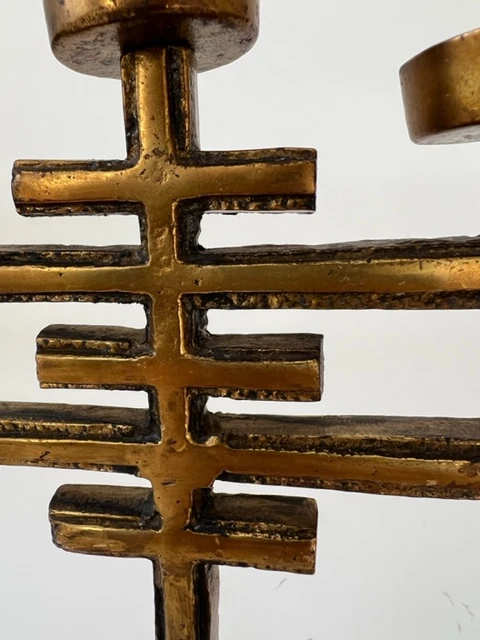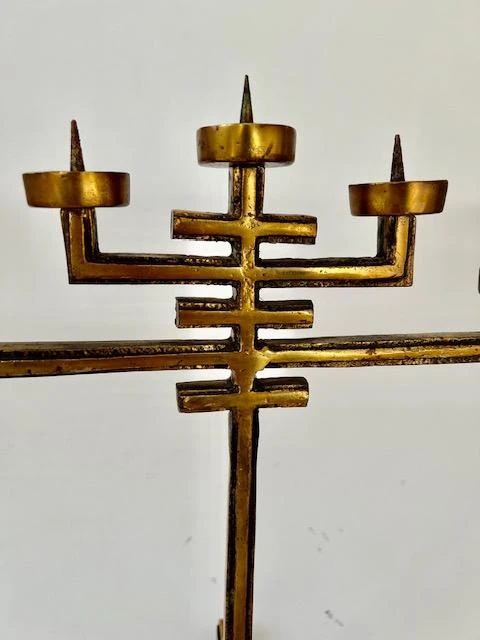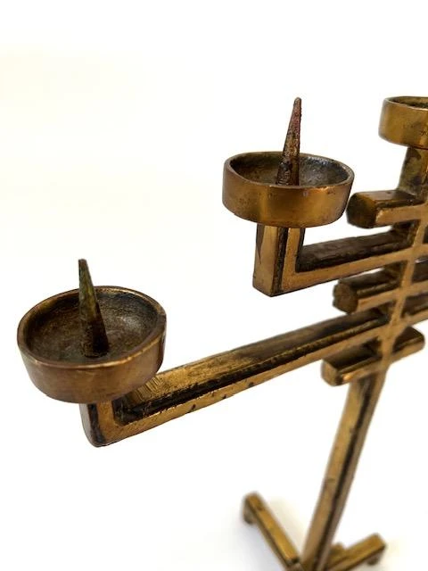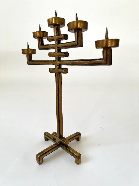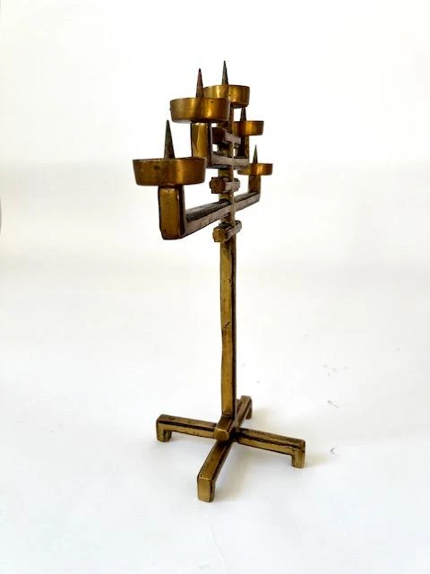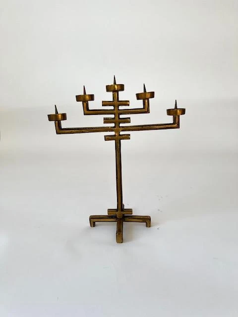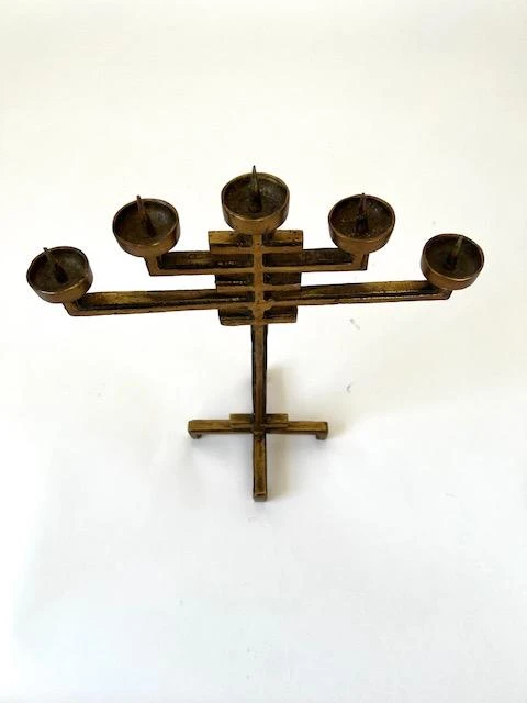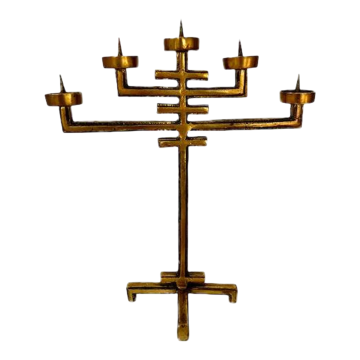 Made from heavy solid brass with a cross design and raised base.. Holds five small candles.