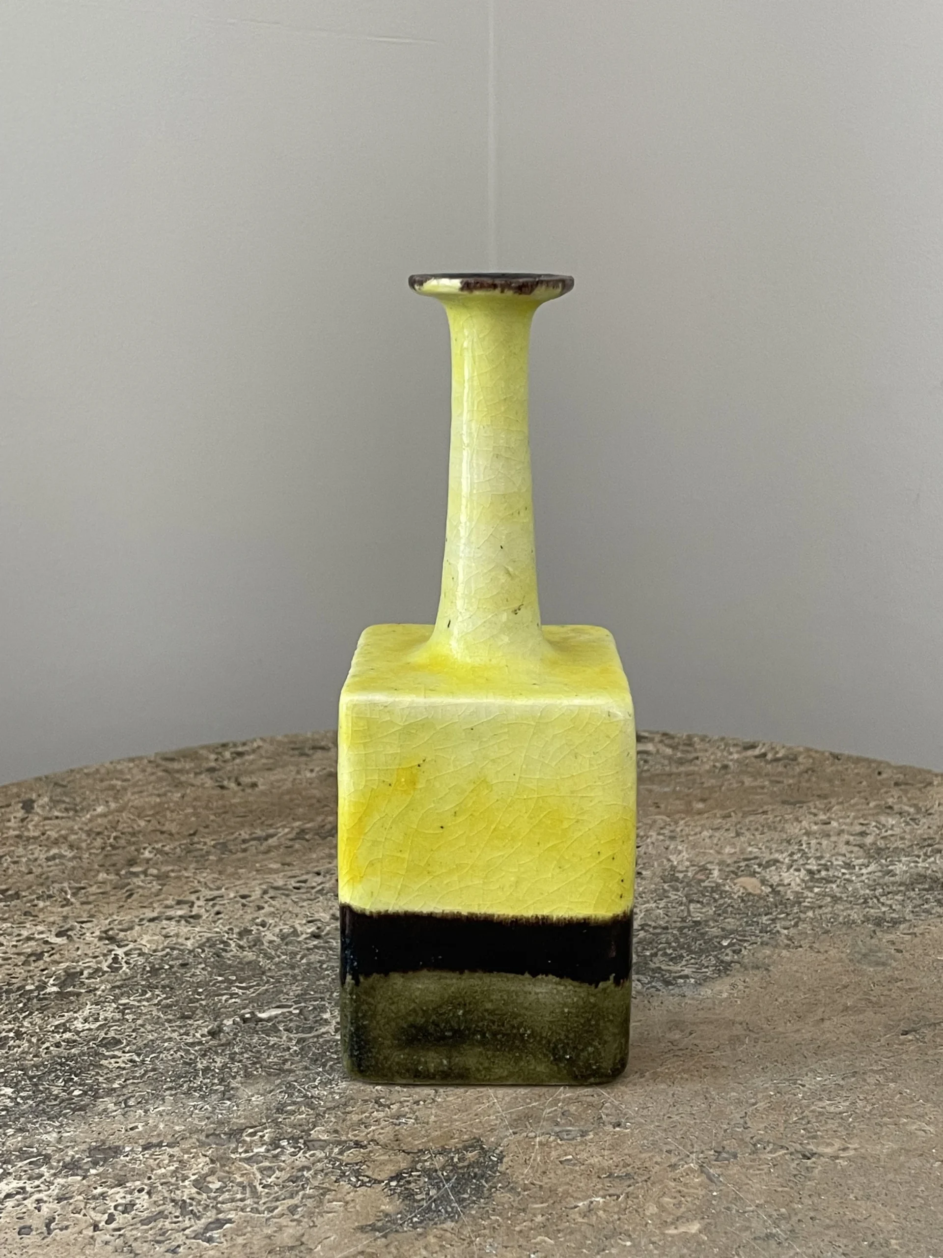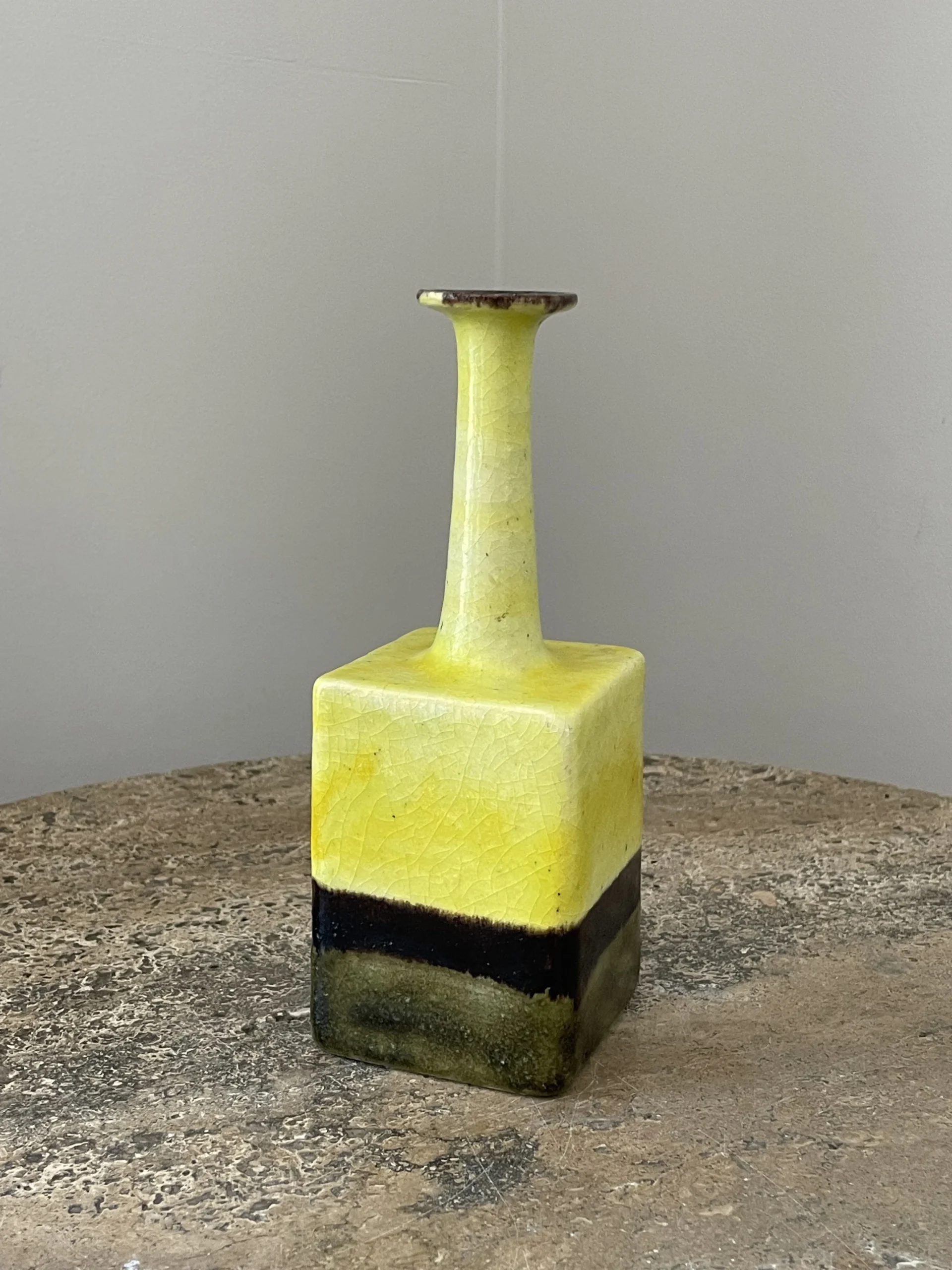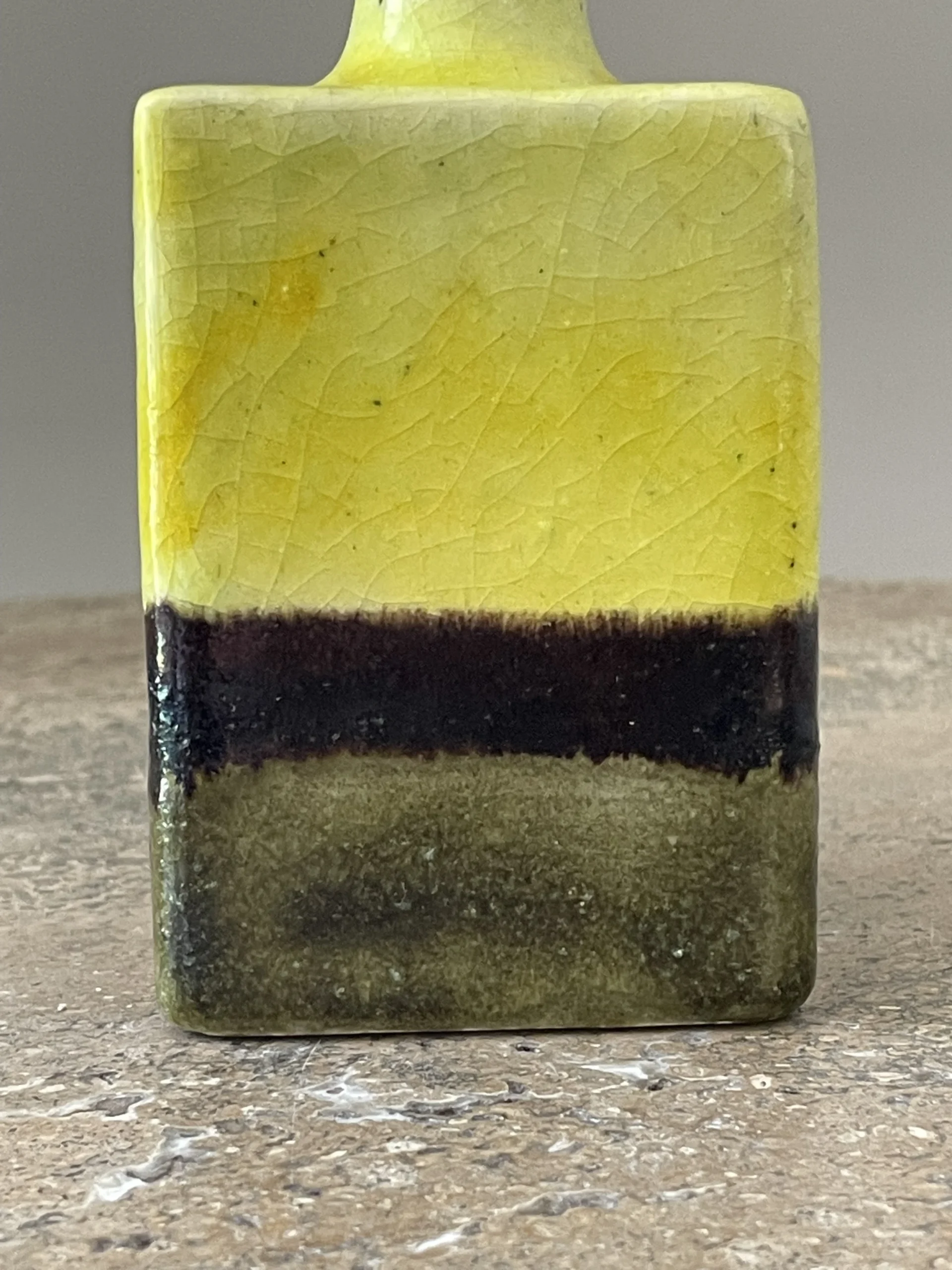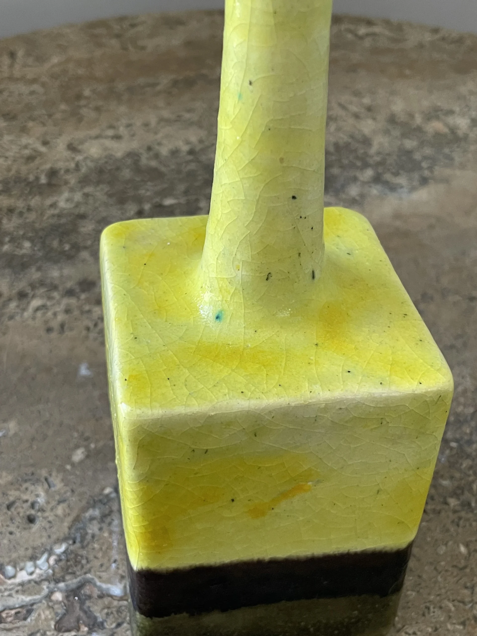 An unusual vase designed by Bruno Gambone. Features a vibrant yellow color which is different from his typical use of color palette. Interesting shape starting with a square base and tapering to a round neck. Very good condition.