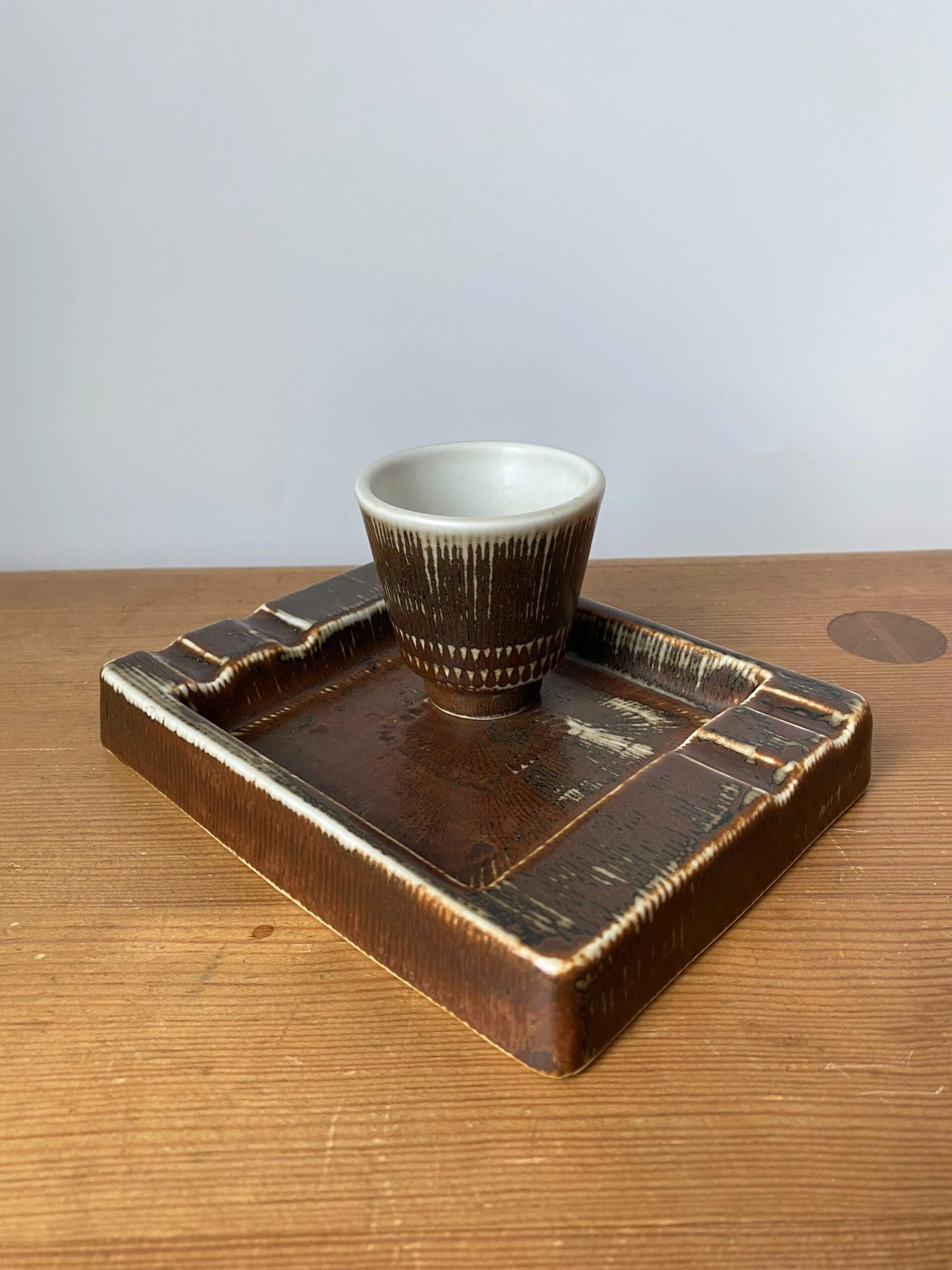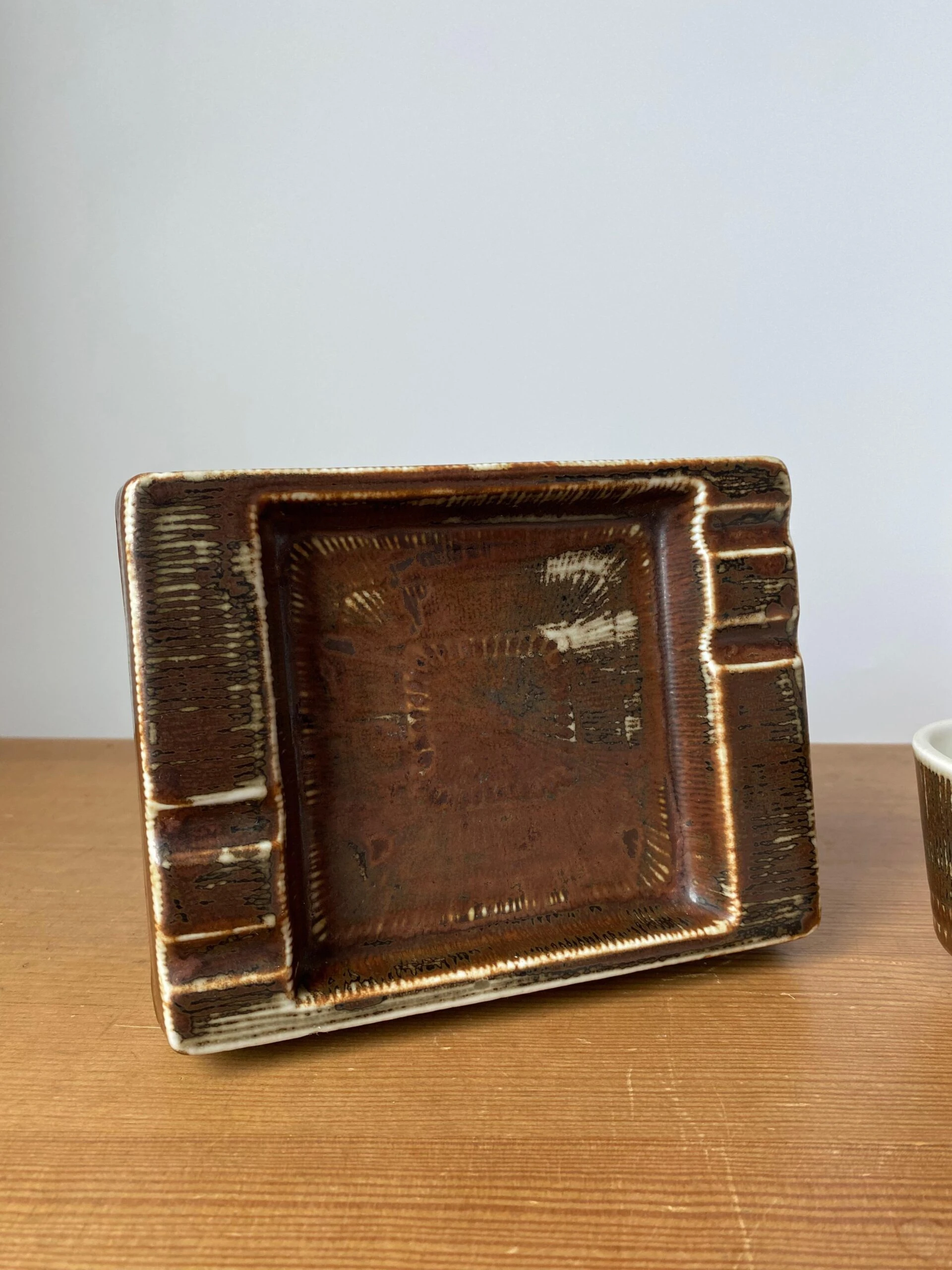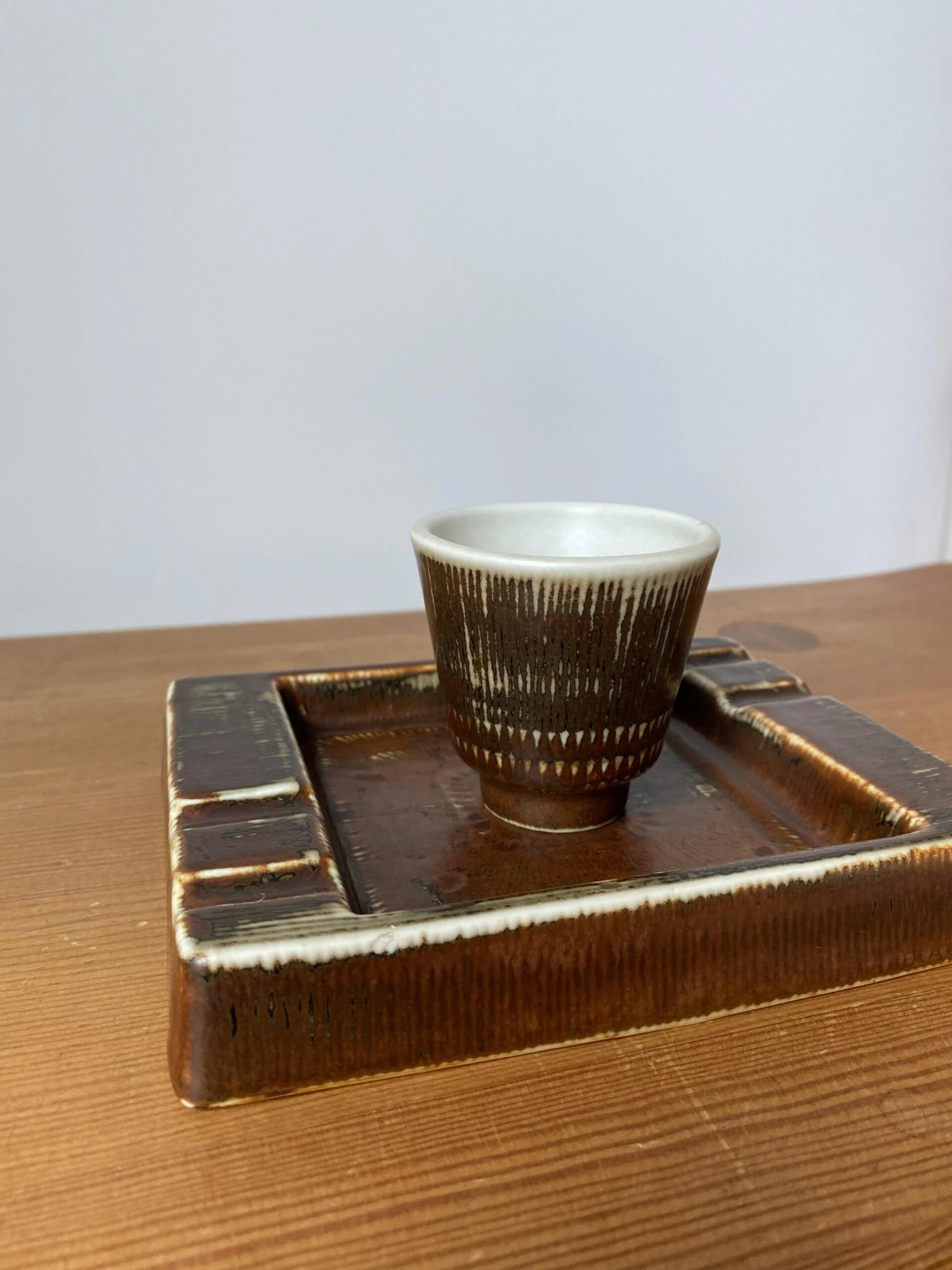 1960’s ceramic set by Hertha Bengtsson for Rörstrand, Sweden. Consisting of a a rectangular plate and miniature vase with beautiful brown glaze with a white stripe details. Marked at the bottom with the designer signature and in a very good condition.
