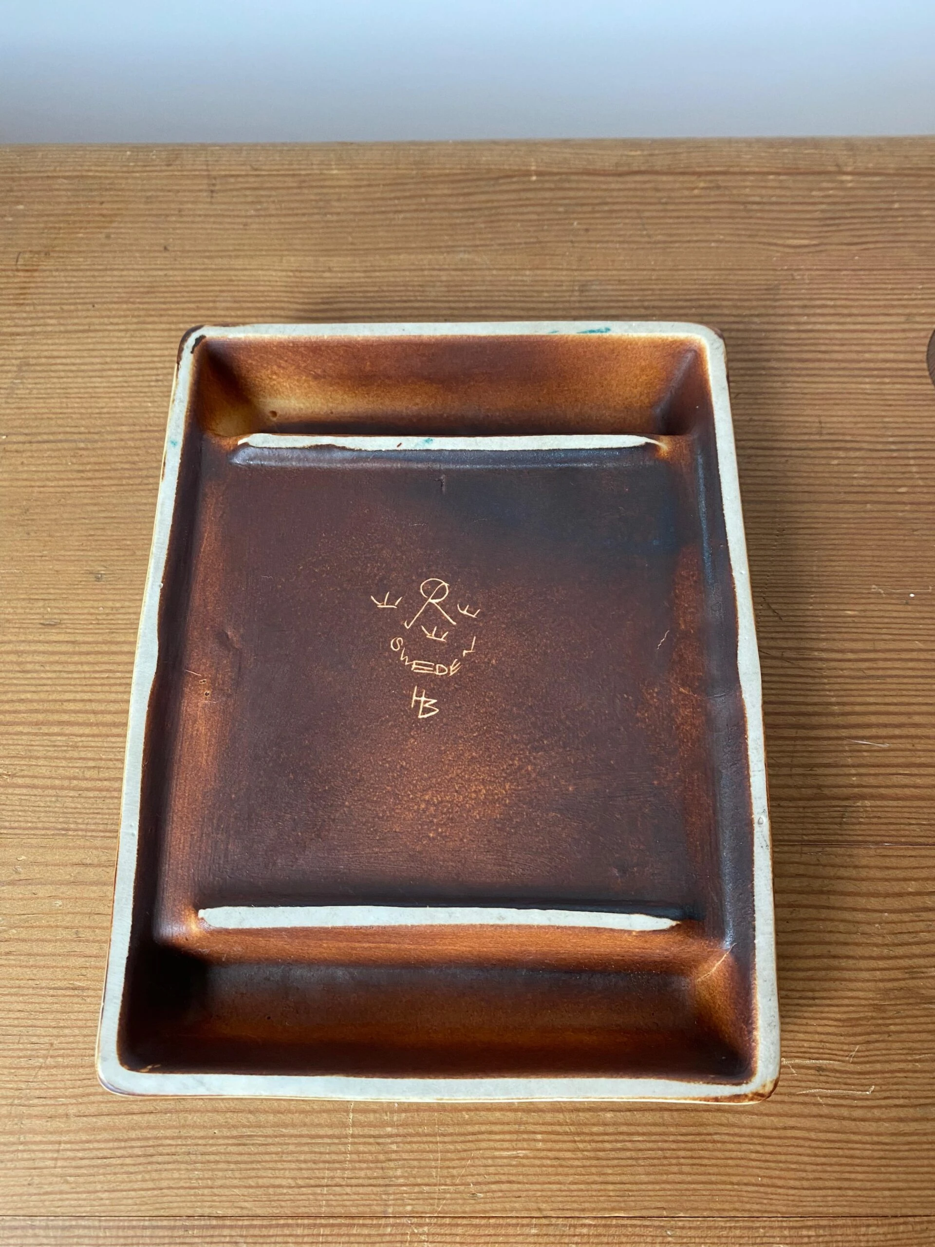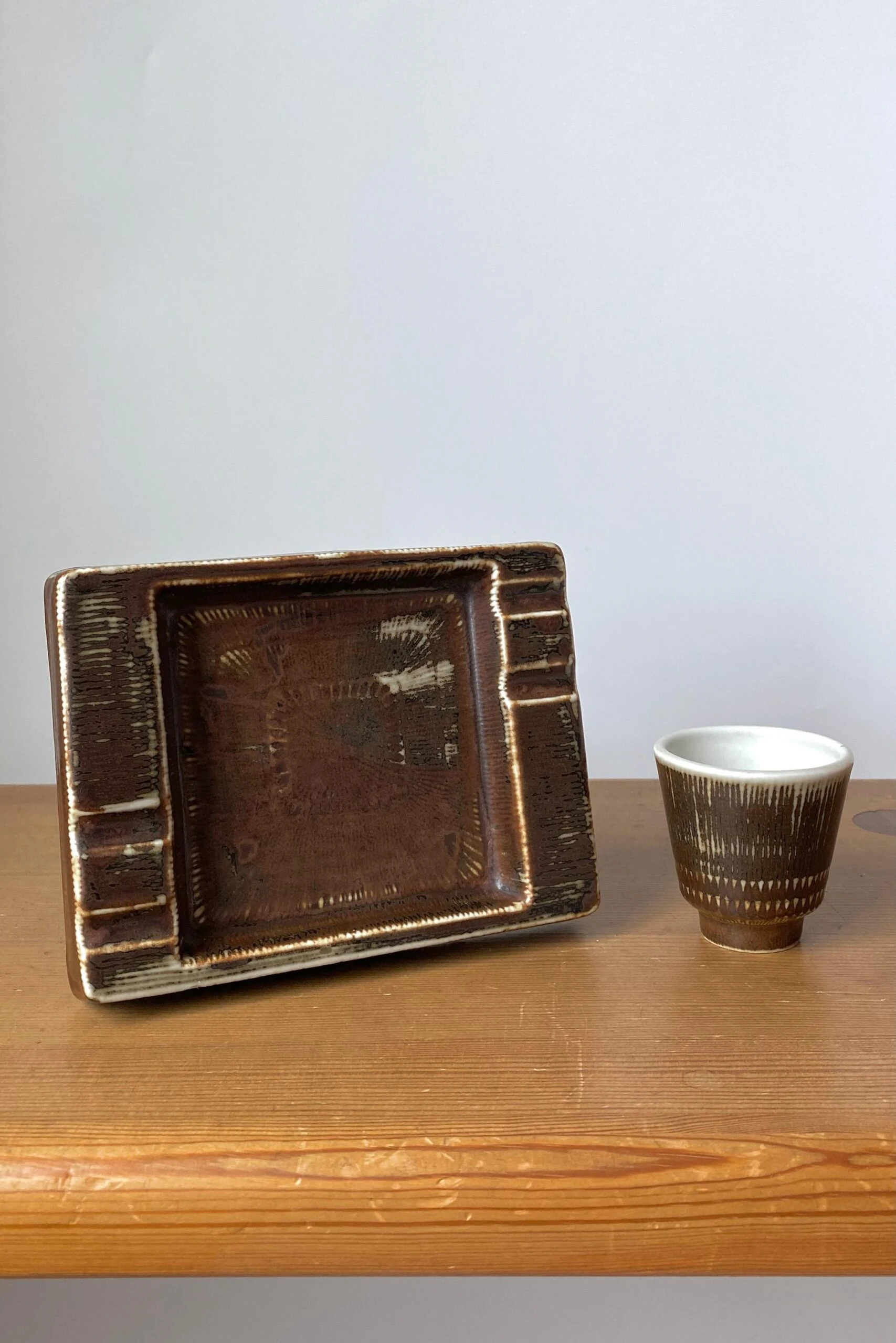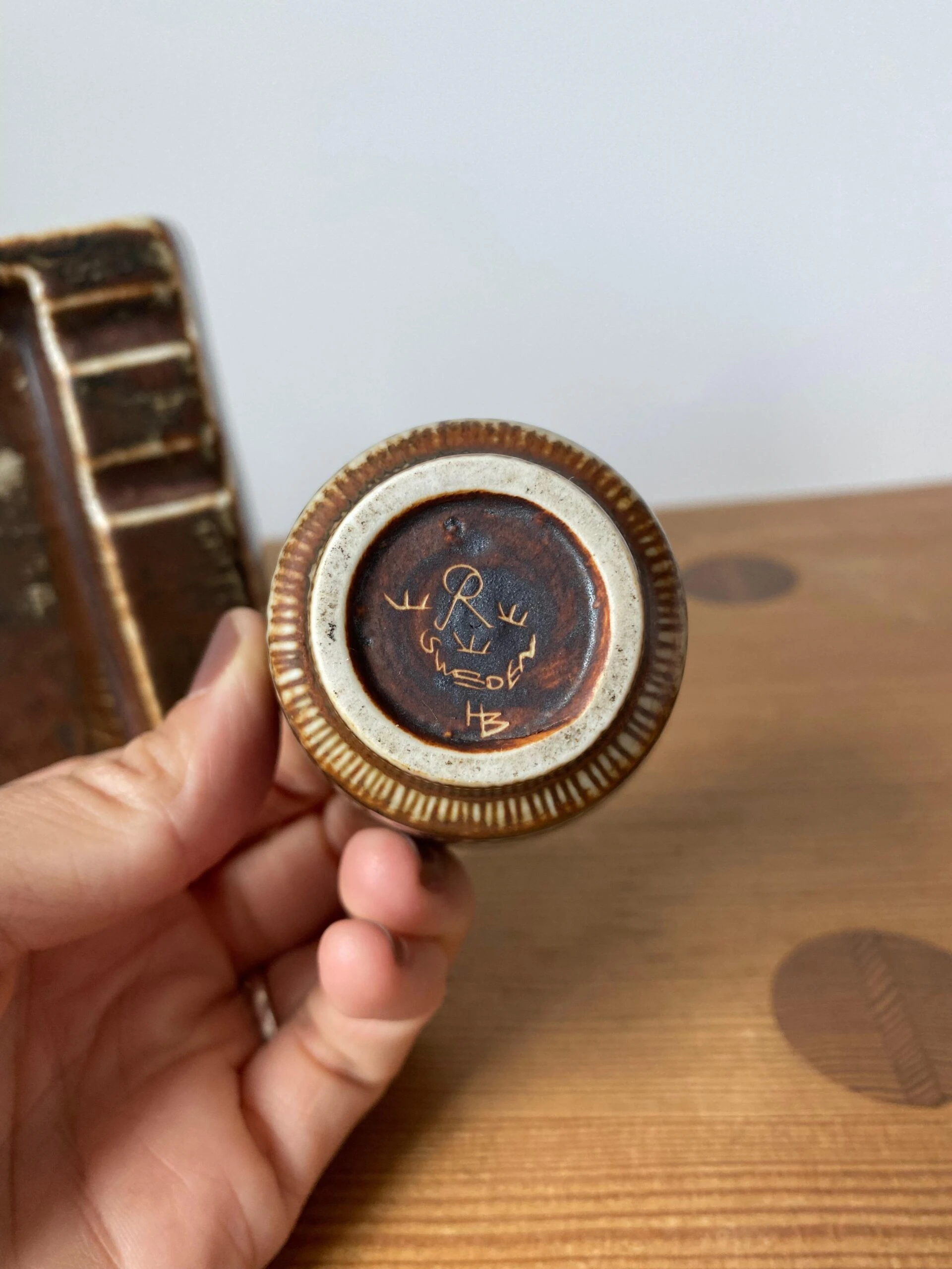 1960’s ceramic set by Hertha Bengtsson for Rörstrand, Sweden. Consisting of a a rectangular plate and miniature vase with beautiful brown glaze with a white stripe details. Marked at the bottom with the designer signature and in a very good condition.